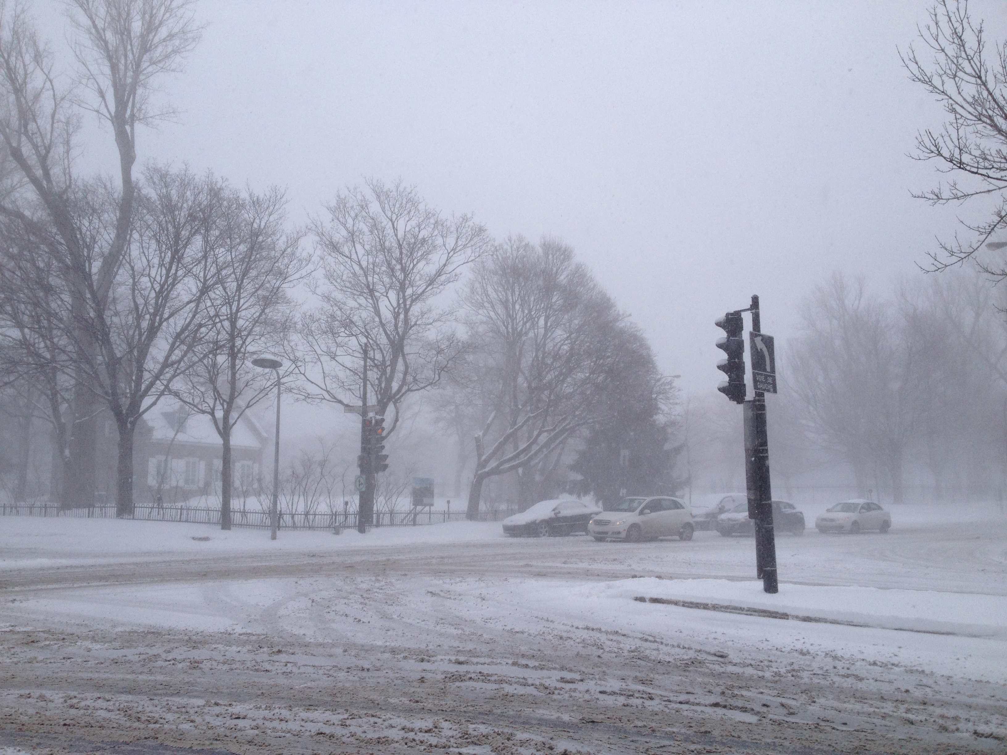 Lundi la neige tombait par moment, laissant vite une couche de poudreuse se former partout ; le vent soufflait en bourrasques, le décor changeait tellement vite, passant du blizzard aveuglant aux trouées de ciel bleu – c’était tellement beau. On marche facilement sur les trottoirs et pour traverser et j’ai compris après quelques jours l’intérêt de glisser les pantalons dans les bottes sinon le bas devient tout gris des éclaboussures. La boue se rapporte dans les halls d’entrée, malgré les paillassons ; même sans être une grande maniaque, j’imagine que je voudrais nettoyer tous les jours si j’étais chez moi.