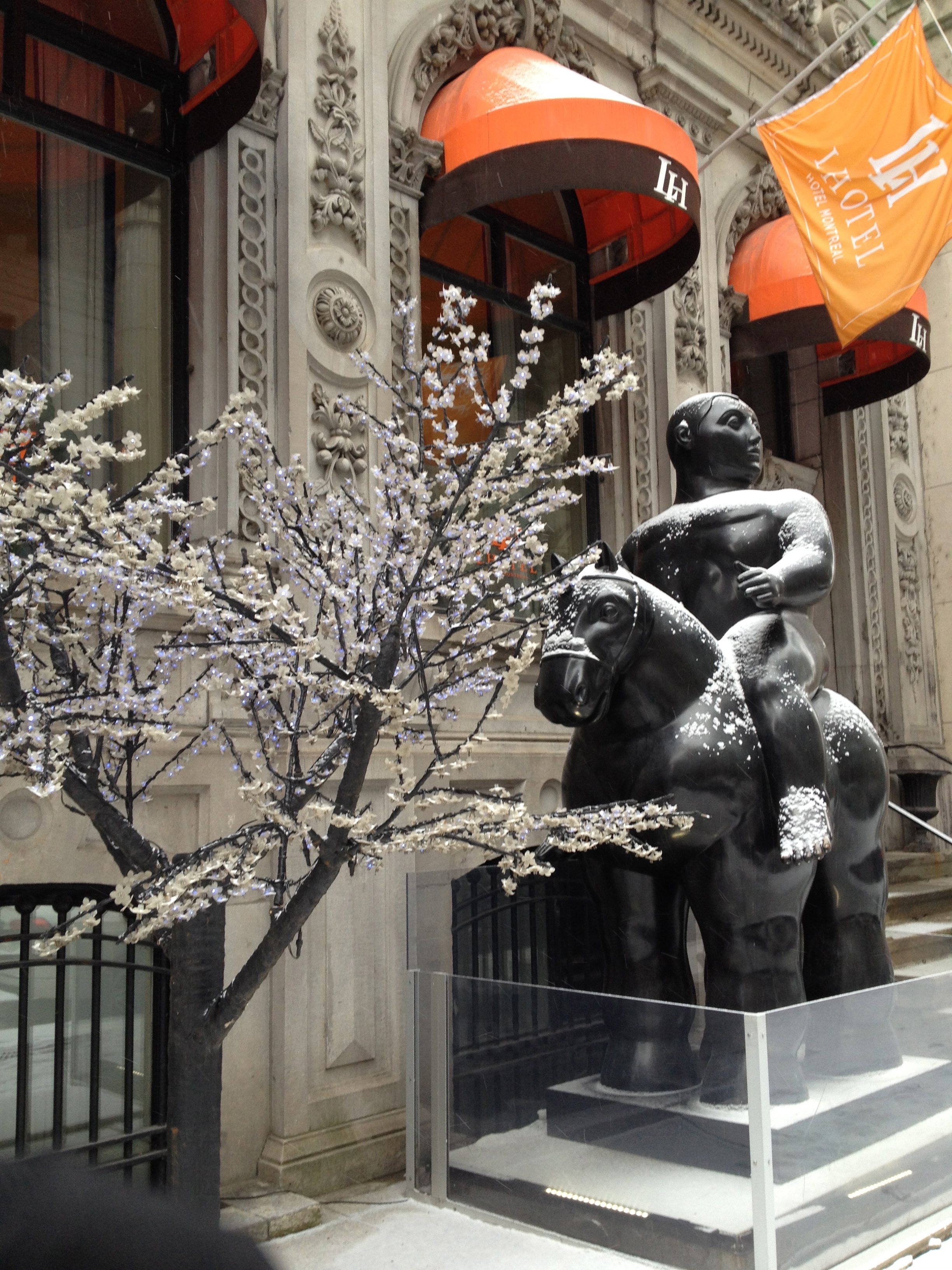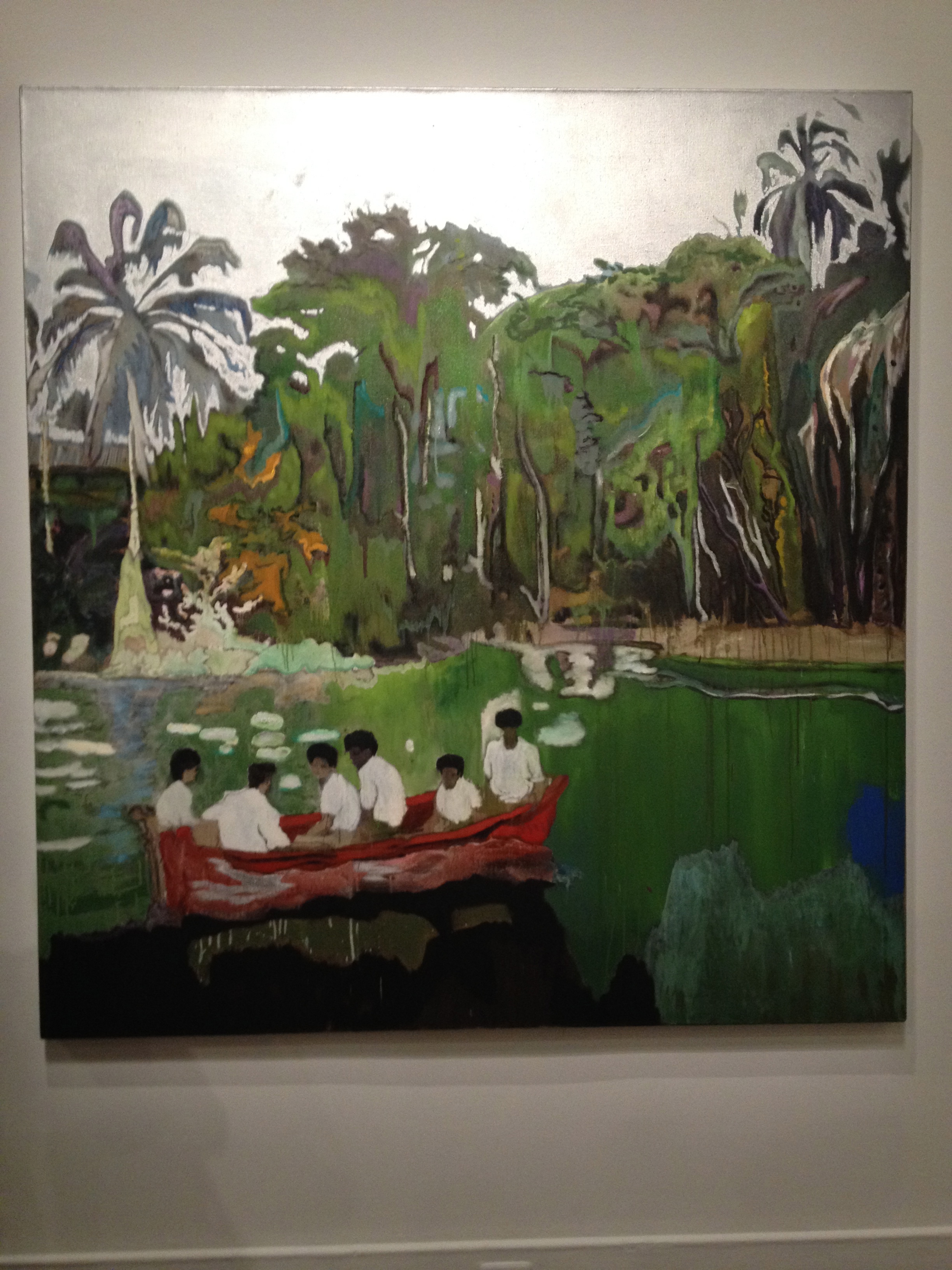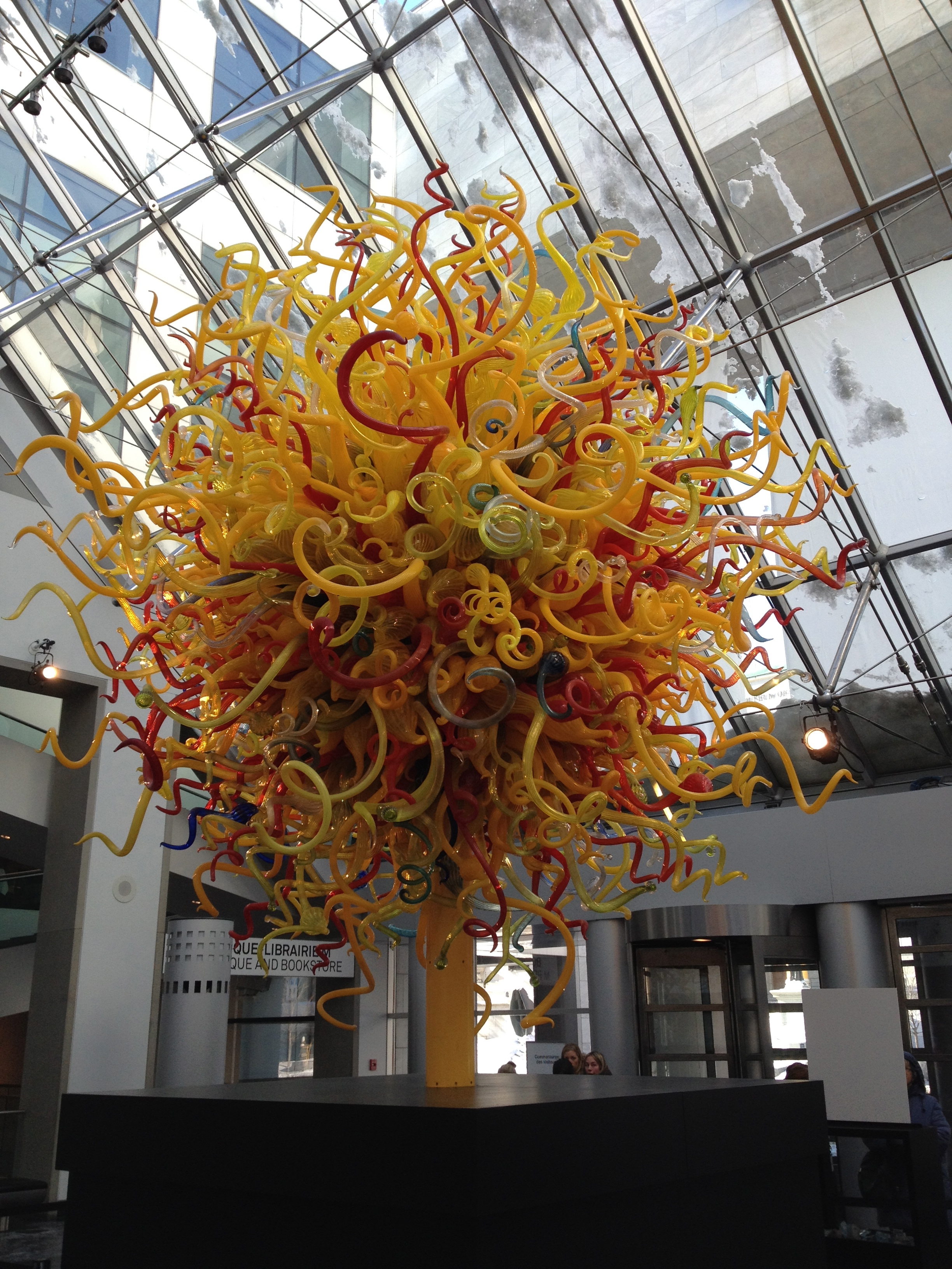 Martine a des goûts plus classiques, elle m’a incitée à l’accompagner au Musée des Beaux Arts pour une exposition de Peter Doig et c’était très très bien. Peter Doig est un artiste peintre né à Edimbourg, qui a grandi à Montréal pour ensuite s’installer à Trinidad. Sa peinture est facile d’accès, ses toiles sont grandes et colorées, ses plans d’eau font aussi vrais que nature, l’inspiration Gauguin ou Edward Hopper est visible et l’exposition était fort bien documentée. J’en ai profité pour capturer une photo de l’homme assis … dans la neige … de Jaume Plensa, pour Cristina ; après l’événement de cet été, le Musée a acquis une sculpture de verre de Chihuly – semblable à celle de Atlanta, toute lumineuse de jaunes.