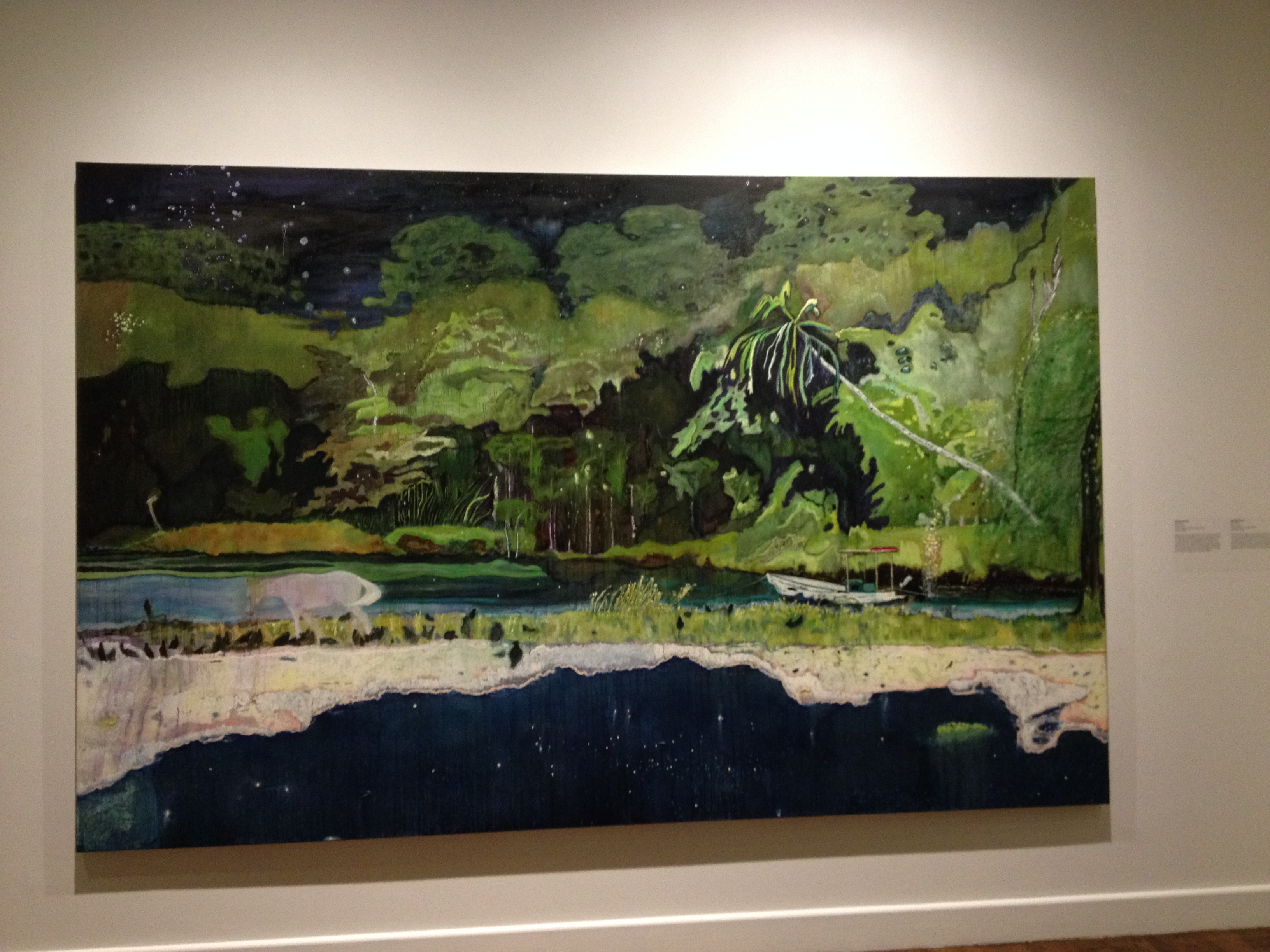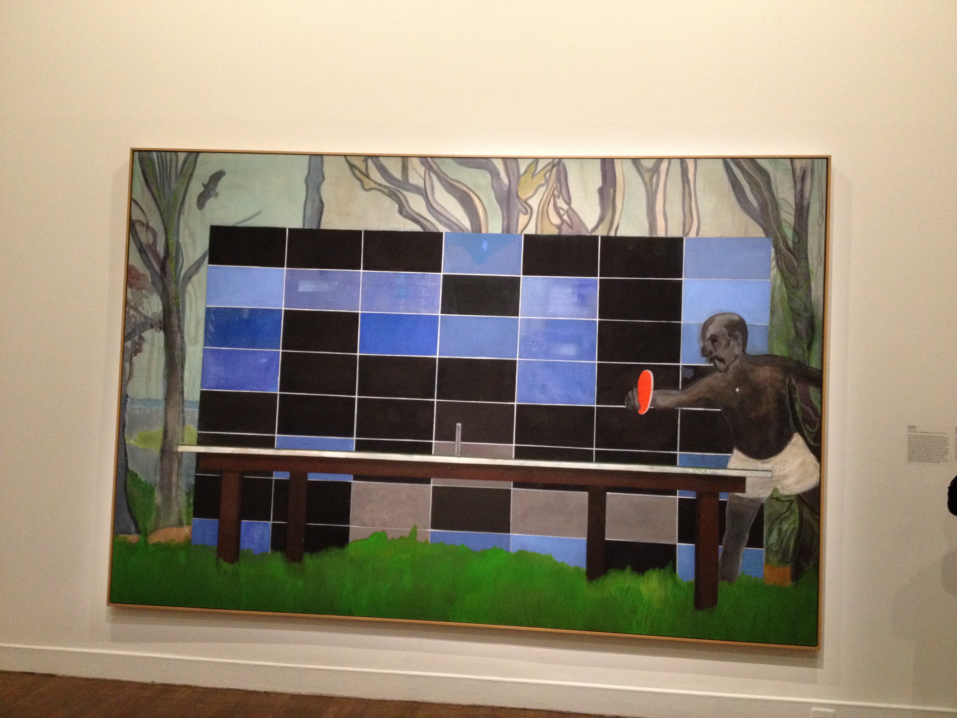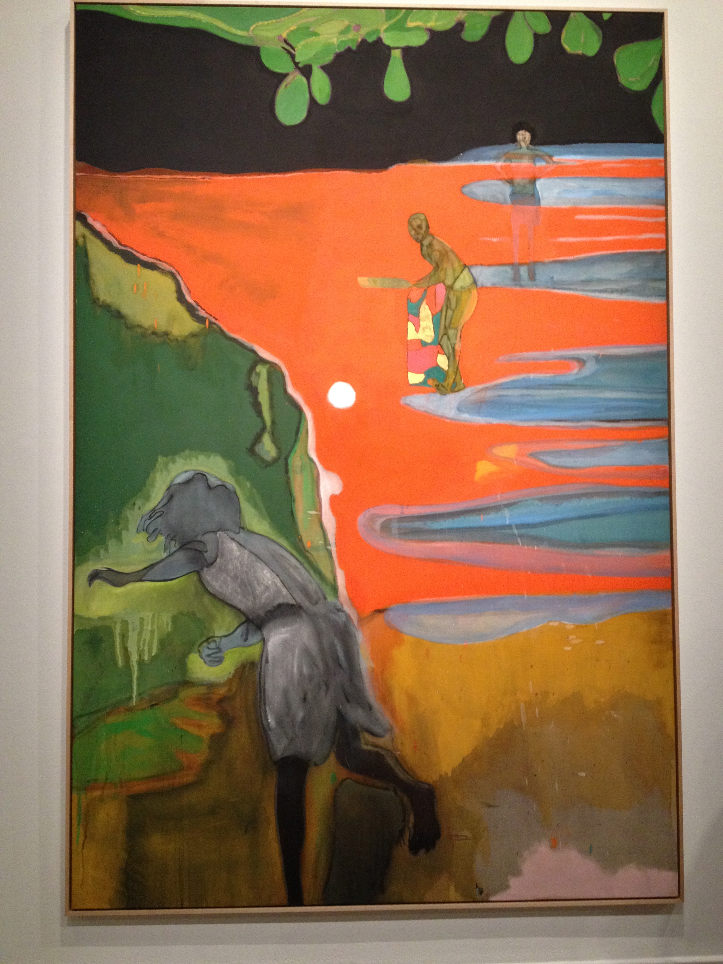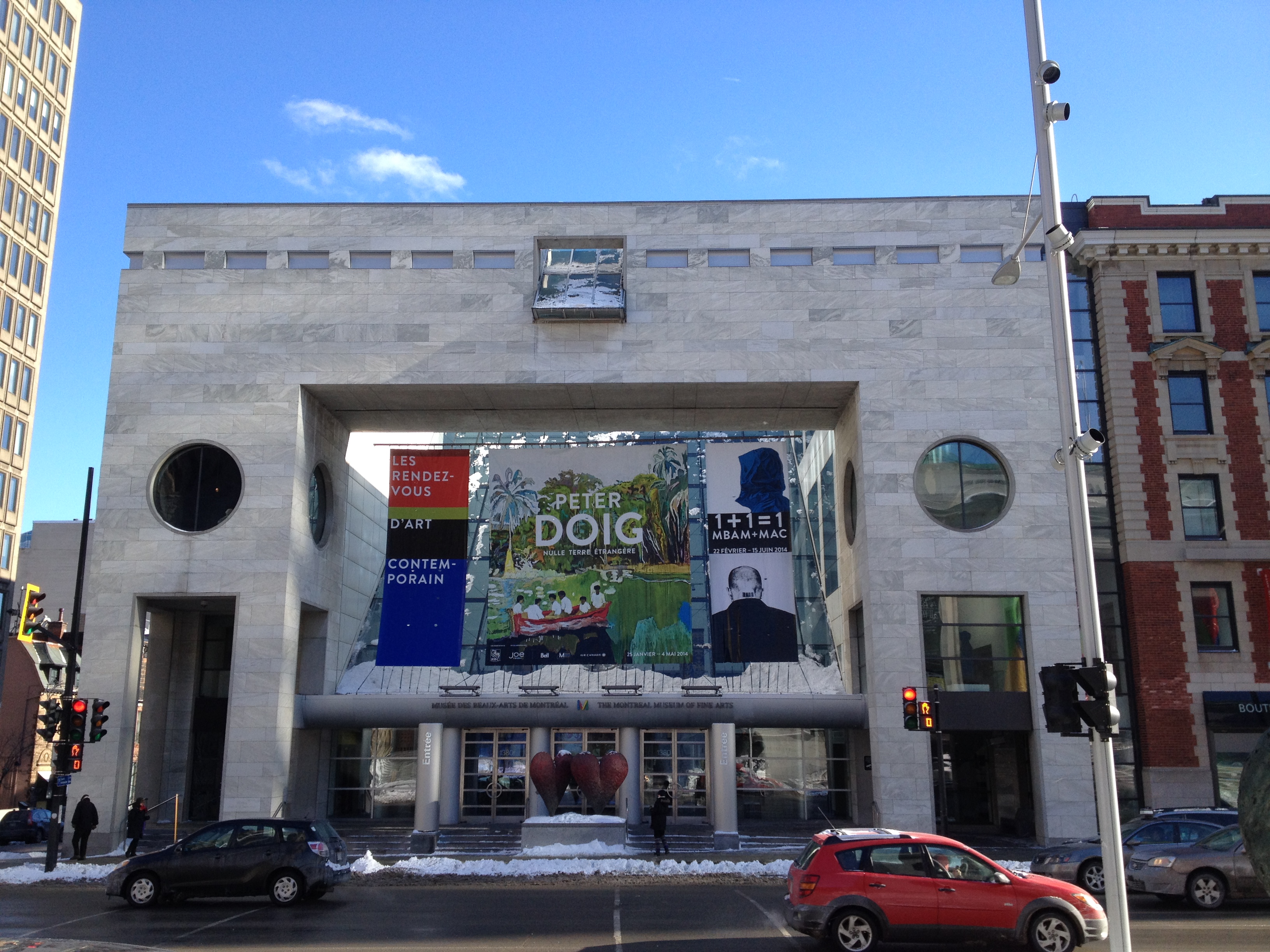 Martine a des goûts plus classiques, elle m’a incitée à l’accompagner au Musée des Beaux Arts pour une exposition de Peter Doig et c’était très très bien. Peter Doig est un artiste peintre né à Edimbourg, qui a grandi à Montréal pour ensuite s’installer à Trinidad. Sa peinture est facile d’accès, ses toiles sont grandes et colorées, ses plans d’eau font aussi vrais que nature, l’inspiration Gauguin ou Edward Hopper est visible et l’exposition était fort bien documentée. J’en ai profité pour capturer une photo de l’homme assis … dans la neige … de Jaume Plensa, pour Cristina ; après l’événement de cet été, le Musée a acquis une sculpture de verre de Chihuly – semblable à celle de Atlanta, toute lumineuse de jaunes.