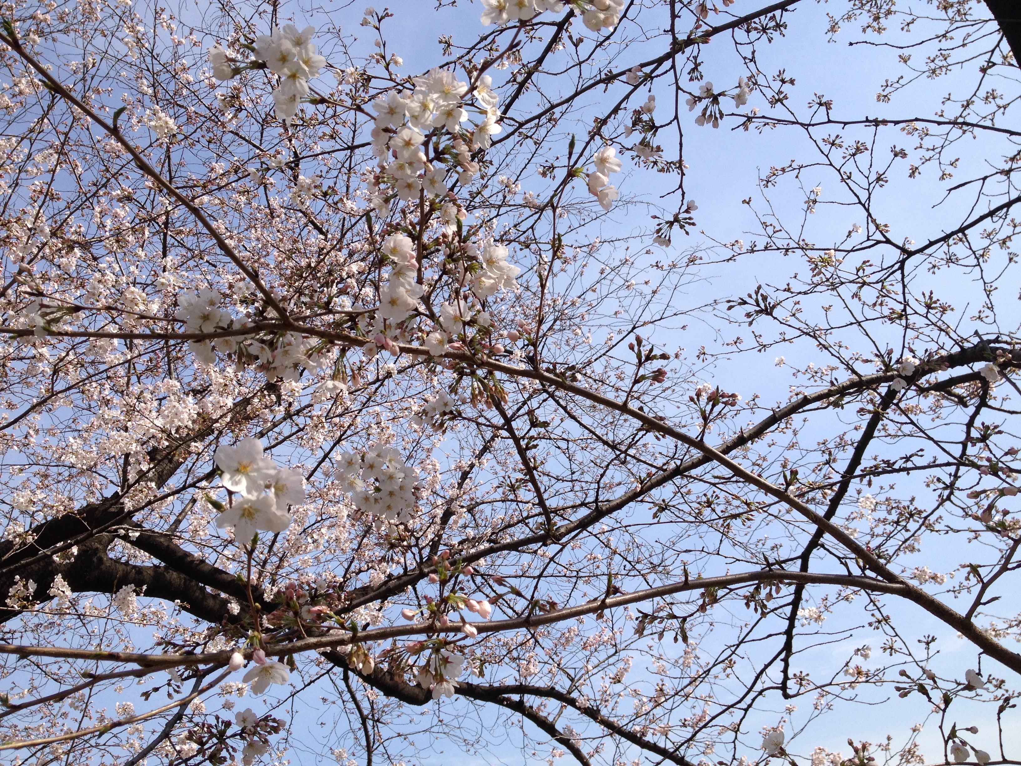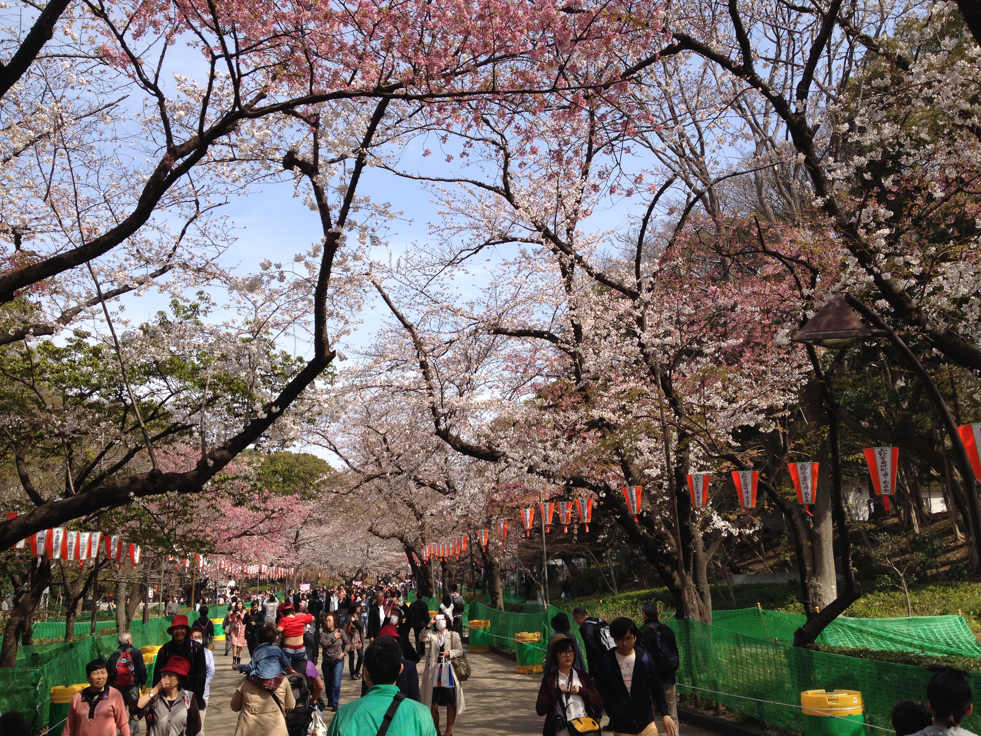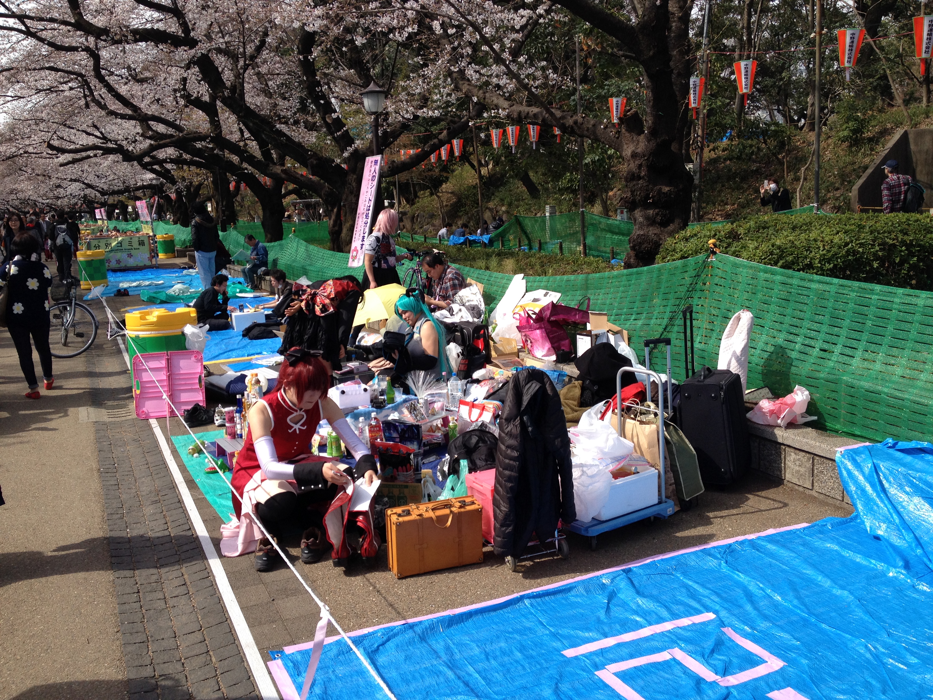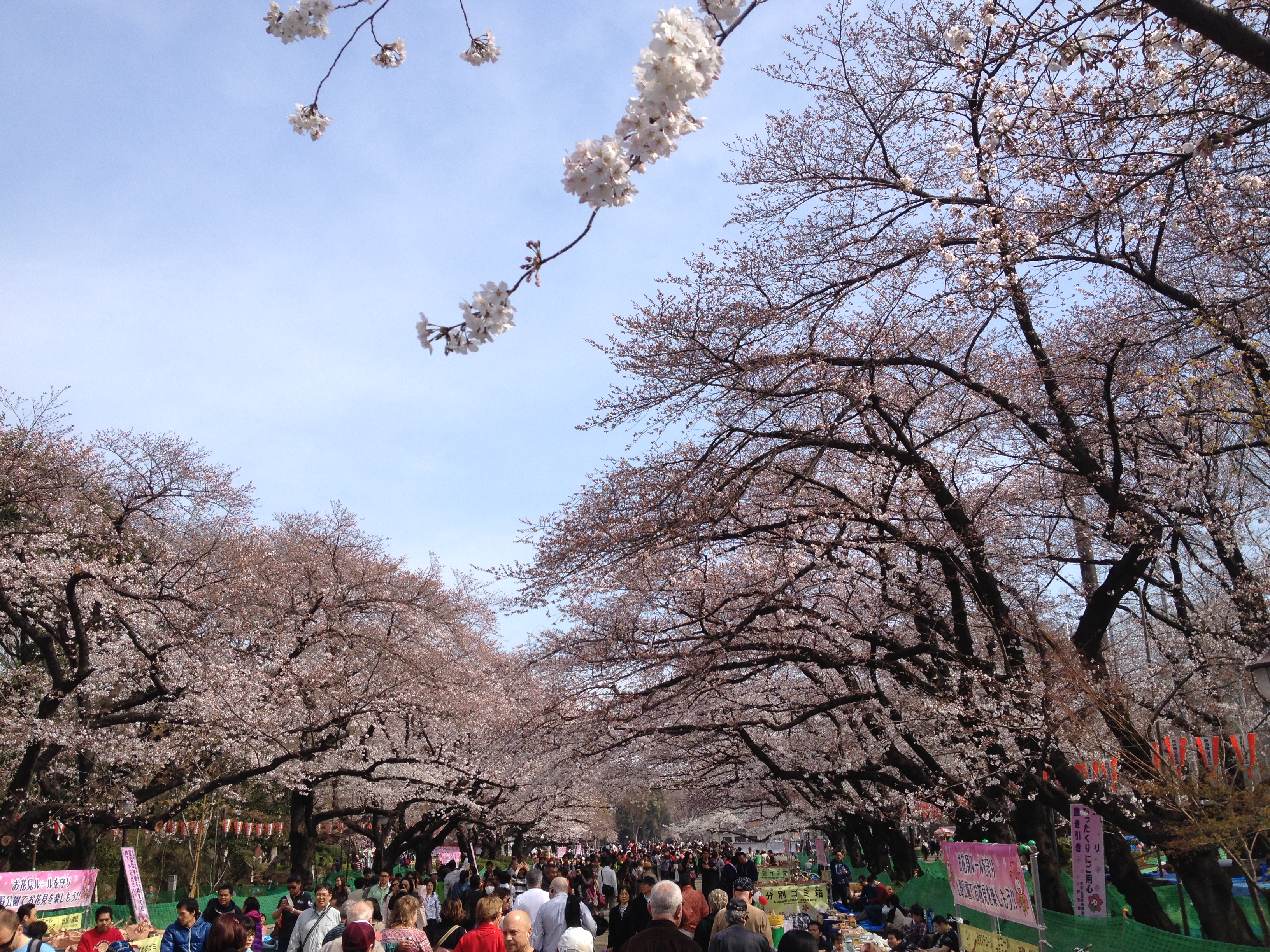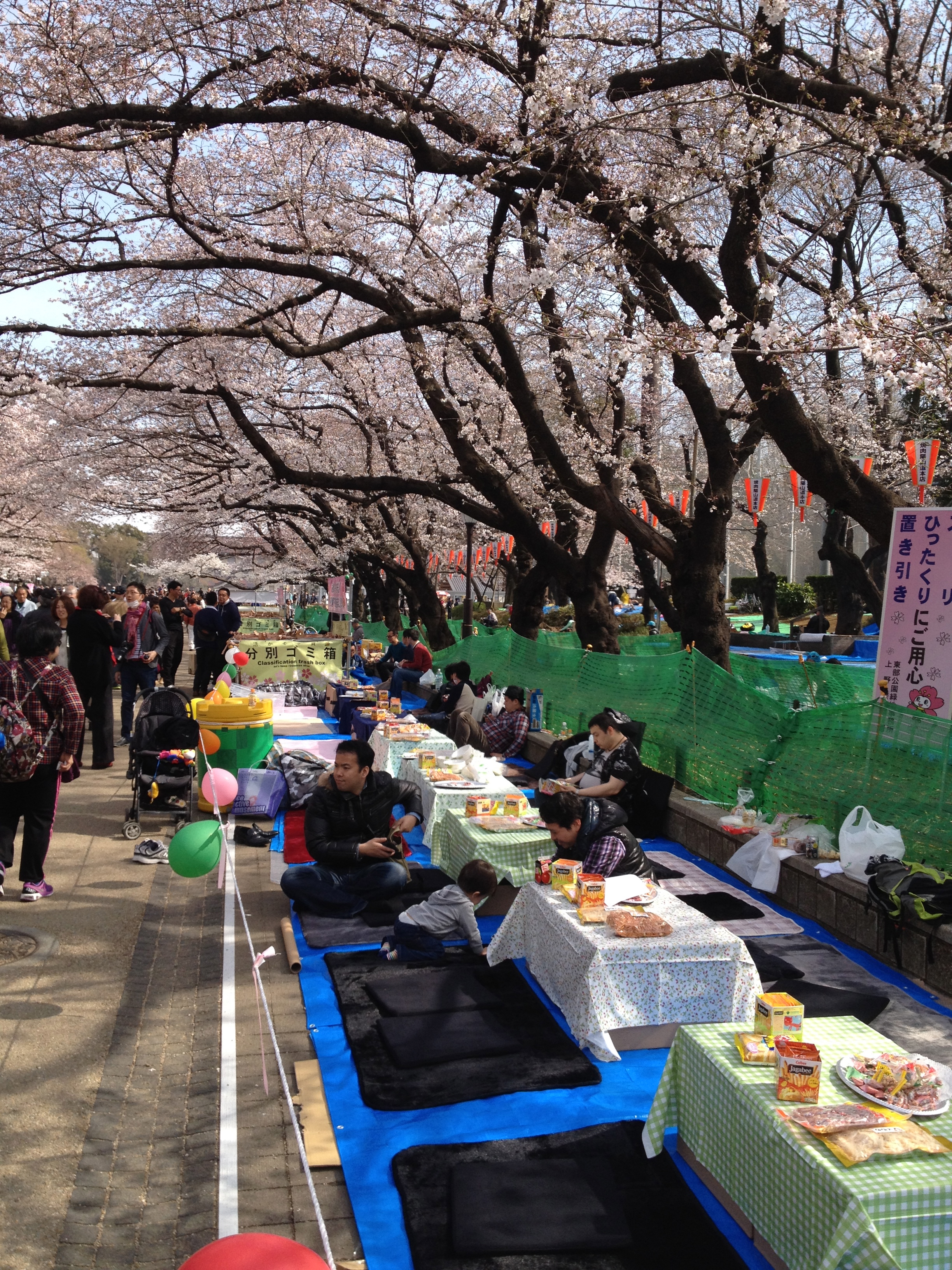 Quel monde et qu’elle bonne humeur! Les cerisiers blancs se sont épanouis ces derniers jours, offrant une galerie au toit fleuri splendide. Le spectacle au sol vaut aussi le détour: des familles, des groupes d’amis, des collègues semblent s’être installés pour rester! Certains ont construit tables et sièges en carton, recouverts ensuite de nappes et ont emmené nourriture et boissons pour tenir un siège. C’est une occasion de faire la fête, de boire du saké; certains ont campé la nuit ici pour réserver leur emplacement. Je me rends à présent bien compte de ce que signifie ce festival du cherry blossom au Japon!