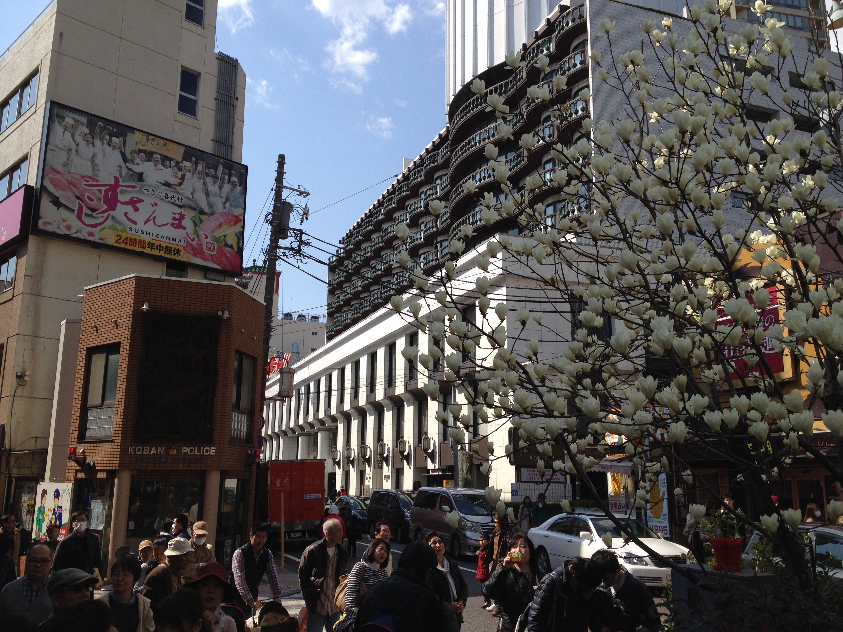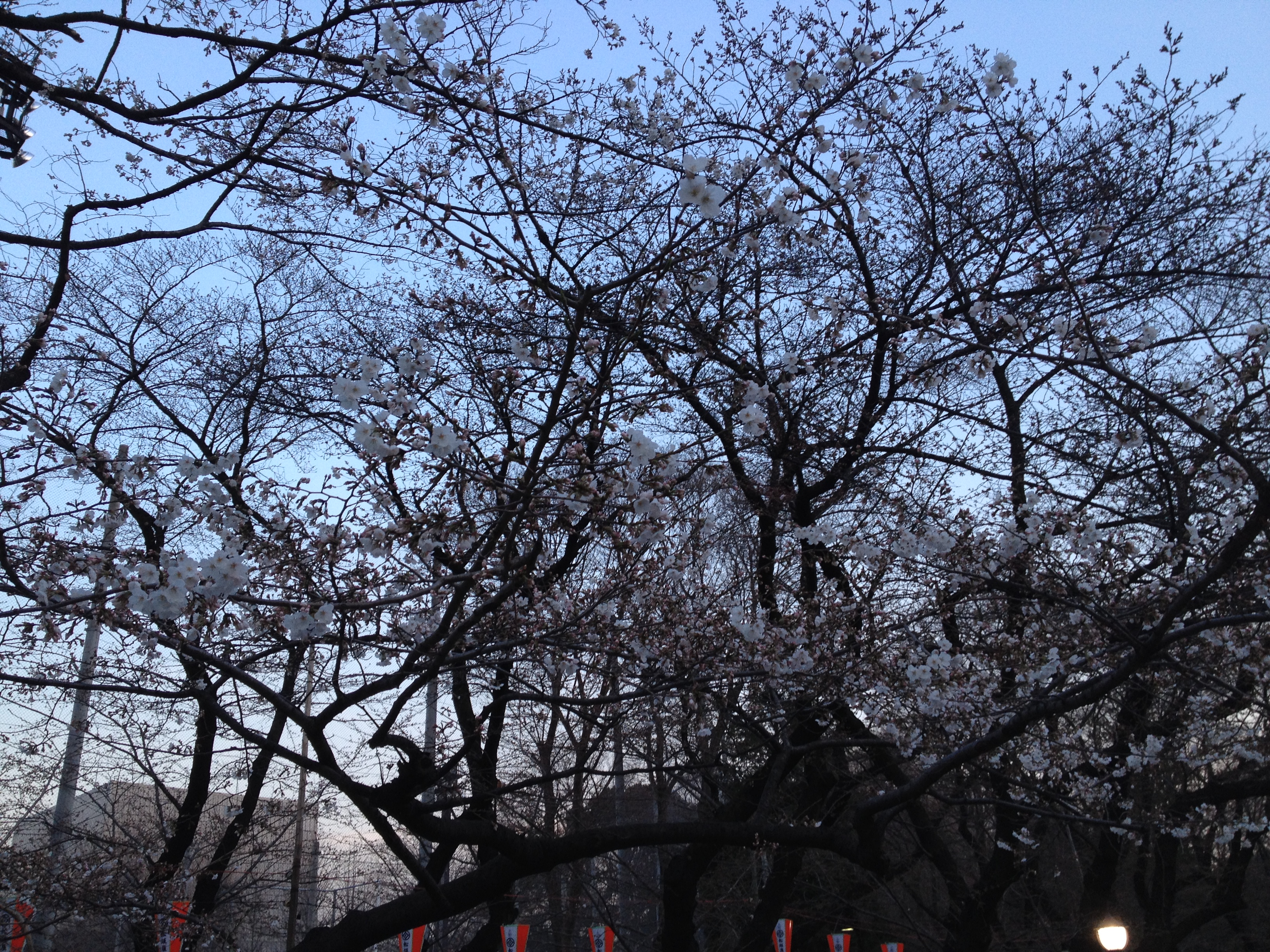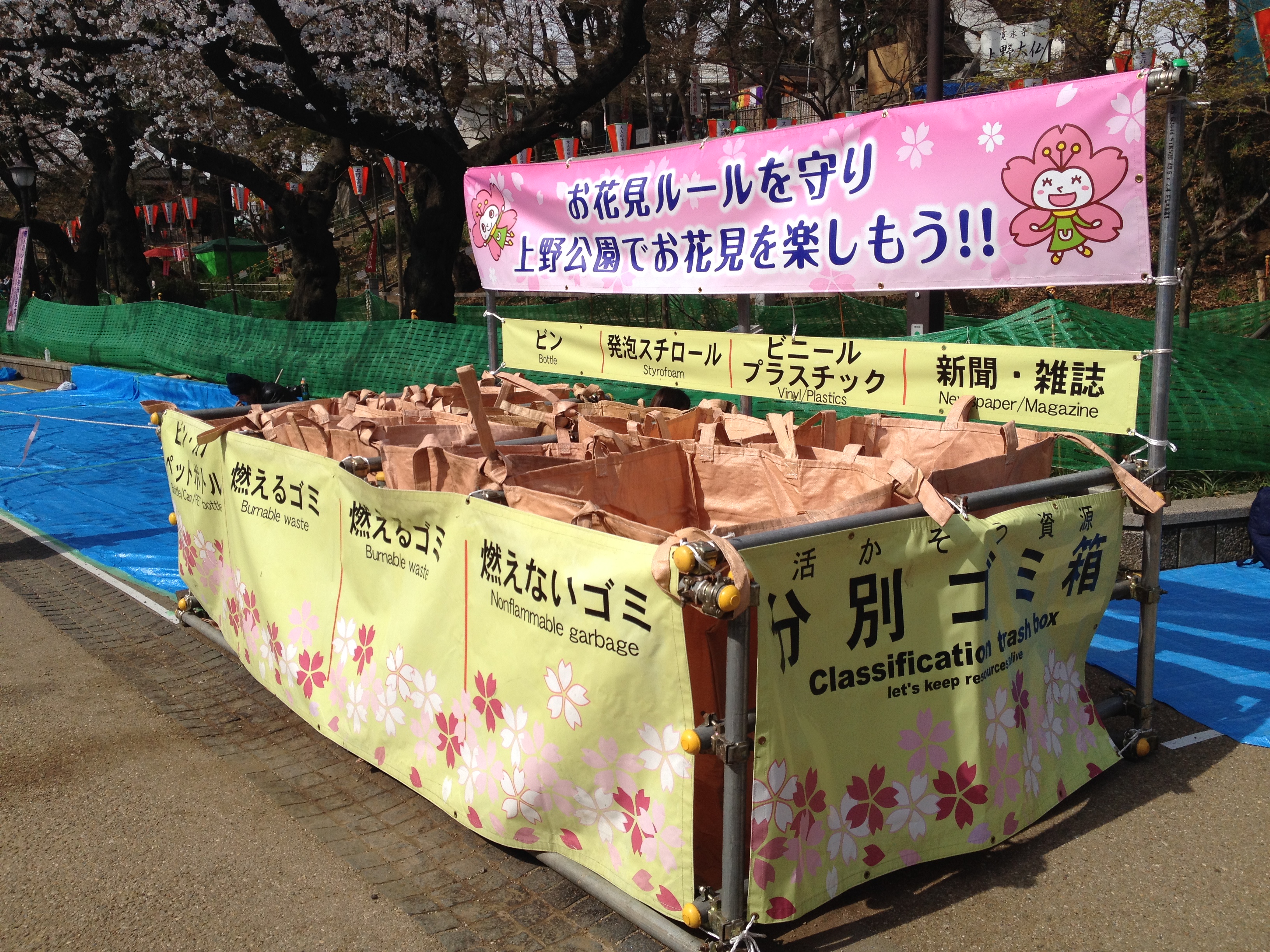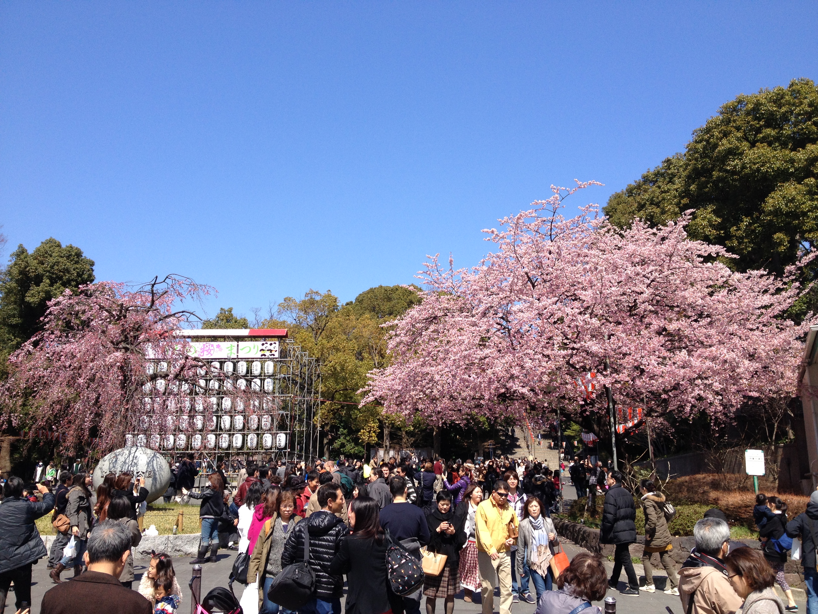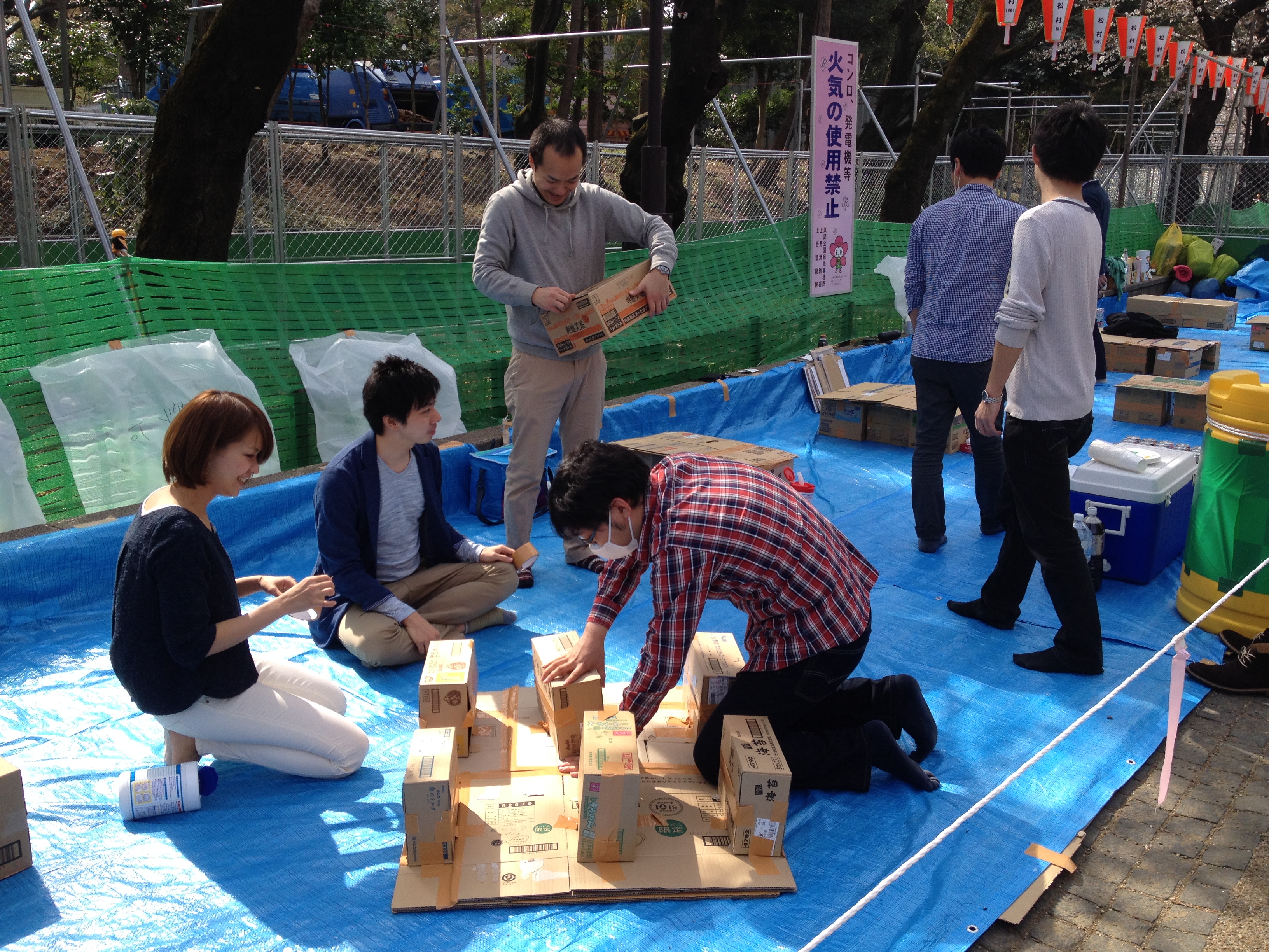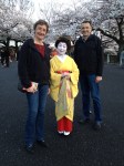 Quel monde et qu’elle bonne humeur! Les cerisiers blancs se sont épanouis ces derniers jours, offrant une galerie au toit fleuri splendide. Le spectacle au sol vaut aussi le détour: des familles, des groupes d’amis, des collègues semblent s’être installés pour rester! Certains ont construit tables et sièges en carton, recouverts ensuite de nappes et ont emmené nourriture et boissons pour tenir un siège. C’est une occasion de faire la fête, de boire du saké; certains ont campé la nuit ici pour réserver leur emplacement. Je me rends à présent bien compte de ce que signifie ce festival du cherry blossom au Japon!
