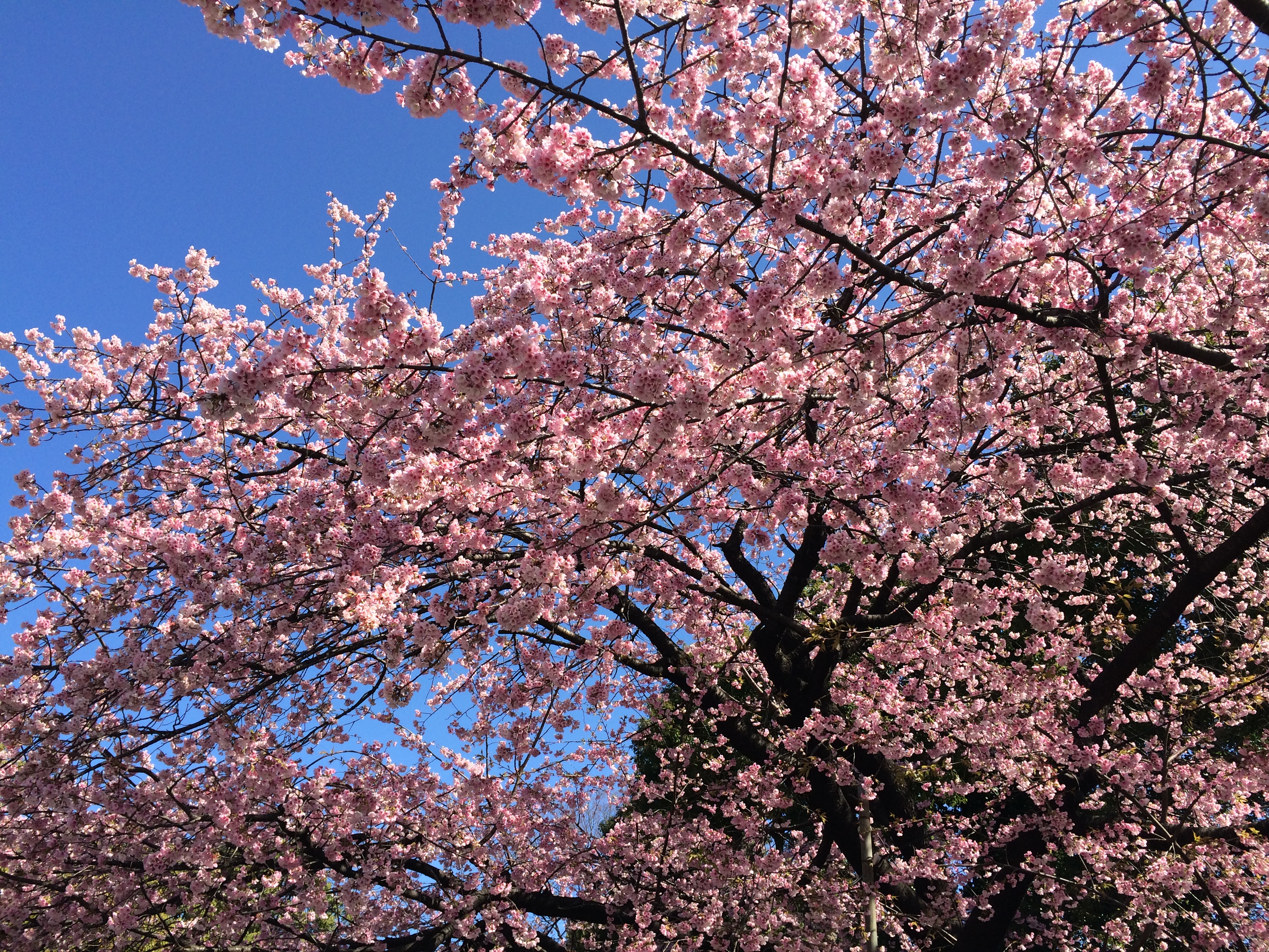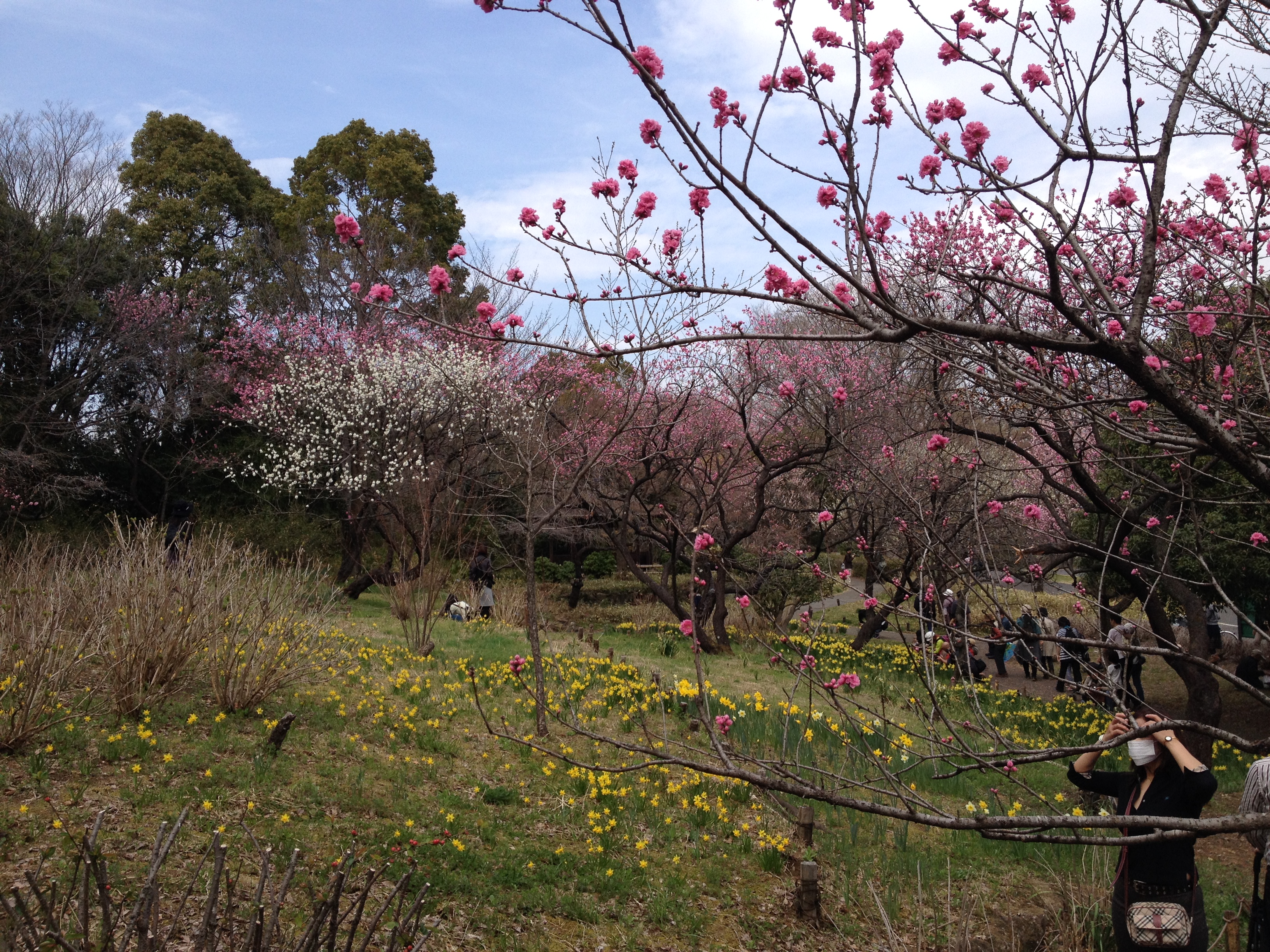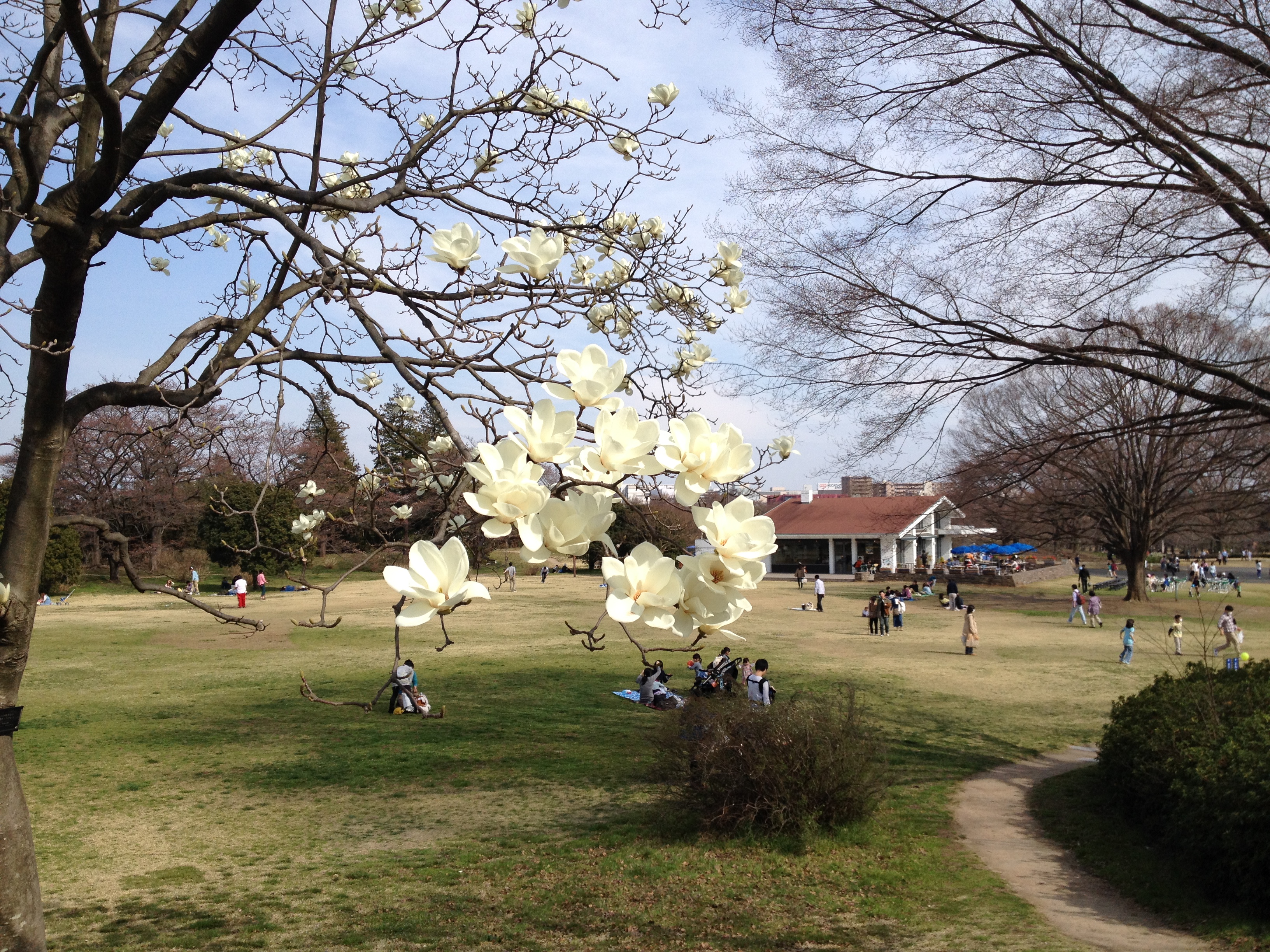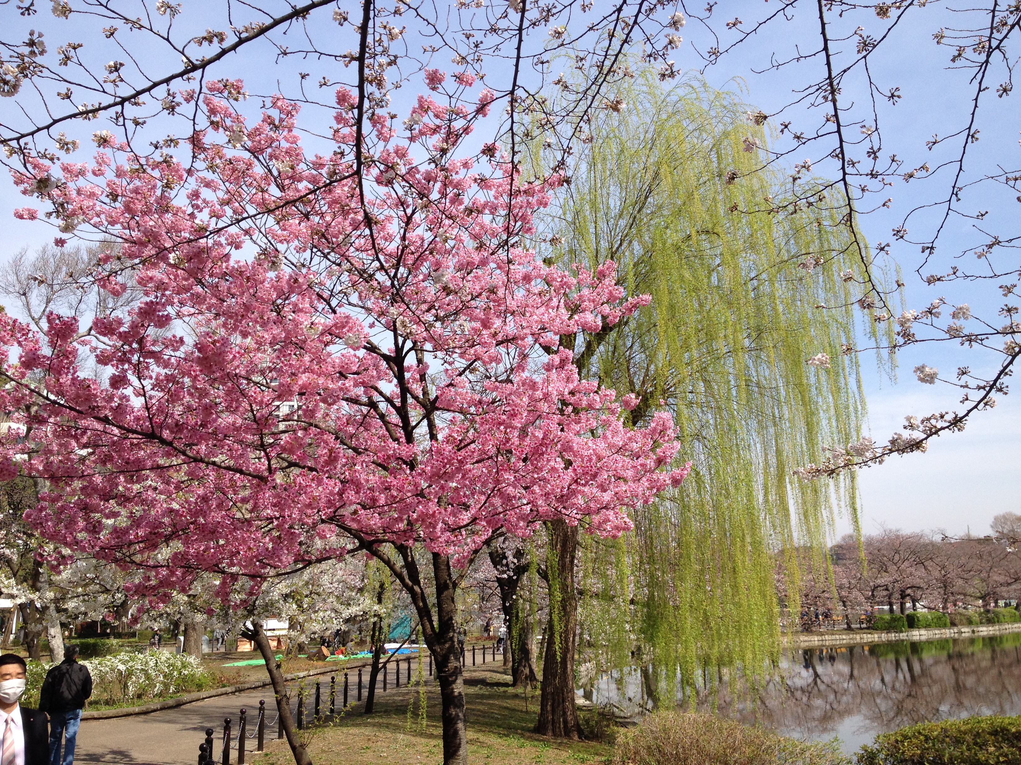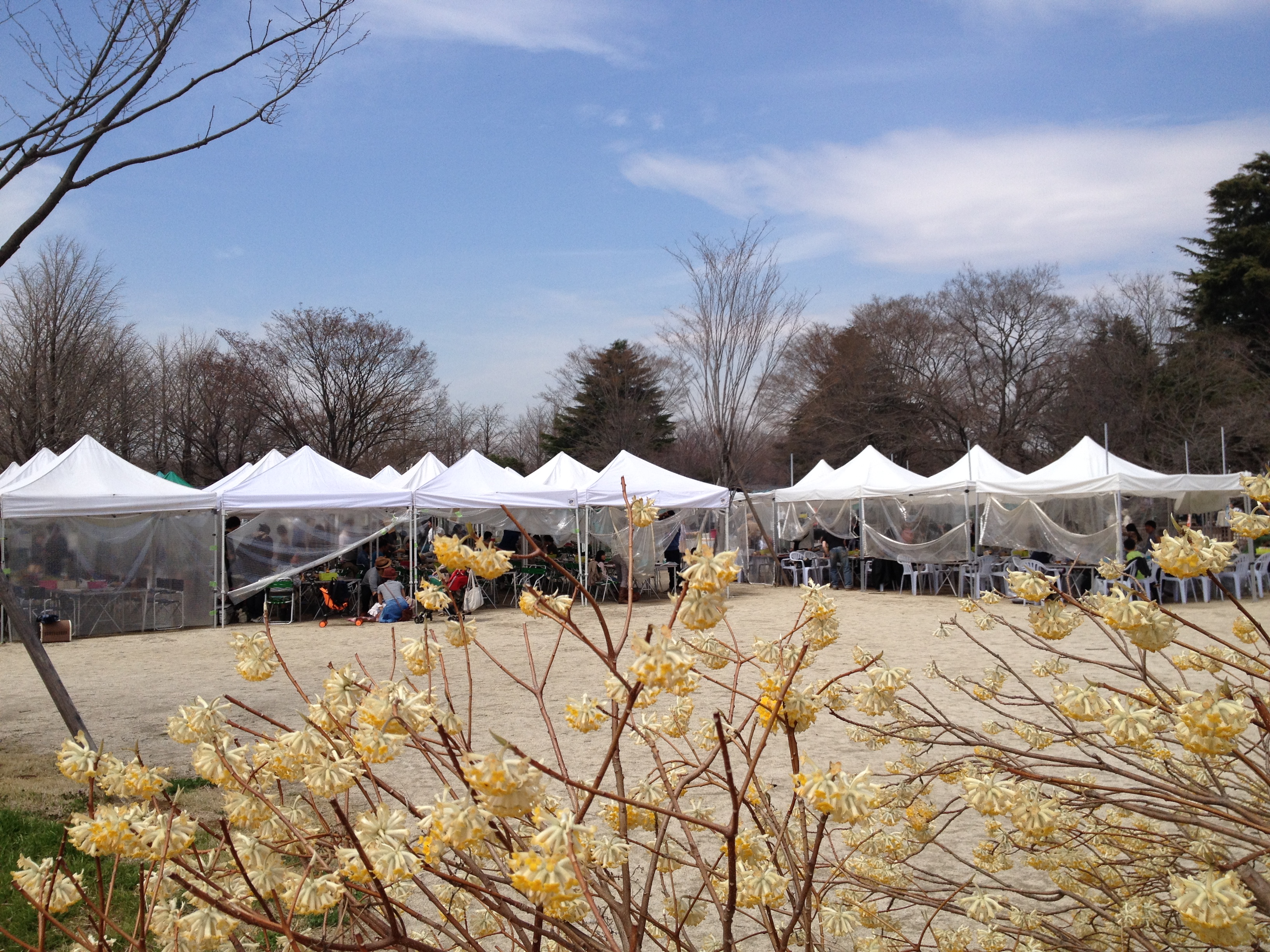 Quel monde et qu’elle bonne humeur! Les cerisiers blancs se sont épanouis ces derniers jours, offrant une galerie au toit fleuri splendide. Le spectacle au sol vaut aussi le détour: des familles, des groupes d’amis, des collègues semblent s’être installés pour rester! Certains ont construit tables et sièges en carton, recouverts ensuite de nappes et ont emmené nourriture et boissons pour tenir un siège. C’est une occasion de faire la fête, de boire du saké; certains ont campé la nuit ici pour réserver leur emplacement. Je me rends à présent bien compte de ce que signifie ce festival du cherry blossom au Japon!