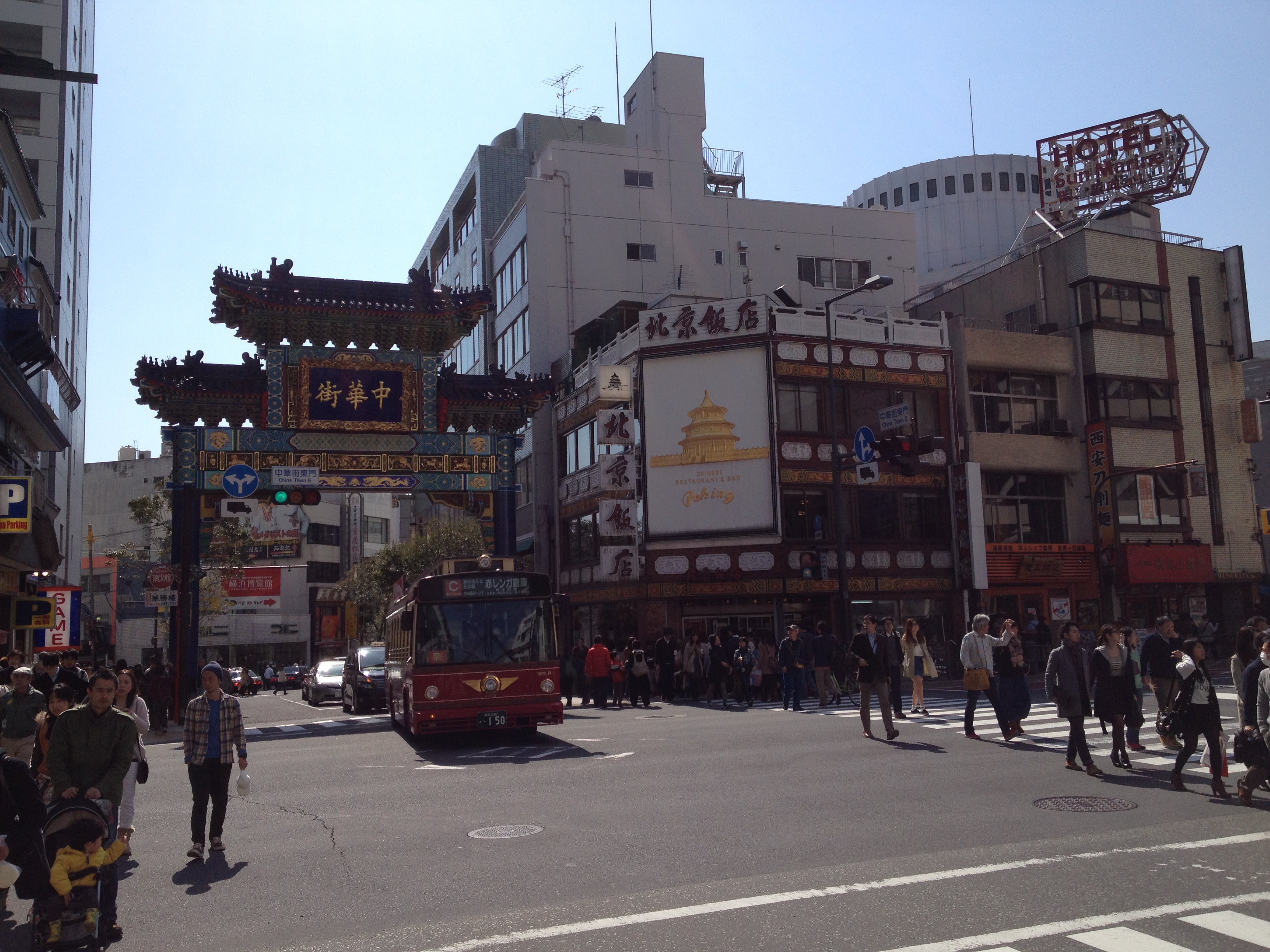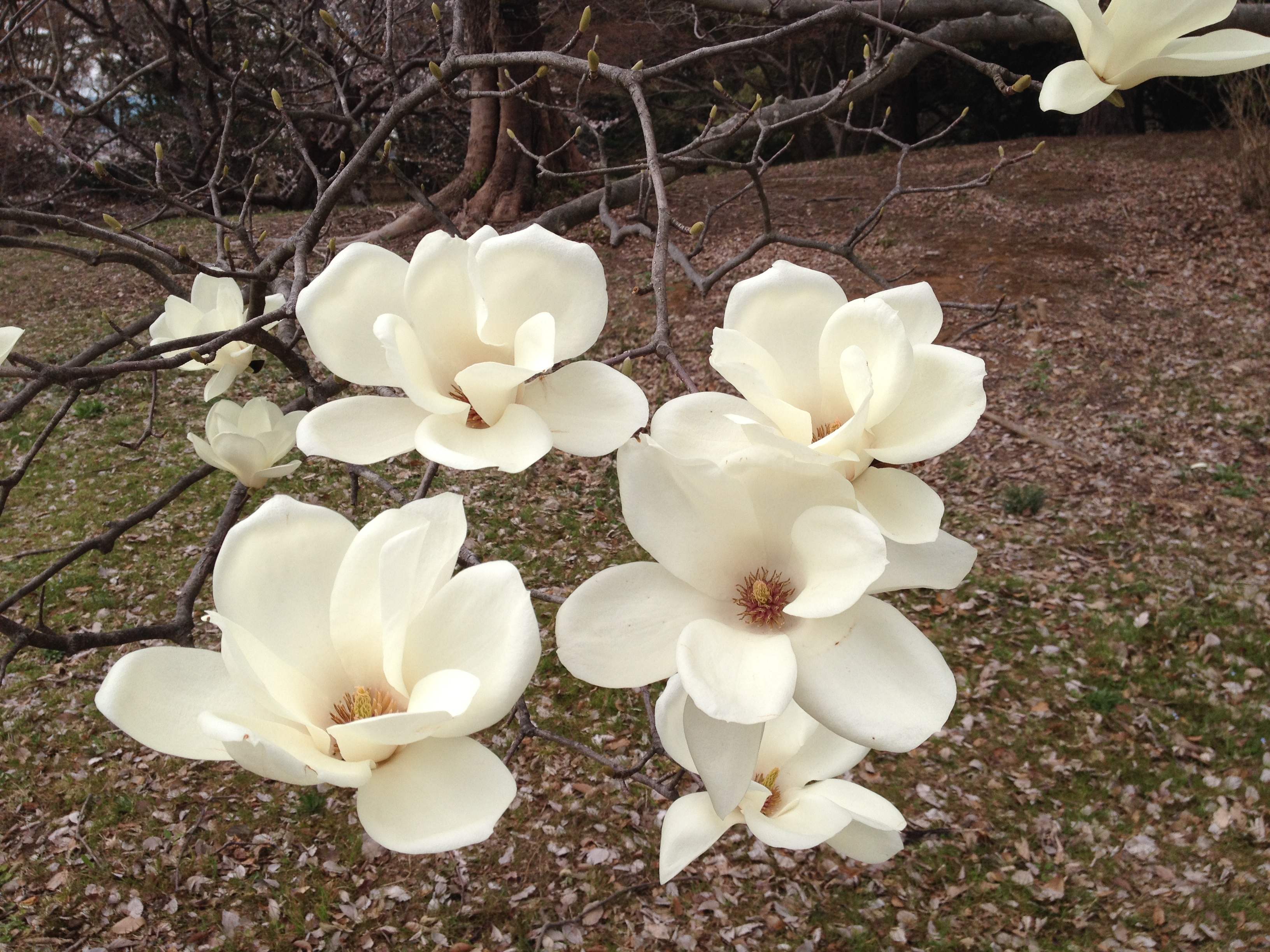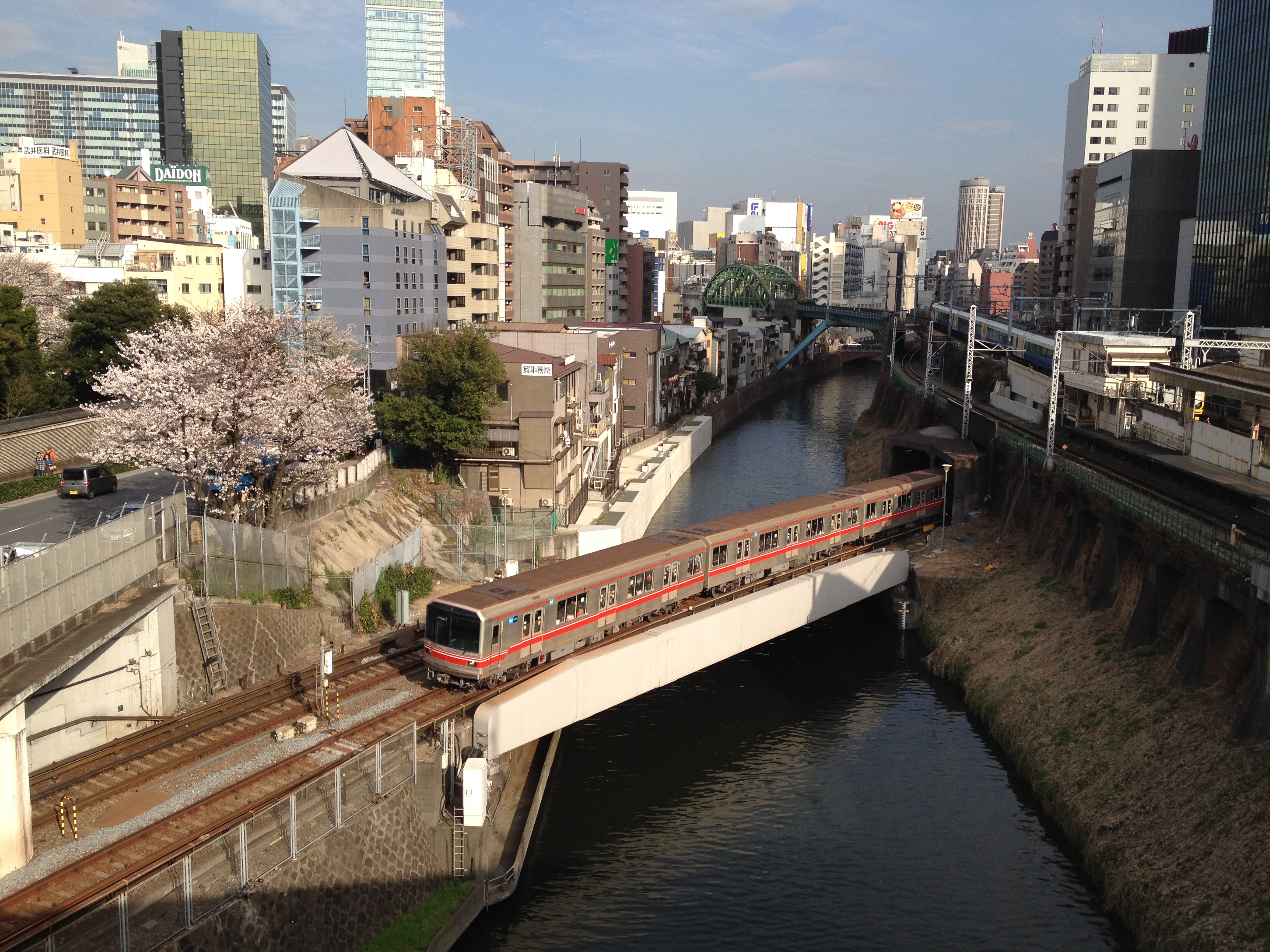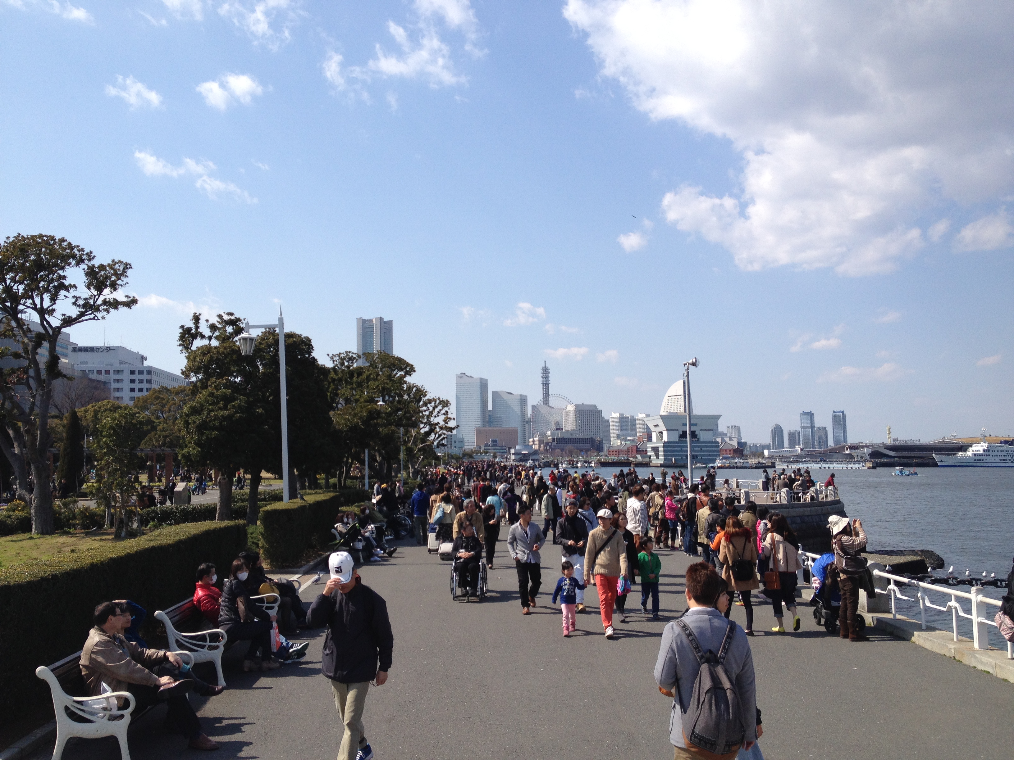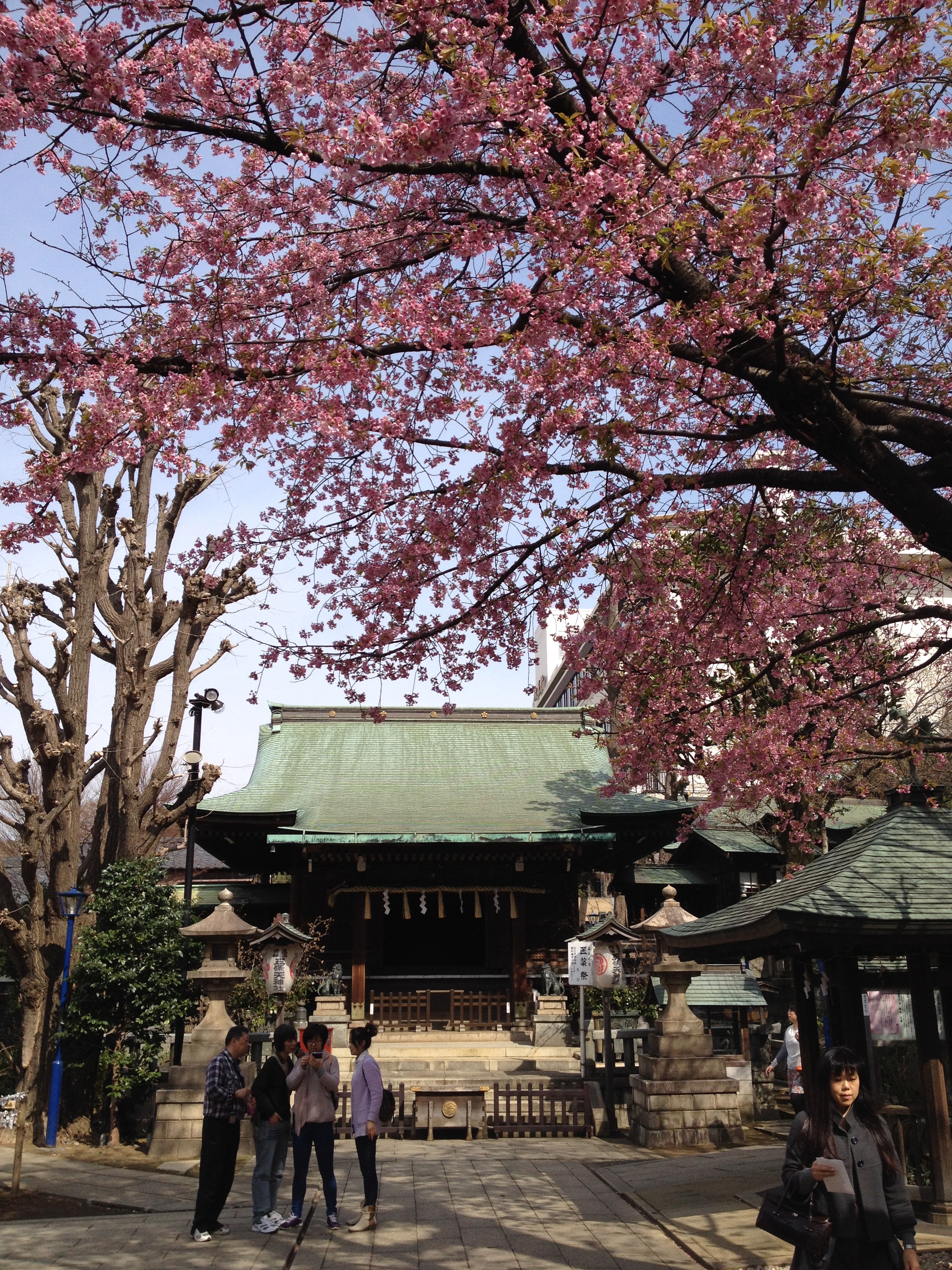 Quel monde et qu’elle bonne humeur! Les cerisiers blancs se sont épanouis ces derniers jours, offrant une galerie au toit fleuri splendide. Le spectacle au sol vaut aussi le détour: des familles, des groupes d’amis, des collègues semblent s’être installés pour rester! Certains ont construit tables et sièges en carton, recouverts ensuite de nappes et ont emmené nourriture et boissons pour tenir un siège. C’est une occasion de faire la fête, de boire du saké; certains ont campé la nuit ici pour réserver leur emplacement. Je me rends à présent bien compte de ce que signifie ce festival du cherry blossom au Japon!