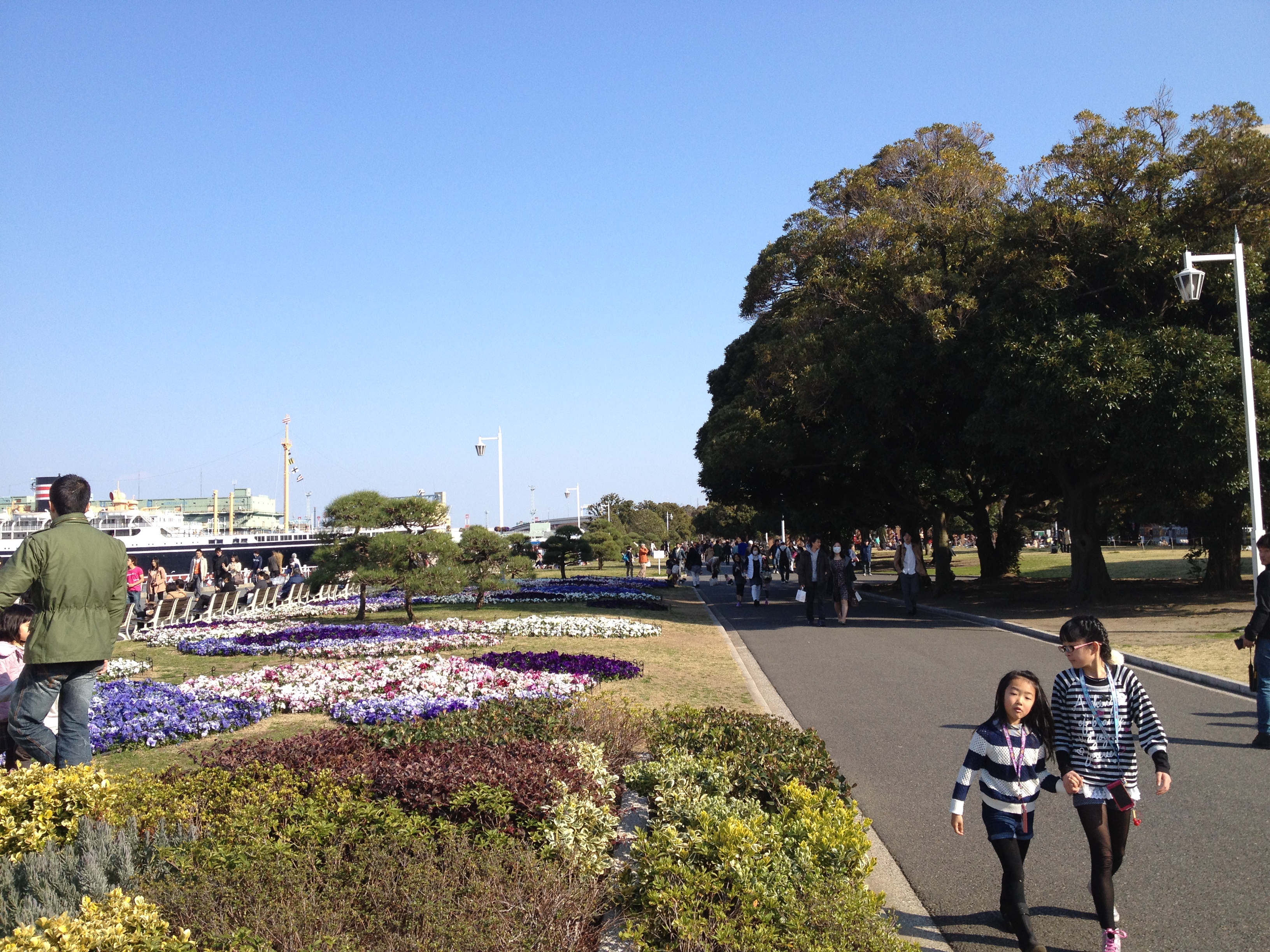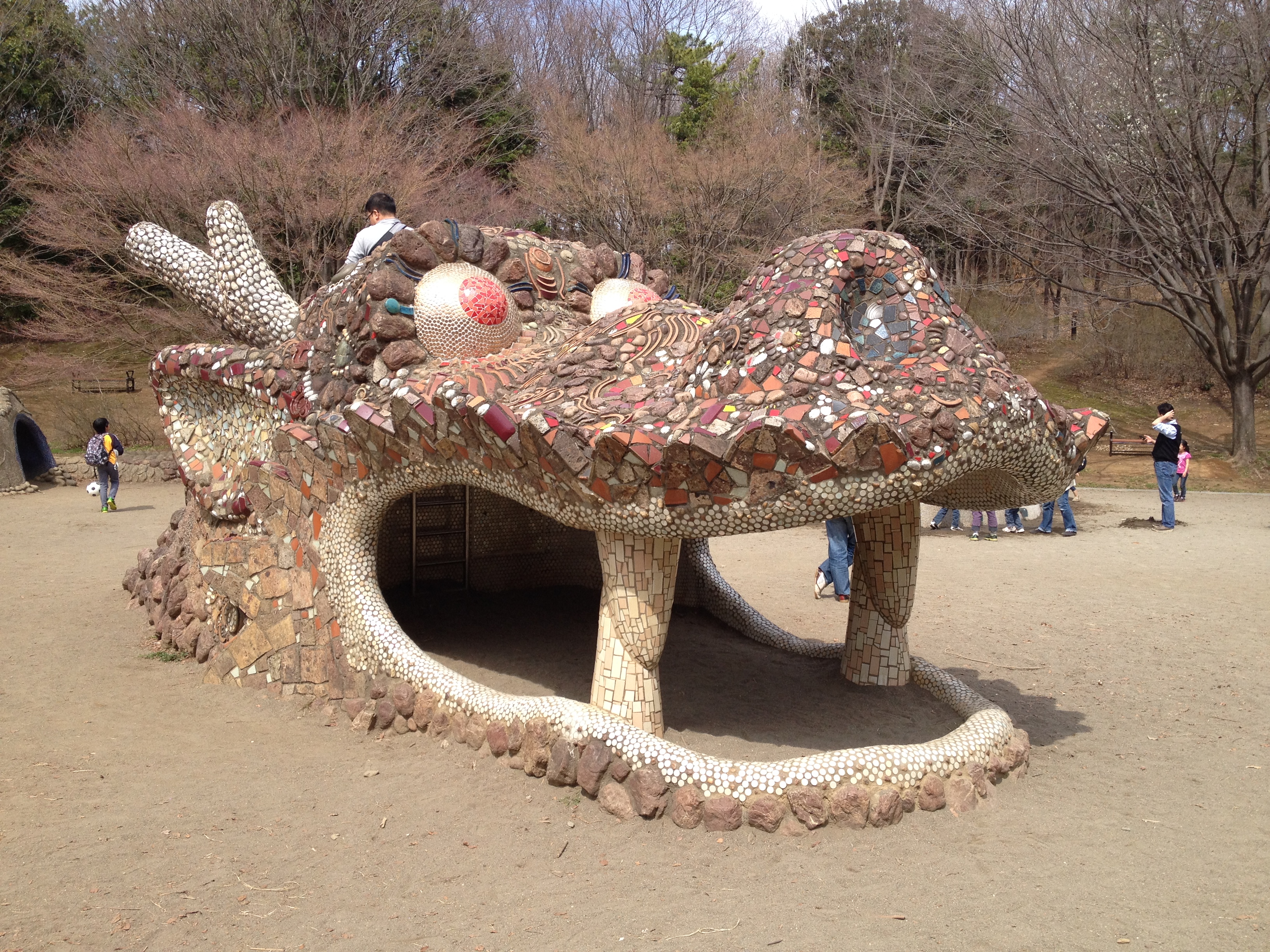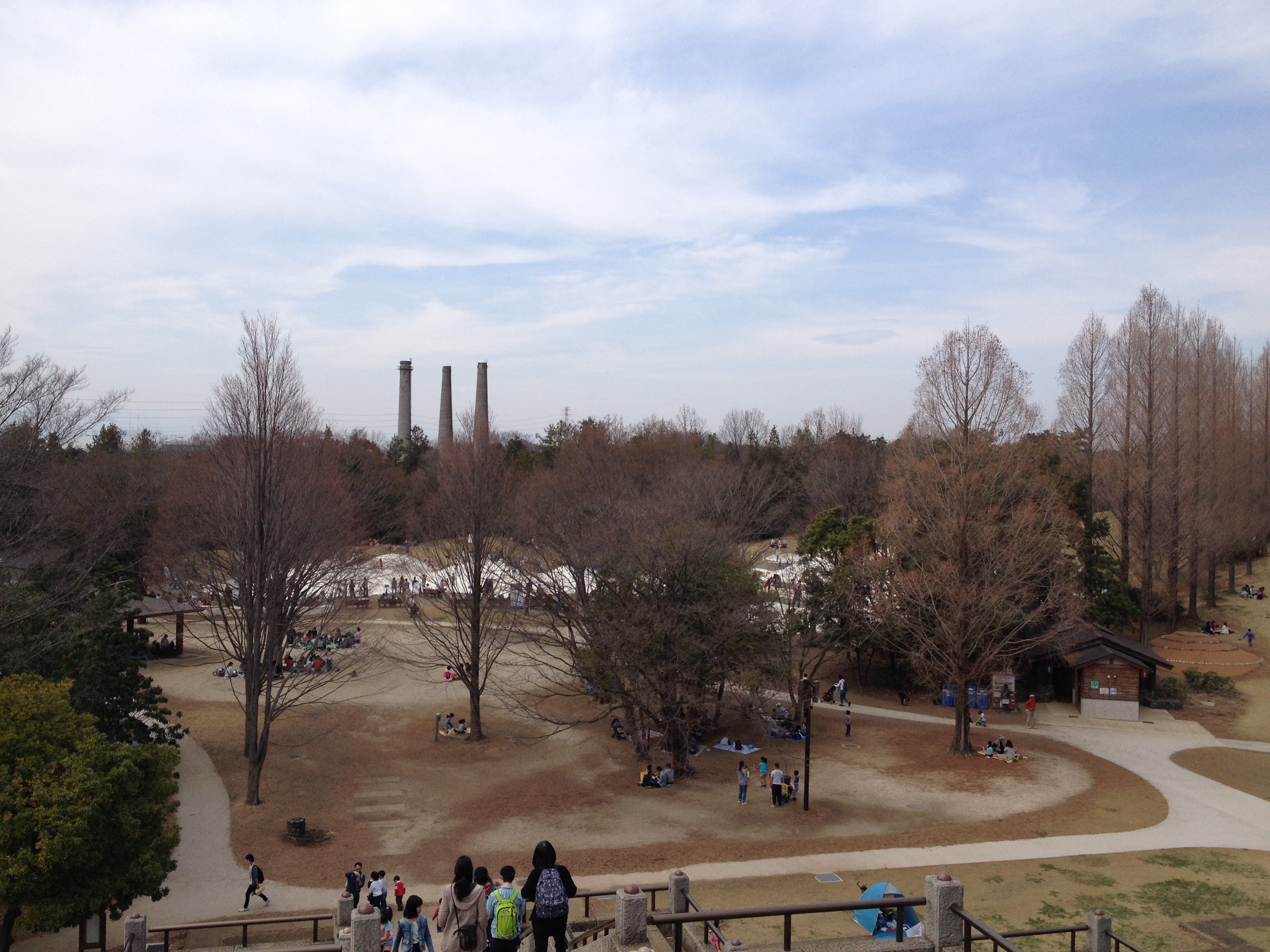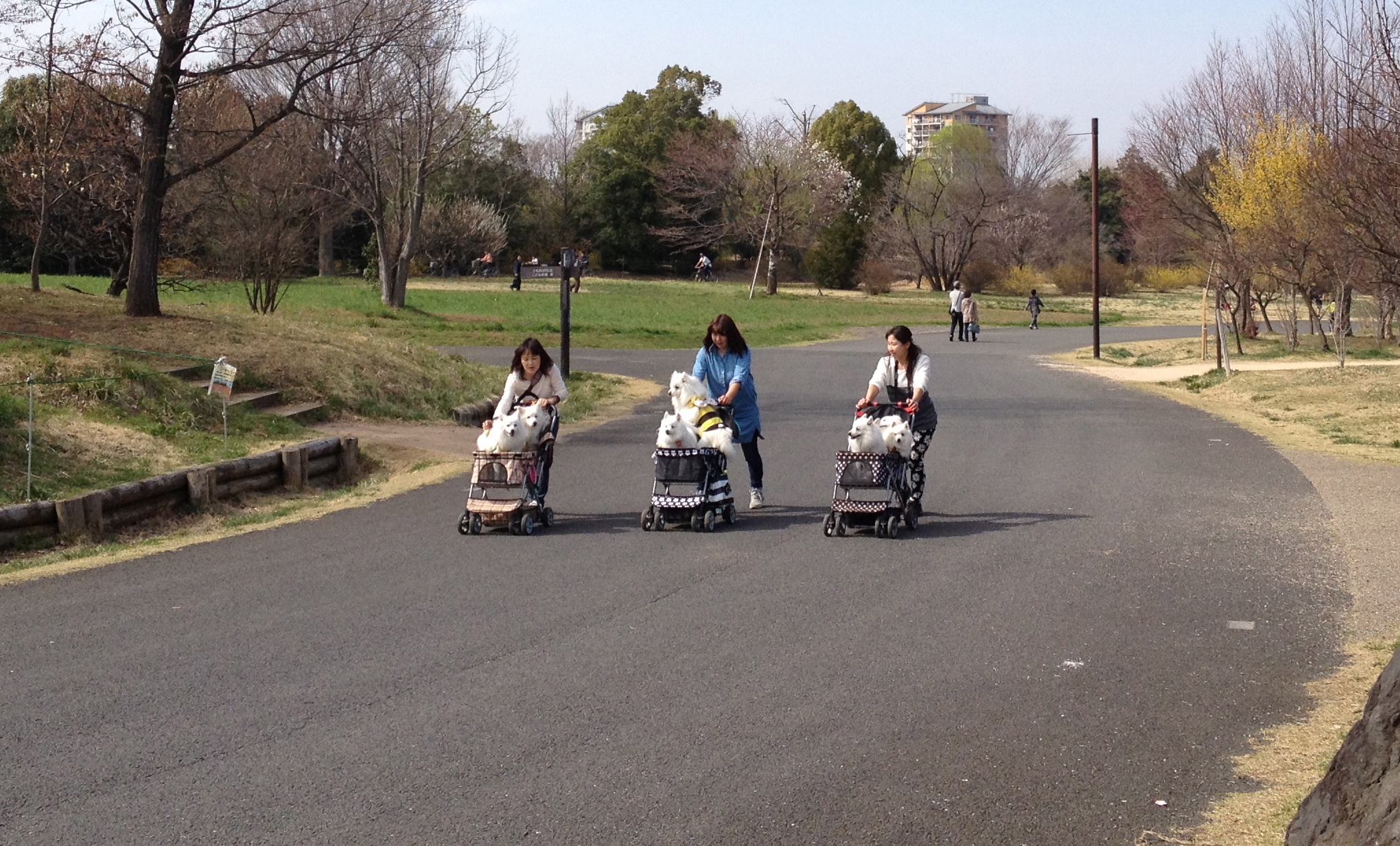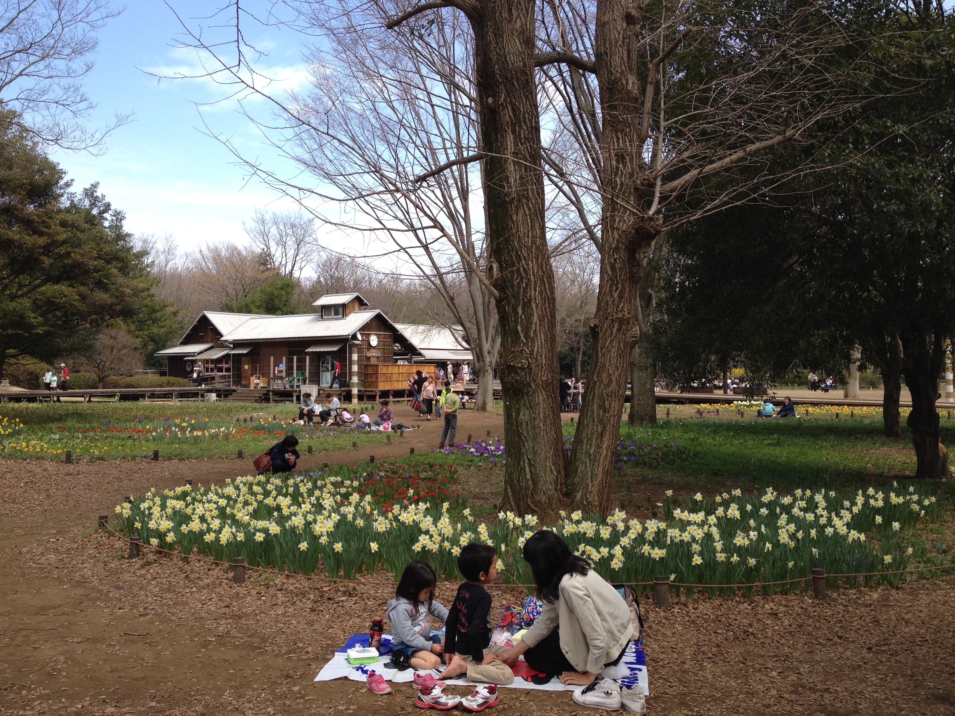 Le Showa Kinen Park a été aménagé en l’honneur de l’empereur Showa, Hirohito, qui était au pouvoir durant la période de la deuxième guerre mondiale. C’est vraiment immense et cela permet de ressentir un souffle de liberté et d’espace malgré les centaines, voire milliers, de japonais qui ont eu la même idée. Il s’agit d’un parc récréatif où nous nous laissons aller, attirées tantôt par l’animation ou par le calme, tantôt par un tapis de fleurs ou par des arbres superbes. Les gens viennent en famille, il y a beaucoup d’enfants, ils se promènent ou bien ont loué un vélo; les poussettes sont très utilisées pour les chiens (on verra même quelqu’un porter son animal domestique adoré comme un bébé dans un sac kangourou!).