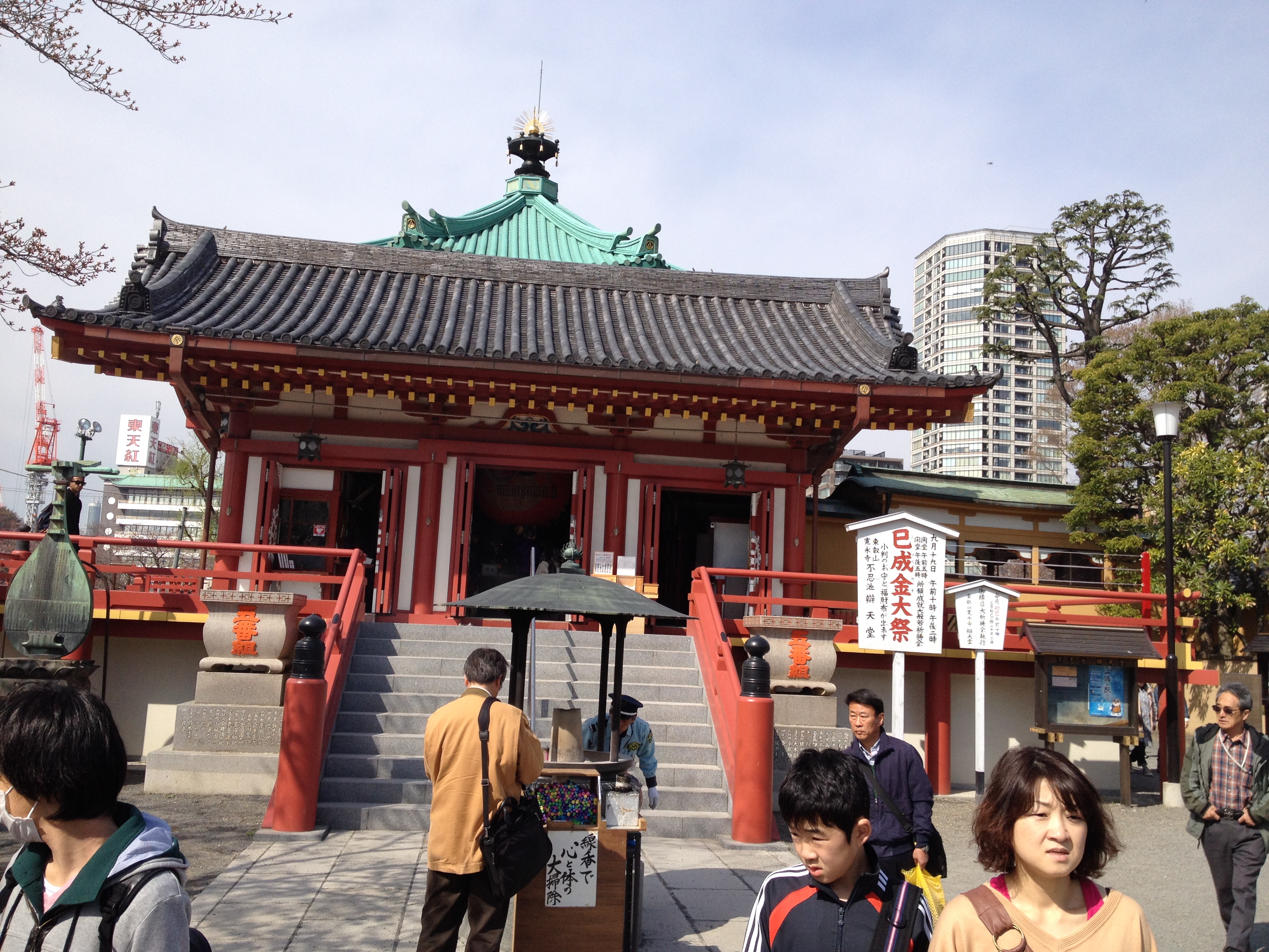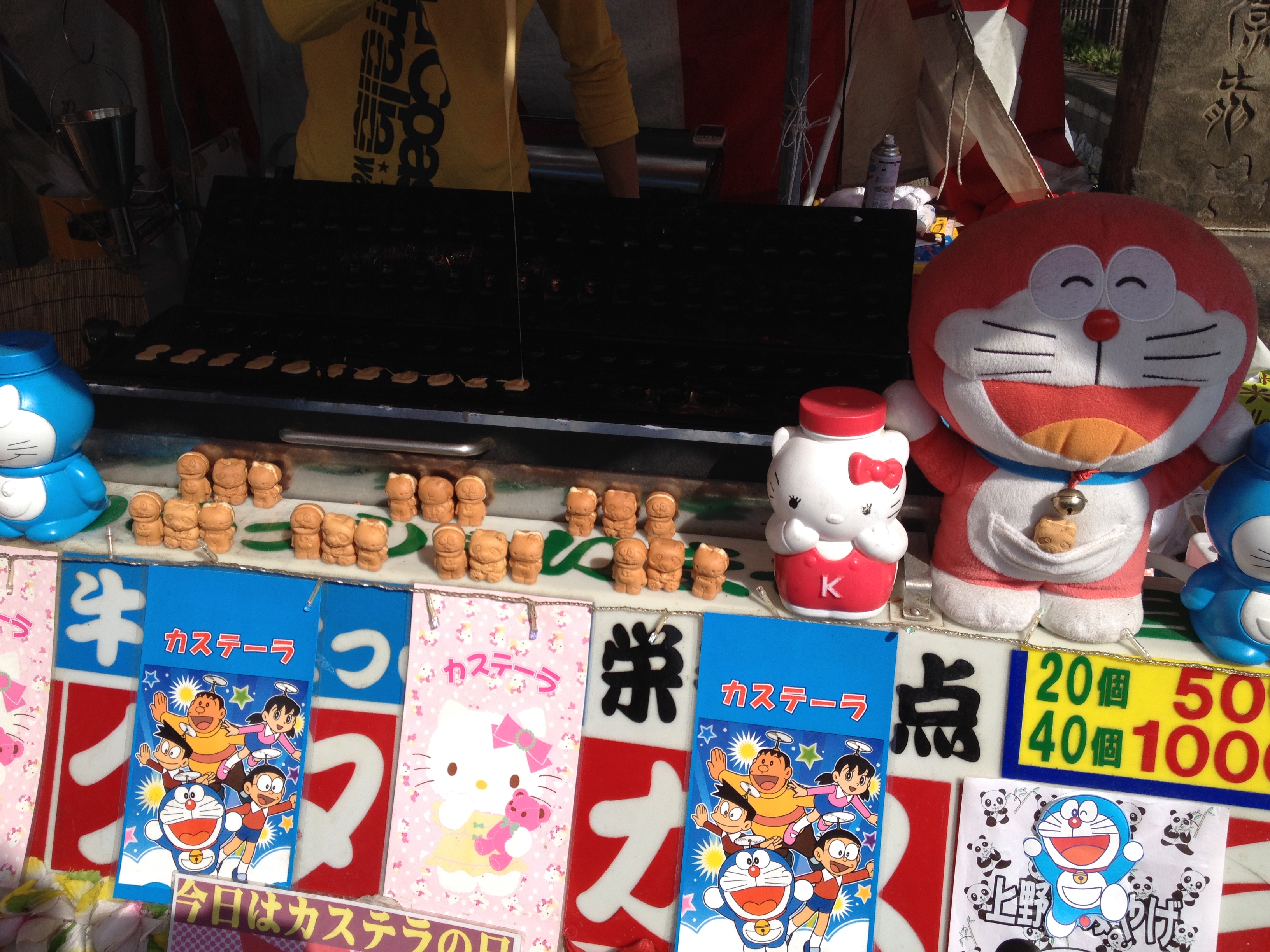 Que font tous ces gens déjà à 9 heures du matin dans le parc Ueno? Ils viennent réserver leur emplacement bien sûr pour festoyer Sakura et aussi prendre des tonnes de photos! Je suis moi-même aux anges de voir enfin ces fleurs de cerisiers tant espérées. Je traverse l’étang vers le temple bouddhiste flottant Bentendo dédié à la déesse des arts, de la connaissance, de la sagesse puis son allée où les échoppes de nourriture sont ravies de voir arriver la foule; des poissons embrochés autour des braises, qui vont soudain sentir bon le barbecue, des biscuits en forme de nounours cuits sur place, d’autres en forme d’épis à la tête chocolatée, des brochettes de viande crue … il y en a pour tous les goûts.