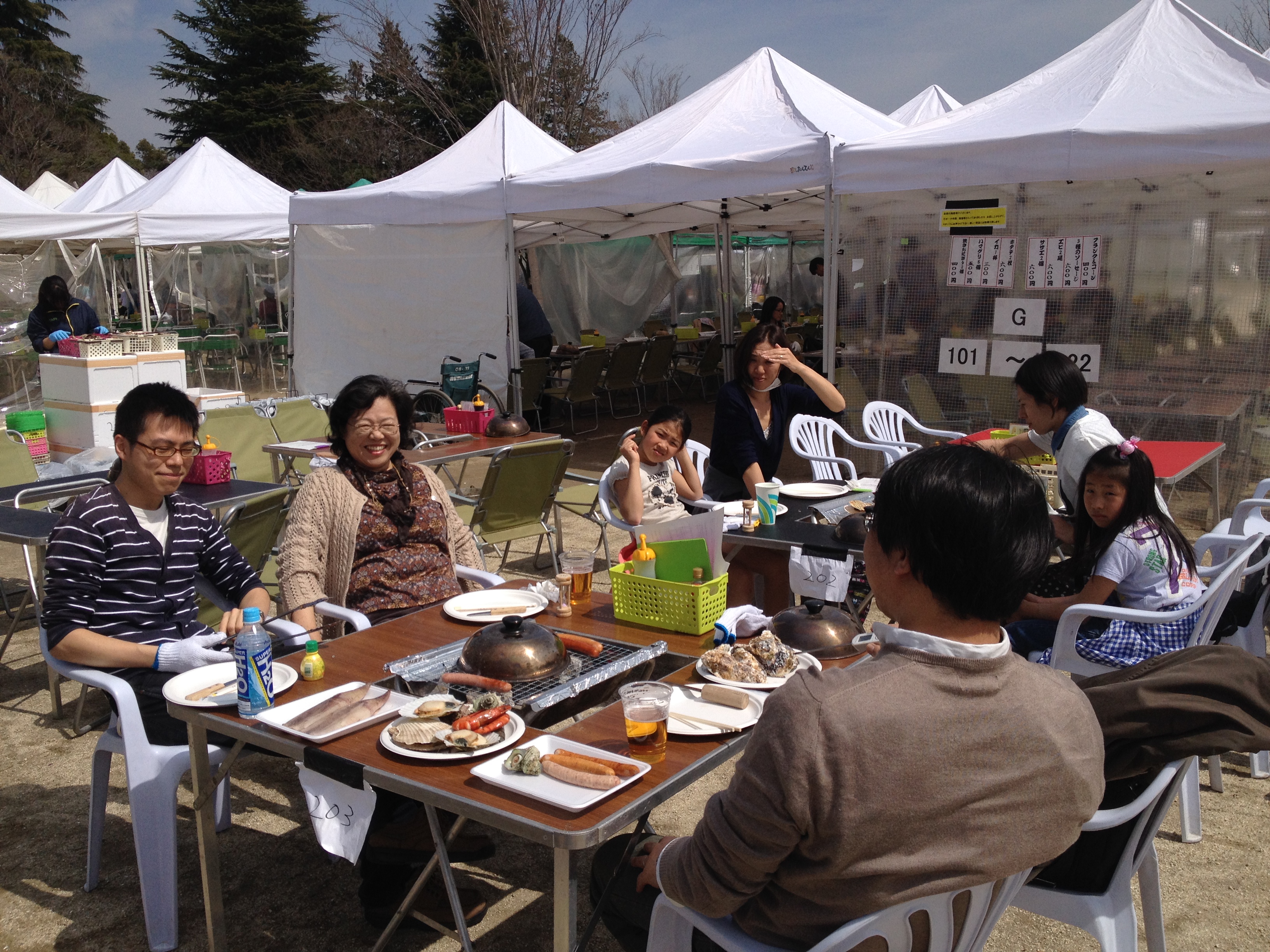 Les pic-nics se passent sur une couverture au sol ou alors dans un espace prévu pour barbecues : de petites tentes pour protéger du soleil, des tables avec un grill à la braise incrusté au milieu … et les crevettes, les huîtres, le poisson, les légumes se dégustent joyeusement, tout chauds, tout croustillants. Je suis certaine qu’aucun déchet ne subsistera après cette journée estivale en plein air. La température est délicieuse, le soleil n’est pas trop agressif, même si mes épaules ce soir seront un peu rougies.