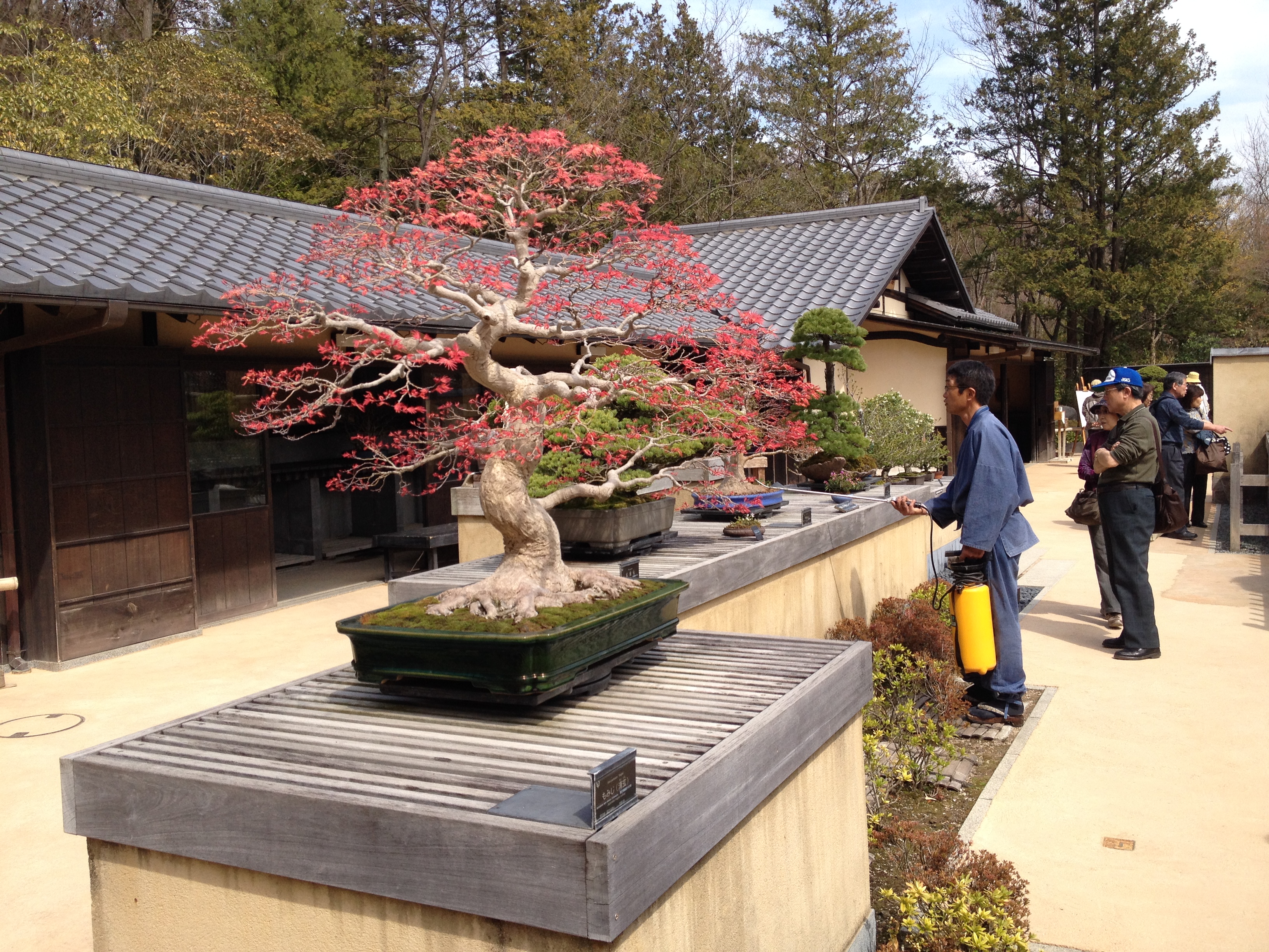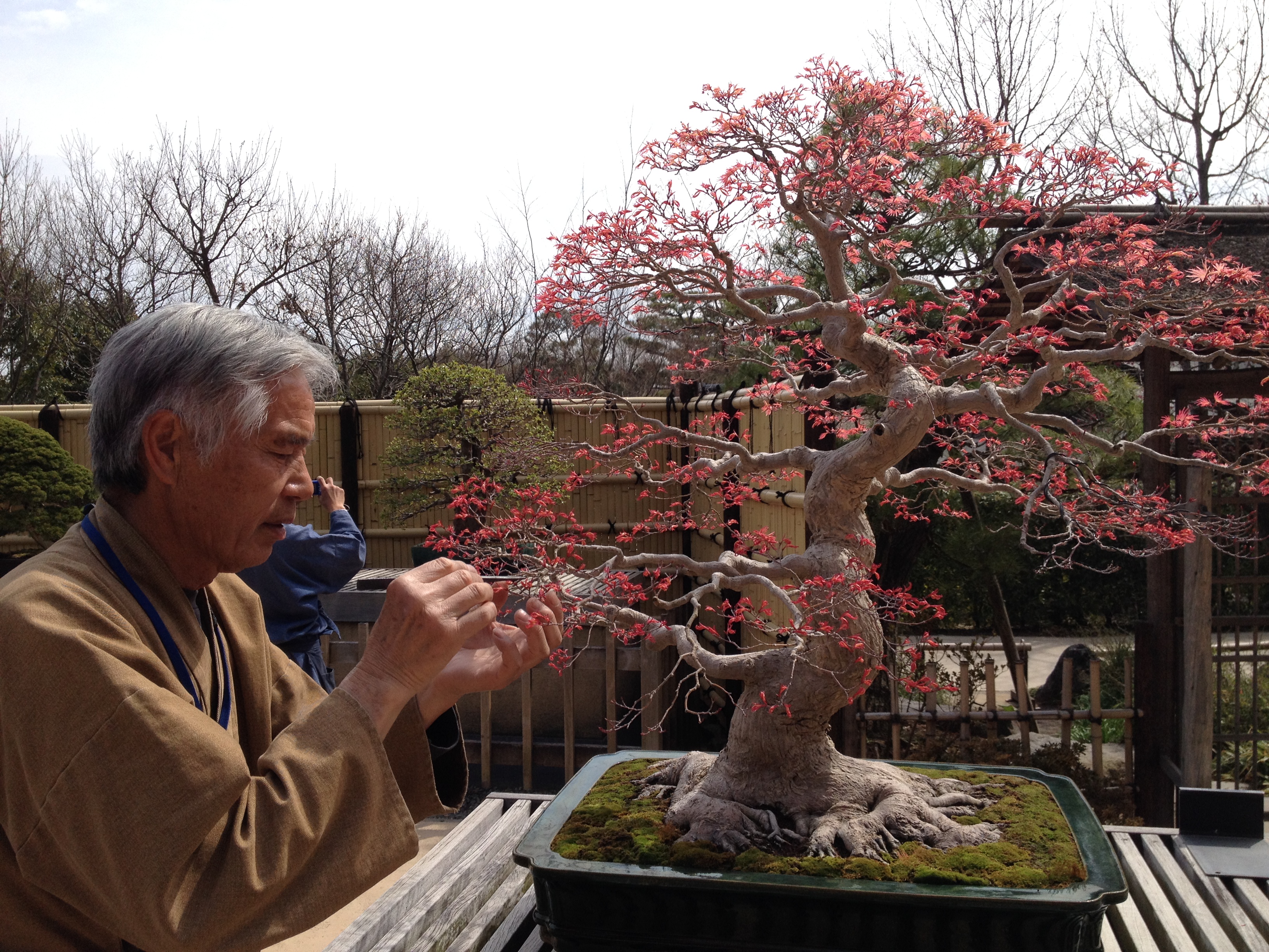 J’aime évidement le coin du jardin japonais, sa quiétude, ses tortues qui se chauffent sur les rochers, sa nature qui se reflète dans l’étang. Nous voyant intéressées par les bonsaïs un des jardiniers nous fait partager sa passion, en nous racontant l’origine de tel ou tel conifère de plus de quatre-cents ans d’âge et qui furent trouvés dans la montagne où ils manquaient d’eau et d’espace pour prospérer. Selon la variété, ils sont rentrés pour l’hiver ou au contraire restent en extérieur, sauf en cas d’orage ou tempête. Avec sa longue pince à épiler et avec une délicatesse d’orfèvre, il extrait les fleurs fanées d’un superbe érable du Japon. C’est magnifique!