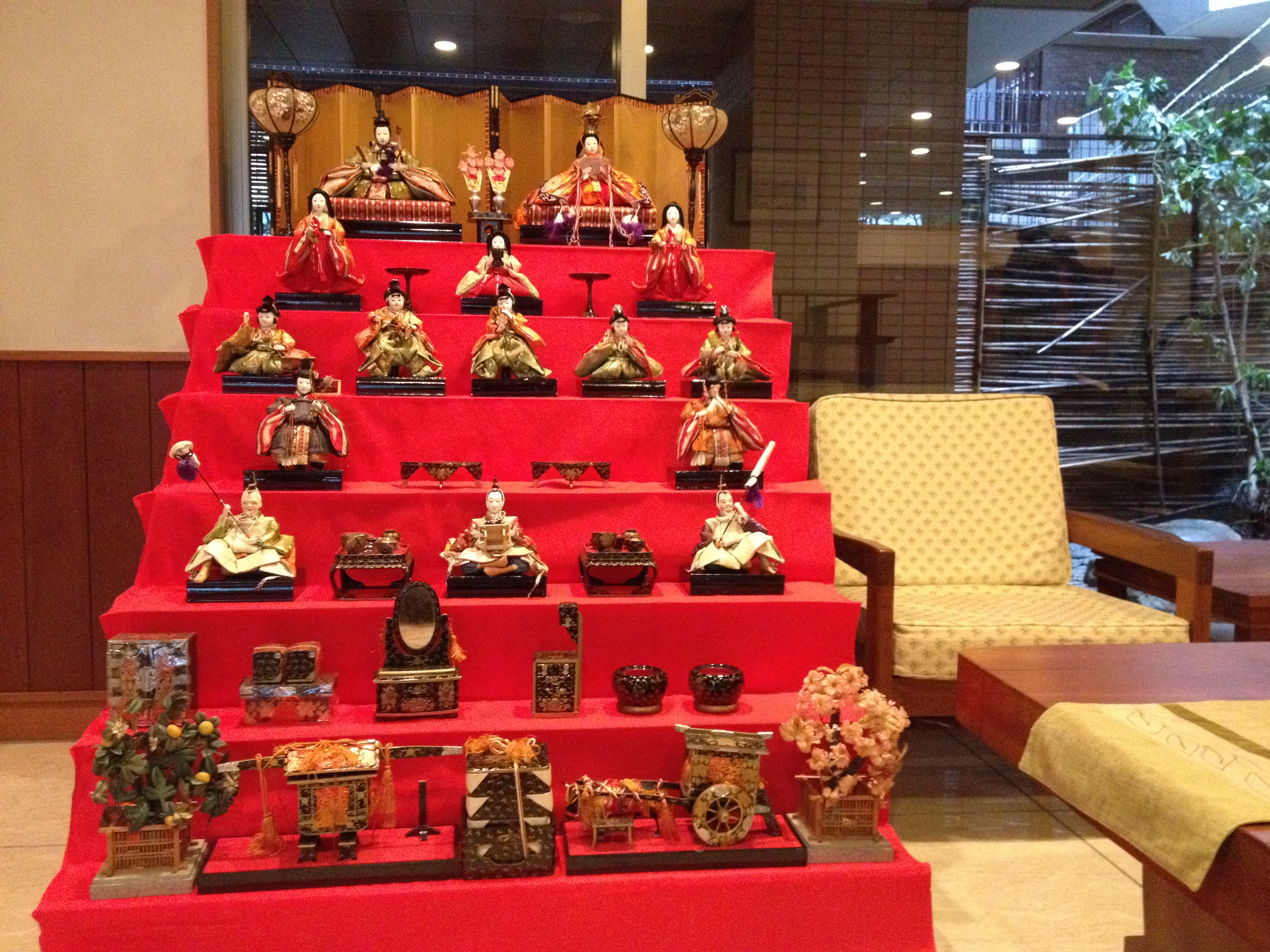 À l’entrée de la résidence, nous avons vite reconnu le présentoir en forme d’escaliers sur lesquels sont exposées des poupées représentant l’empereur, l’impératrice, leurs serviteurs, dans des costumes traditionnels d’époque – comme nous en avions vu lors d’une visite avec Shin et Tobby l’an dernier. C’est en effet ce week-end le Festival des poupées ou fête des filles; celles-ci sont à l’honneur dans leur famille, avec des vœux de prospérité et de bonheur. La tradition remonte à très longtemps; les ancêtres transféraient leurs péchés dans certaines poupées qu’ils jetaient ensuite à la rivière.