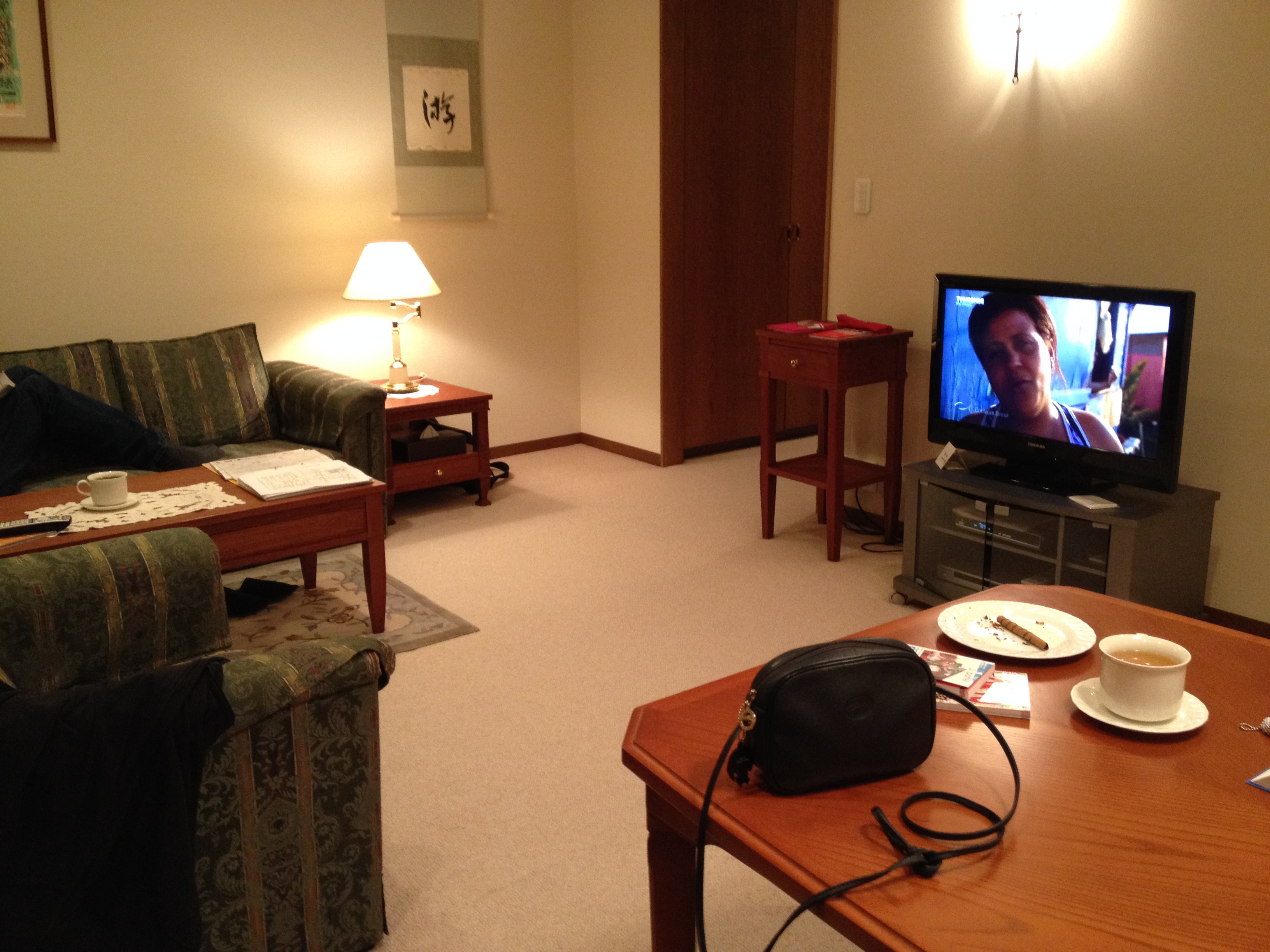 Kato, la gérante de l’immeuble, nous accueille avec une gentillesse très joyeuse; elle nous explique avec beaucoup d’humour le fonctionnement de plusieurs appareils et du code de vie de la résidence – il nous est demandé entre autres, de nous déchausser de suite en entrant dans l’appartement (une grande armoire à chaussures se trouve avant même le vestiaire). La literie, les voilages, les tentures sont raffinés, les meubles sont de bonne qualité et comme neufs, lit et oreillers confortables. Kato se retire alors à reculons, en s’inclinant pour nous saluer – ici il n’est pas coutume de se toucher pour se dire bonjour ou au revoir, ni accolade, ni poignée de mains.