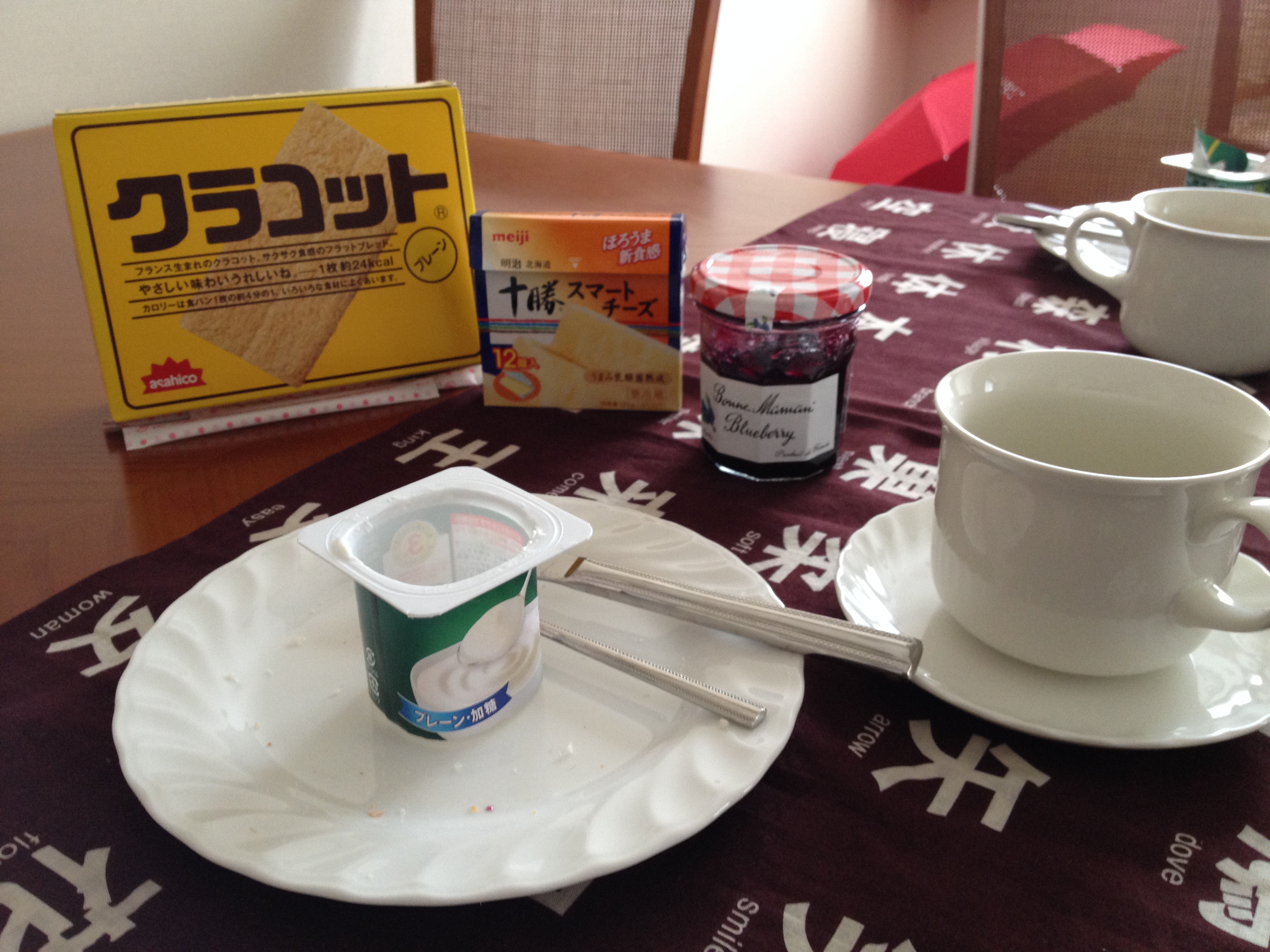 Dur dur ce décalage horaire, bien plus difficile le deuxième jour et ce ciel gris pluvieux ne donne pas envie de se lever. Les cracottes, la confiture BonneMaman, les yaourts Danone nous conviennent très bien pour notre premier petit-déjeuner à la maison; ça ne fait pas très japonais mais je préfère ainsi, pour l’instant du moins.