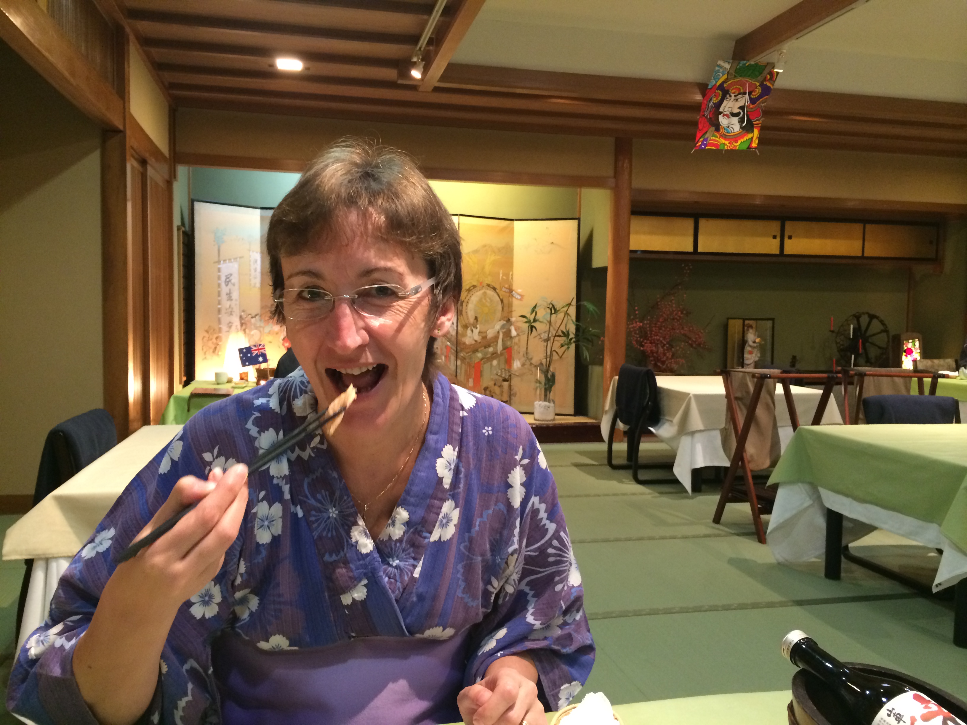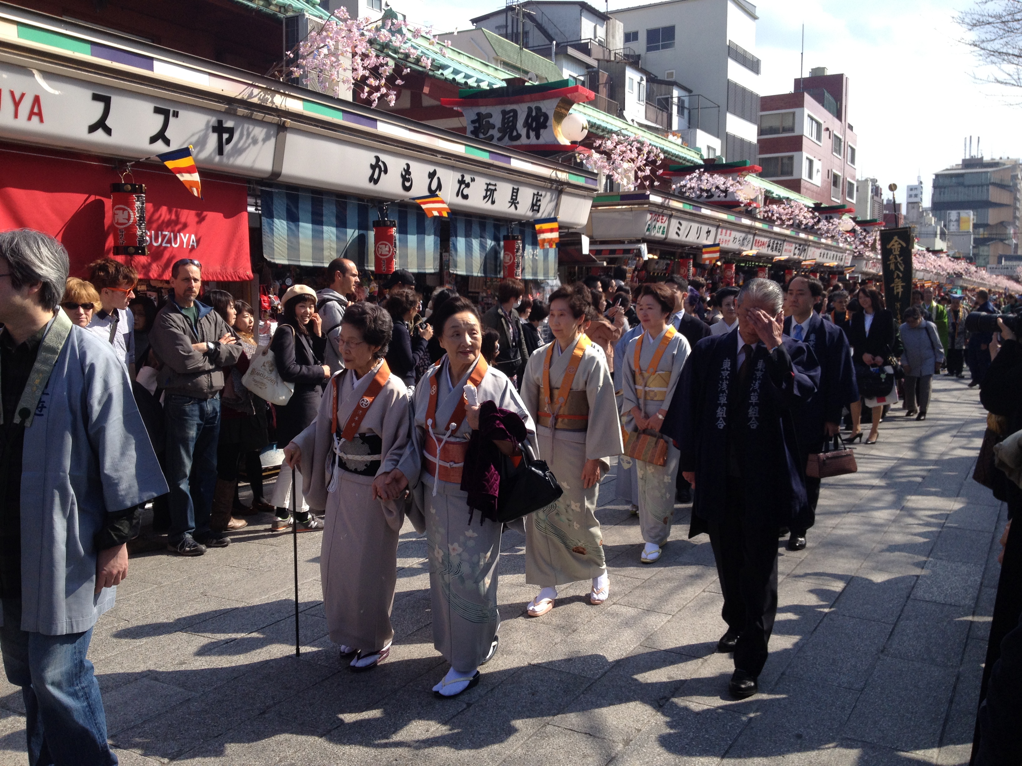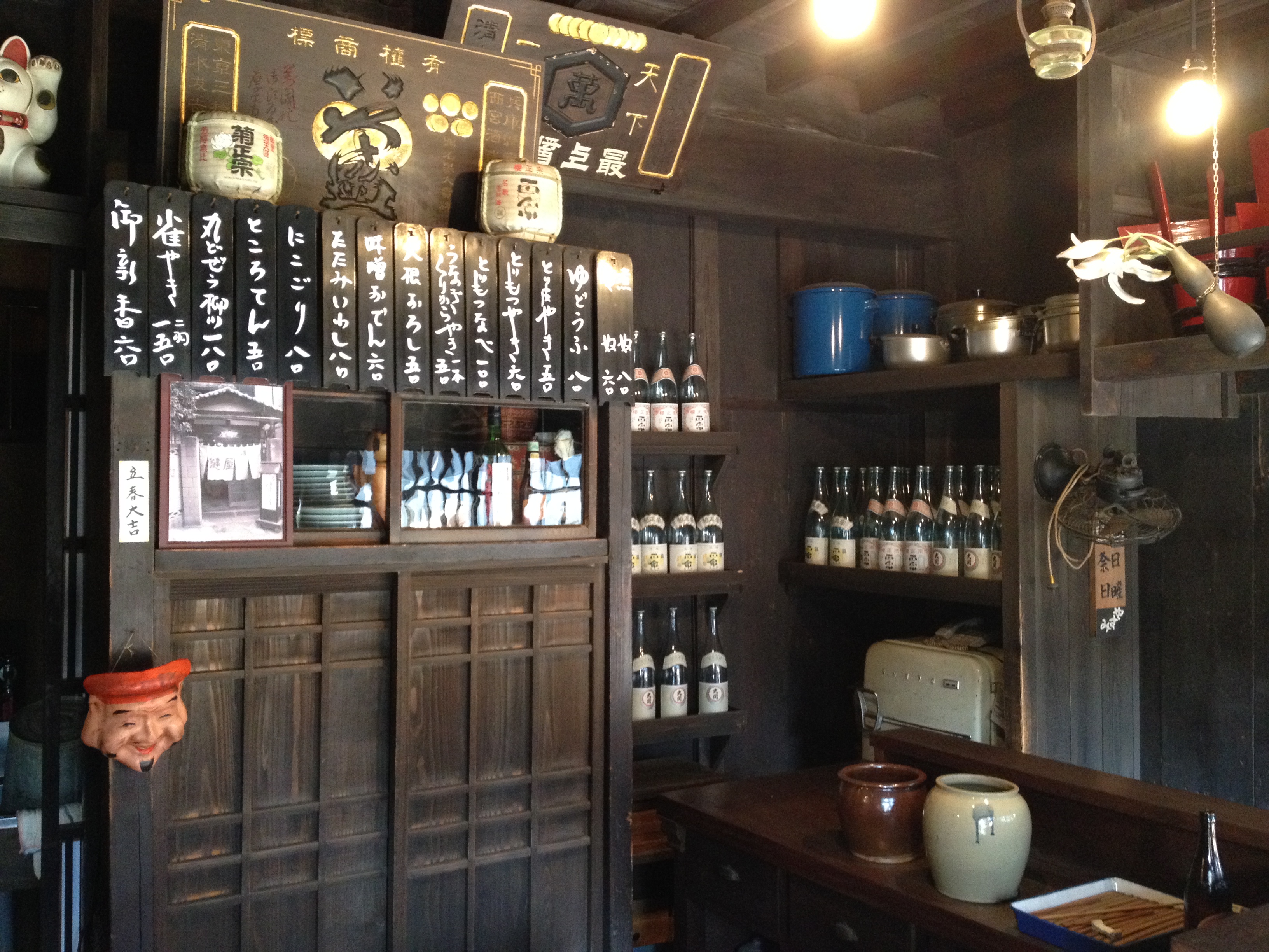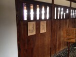 Plusieurs maisons hébergent des distilleries de saké; elles sont repérables par une grosse boule de feuilles de cyprès qui se balance au-dessus de l’entrée. On y déguste diverses variétés de cet alcool de riz et nous nous laissons tenter par une bouteille qui a reçu un prix d’or en 2013 et dont la tradition remonte à 1961. C’est vraiment l’escapade où nous devenons de plus en plus comme des « locaux« ! Et nous continuons à sillonner ce quartier typique qui est bien fréquenté et où s’entrechoquent les parapluies.
