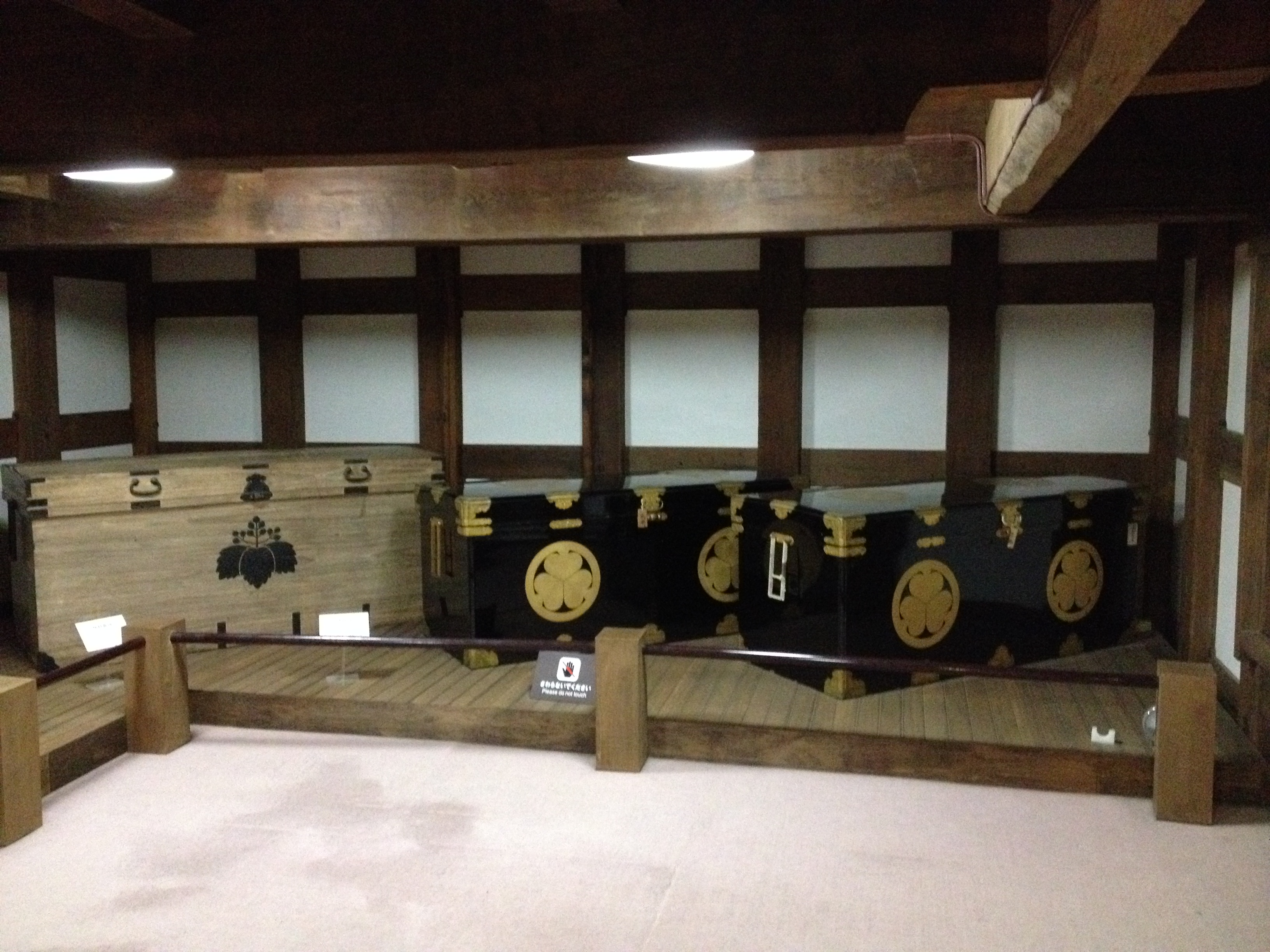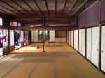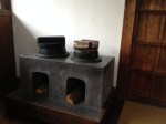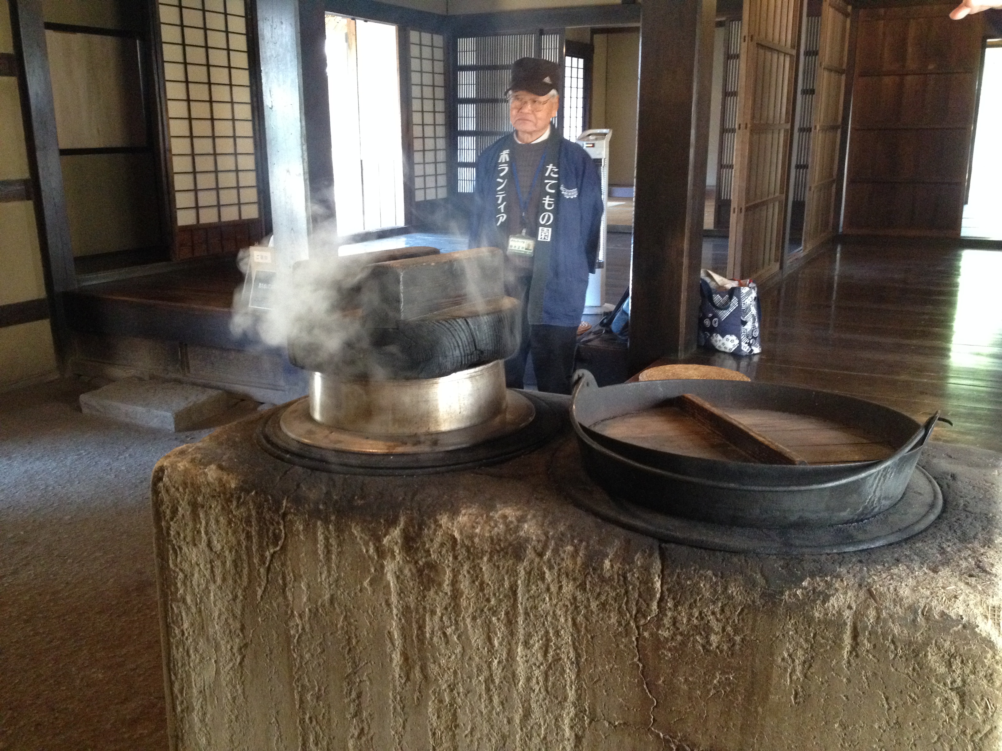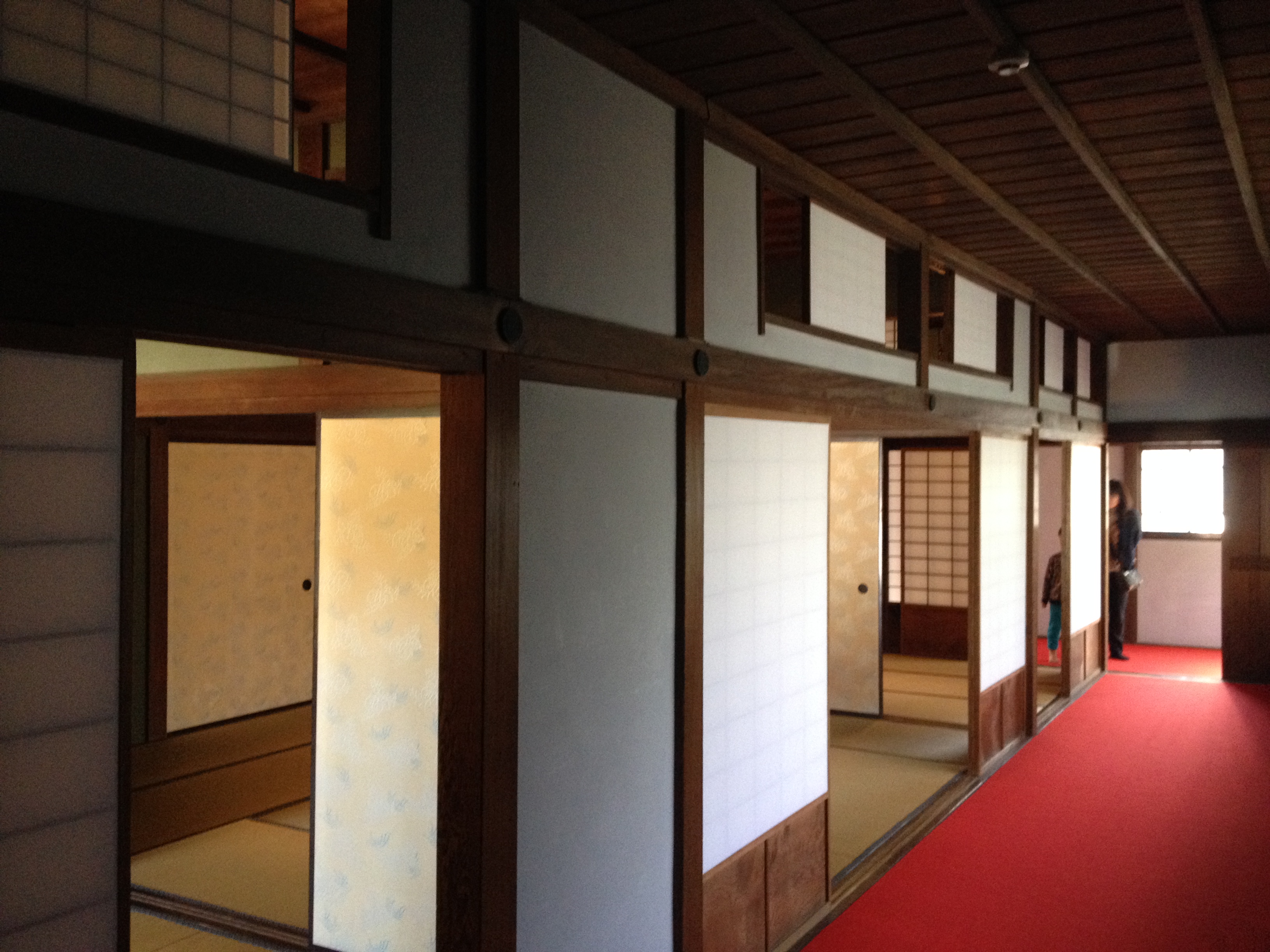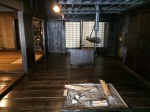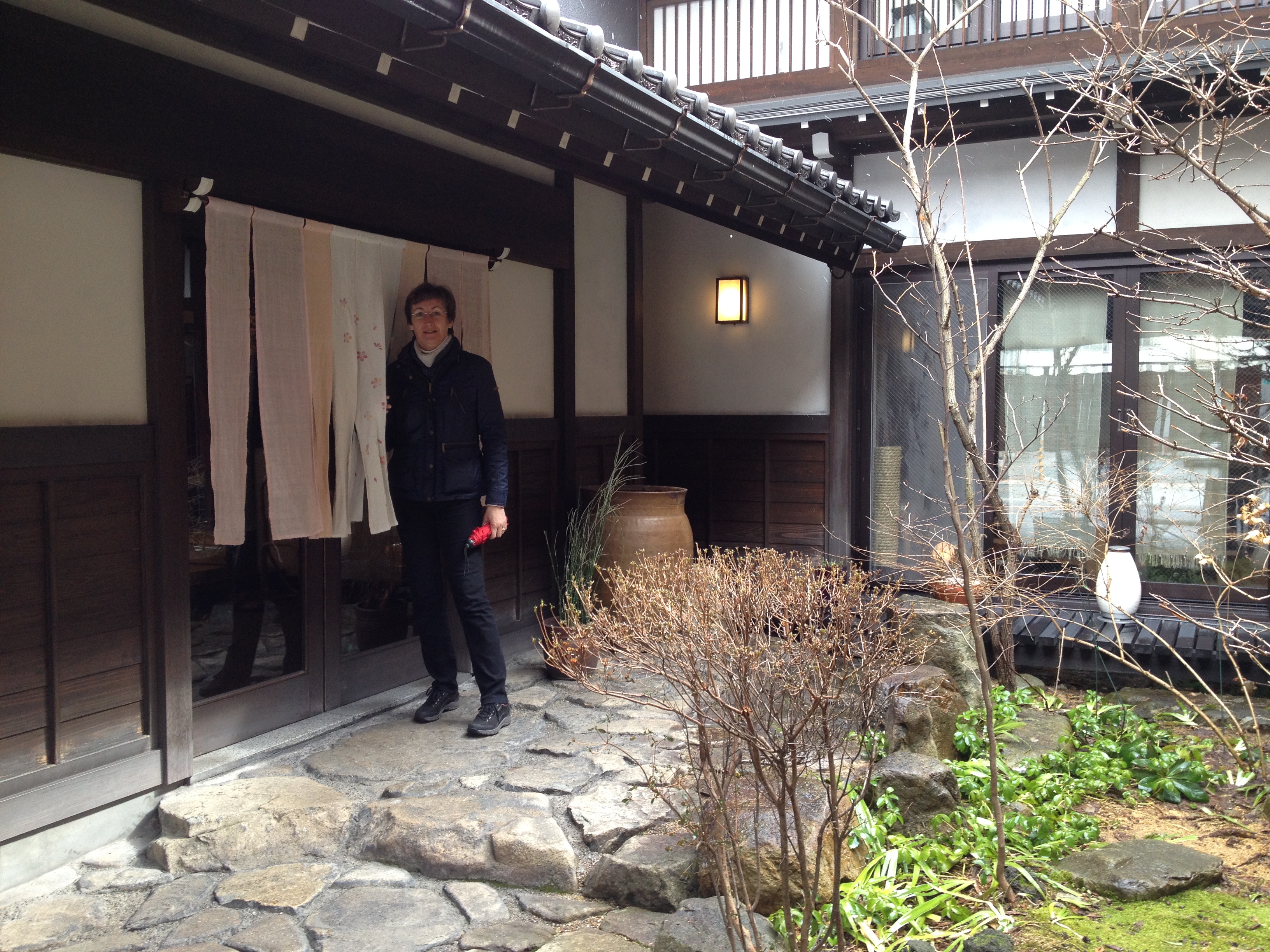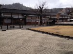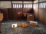 Nous nous trouvons à l’entrée de Takayama-jinya, l’ancien château où vivait le clan Kanamori et ensuite le gouvernement des shoguns jusqu’au 19ième siècle. La première construction date de 1615 mais ce que nous visitons de nos jours en est la version reconstruite deux cents ans plus tard. On y visite de nombreuses salles de réception, les cuisines, des bureaux, des salles de repos ou pour le thé; on mesurait la taille des pièces en nombre de tatamis au sol. Elles sont toujours modulables, tout est parfaitement à l’équerre, les parois coulissent par simple glissement bois sur bois. Le jardin et la cour intérieure doivent être de toute beauté à la saison des feuilles et des fleurs. Les greniers à riz se visitent, sans photo autorisée; c’est là qu’était stocké ce que l’état percevait comme taxe auprès des paysans. Une salle de torture est reconstituée et illustrée – les sévices n’étaient pas légers!
