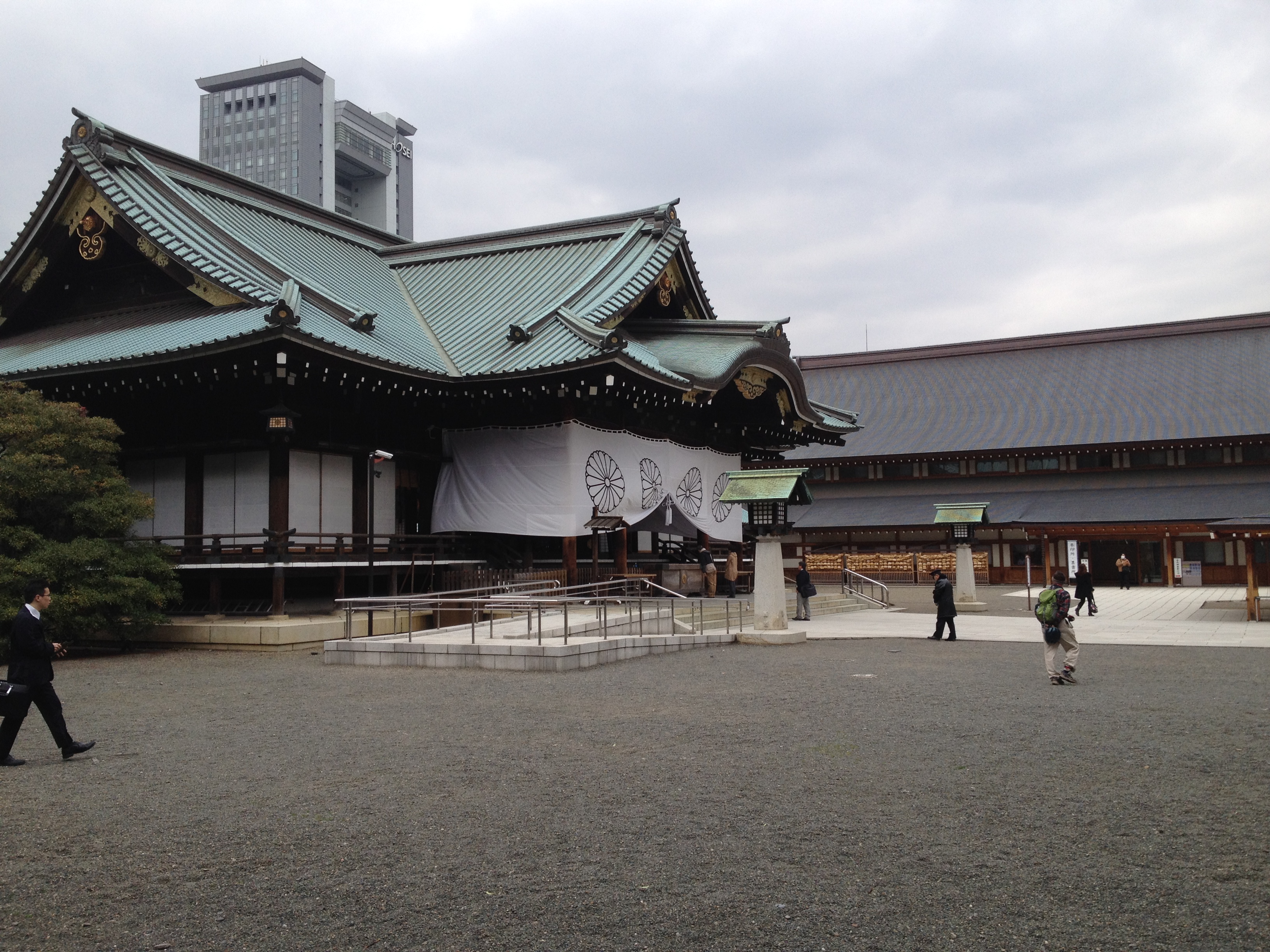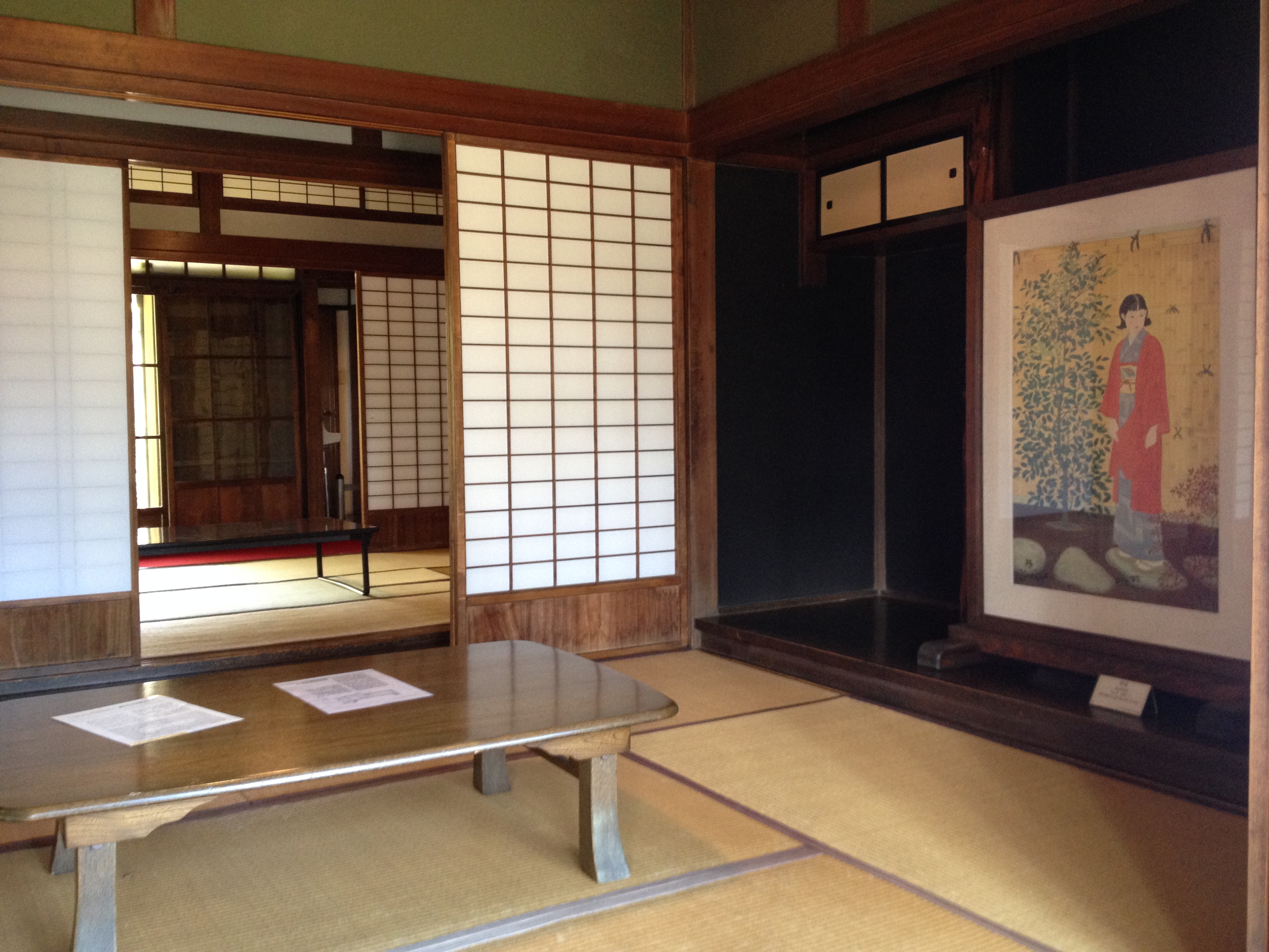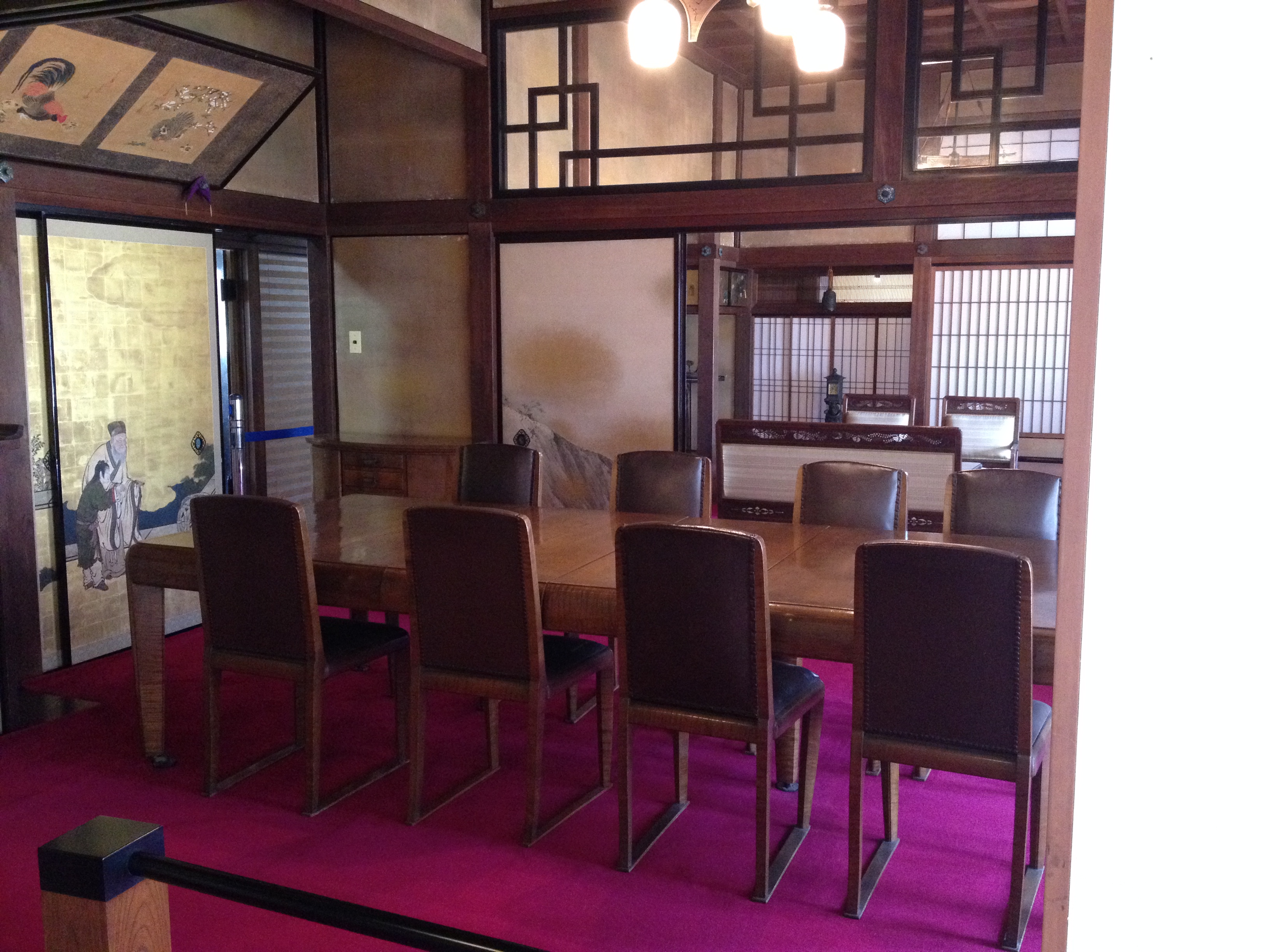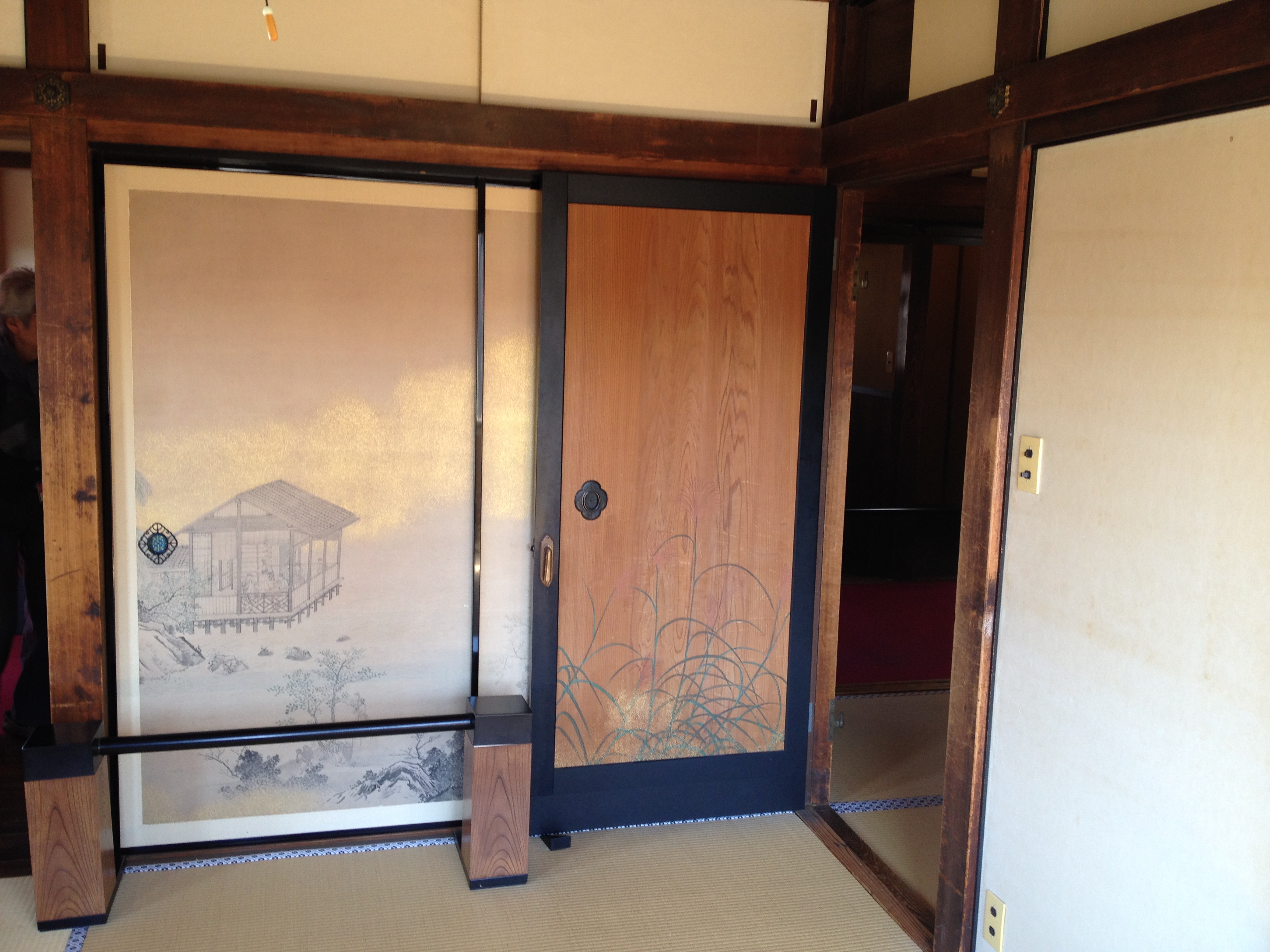 Nous nous trouvons à l’entrée de Takayama-jinya, l’ancien château où vivait le clan Kanamori et ensuite le gouvernement des shoguns jusqu’au 19ième siècle. La première construction date de 1615 mais ce que nous visitons de nos jours en est la version reconstruite deux cents ans plus tard. On y visite de nombreuses salles de réception, les cuisines, des bureaux, des salles de repos ou pour le thé; on mesurait la taille des pièces en nombre de tatamis au sol. Elles sont toujours modulables, tout est parfaitement à l’équerre, les parois coulissent par simple glissement bois sur bois. Le jardin et la cour intérieure doivent être de toute beauté à la saison des feuilles et des fleurs. Les greniers à riz se visitent, sans photo autorisée; c’est là qu’était stocké ce que l’état percevait comme taxe auprès des paysans. Une salle de torture est reconstituée et illustrée – les sévices n’étaient pas légers!