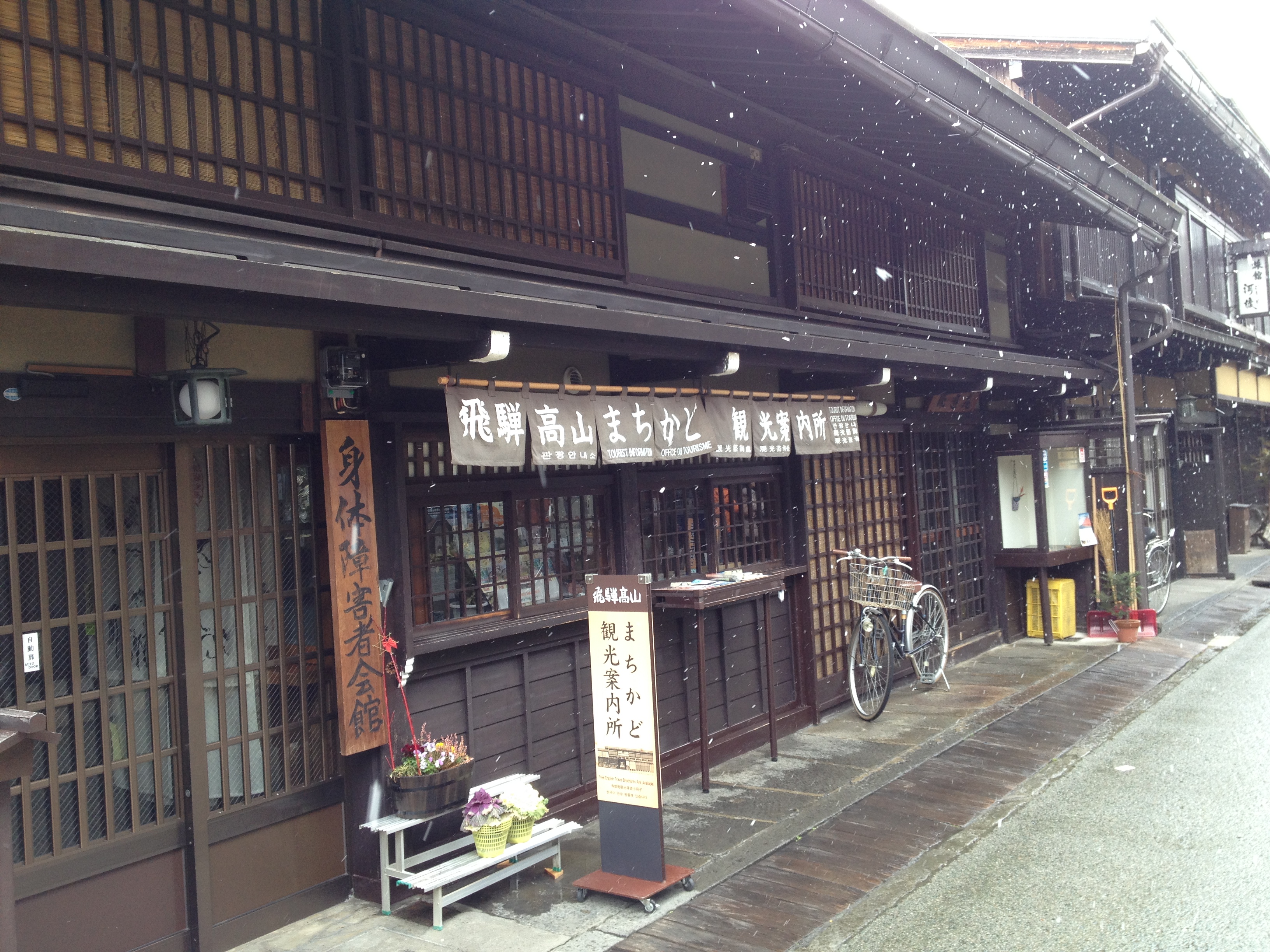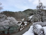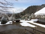 Après un lunch yakiniku de bœuf Hida dont on se régale, notre motivation pour poursuivre par ce froid la visite de la ville est redescendue. Nous passons chercher notre bagage à l’hôtel avant de rejoindre la gare pour y réserver nos places sur les deux trains. Oups, l’employé au bureau JR comprend très bien notre demande mais nous avertit que tous les trains sont complets jusque 17h30. Il s’agit en effet de deux journées de congé pour le Japon; on célèbre le printemps … même s’il neige et les voyageurs sont nombreux partout. La valise prend donc place dans un casier de la gare et nous dans un bus qui nous amène à Hida no sato dans la montagne.