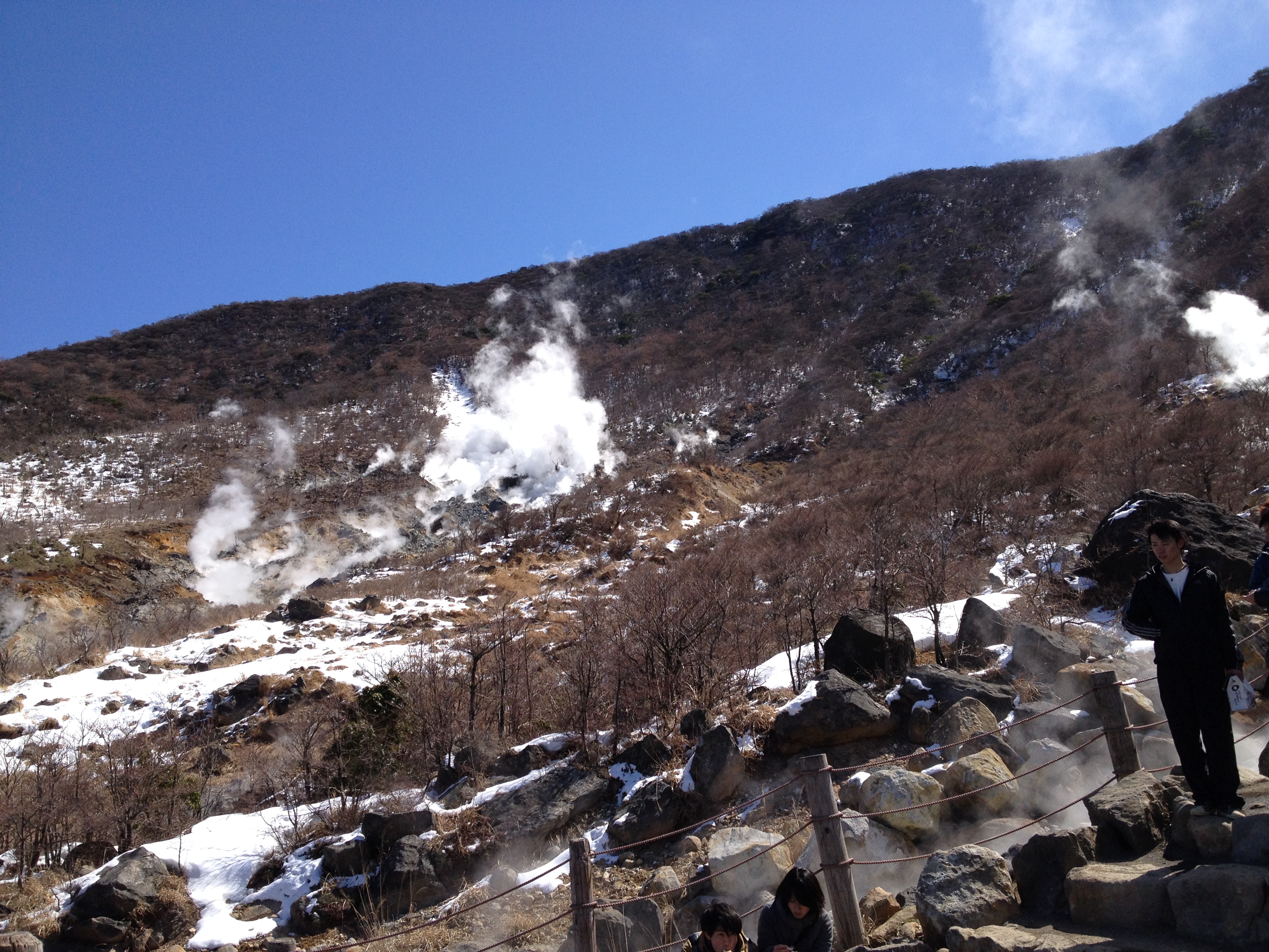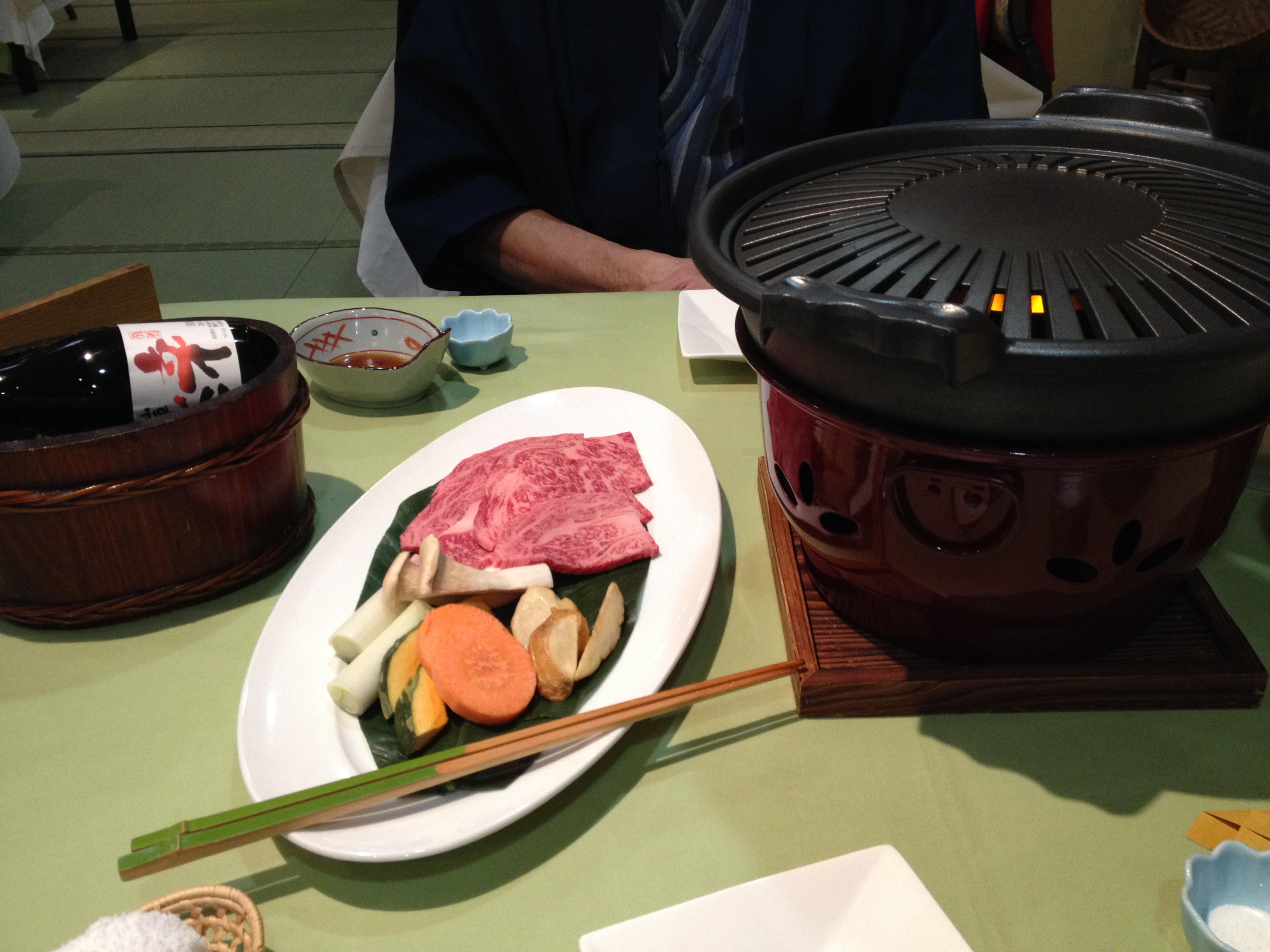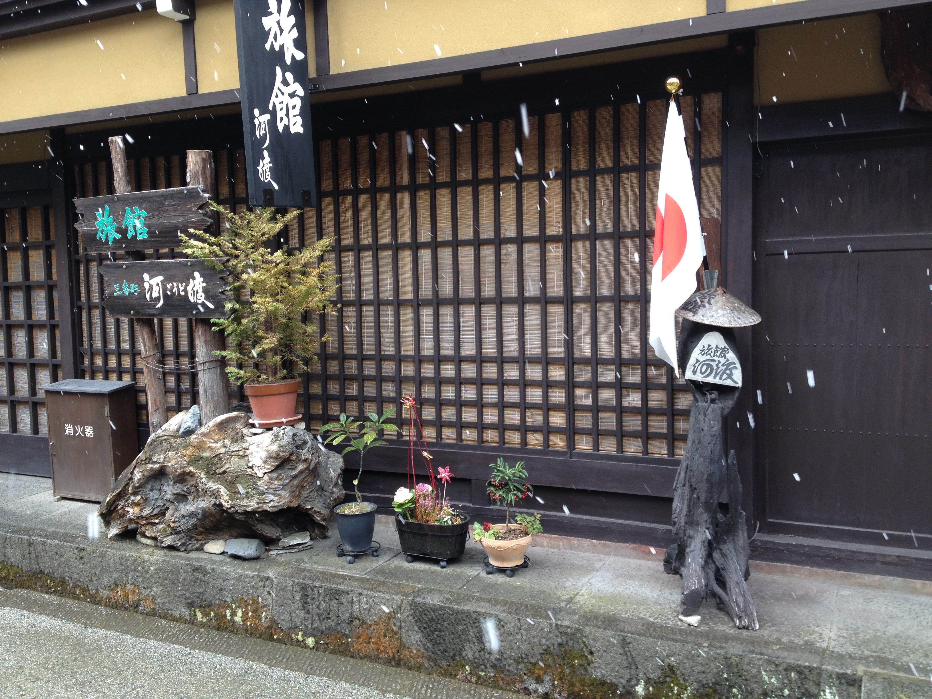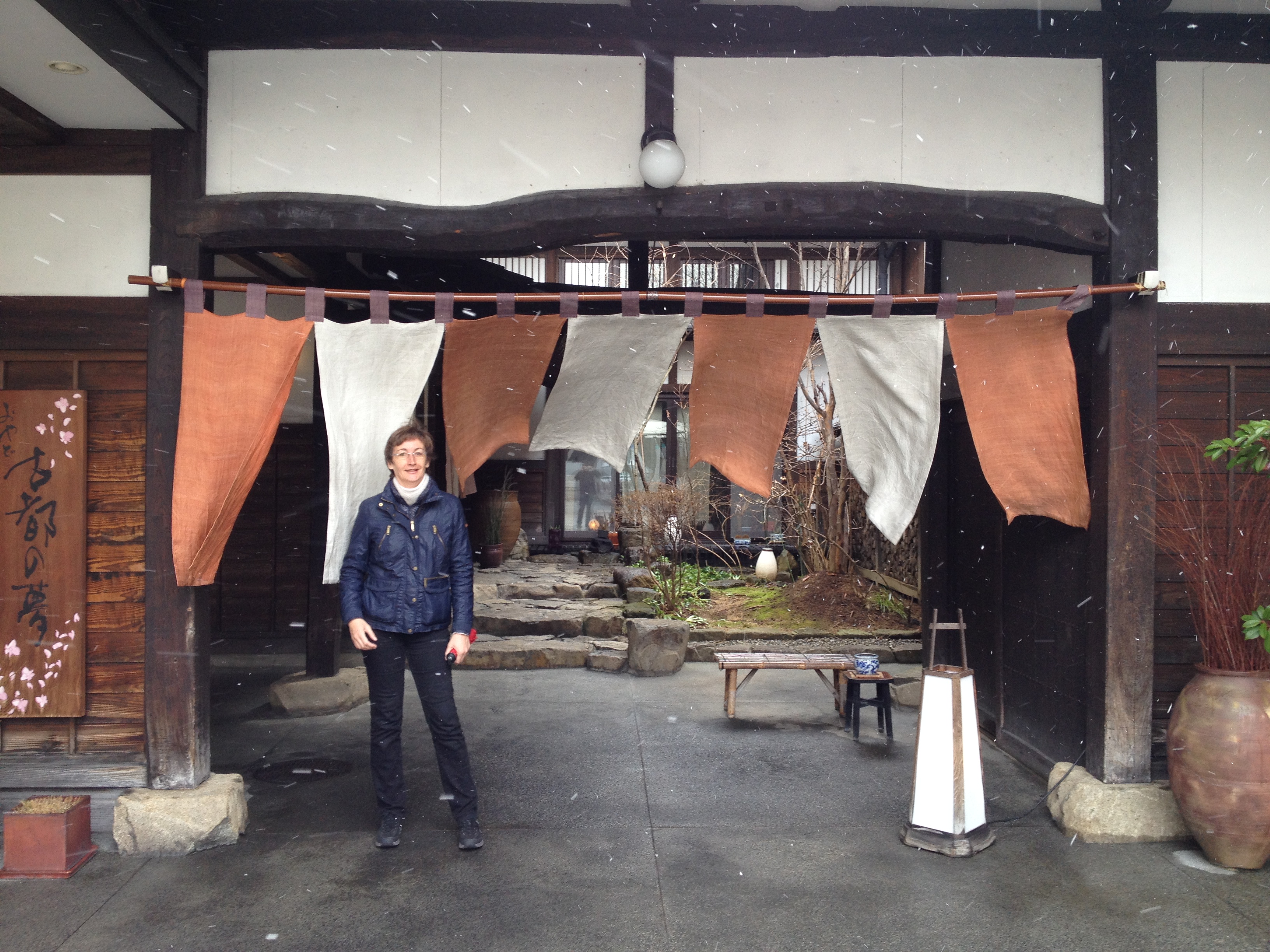 L’heure la plus tardive pour le petit-déjeuner était 8h et nous retrouvons la même table qu’hier soir. Nous ne sommes par contre pas encore assez japonais pour manger soupe-riz-poisson au saut du lit et c’est donc un menu européen qui garnit notre table, avec un foyer à la bougie pour fricasser soi-même œufs-lard-saucisses. Nous échangeons quelques mots avec un couple de français vivant à Tahiti et qui sont étonnés du froid. En effet il neige ce matin et eux ne sont pas du tout équipés pour se balader par ce temps, ce qui ne sera pas notre cas évidemment – notre veste en plume Uniqlo en deuxième couche fera l’affaire et nous sommes contents de retrouver nos chaussures à la sortie du ryokan!