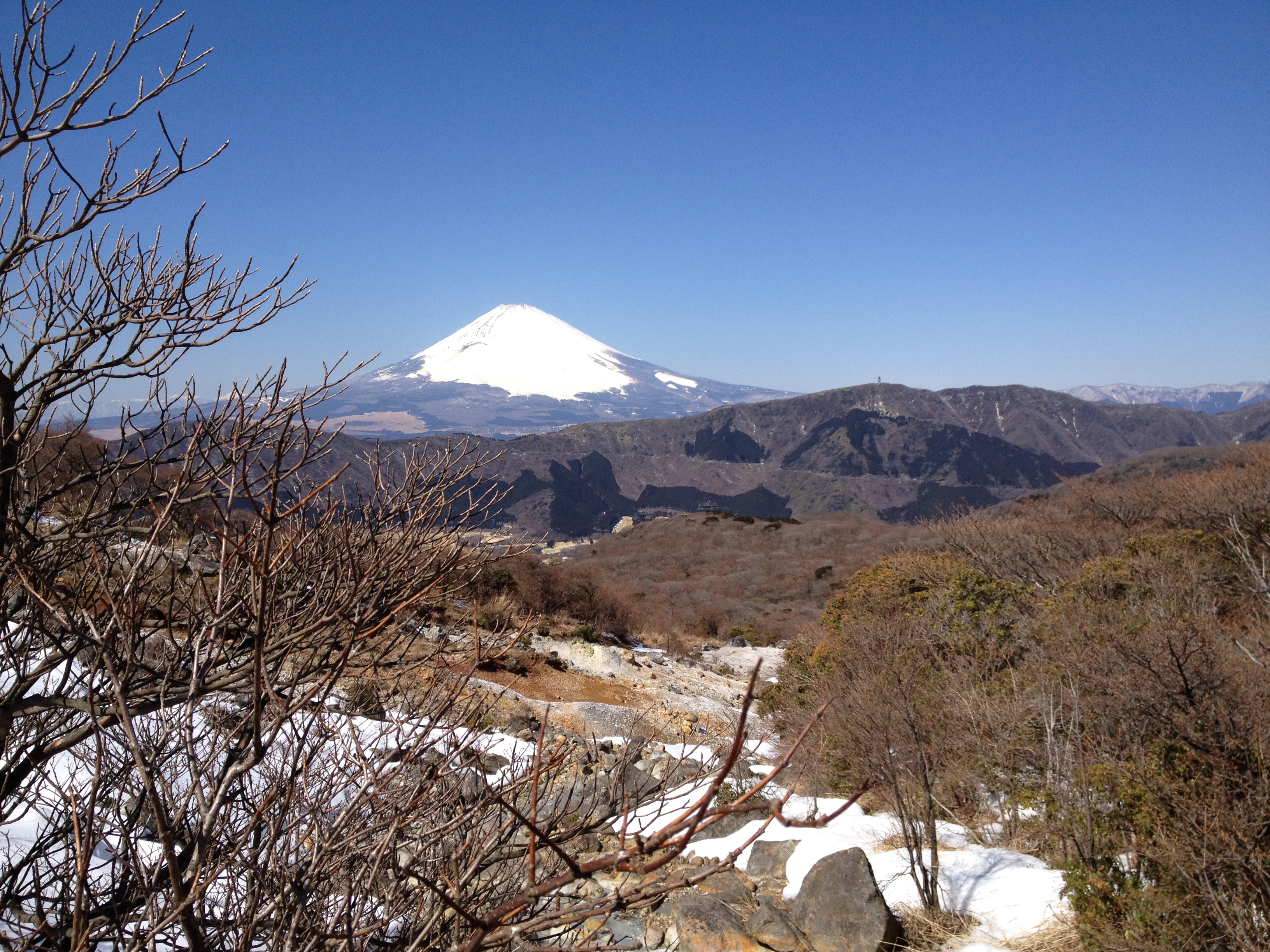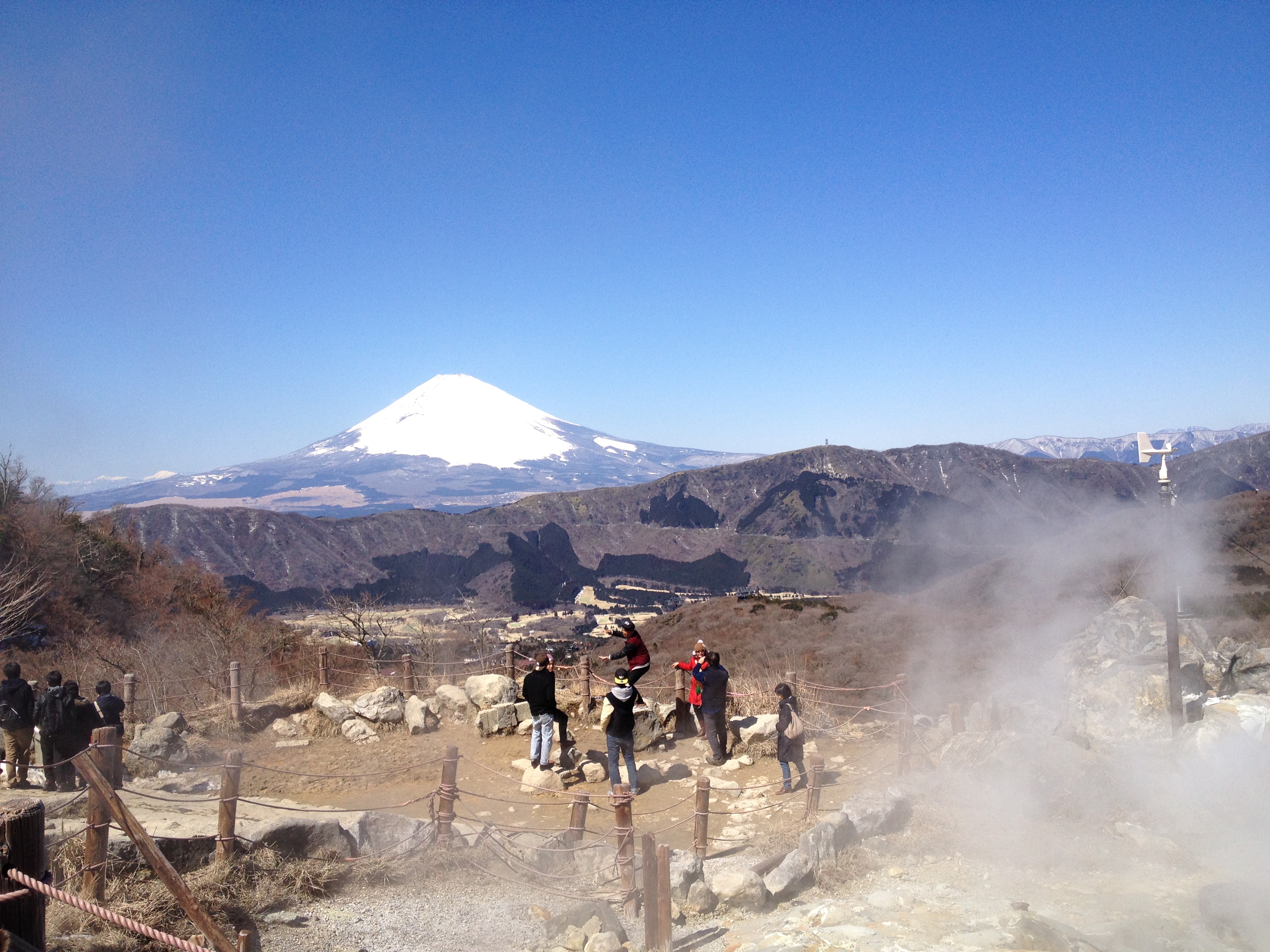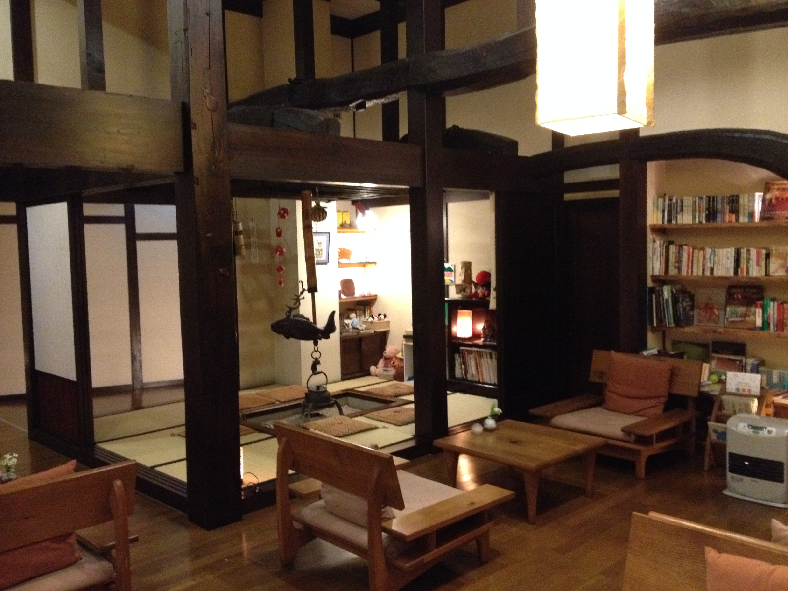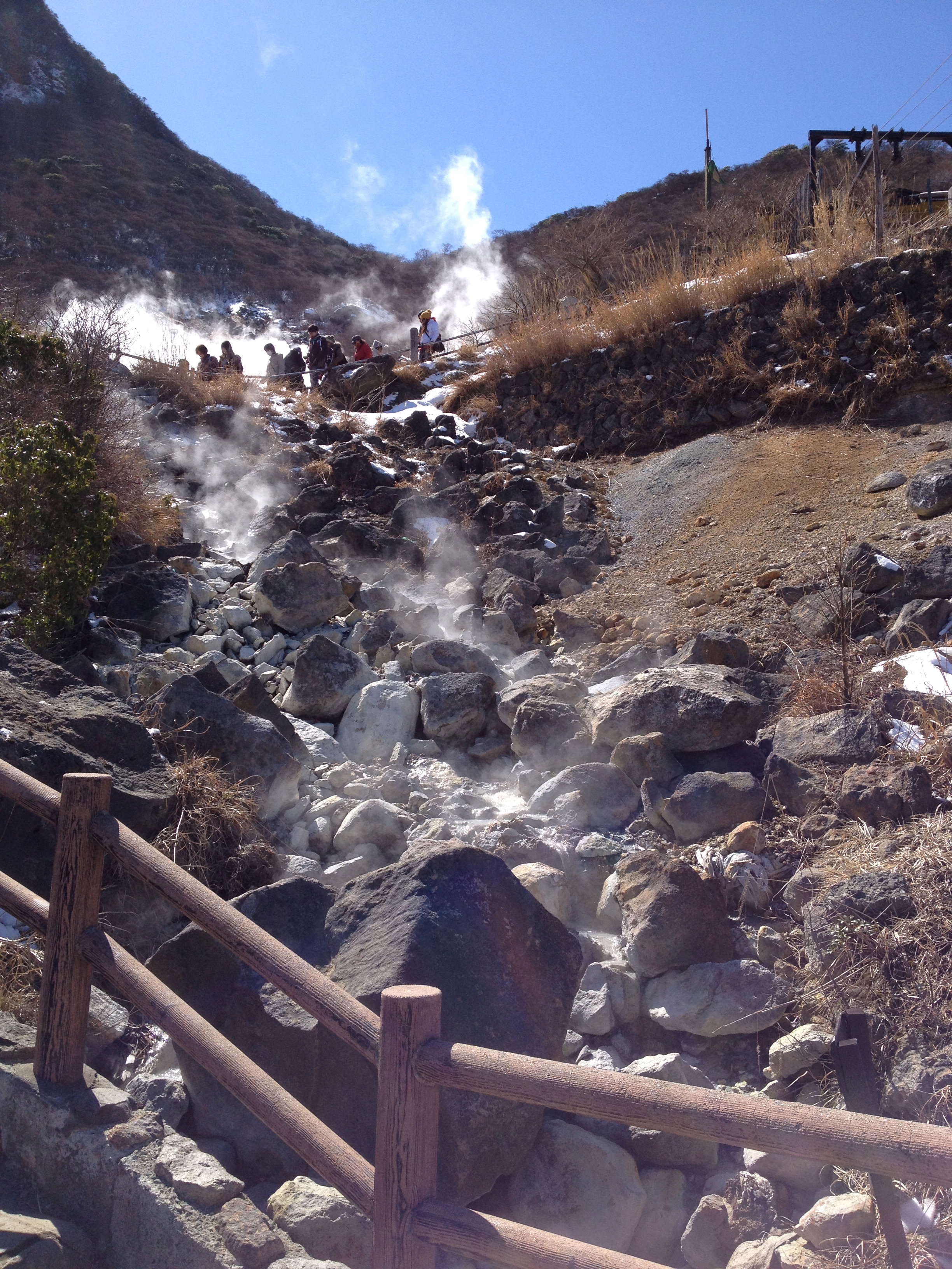 L’heure la plus tardive pour le petit-déjeuner était 8h et nous retrouvons la même table qu’hier soir. Nous ne sommes par contre pas encore assez japonais pour manger soupe-riz-poisson au saut du lit et c’est donc un menu européen qui garnit notre table, avec un foyer à la bougie pour fricasser soi-même œufs-lard-saucisses. Nous échangeons quelques mots avec un couple de français vivant à Tahiti et qui sont étonnés du froid. En effet il neige ce matin et eux ne sont pas du tout équipés pour se balader par ce temps, ce qui ne sera pas notre cas évidemment – notre veste en plume Uniqlo en deuxième couche fera l’affaire et nous sommes contents de retrouver nos chaussures à la sortie du ryokan!