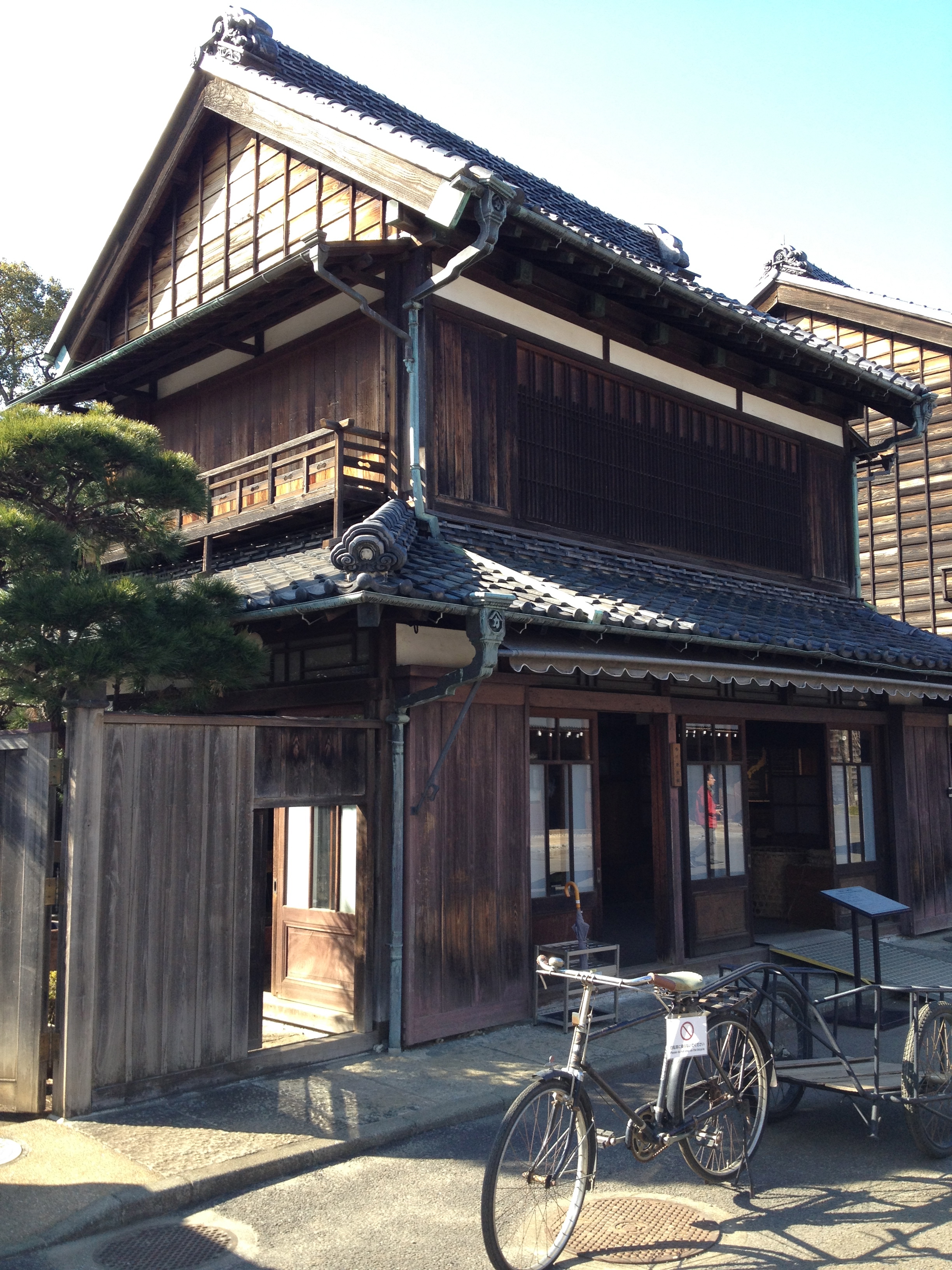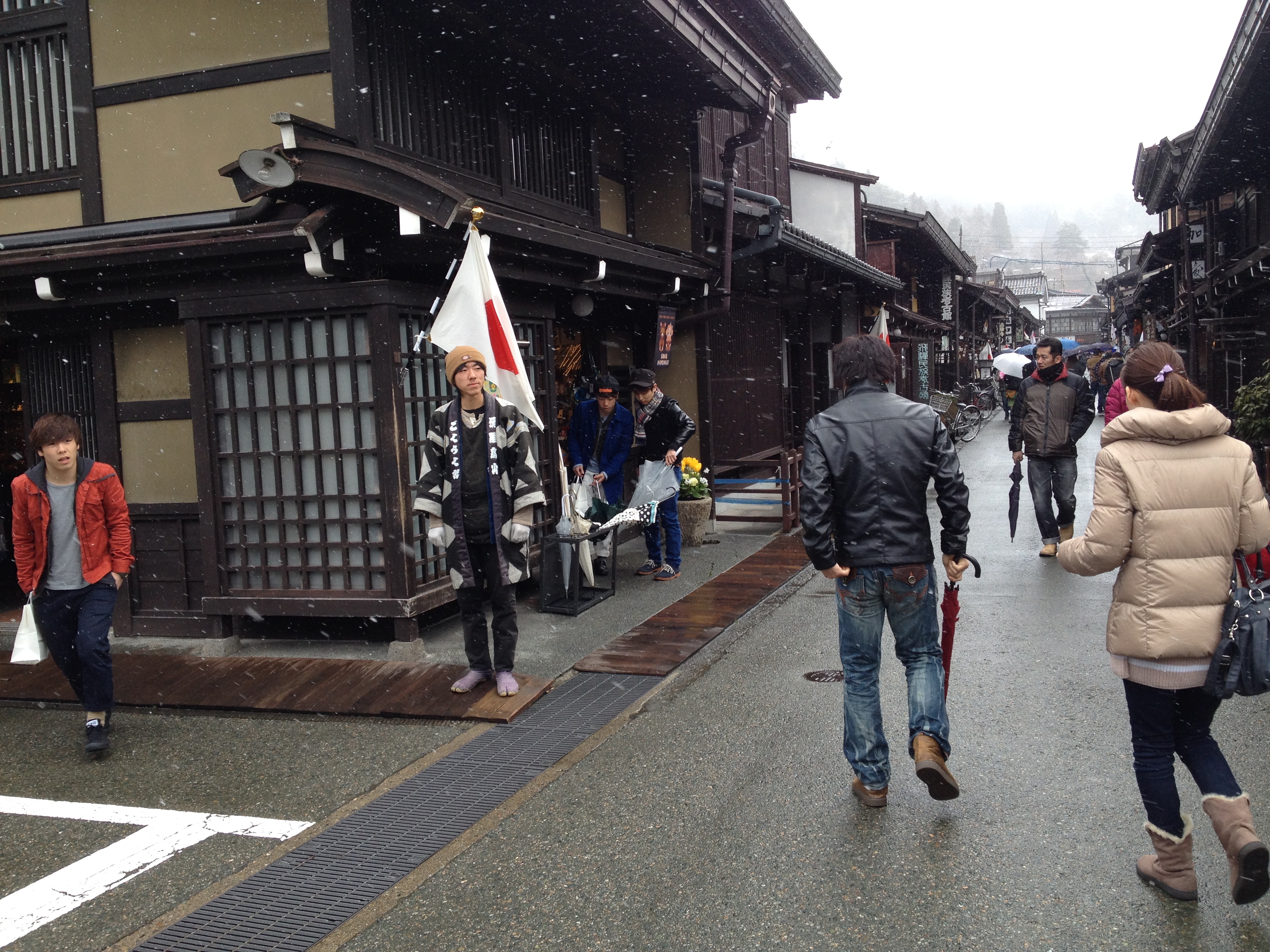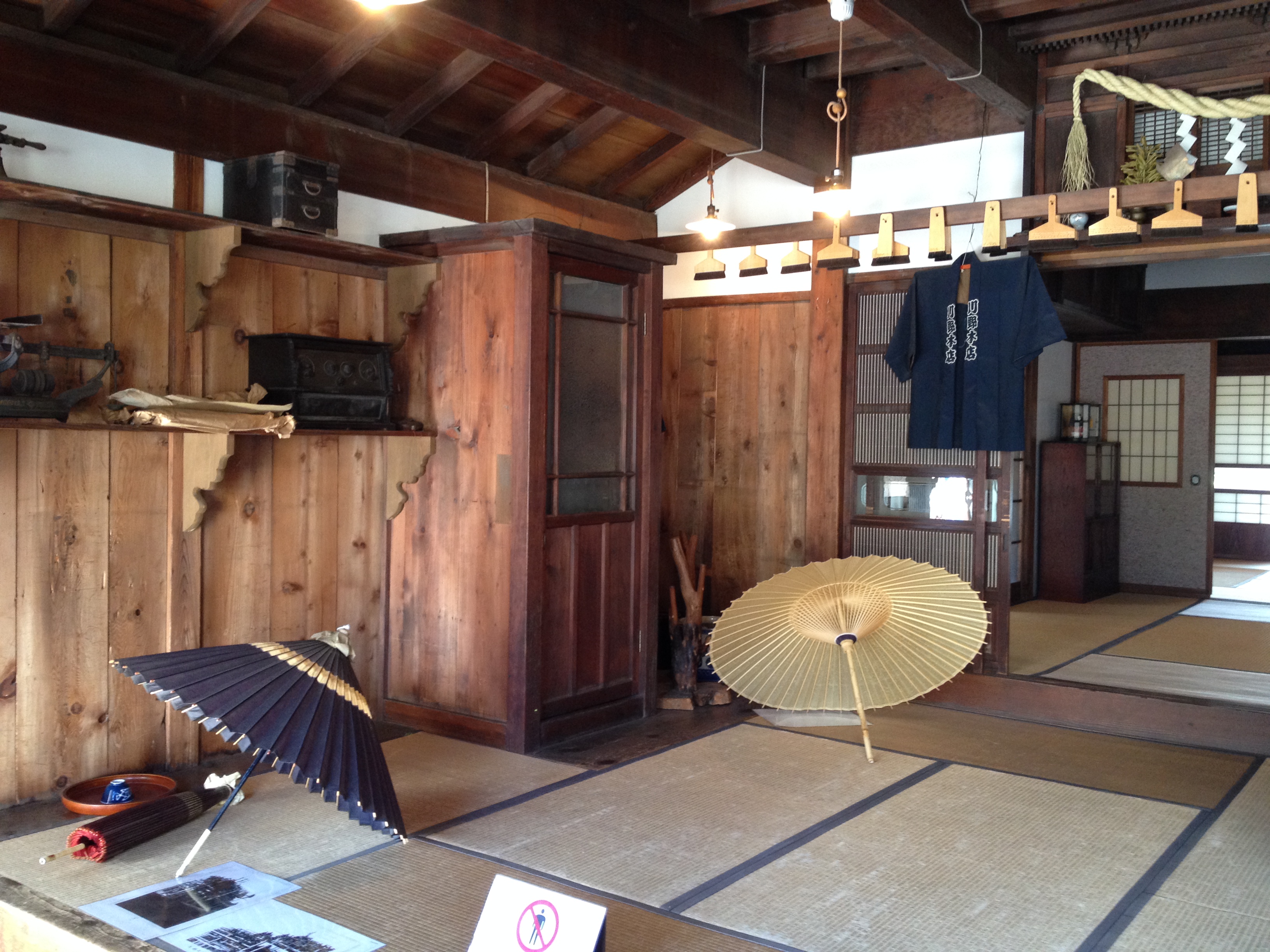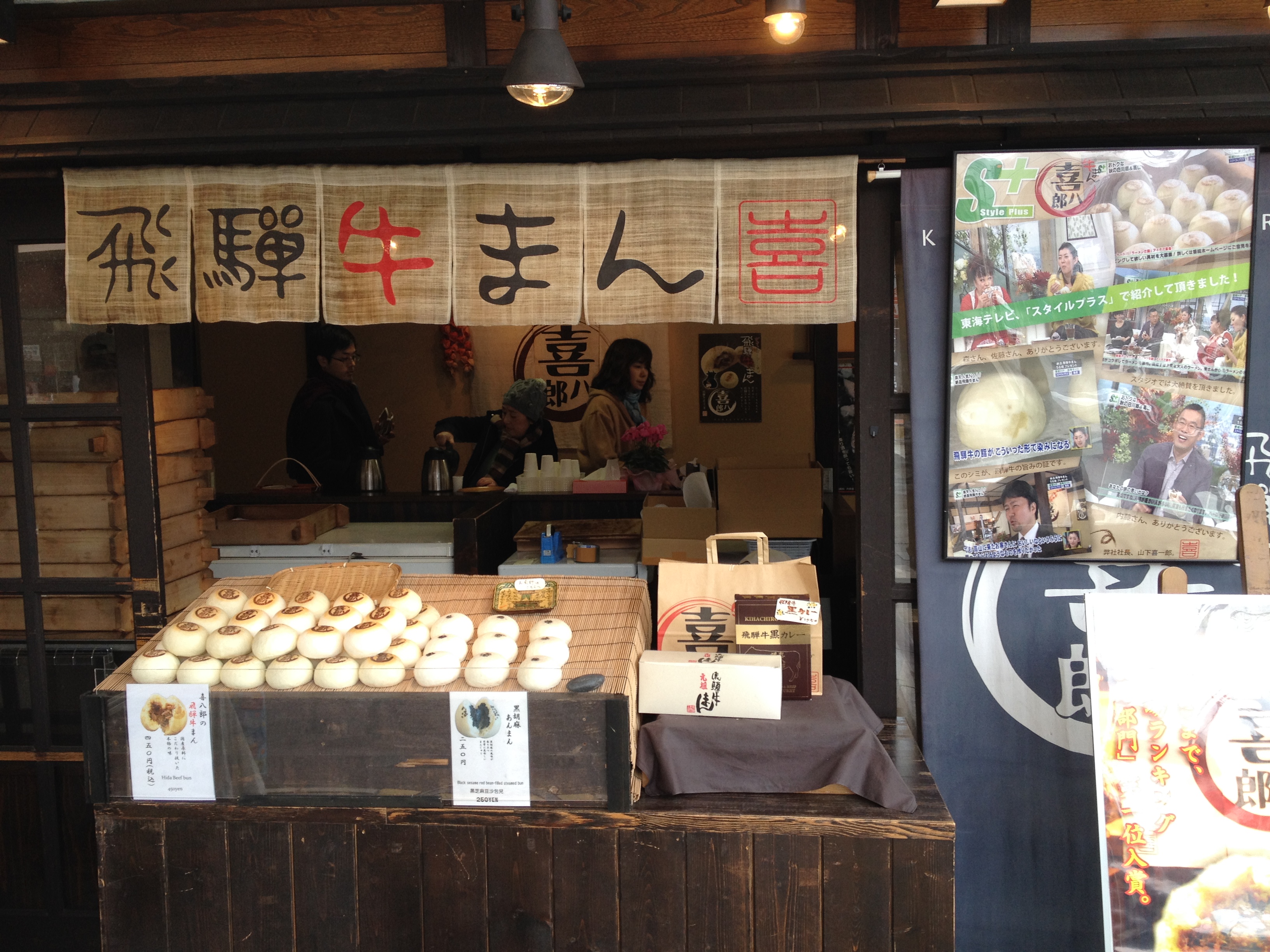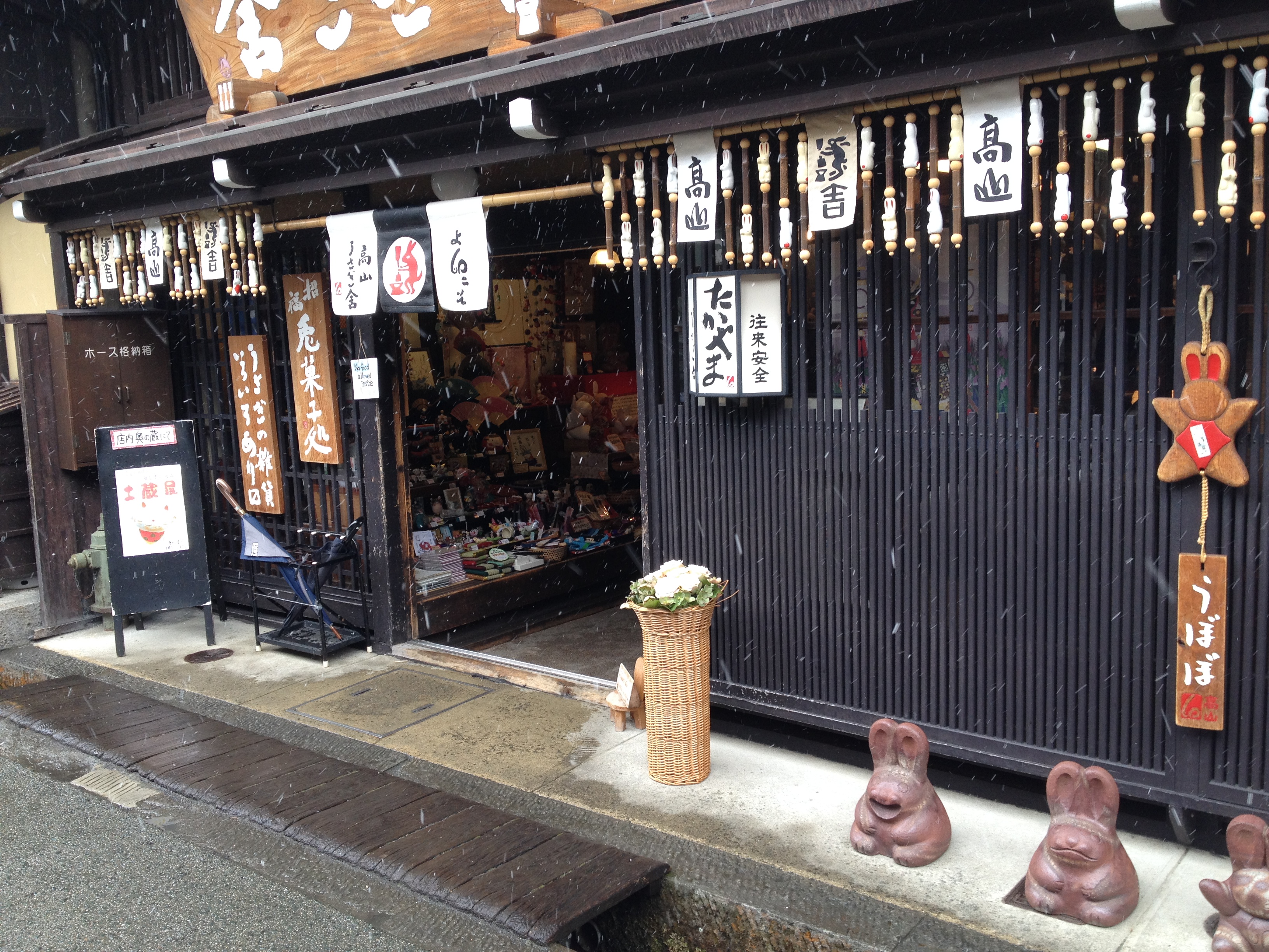 Sanmachi suji est le nom de la vieille ville, principalement composée de trois ruelles dont plusieurs maisons sont classées « heritage houses« . Cela nous rappelle effectivement certains quartiers de Kyoto, avec des constructions assez basses, uniformes et de bois foncé. Elles renferment quelques musées mais surtout des commerces, des échoppes de nourriture, de biscuits, thé, d’artisanat, des restaurants et de chaque côté de la rue, une large rigole où coule l’eau en permanence. Quand on pénètre ces devantures, le décor est hors du temps; des plafonds bas, un sol en terre ou en pierre, des étalages superbes et bien garnis, sur une profondeur de bâtiment insoupçonnée.