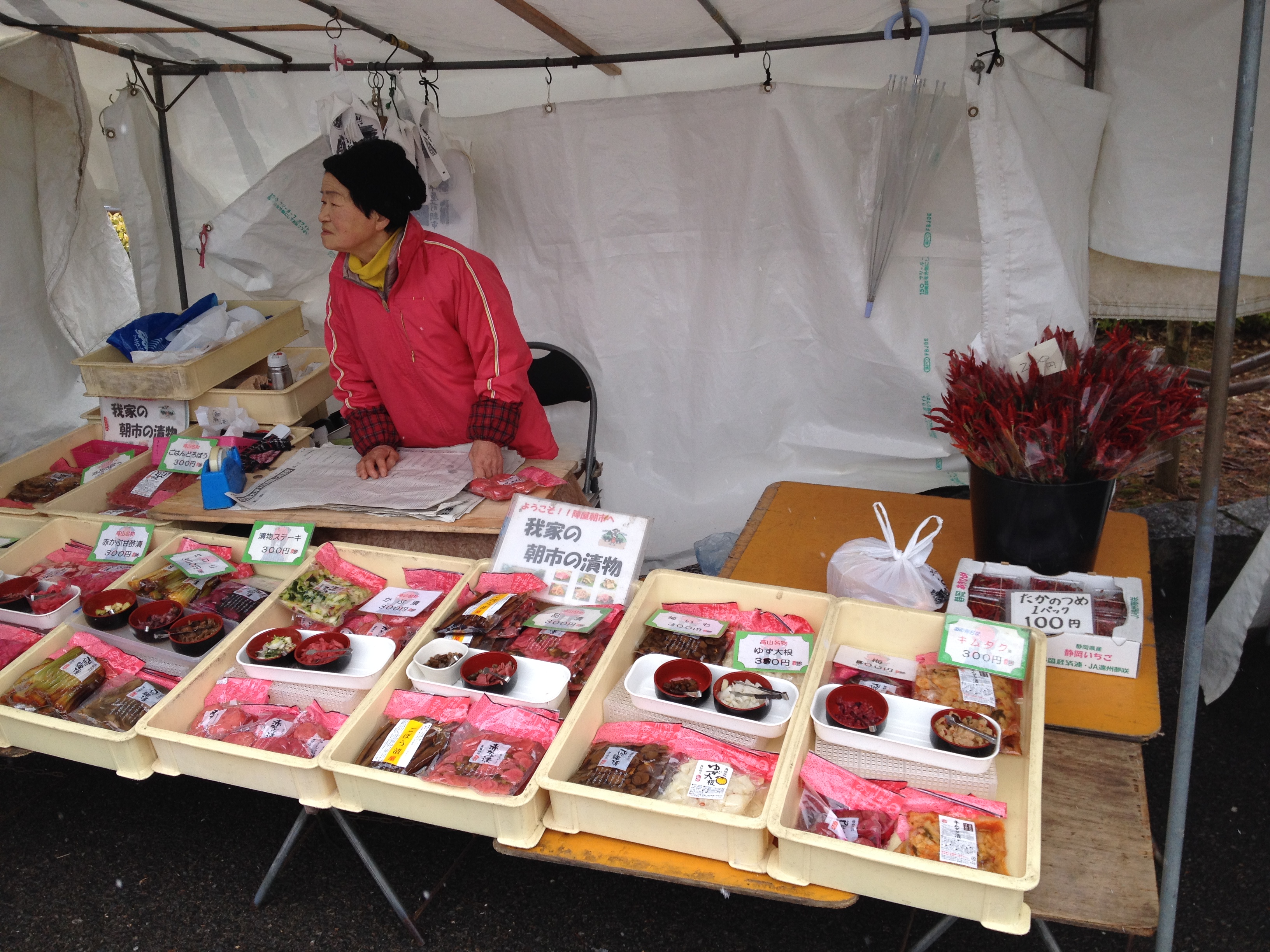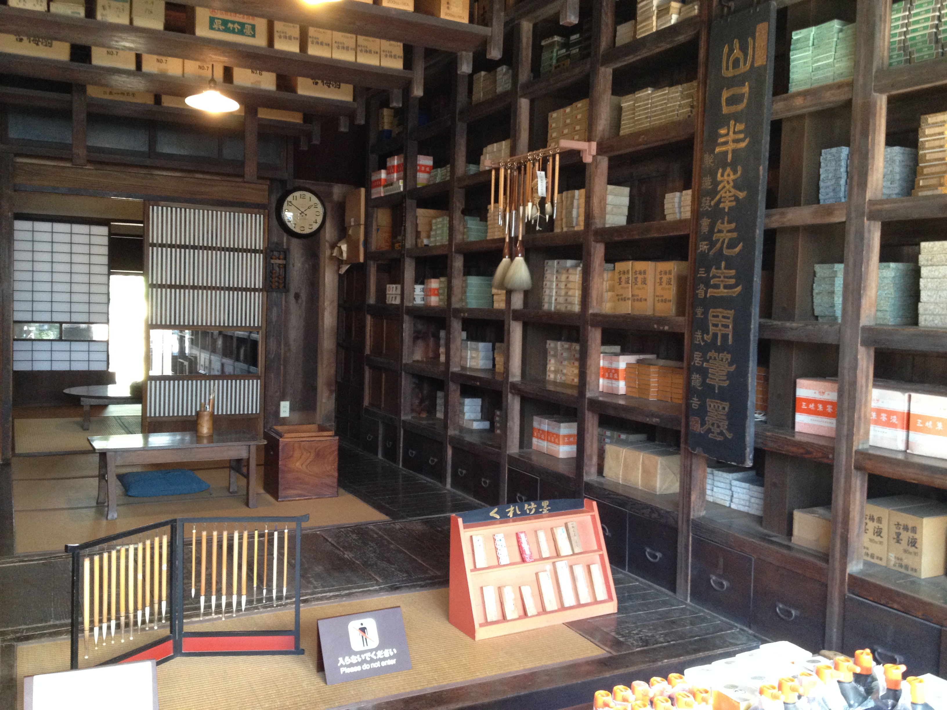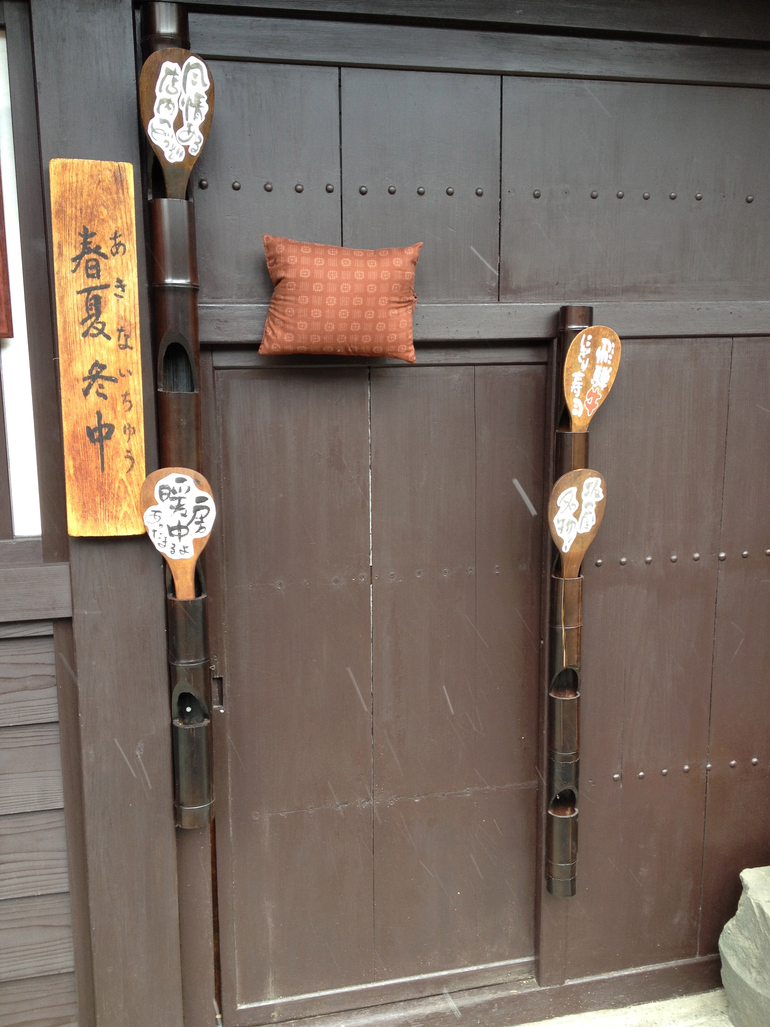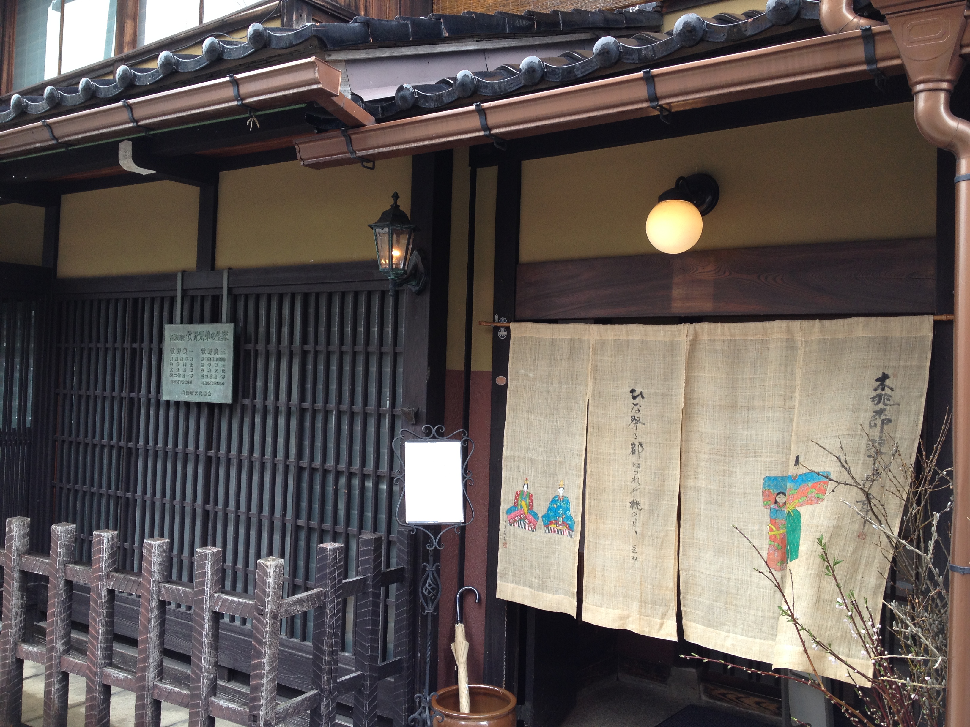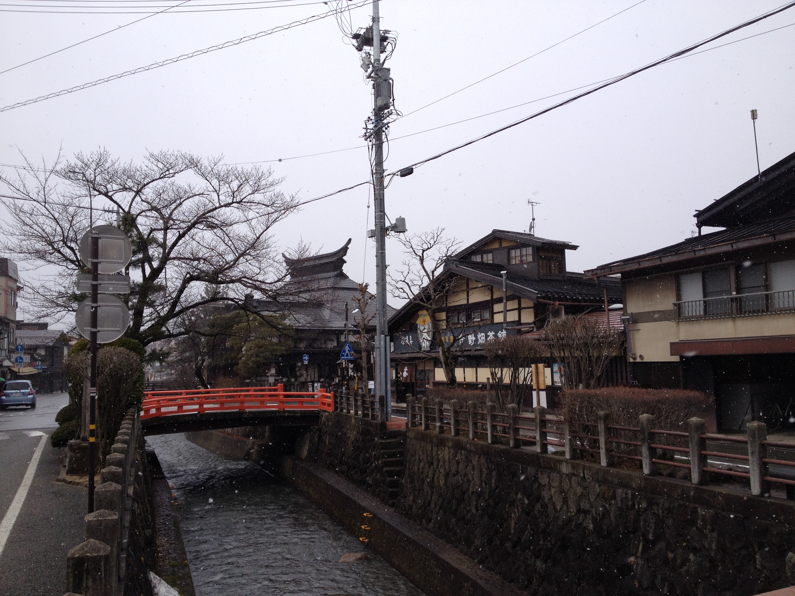 Sanmachi suji est le nom de la vieille ville, principalement composée de trois ruelles dont plusieurs maisons sont classées « heritage houses« . Cela nous rappelle effectivement certains quartiers de Kyoto, avec des constructions assez basses, uniformes et de bois foncé. Elles renferment quelques musées mais surtout des commerces, des échoppes de nourriture, de biscuits, thé, d’artisanat, des restaurants et de chaque côté de la rue, une large rigole où coule l’eau en permanence. Quand on pénètre ces devantures, le décor est hors du temps; des plafonds bas, un sol en terre ou en pierre, des étalages superbes et bien garnis, sur une profondeur de bâtiment insoupçonnée.