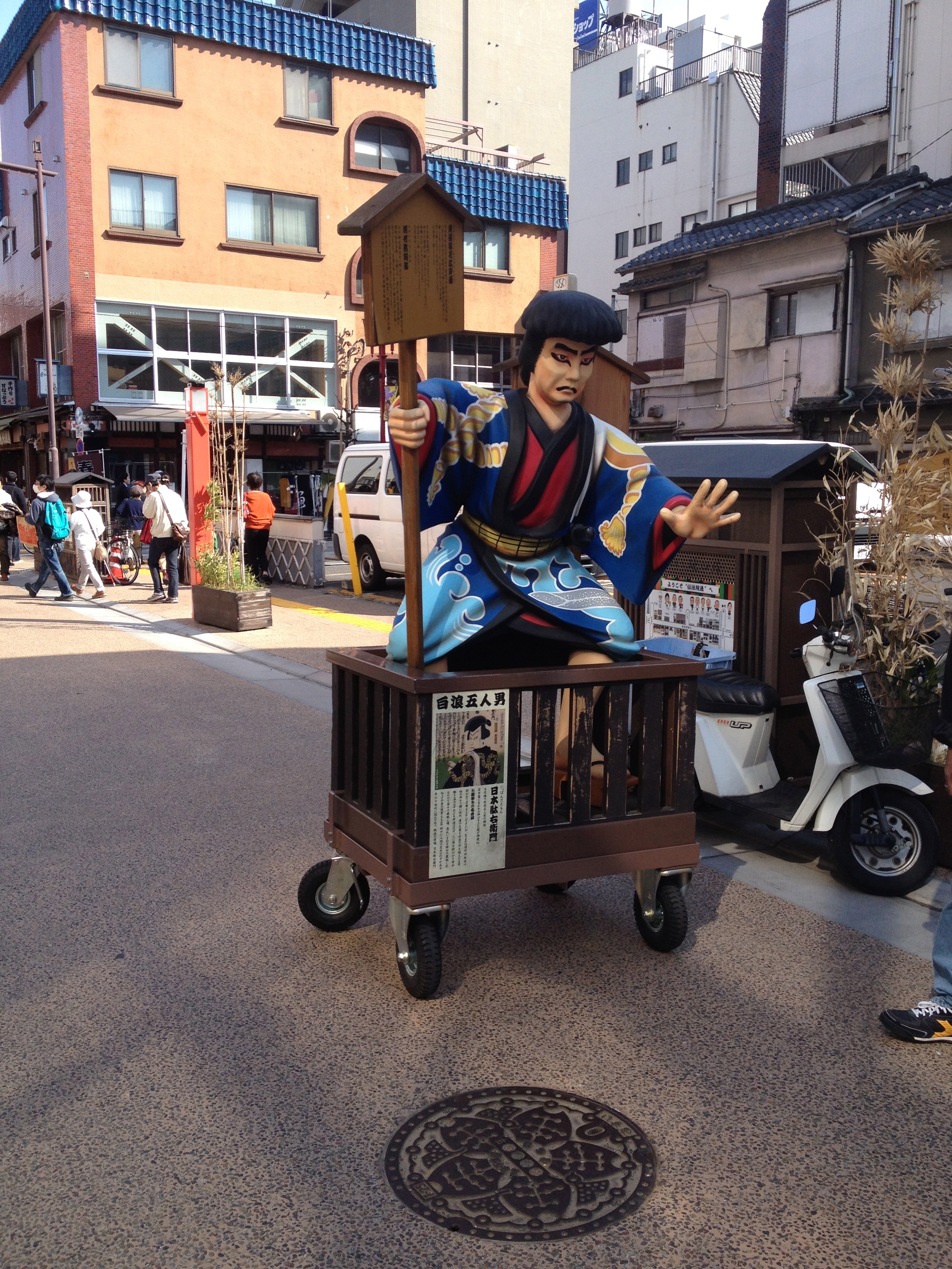 Takayama est connue pour ses deux festivals de chars qui ont lieu l’un mi-avril et l’autre mi-octobre, aux changements de saison. Ces fêtes attirent des milliers de visiteurs venus admirer une douzaine de chars qui paradent pendant deux jours dans les rues; ils sont tirés par des figurants en costume d’époque et animés de marionnettes super sophistiquées. La nuit, le défilé se prolonge avec les chars éclairés de leurs multiples lanternes. Certains chars sont bien rangés dans une sorte de très haut garage; nous en avons repéré l’un ou l’autre dans la vieille ville.