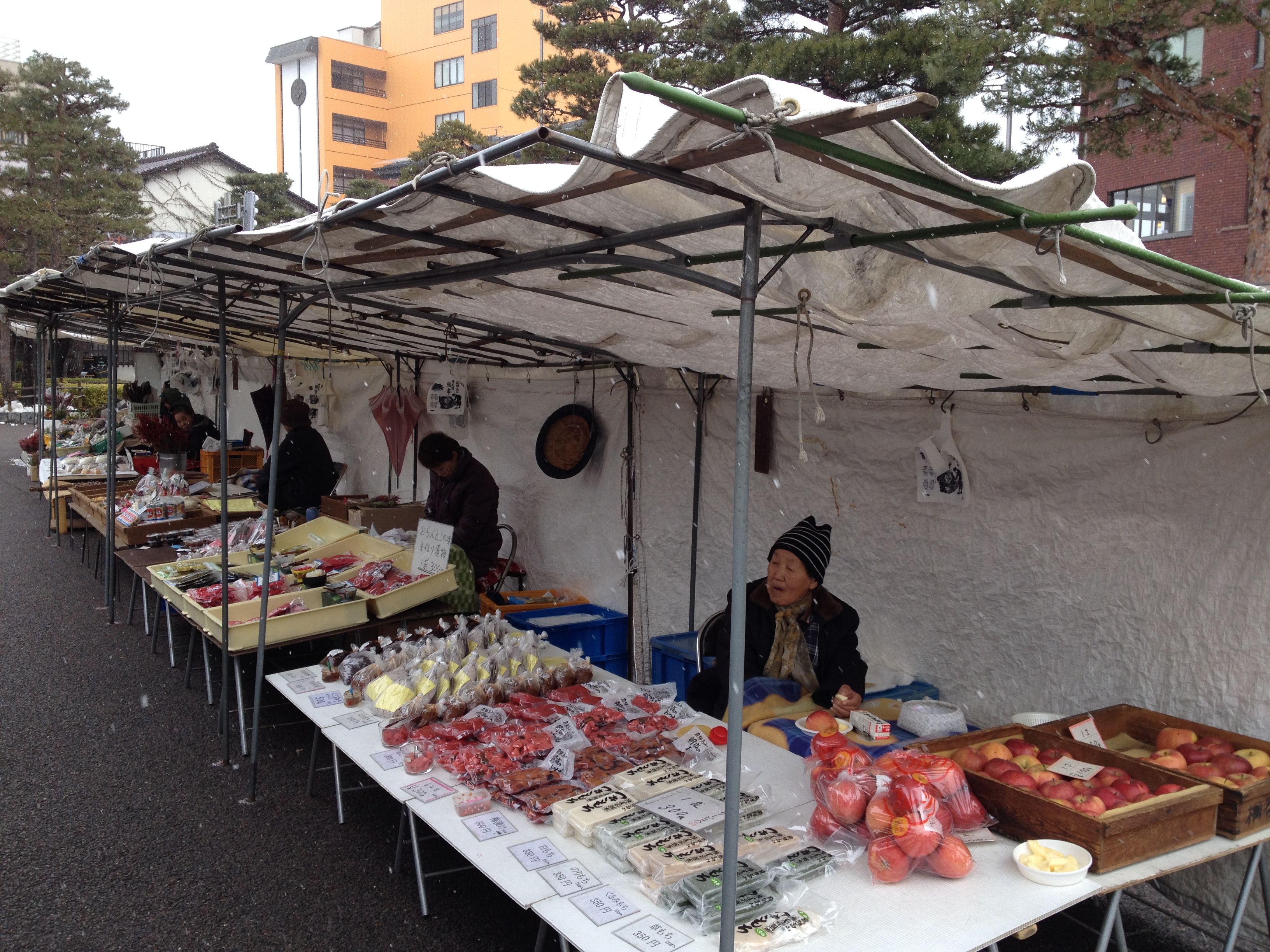 Ainsi chaudement habillés, nous nous dirigeons tout d’abord vers le marché où chaque matin des paysannes s’installent pour vendre leurs légumes, leurs fruits, leurs légumes vinaigrés, leurs bricolages. Elles n’ont pas trop de clients ce jour et ne doivent pas avoir fort chaud, car en plus de cette neige qui tombe à gros flocons, le vent souffle en rafales.