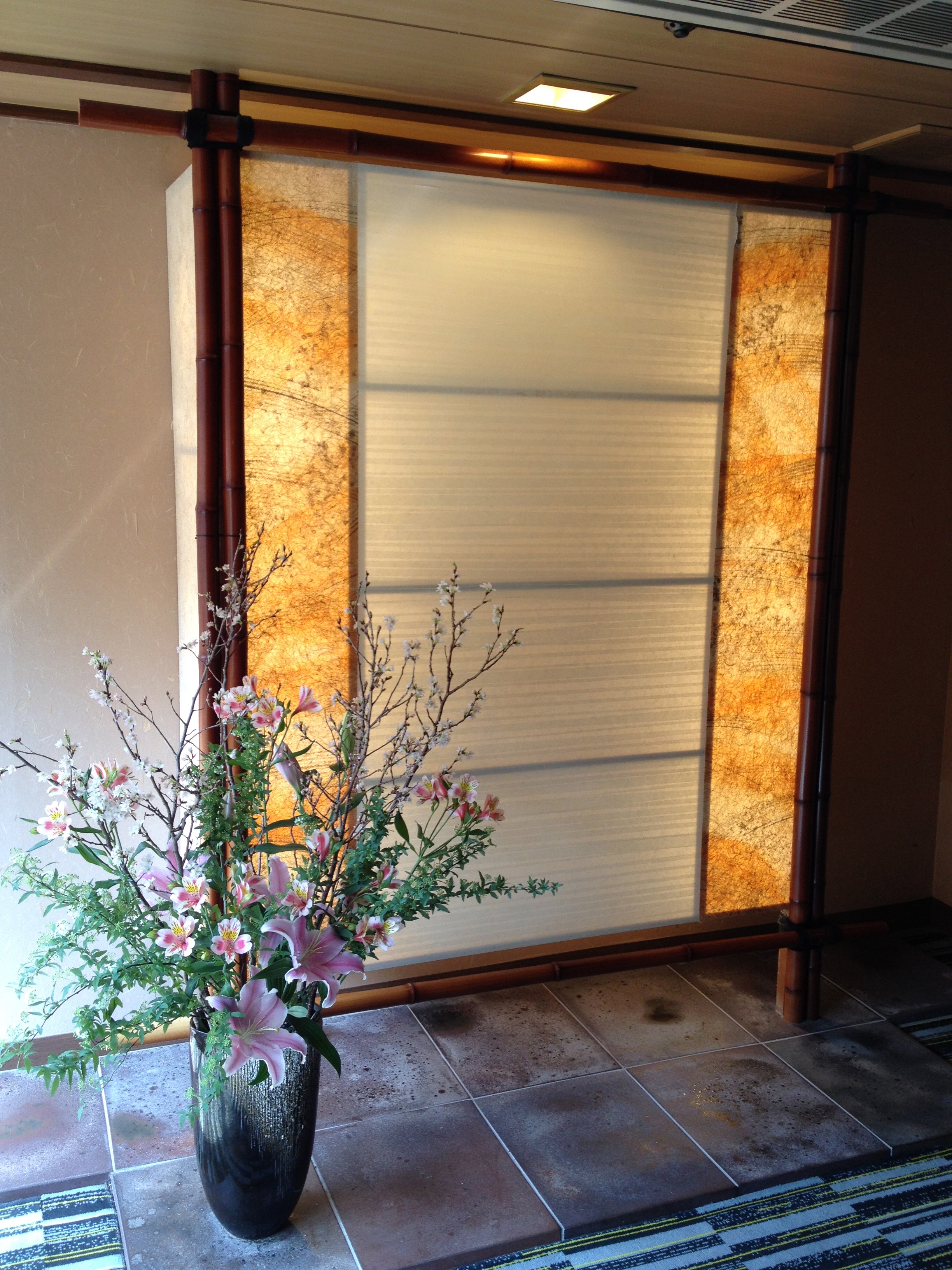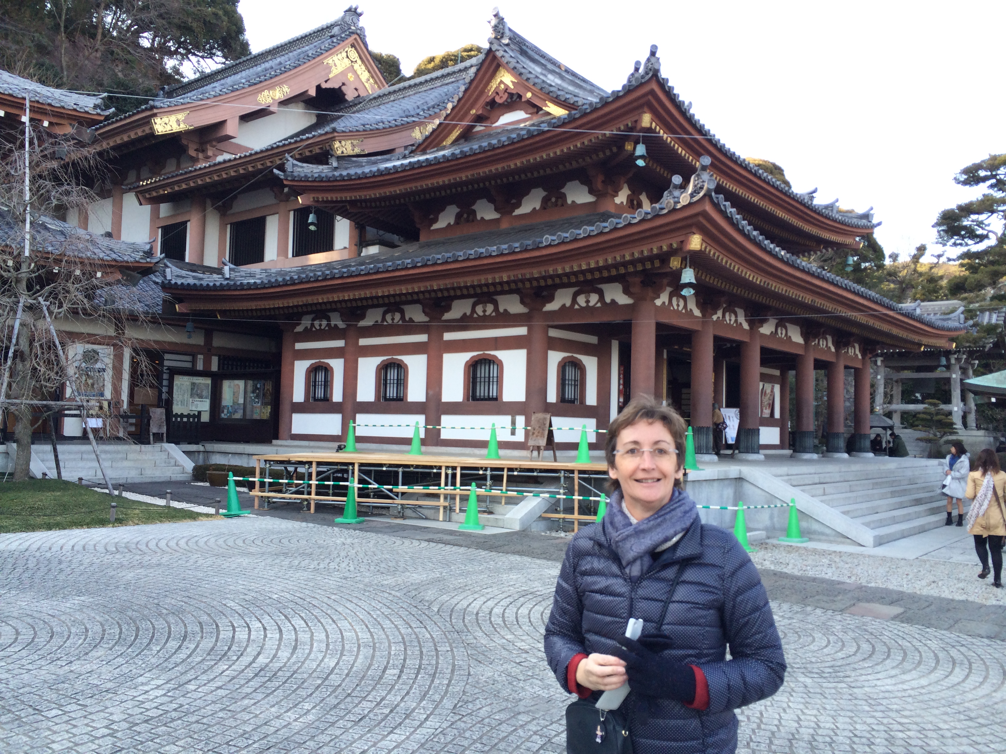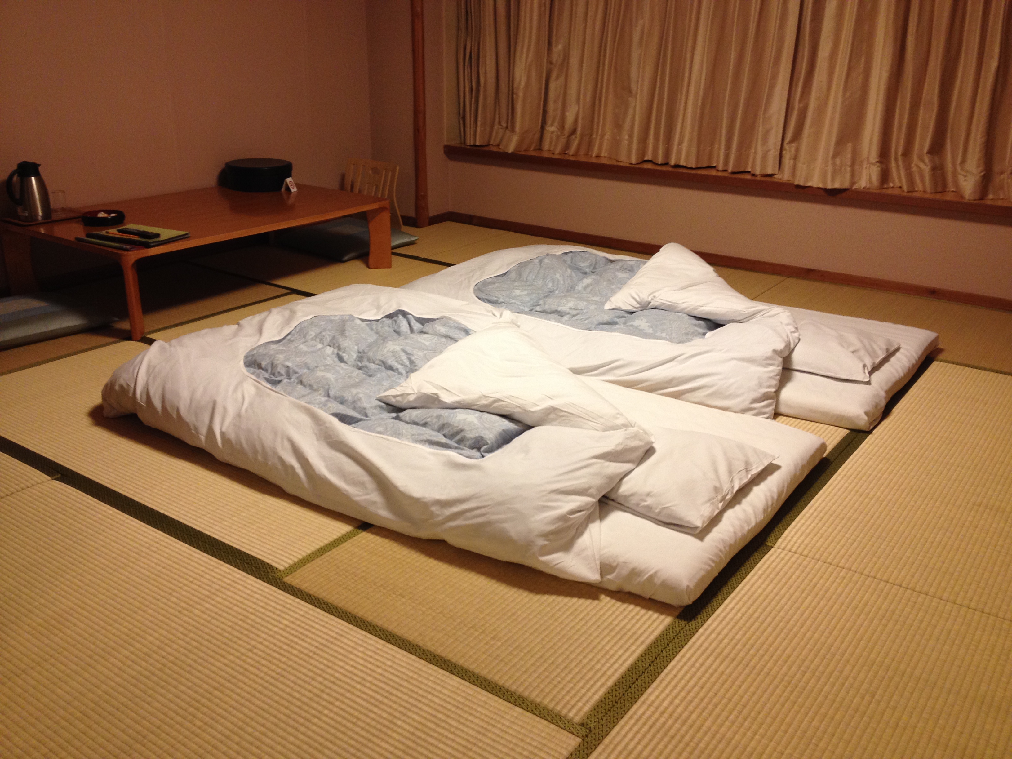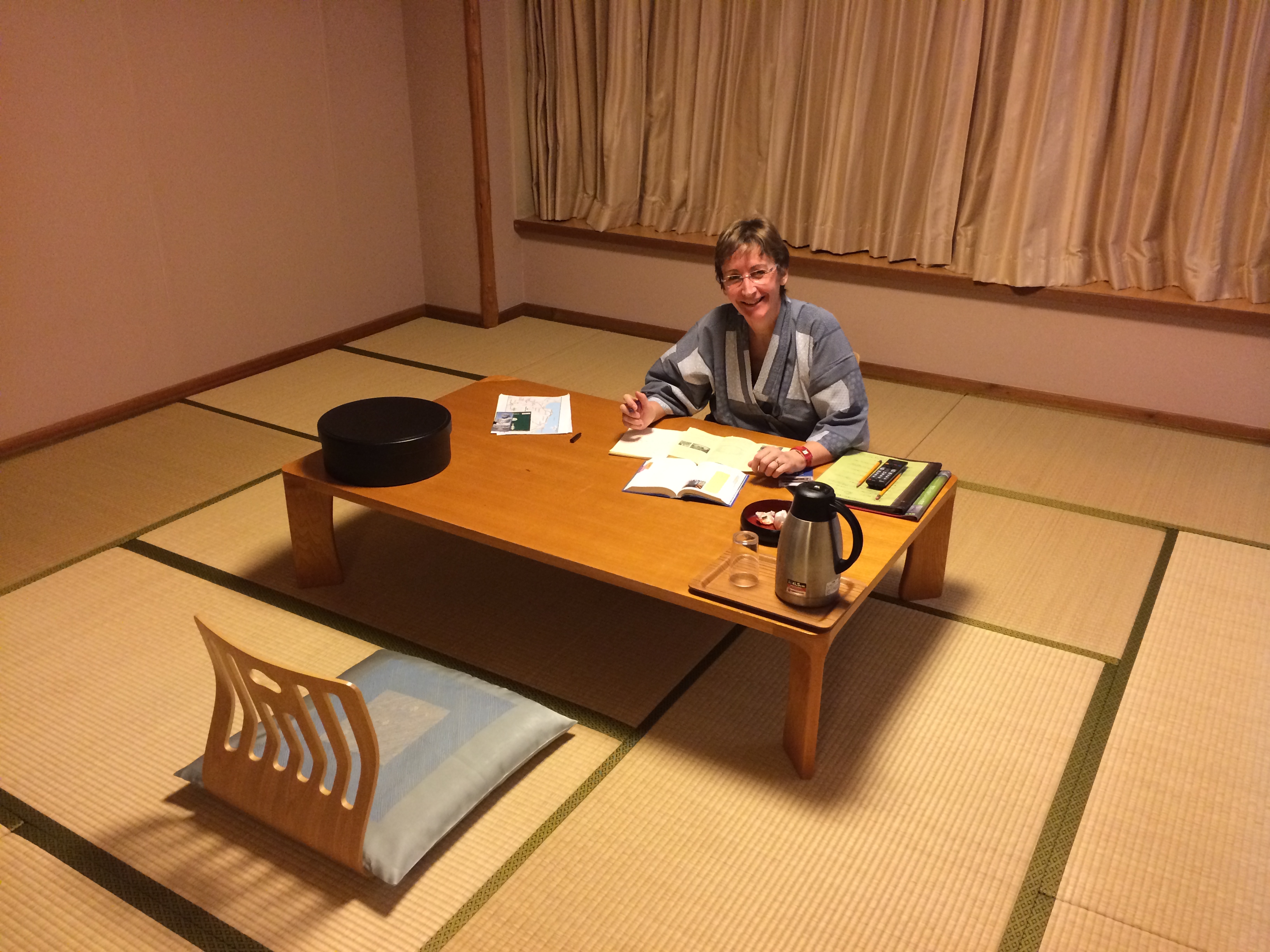 Je suis rassurée lorsque à la réception de l’hôtel, il y a bien une chambre à notre nom, et même de style japonais comme je l’avais réservé – le luxe pour les japonais étant de réserver une chambre style western, soit avec un lit et une disposition comme en Europe! La nôtre est spacieuse, un petit coin salon, des sanitaires qui font penser à ceux d’un bateau et une grande pièce couverte au sol de tatamis, avec une table et deux sièges bas et un service à thé … mais surtout cette odeur de paille, que j’aime – tel que dans ma pièce à Lonay. Il y a au moins huit paires de pantoufles à disposition, c’est dire que les japonais occupent en général ce type de chambre plus nombreux – nous verrons d’ailleurs plusieurs jeunes en petits groupes. A l’arrivée, nous avons donné nos tailles pour le Yukata qui nous parvient alors en chambre, par contre ils ne nous ont pas demandé nos pointures – Yves aura le talon qui dépasse bien à l’arrière des mules et pourtant nombreux sont ceux pour qui c’est le contraire!