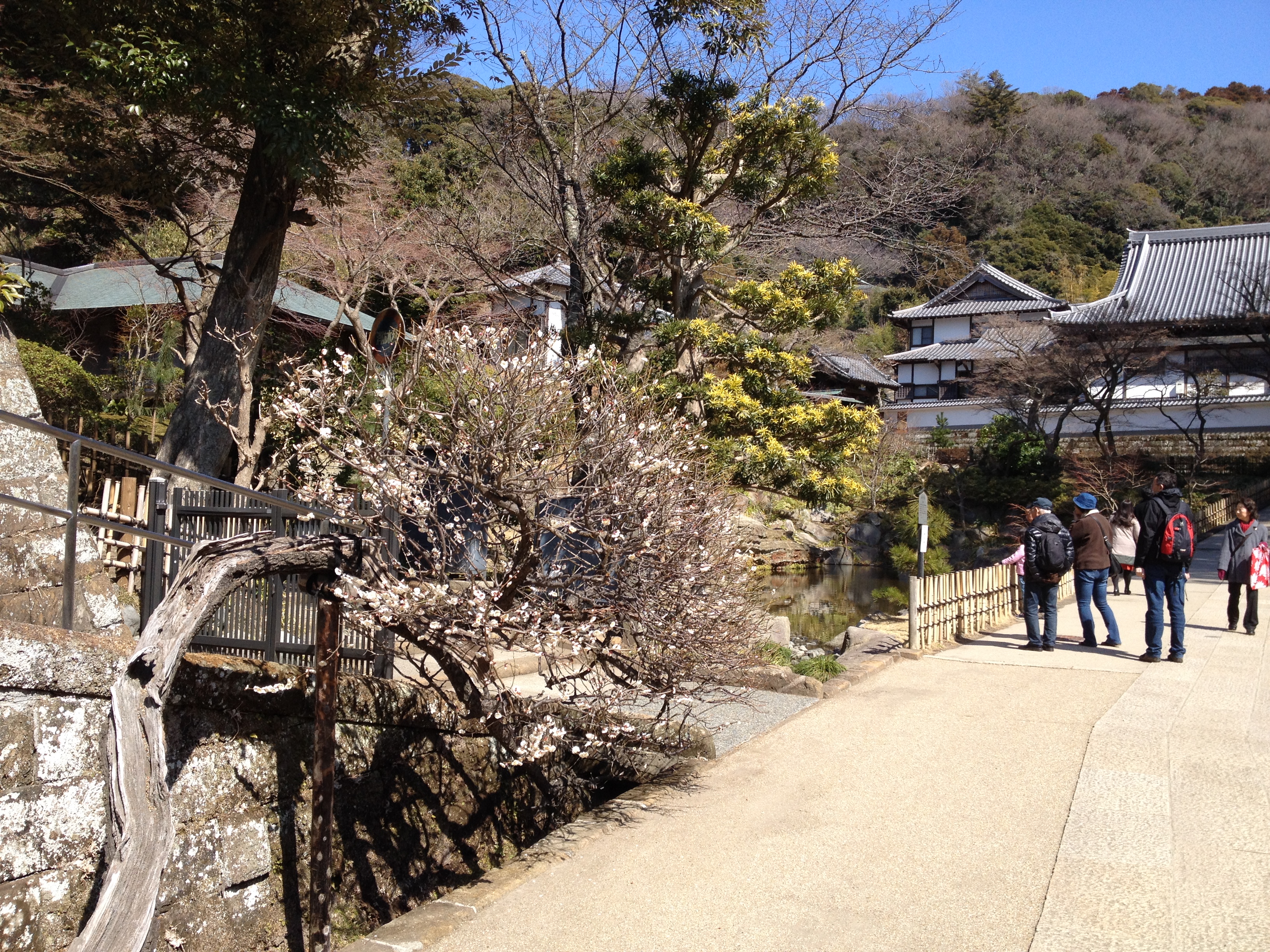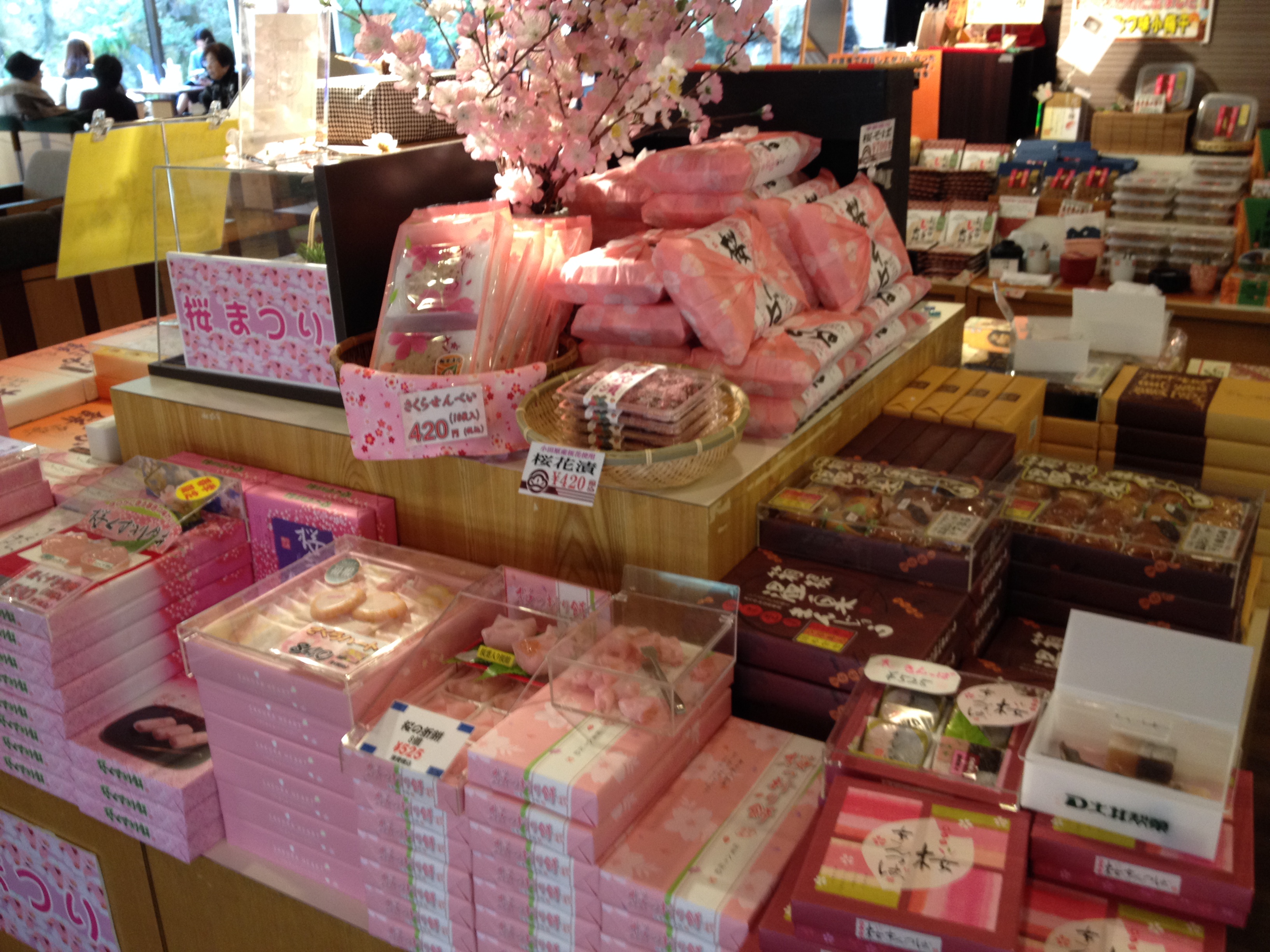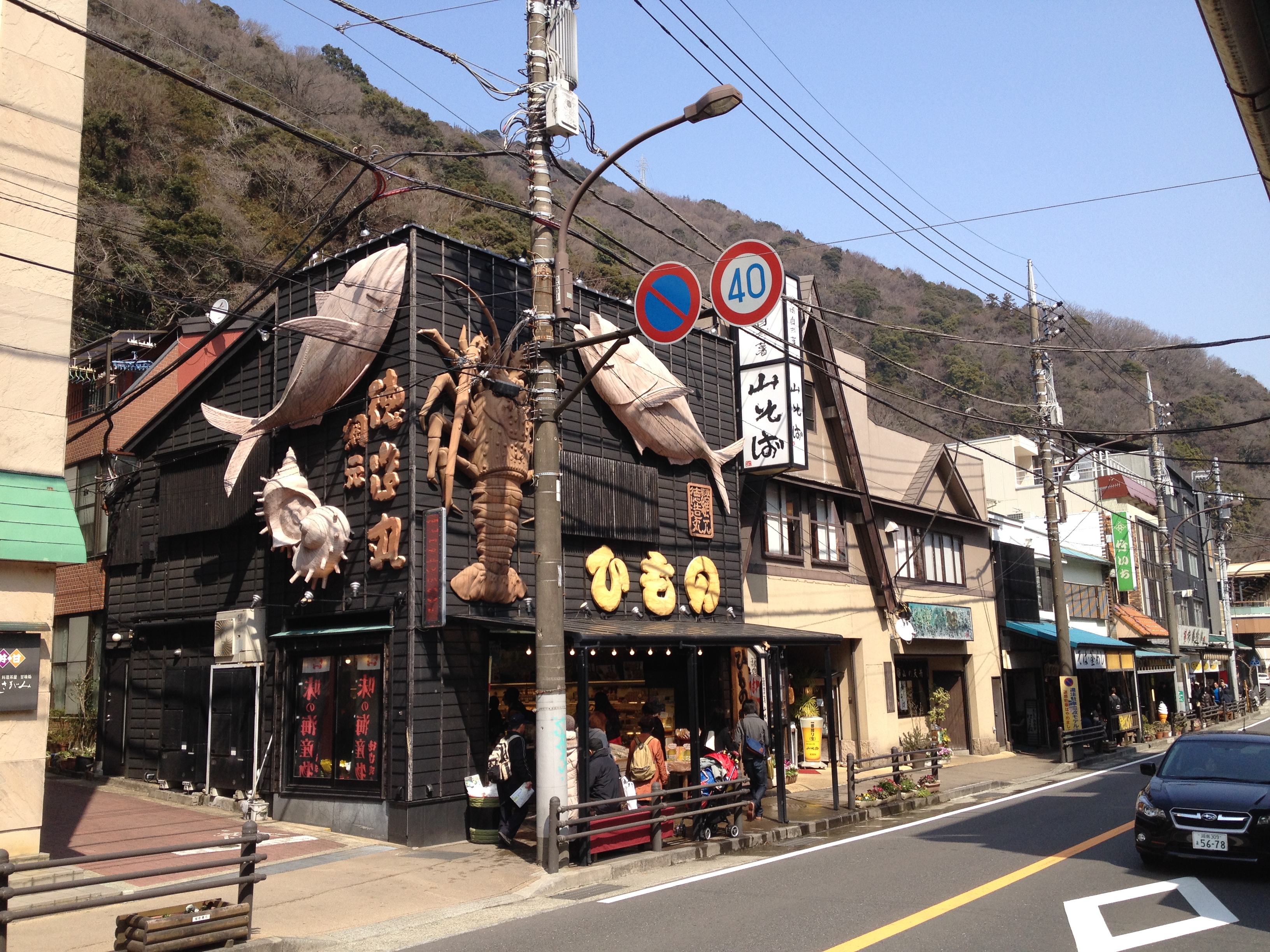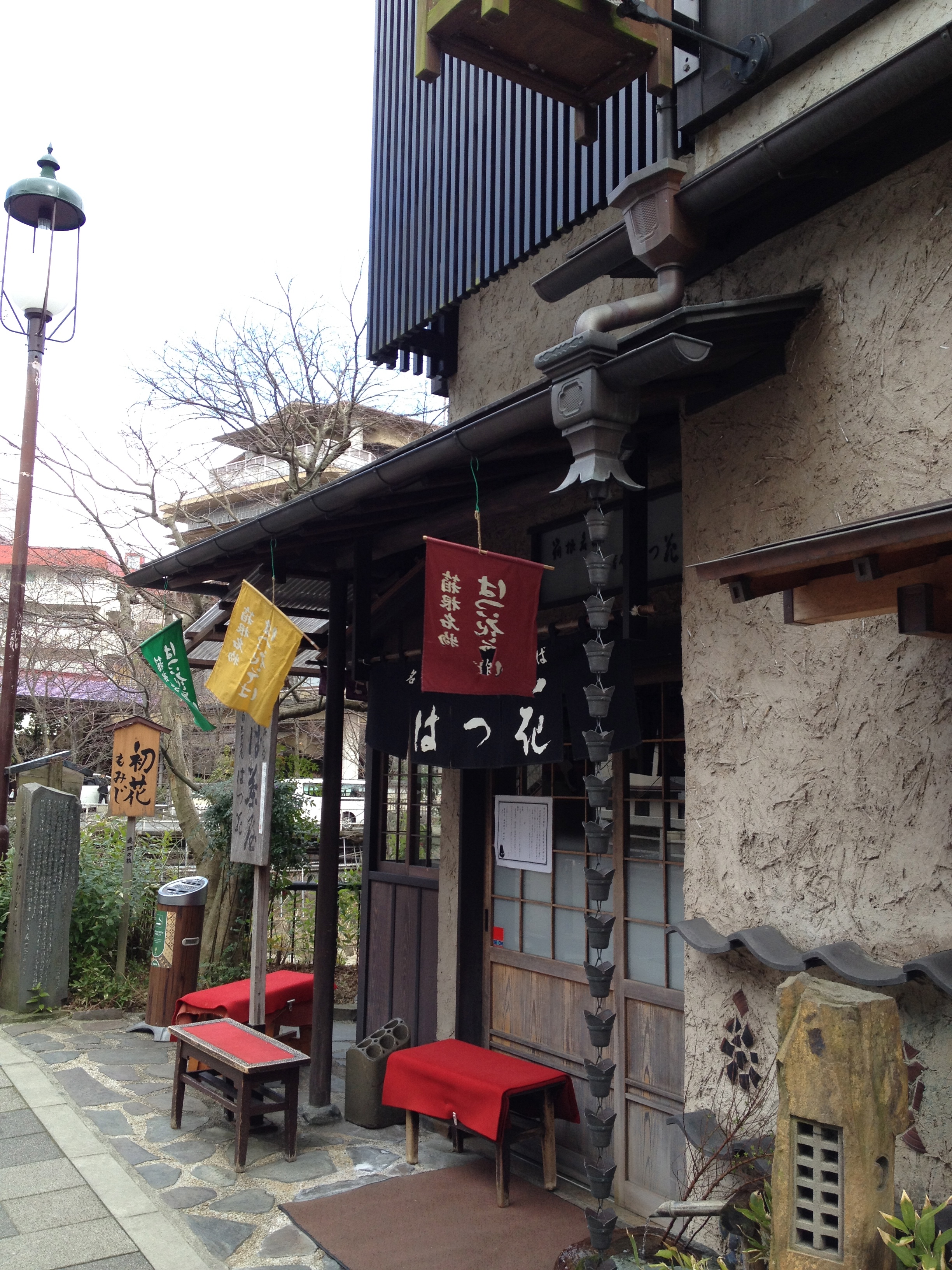 Une petite marche s’impose jusque dans la station (sans yukata ni pantoufles bien sûr) où se succèdent des restaurants, des cafés mais surtout des boutiques et des boutiques de leurs spécialités gourmandes – biscuits, petits gâteaux de toutes formes, toutes couleurs et dont on ne peut jamais prédire si ce sera sucré ou salé (les chips peuvent bien être roses!). Beaucoup de poissons séchés ou sous-vide, qui ne nous inspirent que moyennement; toutes ces échoppes sont grandes ouvertes sur les trottoirs et la décoration intérieure est soignée, colorée, fleurie.