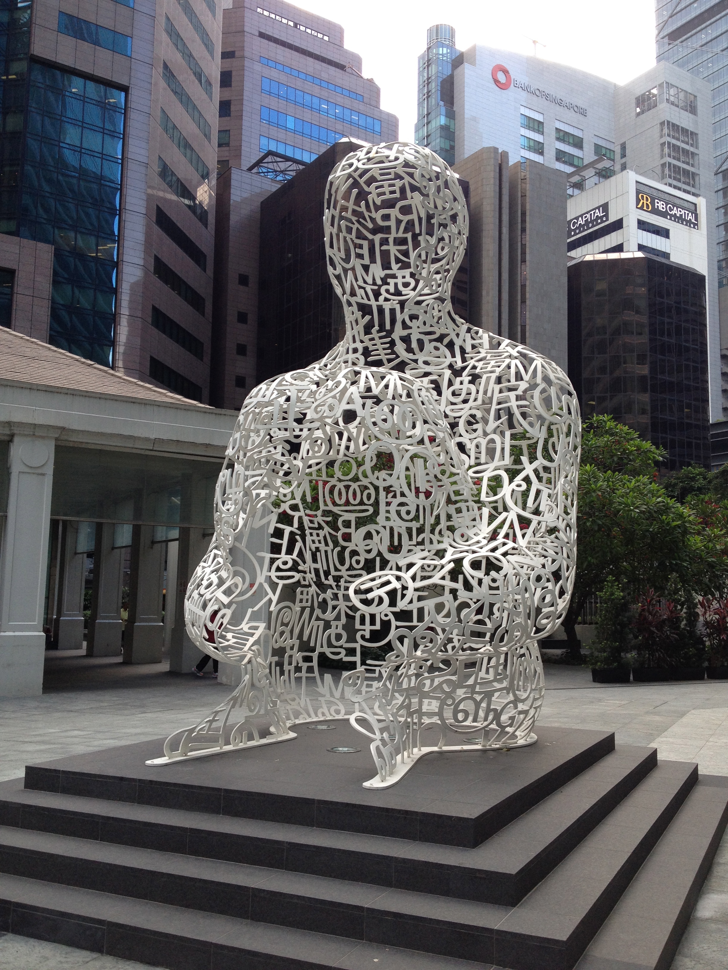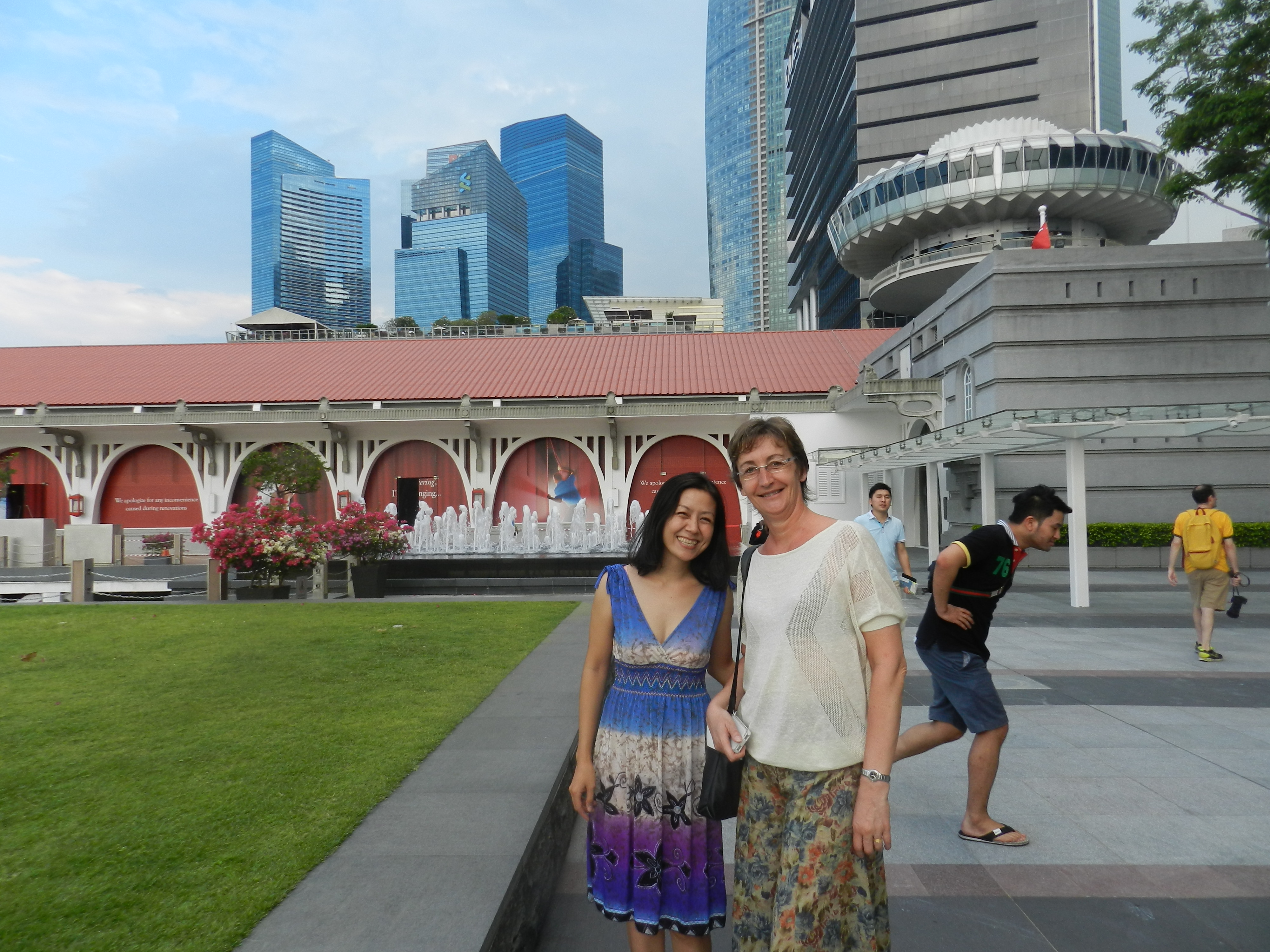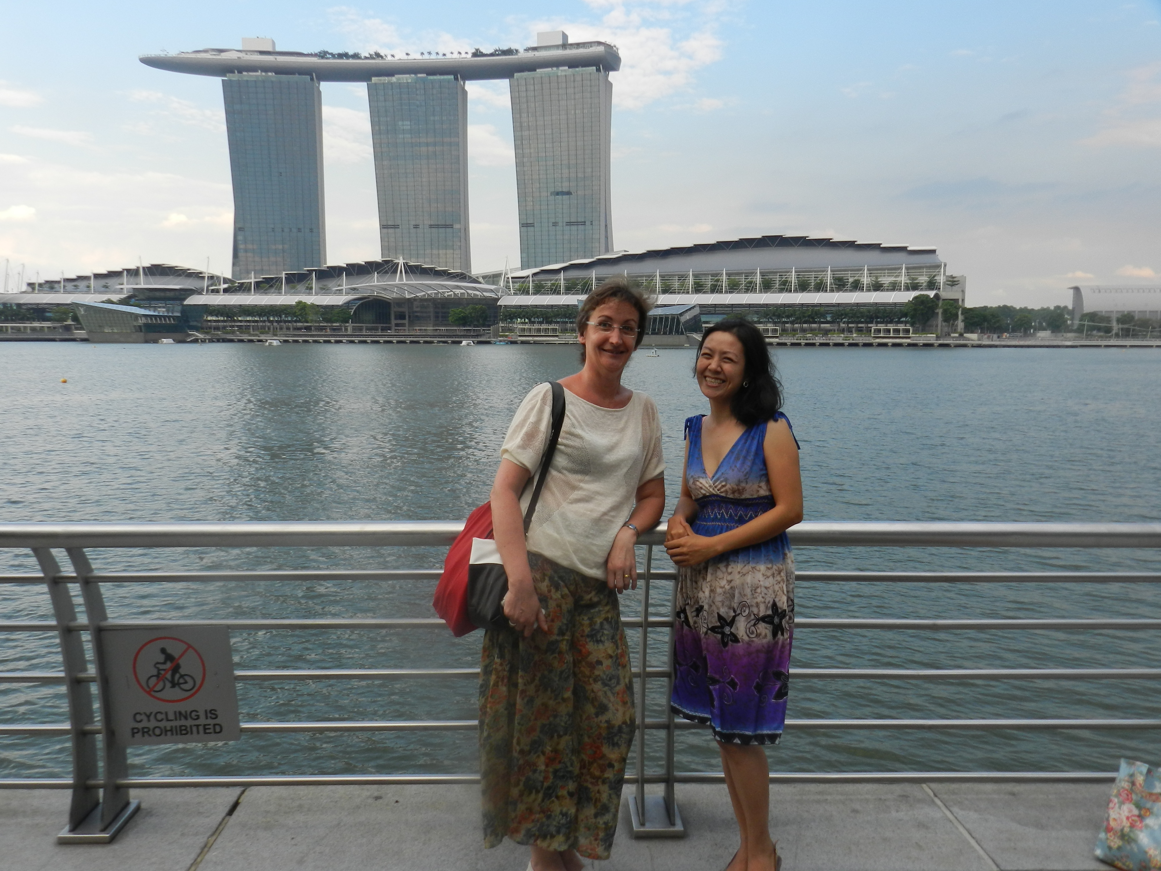 Il s’agit de la première visite de mes nouvelles amies vietnamiennes à Singapour; cela ressemble à un rêve qui devient réalité! Tout en parlant pour faire connaissance, je les guide en nous dirigeant vers Marina Bay, en passant à Raffles Place où j’ai la surprise de découvrir une nouvelle œuvre de Jaume Plensa! Apparaît ensuite le mythique hôtel Marina Bay Sands que tous les asiatiques connaissent en photo – elles sont aux anges, n’en croient pas leurs yeux! Merlion crache son jet dans la baie, les photos crépitent, avec pause typique des chinoises les doigts en V et Myra ne tarde pas à communiquer sa joie avec ses amies en Europe et en Asie. C’est un vrai plaisir de papoter avec ces deux sœurs, de nous raconter nos voyages, nos familles, de se promettre de conserver le contact – qui sait, viendront-elles peut-être en Suisse ou bien moi à Saigon …