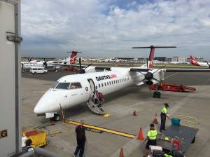 Trente minutes de train suffisent ce mercredi matin pour rejoindre l’aéroport domestic de Sydney. L’enregistrement et le dépôt de la valise sont entièrement automatisés aux bornes, la sécurité n’est pas trop stressée et nous voici prêts pour un vol Qantas de 50 minutes jusque Canberra, à bord d’un petit avion à hélices qui sera complet (et il y en a un chaque demi-heure sur toute la journée). La revue de la compagnie présente justement 3 articles qui nous parlent : Singapour, ville d’entreprenariat, la nouvelle Business School de Frank Gehry et Vancouver, que nous allons retrouver en mai.