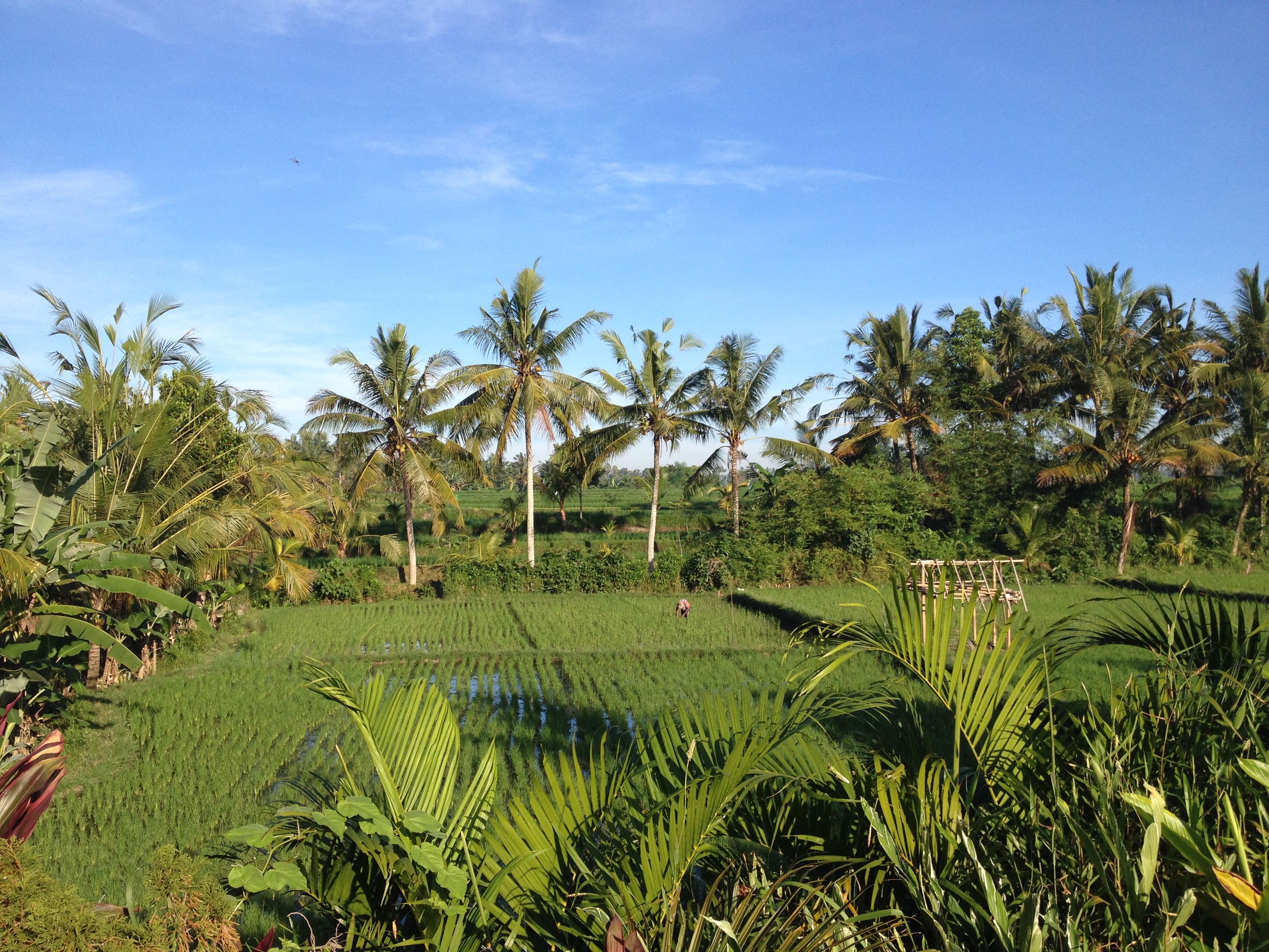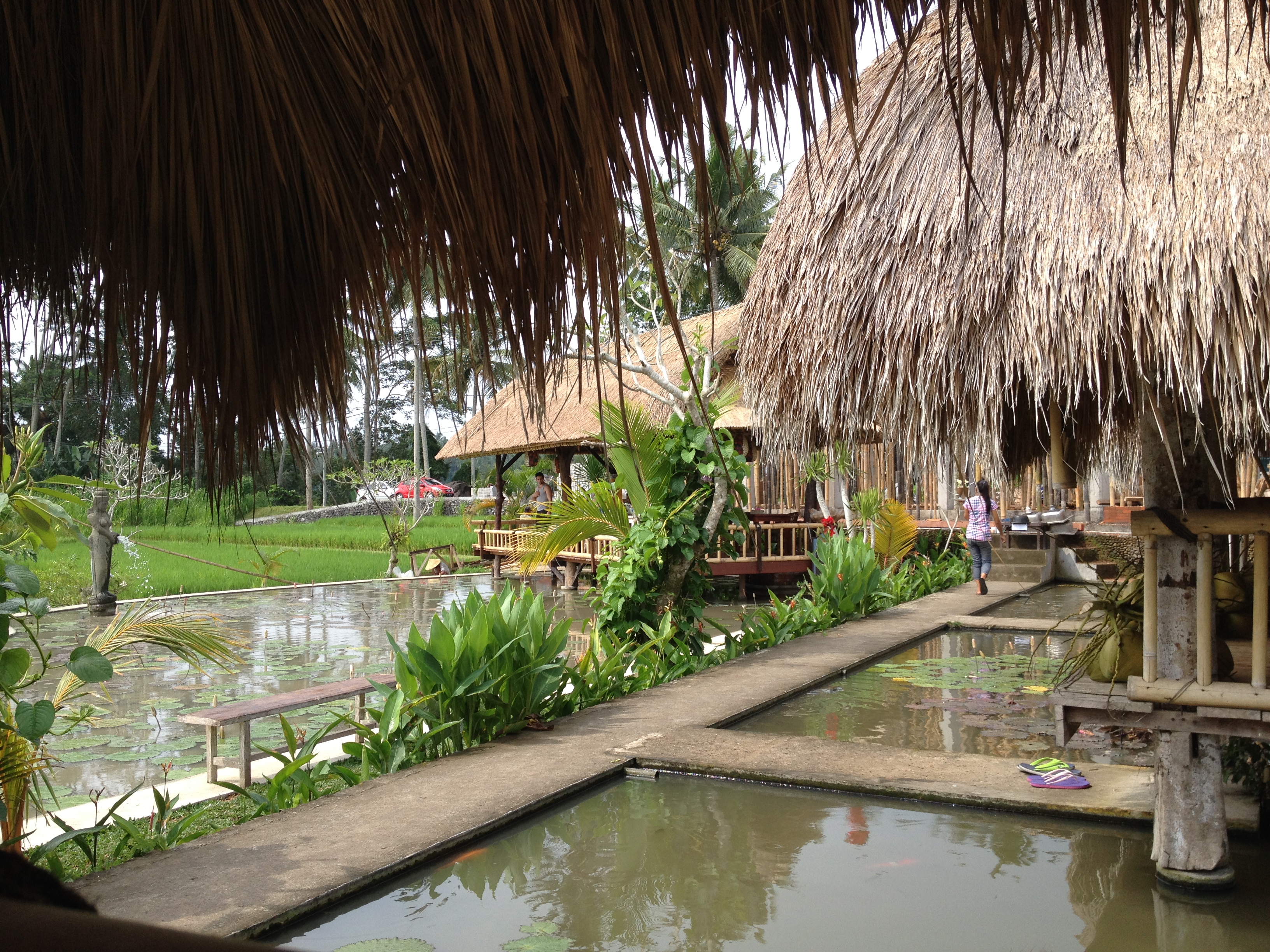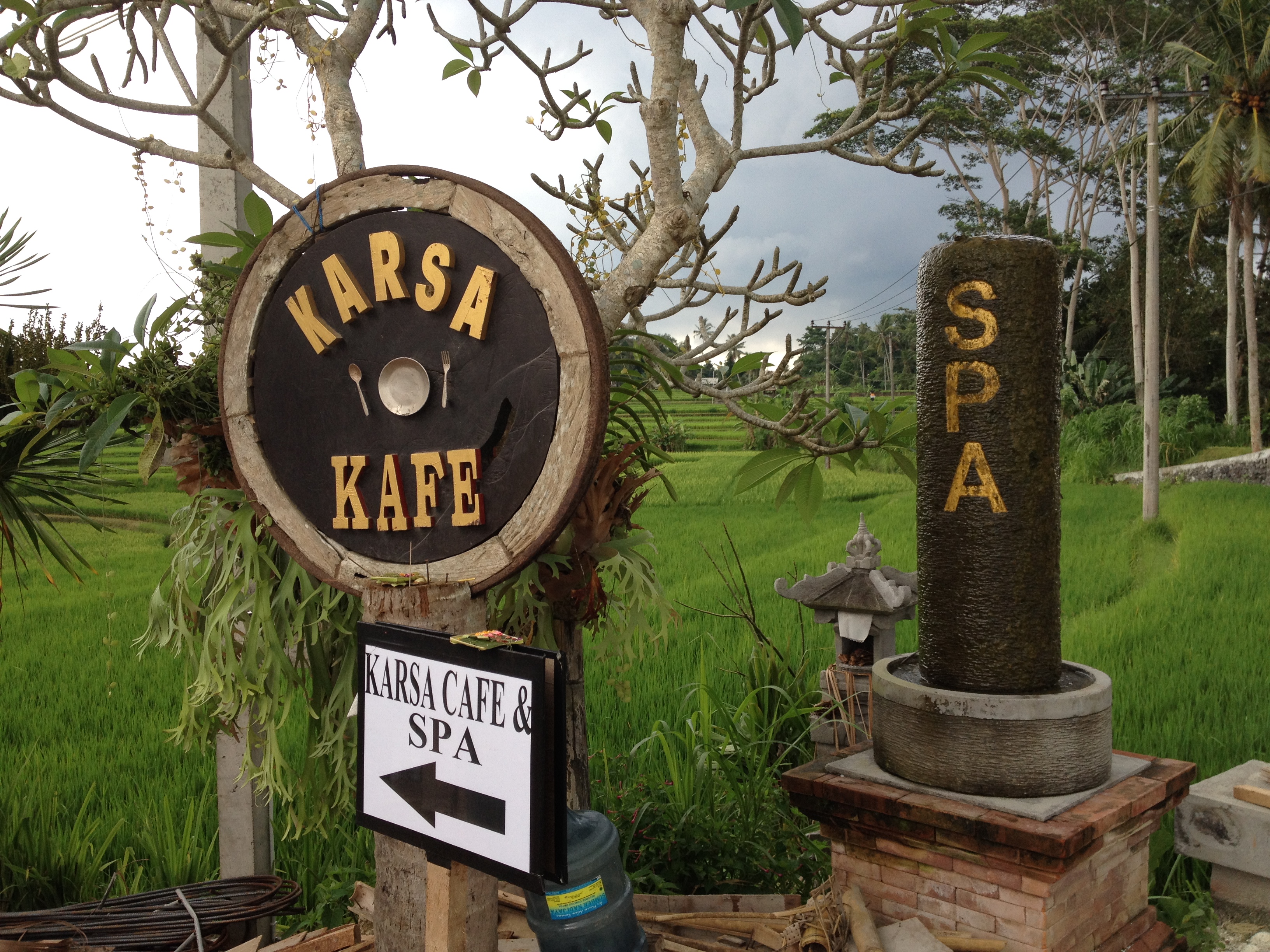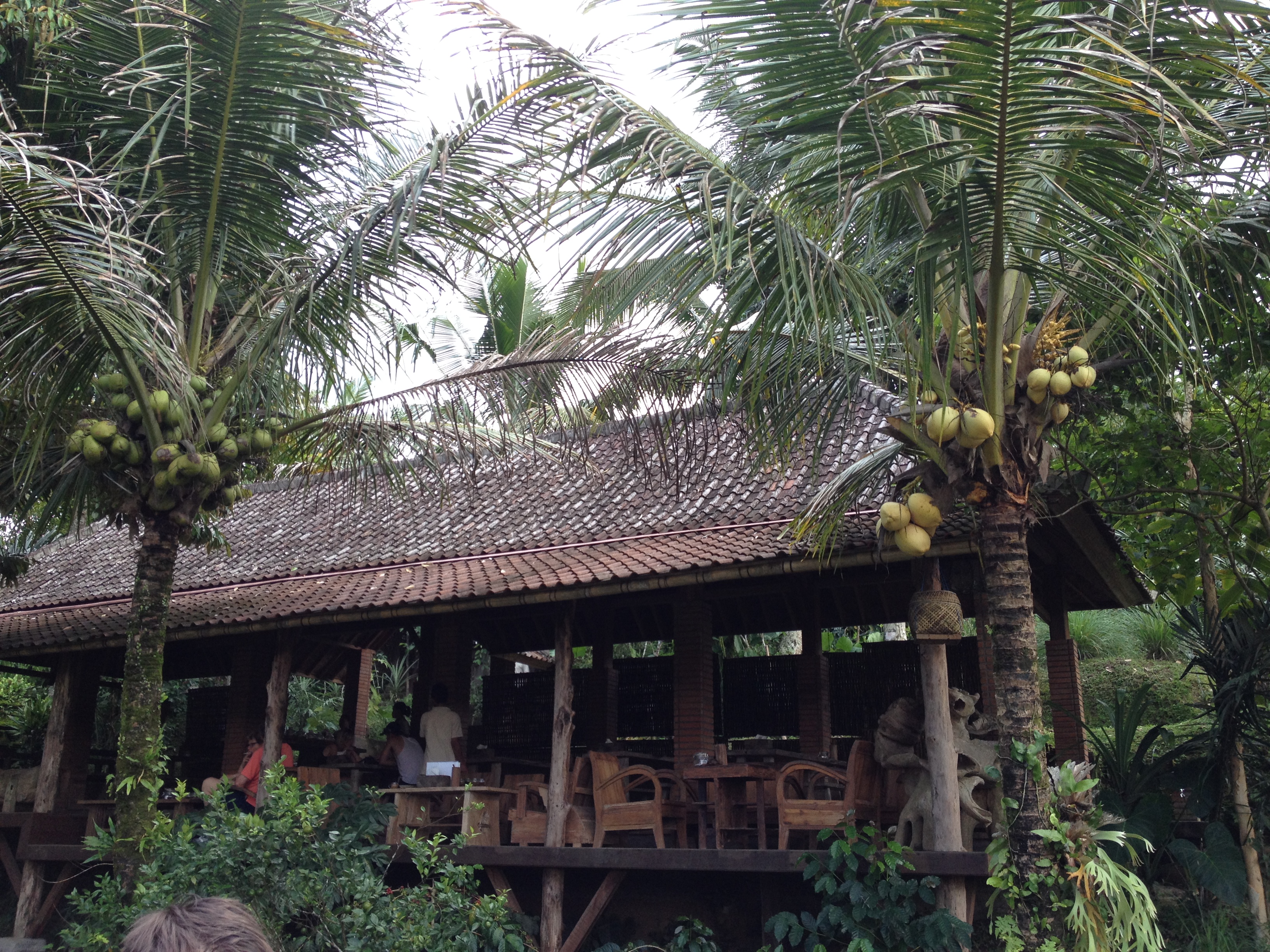 Il nous dépose au plein milieu de nulle part au Karsa Kafe, un petit bijou de charme avec des salons sur pilotis où nous mangeons face aux fleurs, aux palmiers, aux rizières et toujours avec le chant des coqs. Des brochettes satay, du nasi goreng, des spring rolls aux sauces des plus parfumées et exquises, avec des jus frais joliment servis – et le tout pour deux ou trois francs par personne (prix plus impressionnant en rupiahs vu qu’un franc suisse équivaut à 13’000 rupiahs).