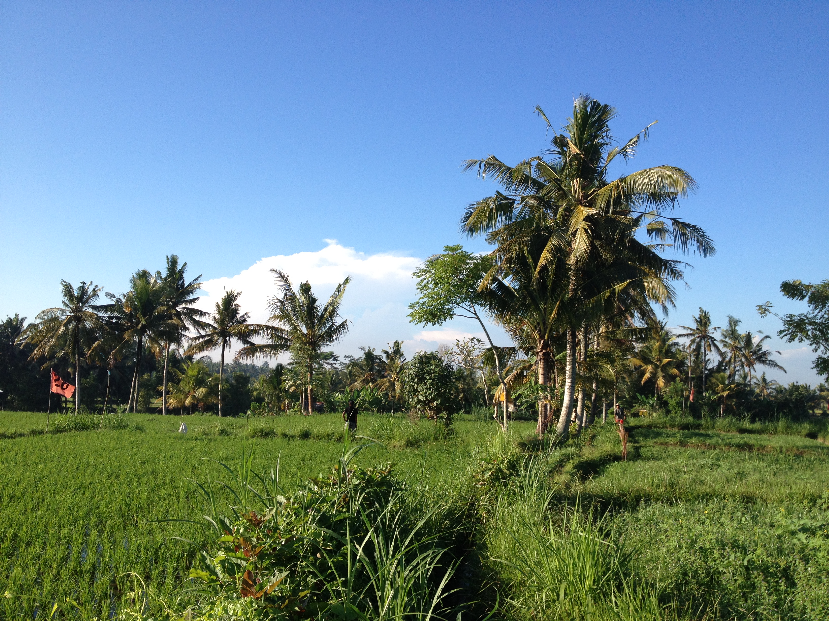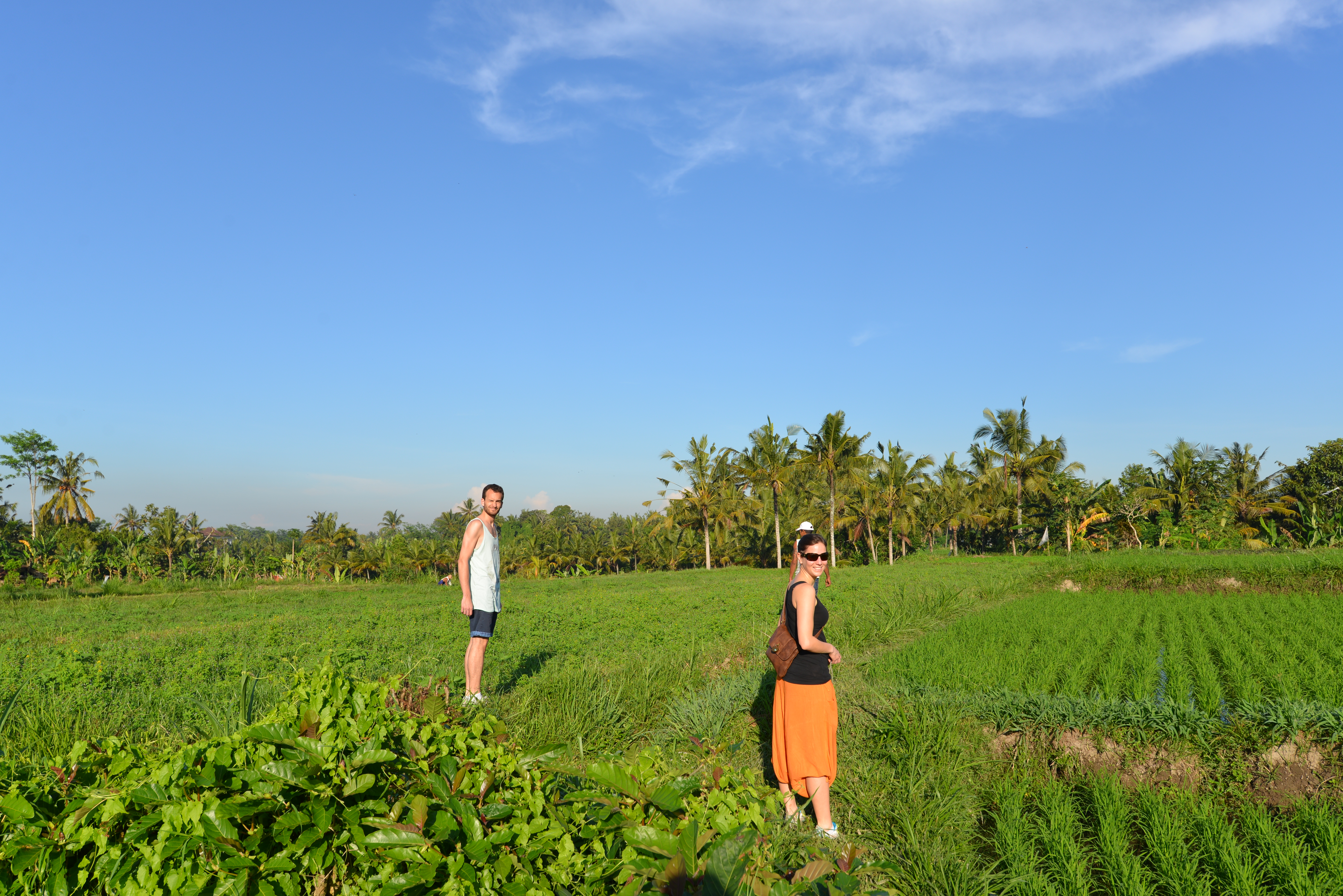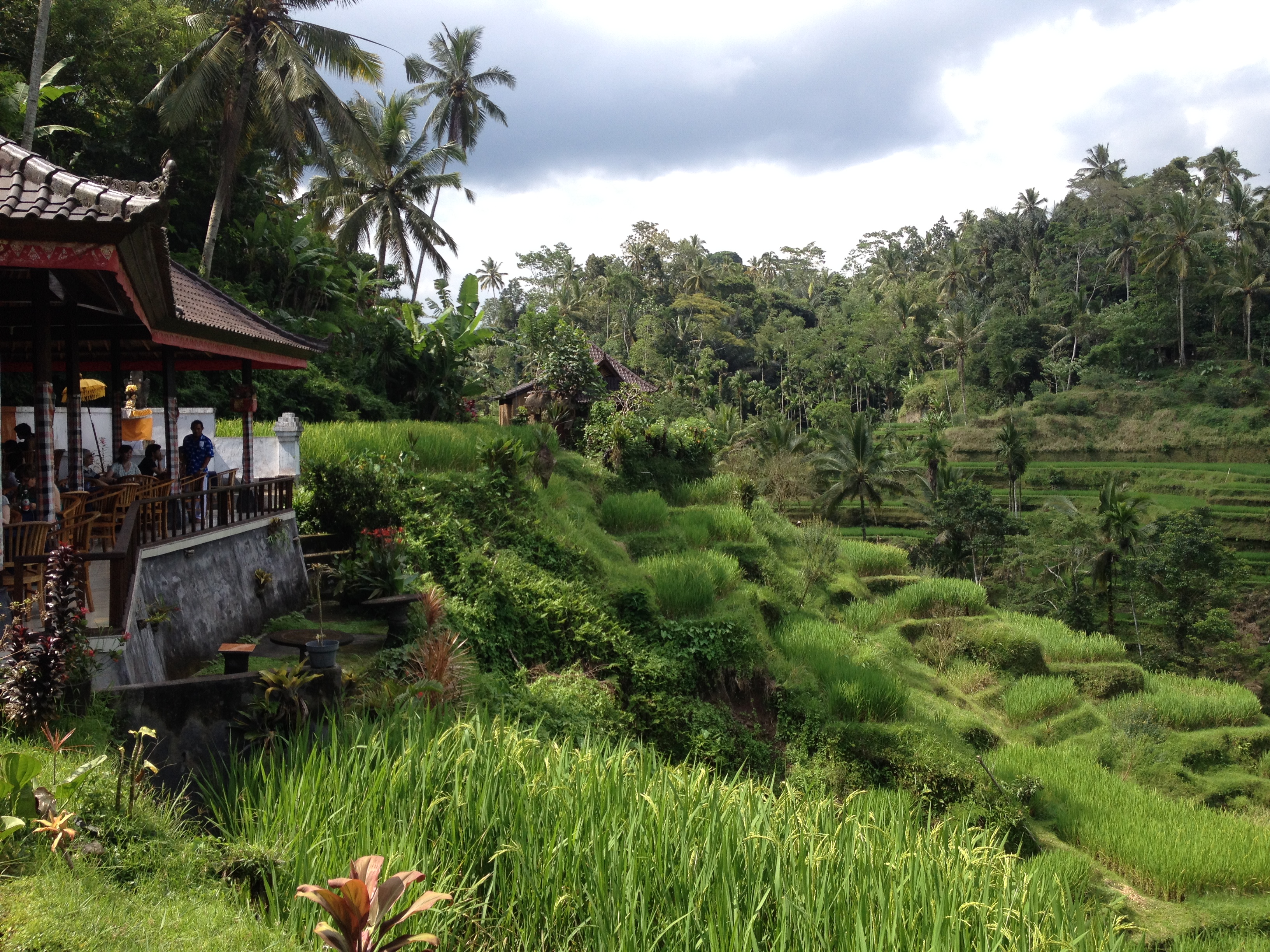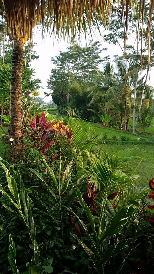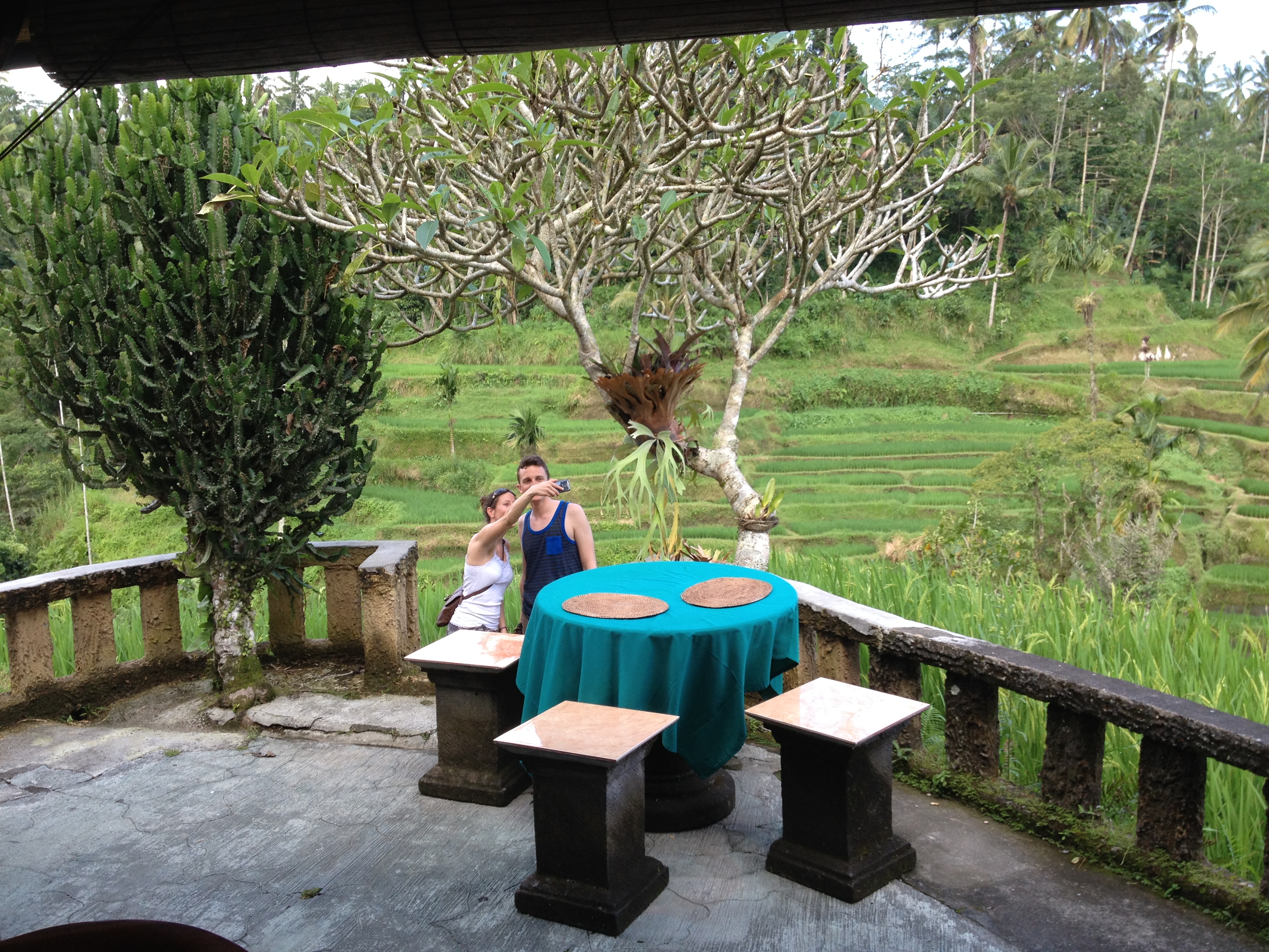 Il nous dépose au plein milieu de nulle part au Karsa Kafe, un petit bijou de charme avec des salons sur pilotis où nous mangeons face aux fleurs, aux palmiers, aux rizières et toujours avec le chant des coqs. Des brochettes satay, du nasi goreng, des spring rolls aux sauces des plus parfumées et exquises, avec des jus frais joliment servis – et le tout pour deux ou trois francs par personne (prix plus impressionnant en rupiahs vu qu’un franc suisse équivaut à 13’000 rupiahs).