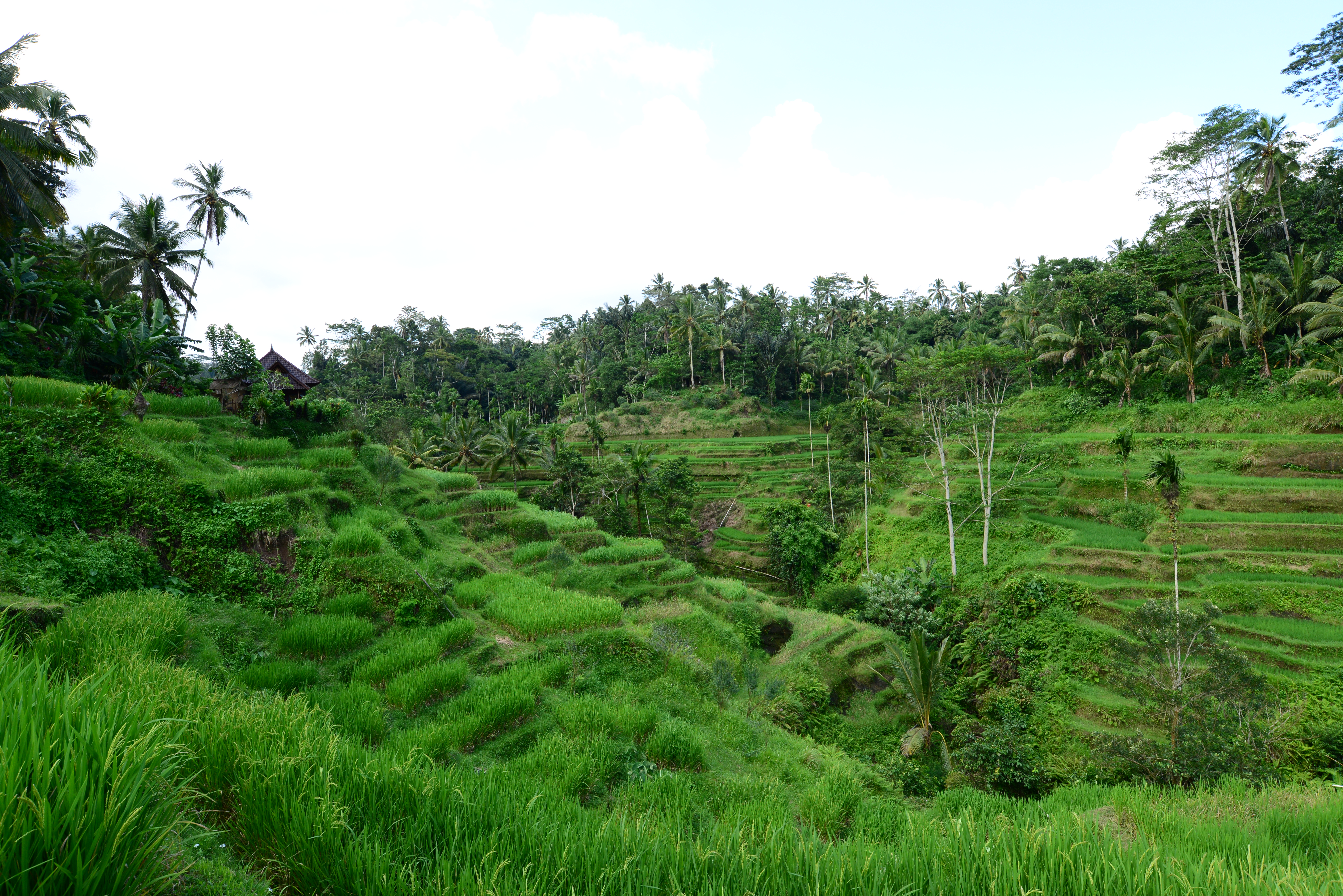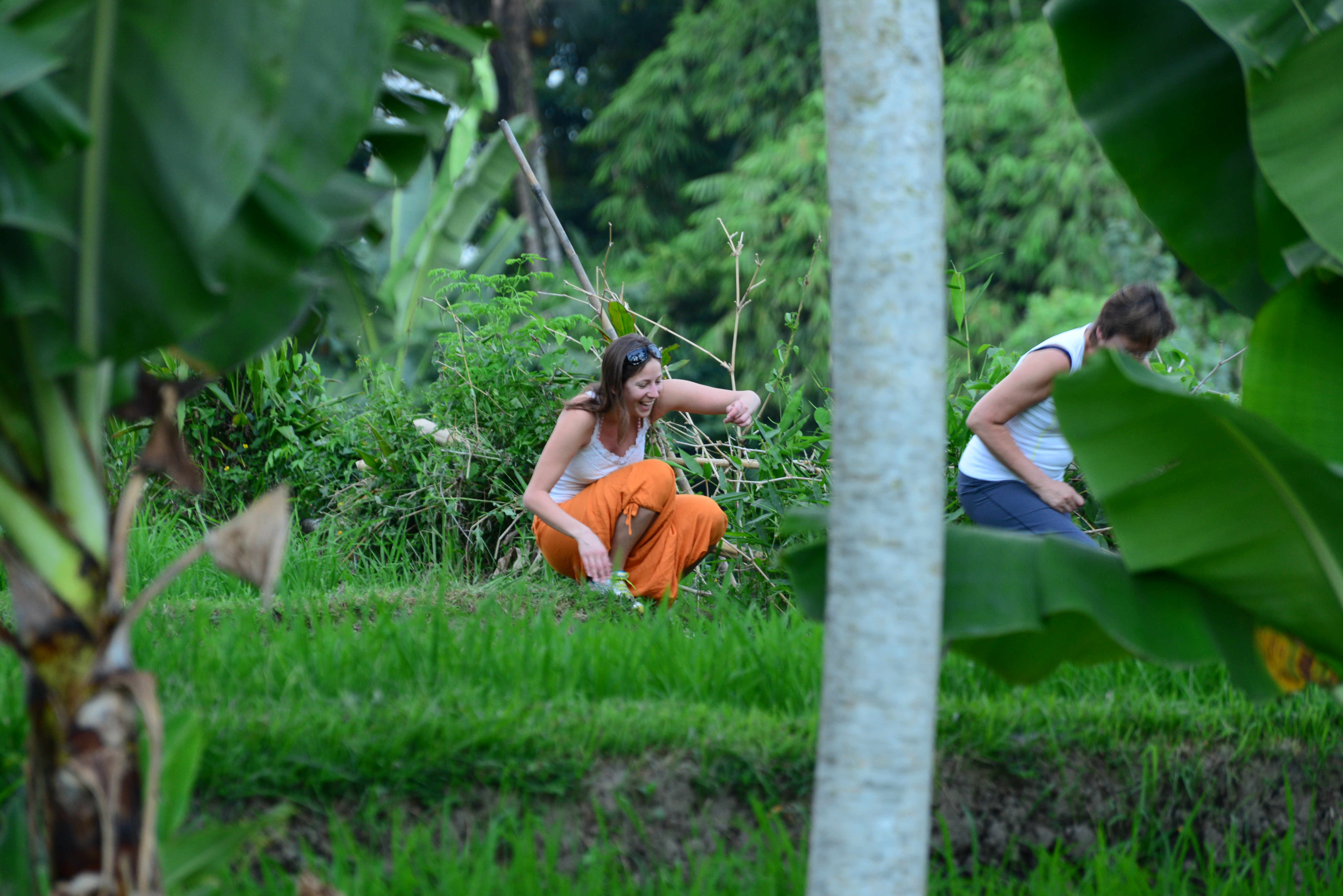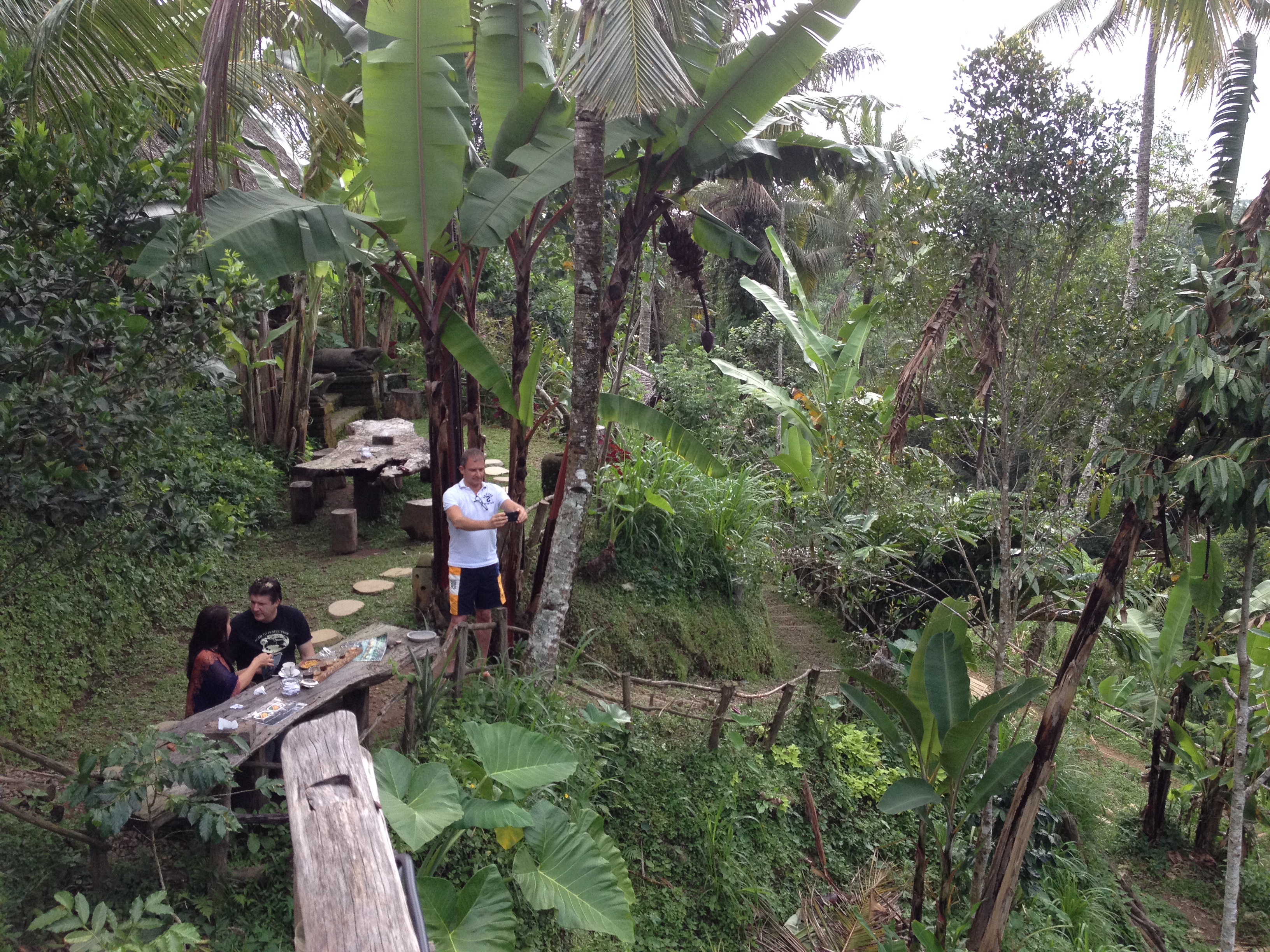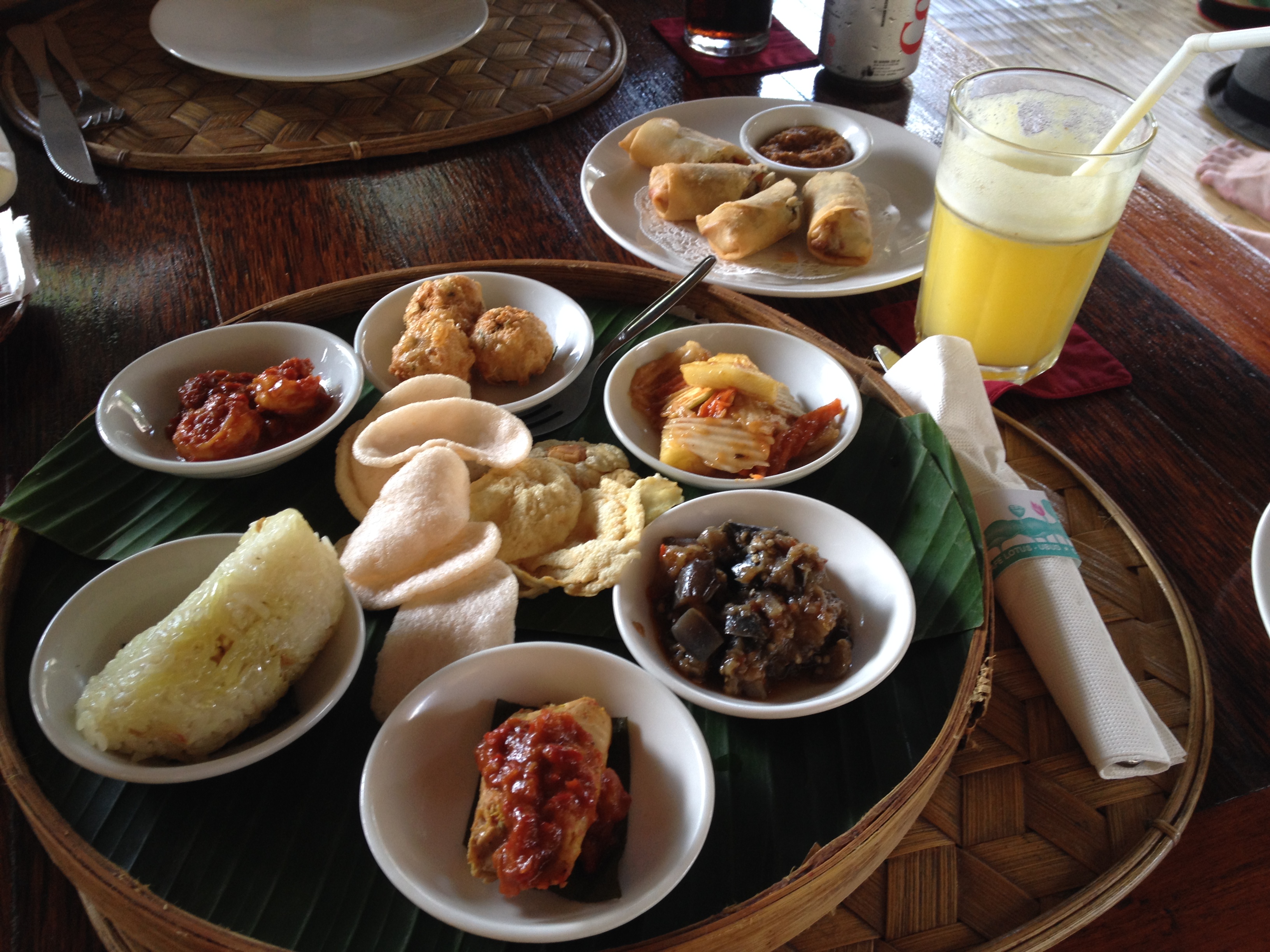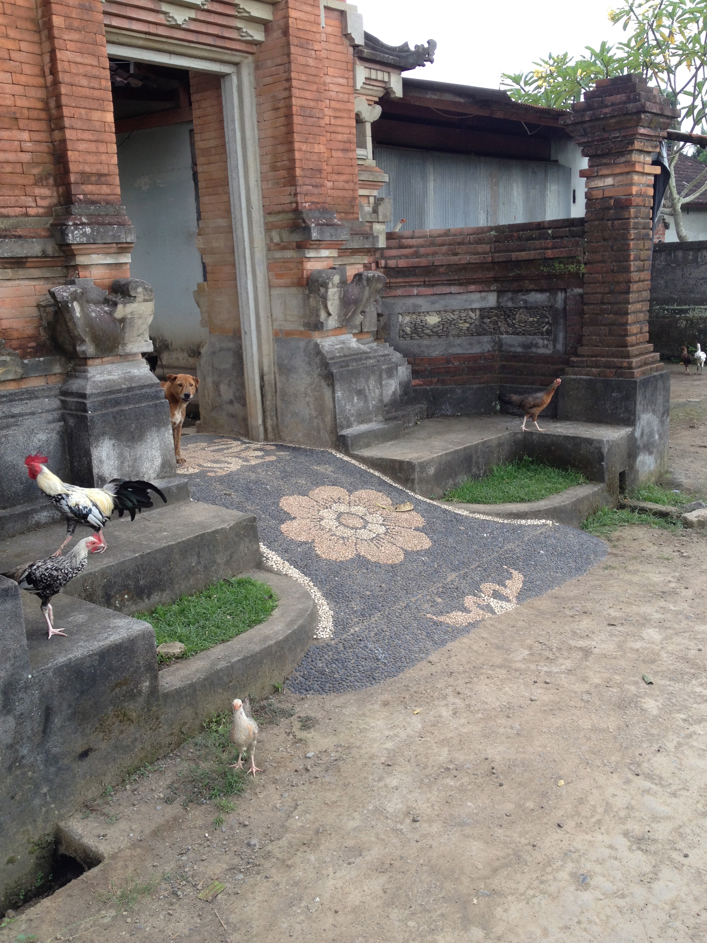 Il nous dépose au plein milieu de nulle part au Karsa Kafe, un petit bijou de charme avec des salons sur pilotis où nous mangeons face aux fleurs, aux palmiers, aux rizières et toujours avec le chant des coqs. Des brochettes satay, du nasi goreng, des spring rolls aux sauces des plus parfumées et exquises, avec des jus frais joliment servis – et le tout pour deux ou trois francs par personne (prix plus impressionnant en rupiahs vu qu’un franc suisse équivaut à 13’000 rupiahs).