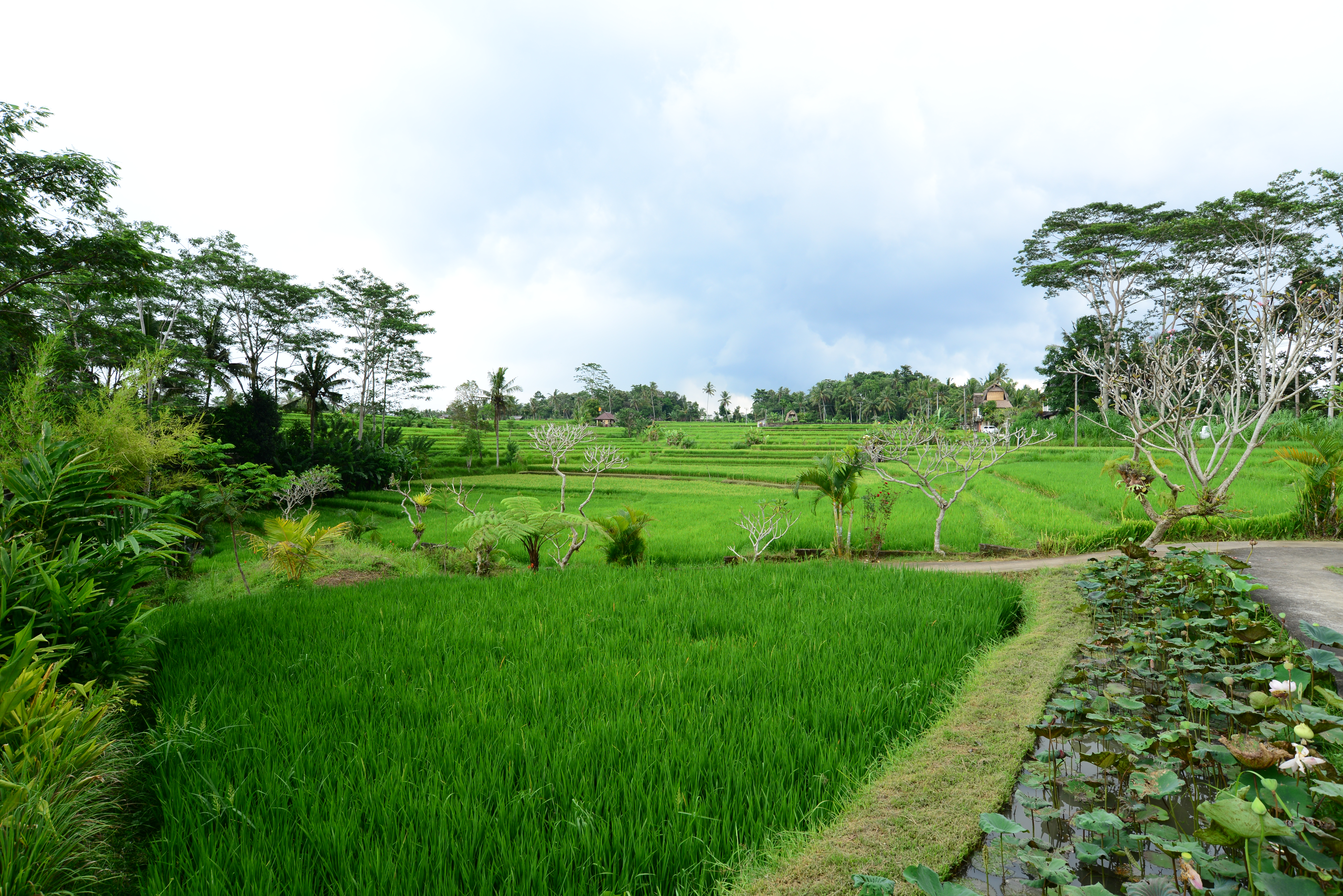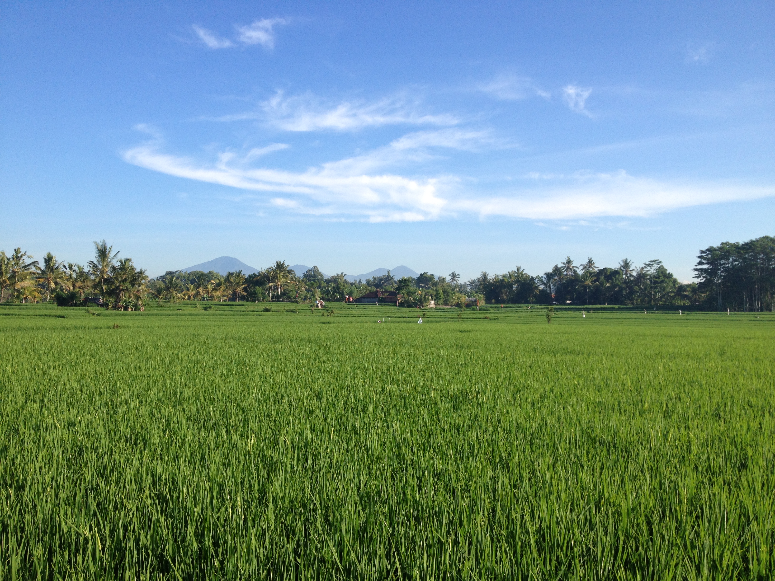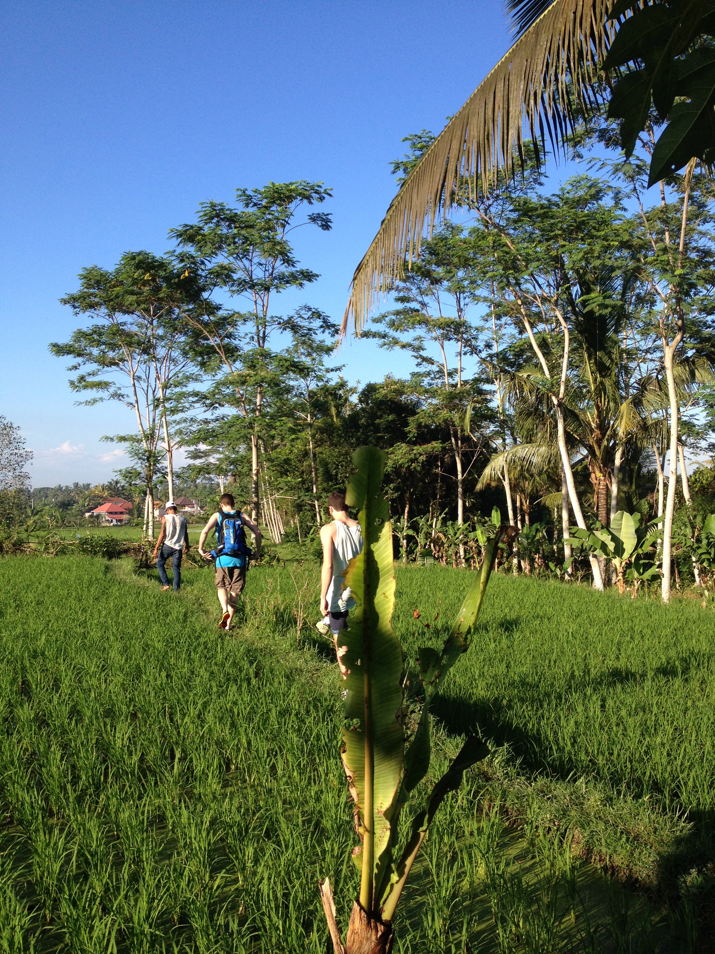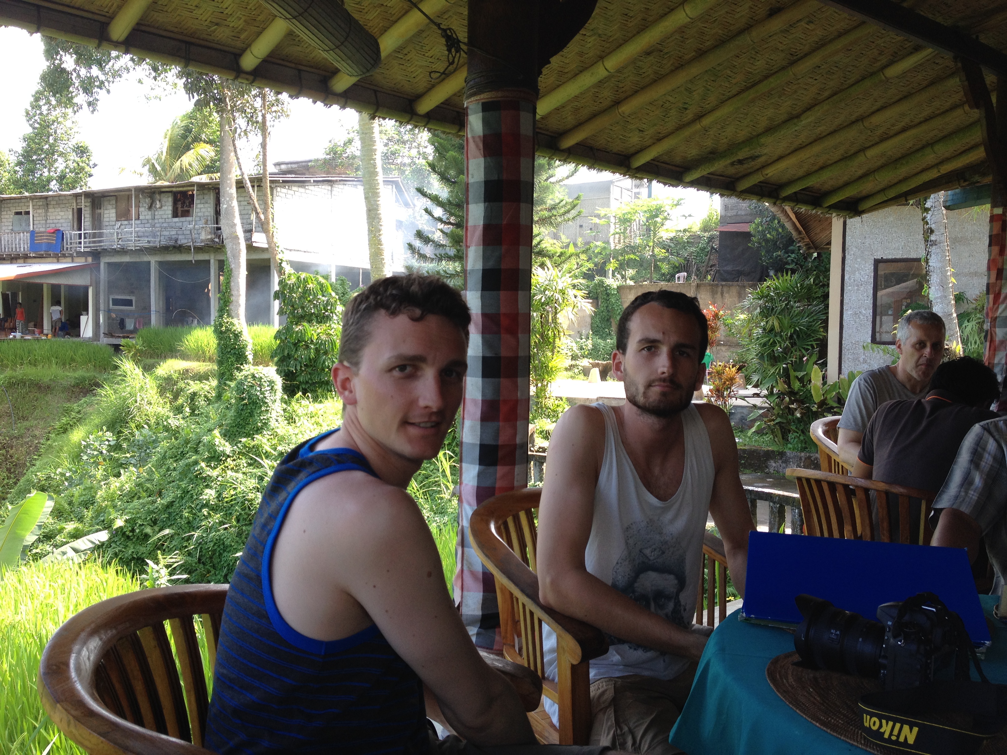 Il nous dépose au plein milieu de nulle part au Karsa Kafe, un petit bijou de charme avec des salons sur pilotis où nous mangeons face aux fleurs, aux palmiers, aux rizières et toujours avec le chant des coqs. Des brochettes satay, du nasi goreng, des spring rolls aux sauces des plus parfumées et exquises, avec des jus frais joliment servis – et le tout pour deux ou trois francs par personne (prix plus impressionnant en rupiahs vu qu’un franc suisse équivaut à 13’000 rupiahs).