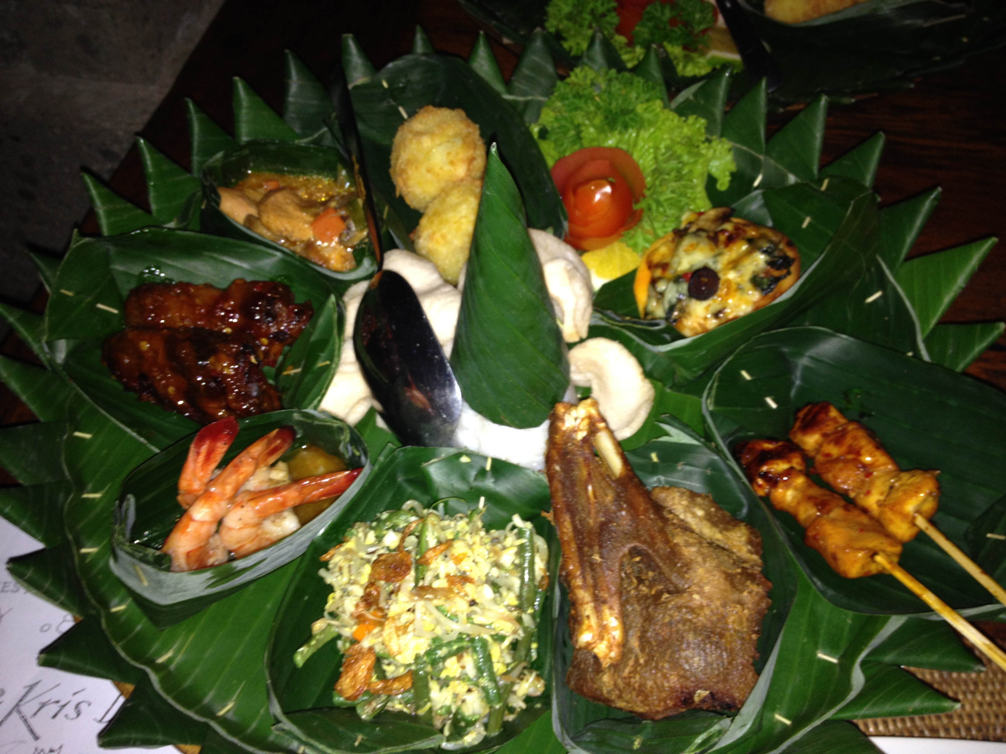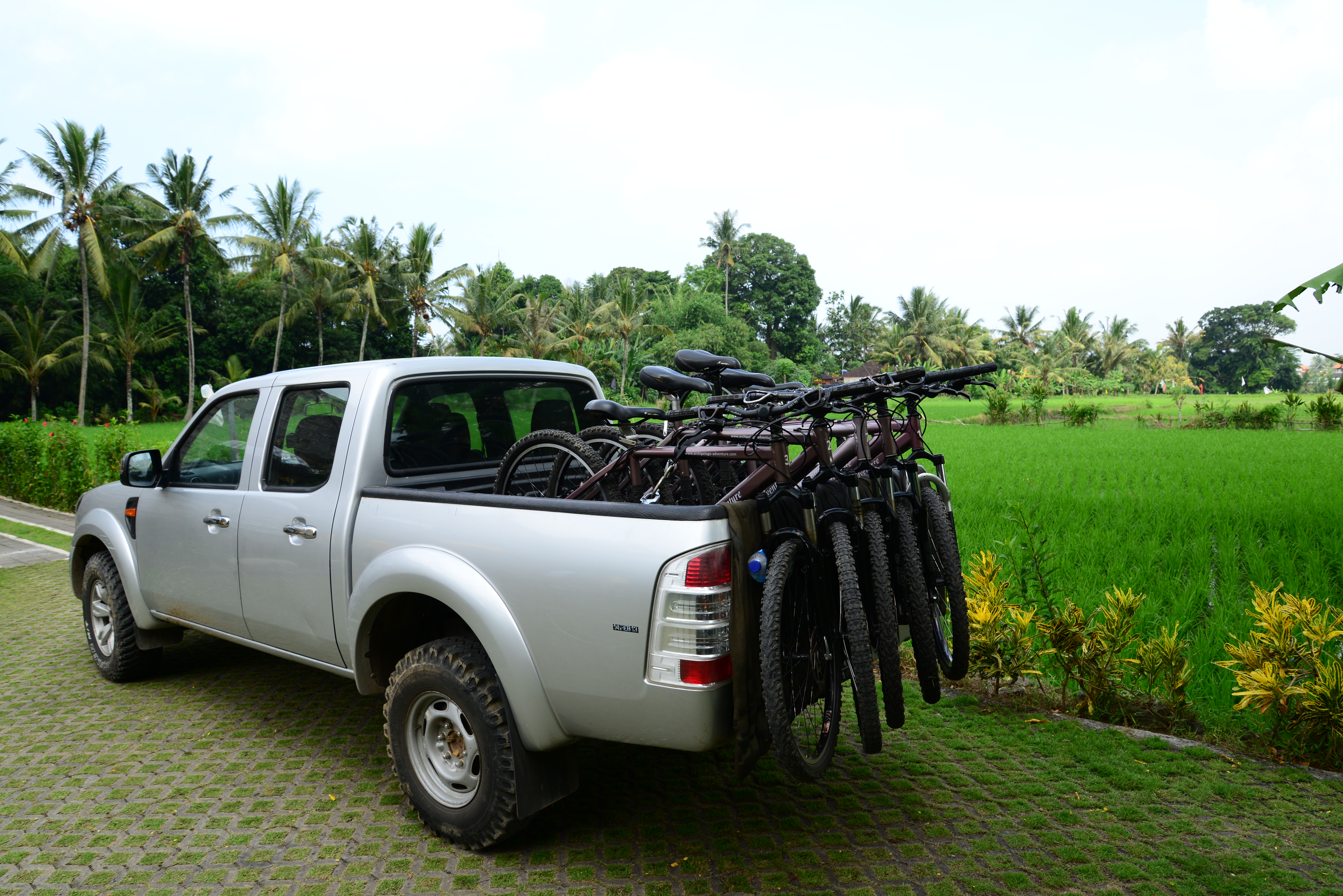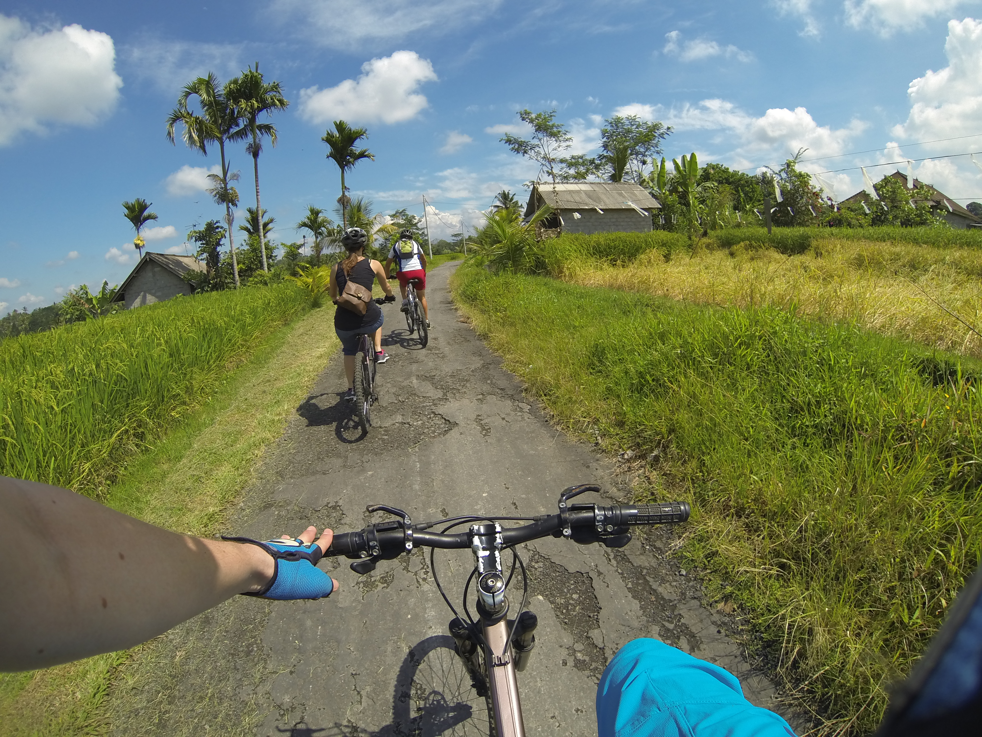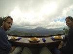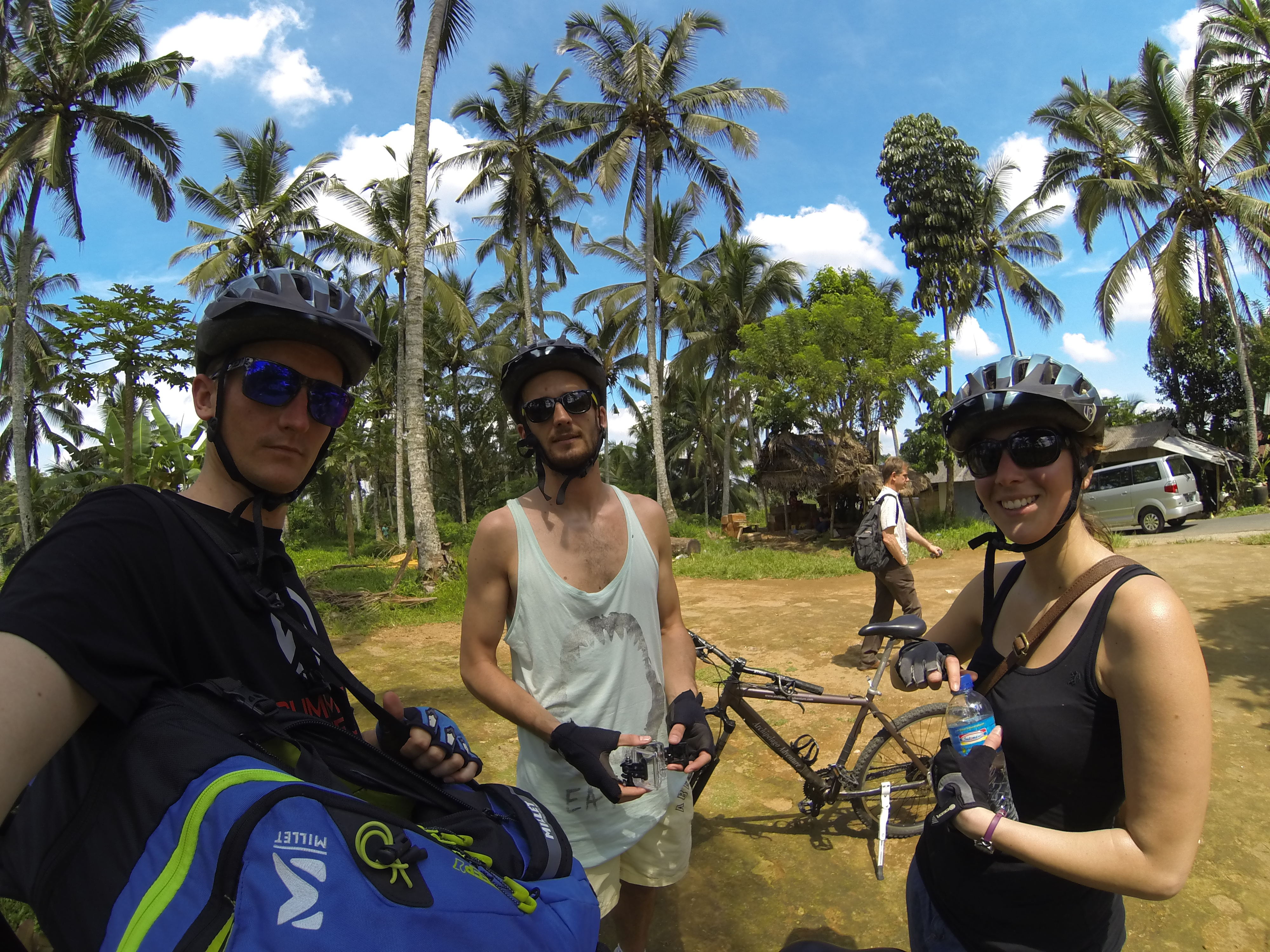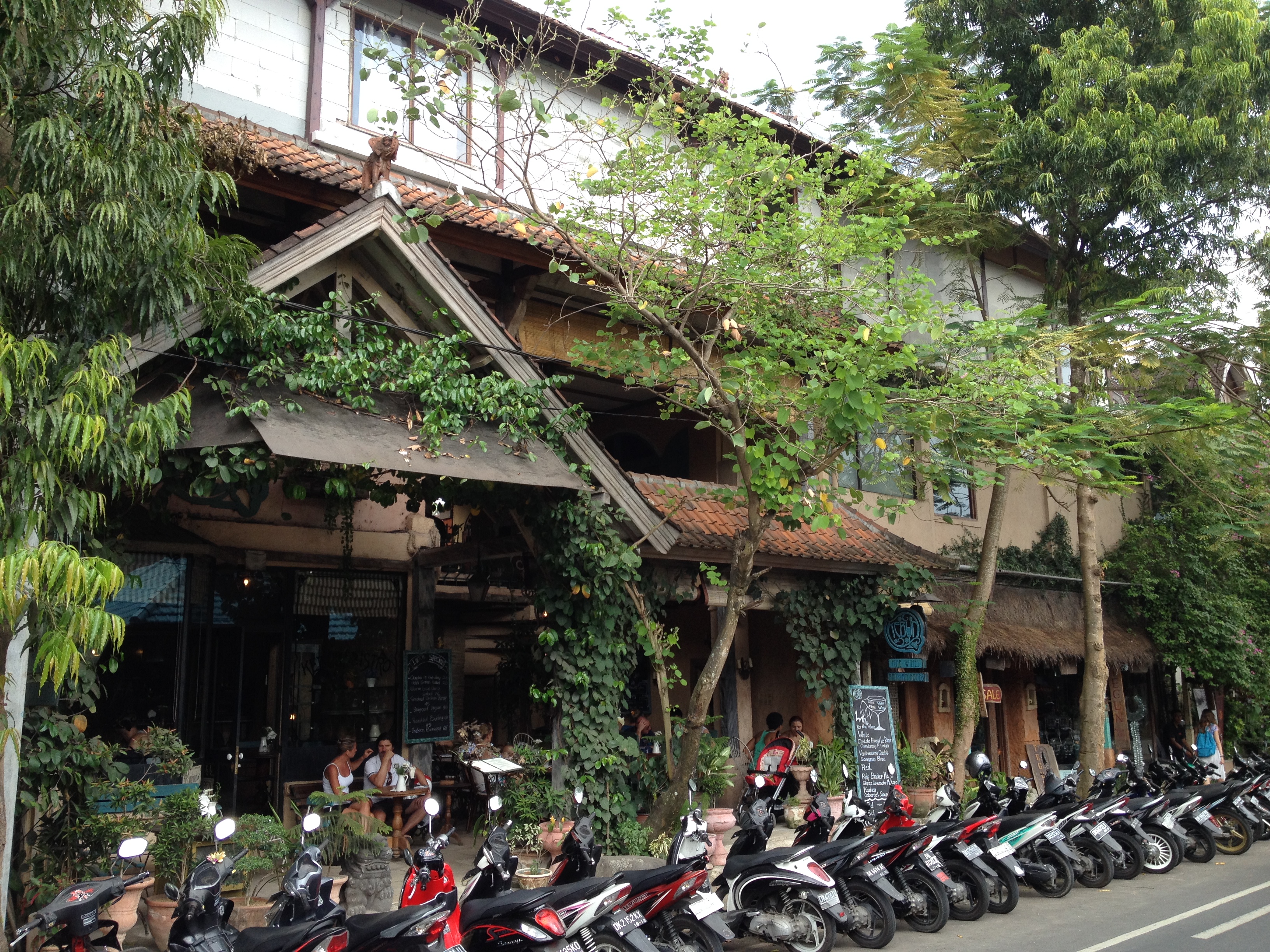 Il nous dépose au plein milieu de nulle part au Karsa Kafe, un petit bijou de charme avec des salons sur pilotis où nous mangeons face aux fleurs, aux palmiers, aux rizières et toujours avec le chant des coqs. Des brochettes satay, du nasi goreng, des spring rolls aux sauces des plus parfumées et exquises, avec des jus frais joliment servis – et le tout pour deux ou trois francs par personne (prix plus impressionnant en rupiahs vu qu’un franc suisse équivaut à 13’000 rupiahs).