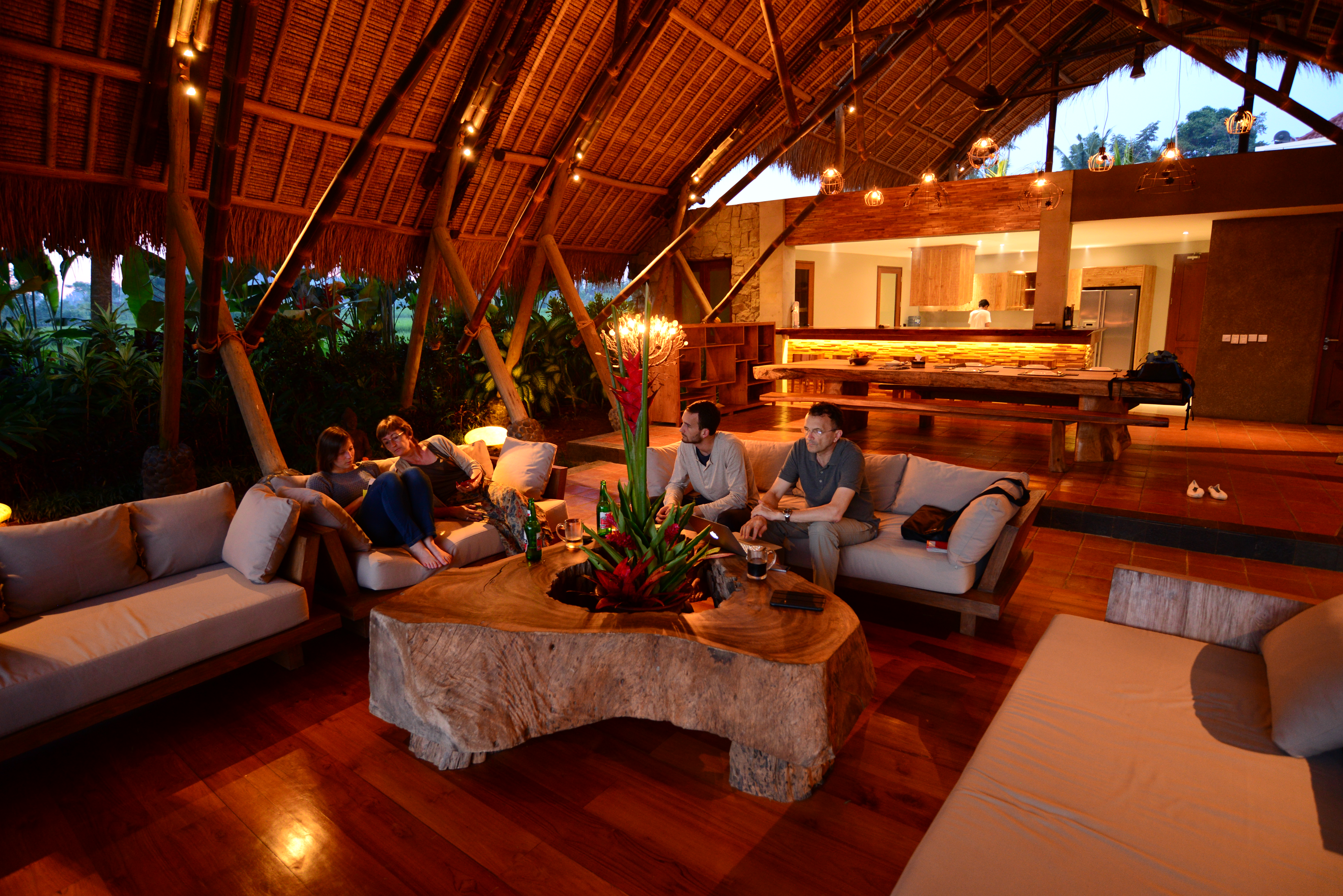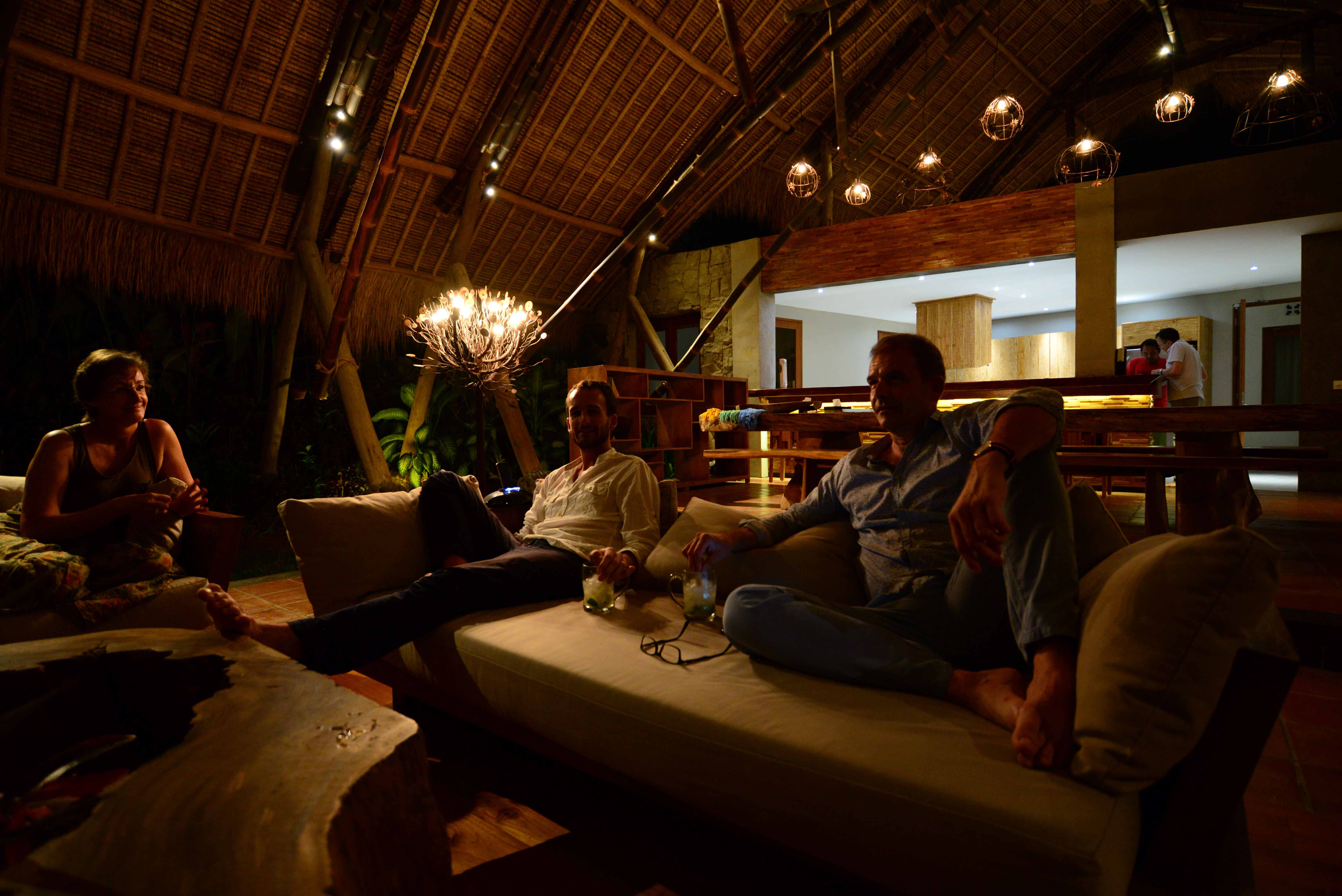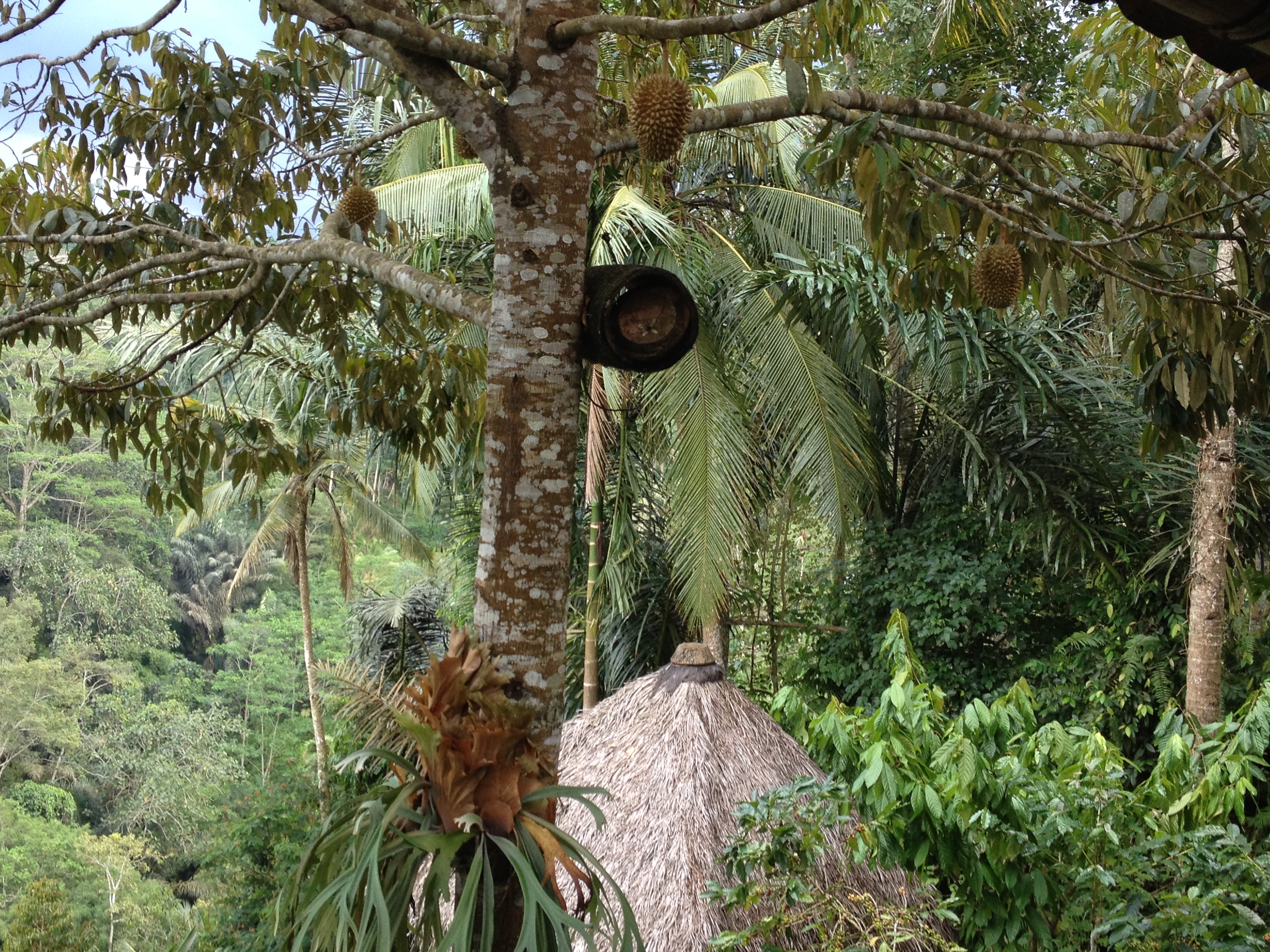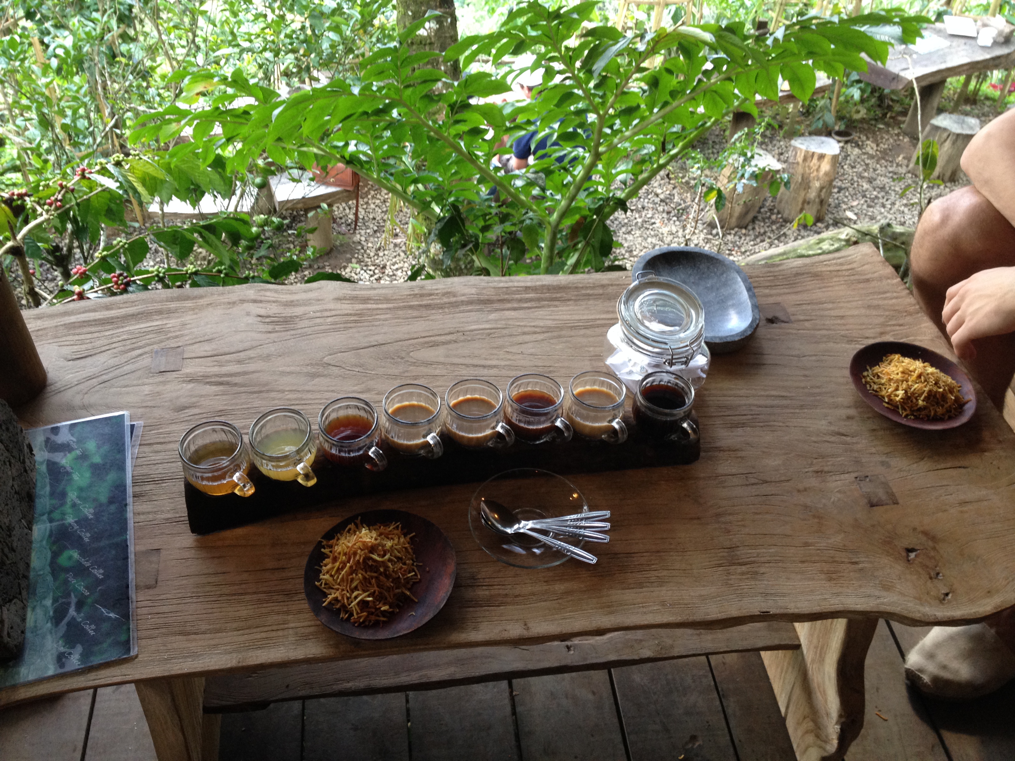 Il nous dépose au plein milieu de nulle part au Karsa Kafe, un petit bijou de charme avec des salons sur pilotis où nous mangeons face aux fleurs, aux palmiers, aux rizières et toujours avec le chant des coqs. Des brochettes satay, du nasi goreng, des spring rolls aux sauces des plus parfumées et exquises, avec des jus frais joliment servis – et le tout pour deux ou trois francs par personne (prix plus impressionnant en rupiahs vu qu’un franc suisse équivaut à 13’000 rupiahs).