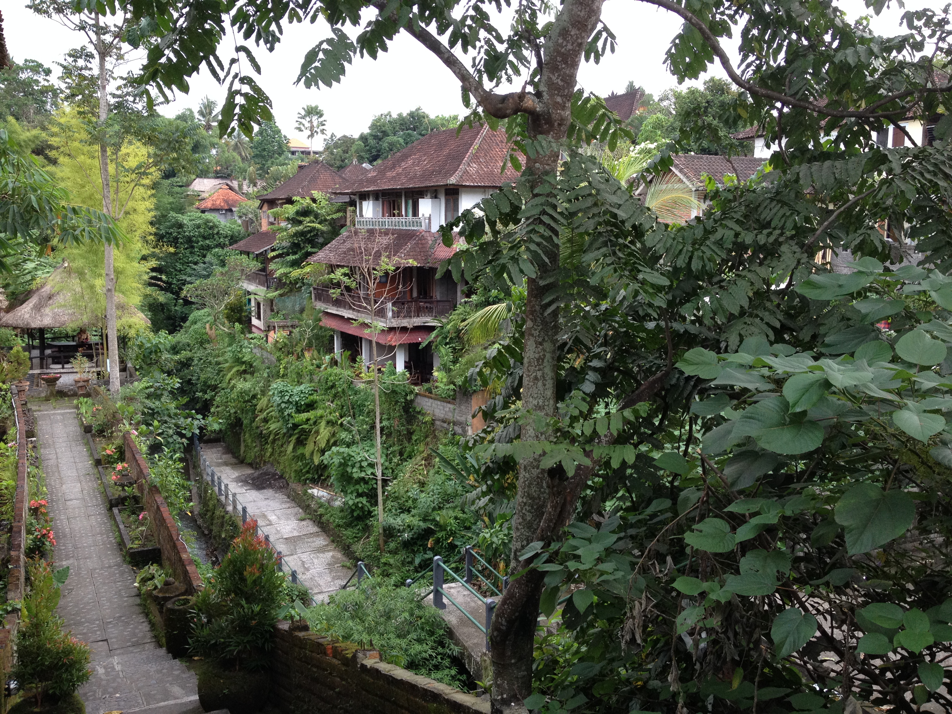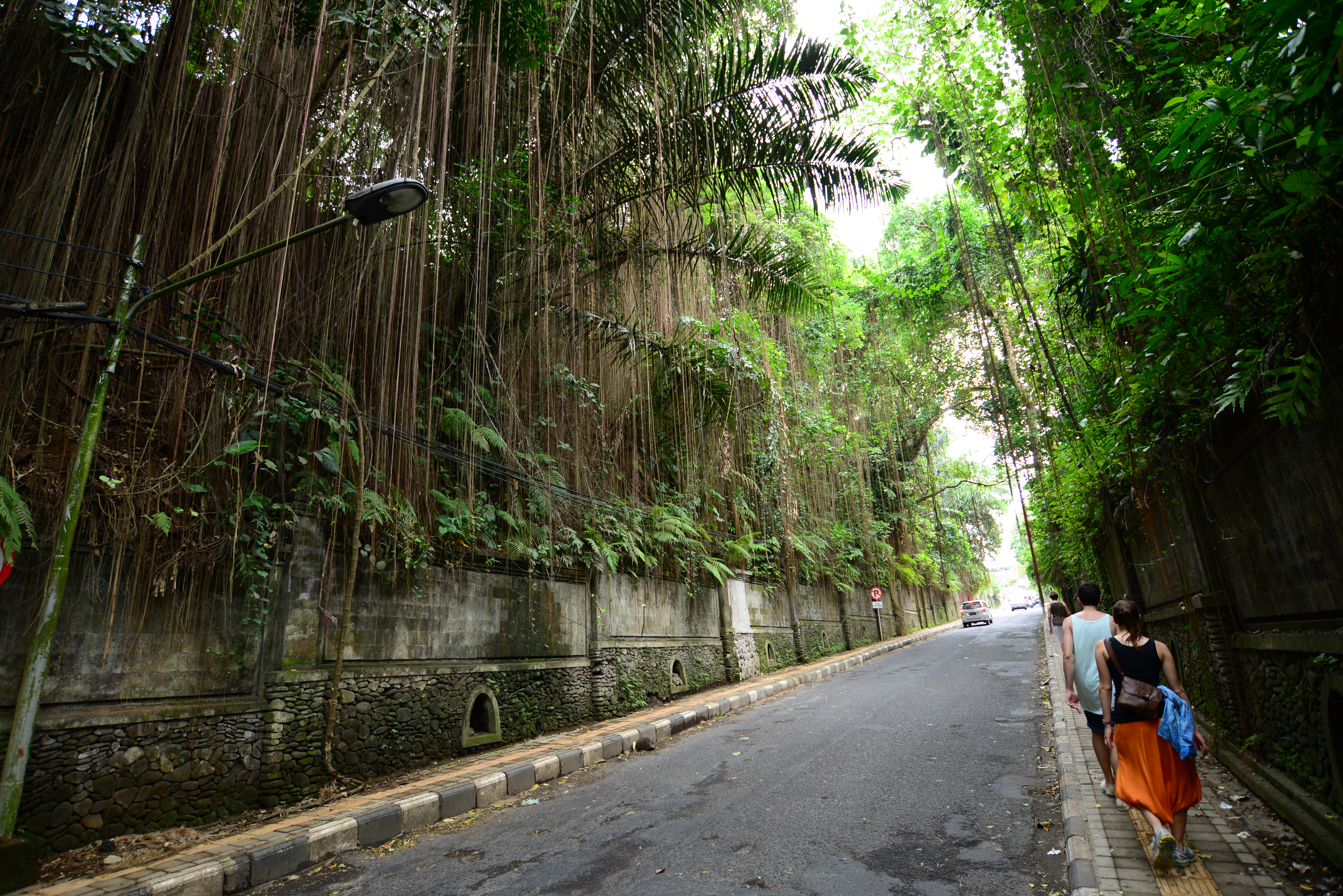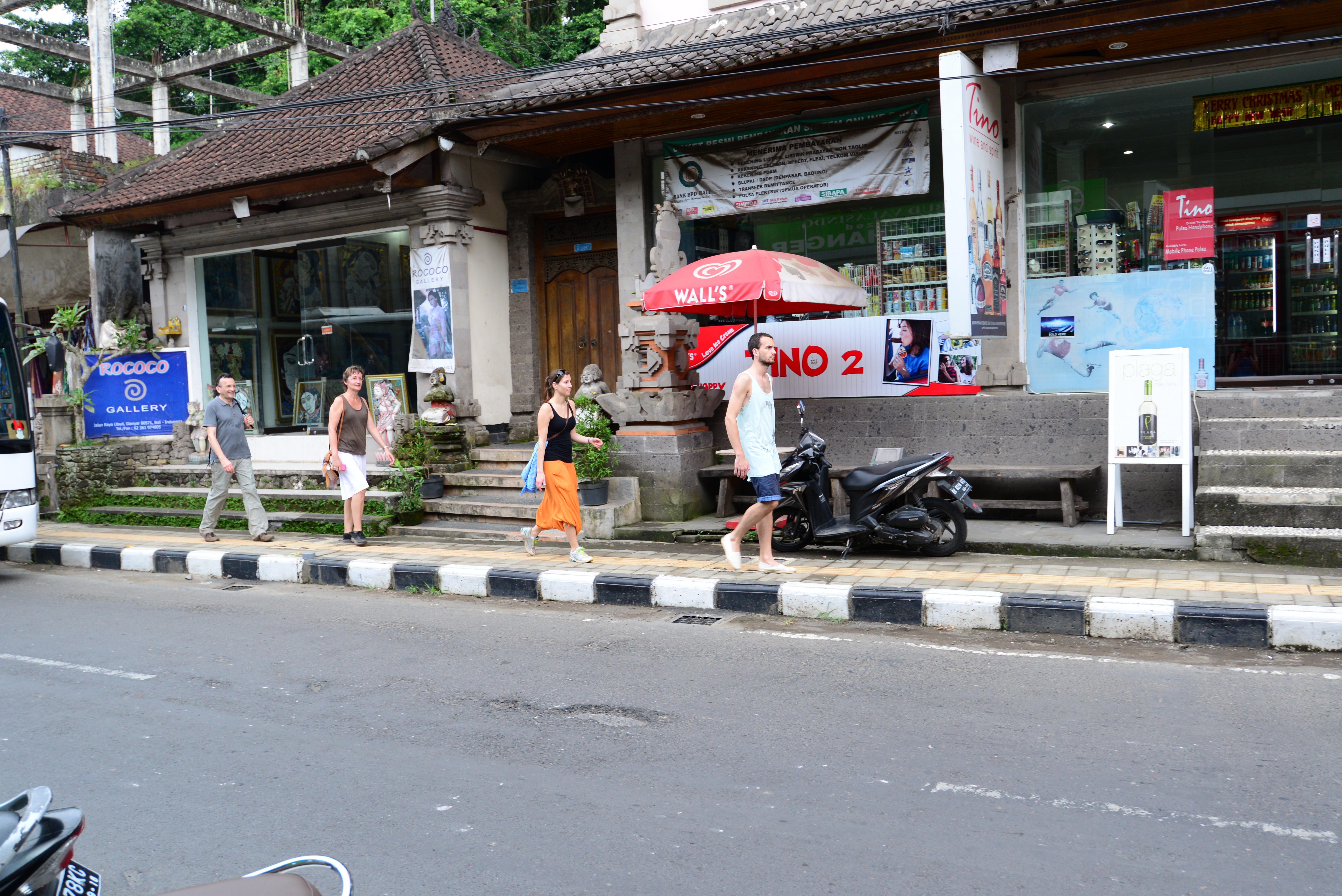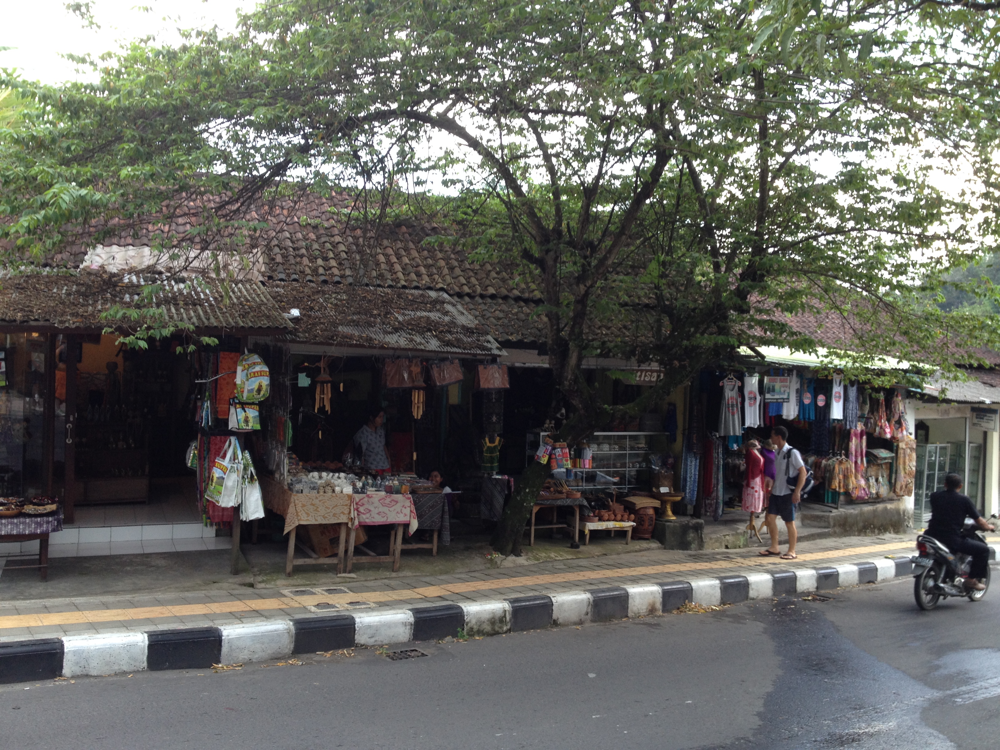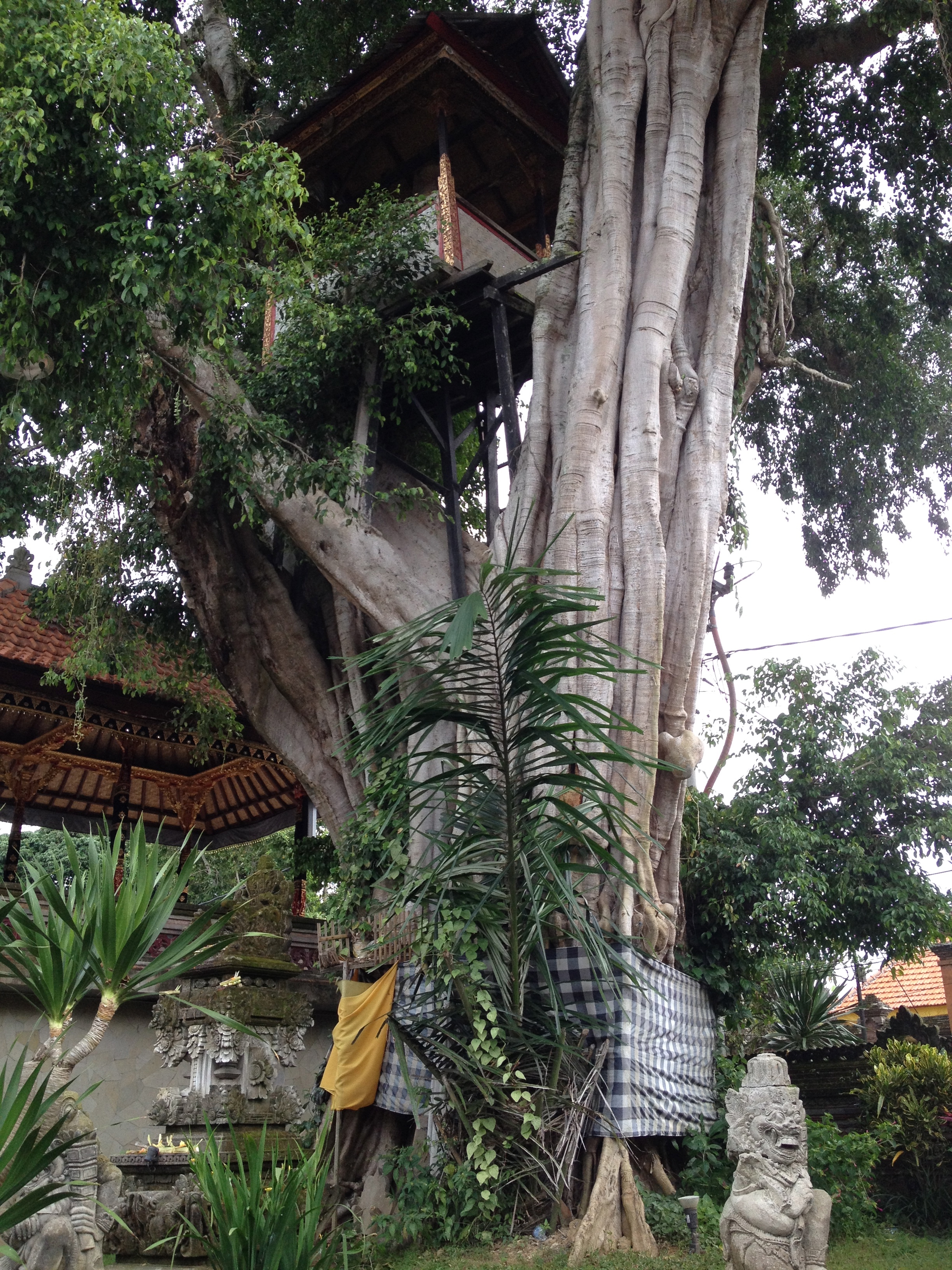 La promenade des crêtes nous redescend vers Ibah puis Ubud, en admirant de petites galeries d’artisans (tableaux, œufs en bois peints, etc), des cafés et des spas pour massages, des mini-marts, des resorts ou guest houses encore plus isolés que notre villa et surtout plus immergés dans la forêt vierge. Il s’agit bien d’une crête qui surplombe de part et d’autre une profonde vallée à la végétation luxuriante avec parfois un petit hameau, un hôtel luxueux, de superbes villas. Le chemin sillonne entre des champs de hautes herbes, les alang alang qui servent de couverture sur les toits et ensuite le sentier pique sur un temple en restauration ; un vieux pont de pierre enjambe la rivière et un énorme Banyan Tree avec ses lianes par centaines nous signale l’arrivée sur la rue principale, le retour à la civilisation. Et ici, doit-on partir à droite ou à gauche? Il y a autant de boutiques d’un côté que de l’autre, où se situe Ubud? Mais comme par surprise, Made surgit dans notre champ de vision. Ils sont ainsi les guides en Asie que nous avons connus en Thaïlande, au Cambodge, toujours là au bon moment au bon endroit!