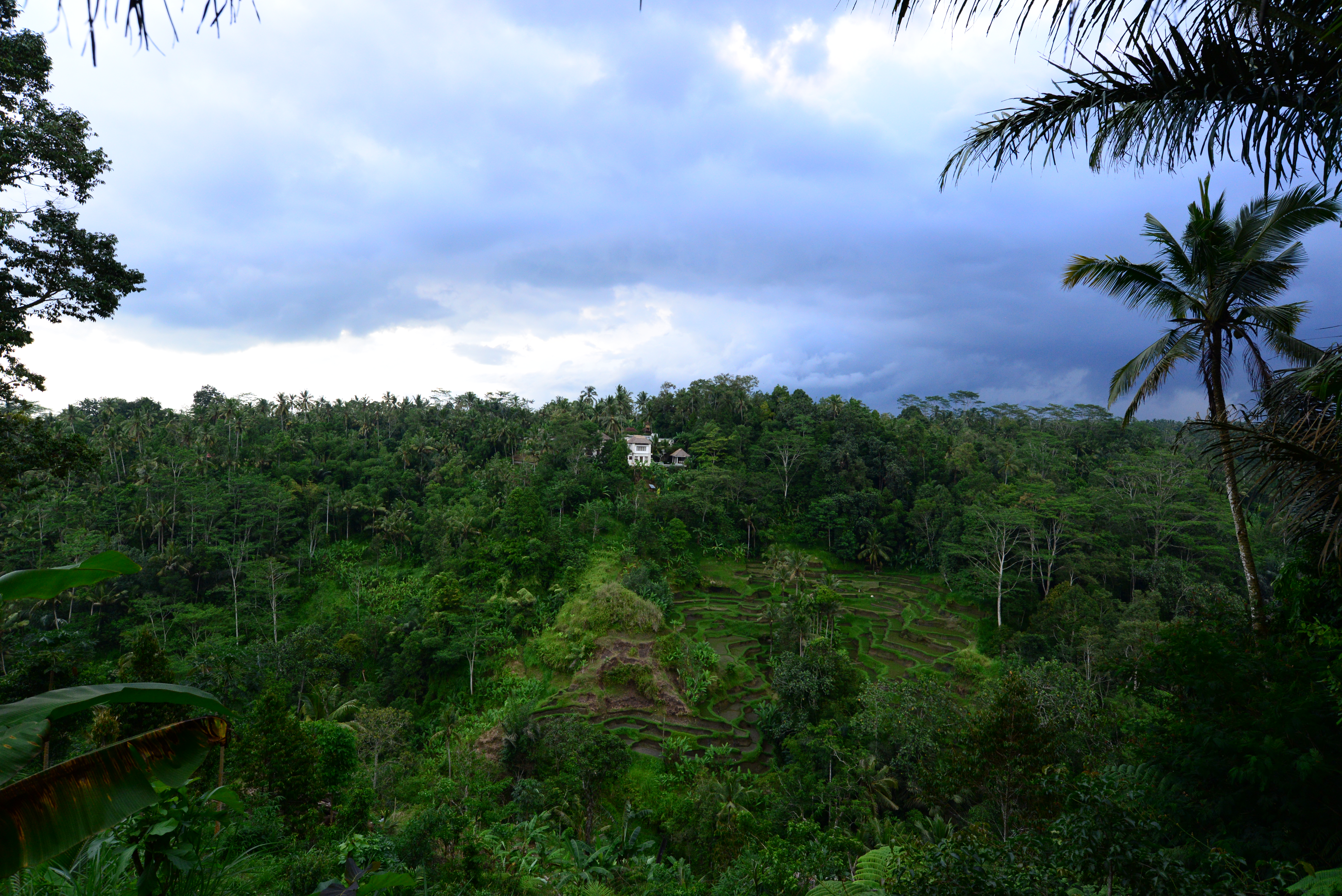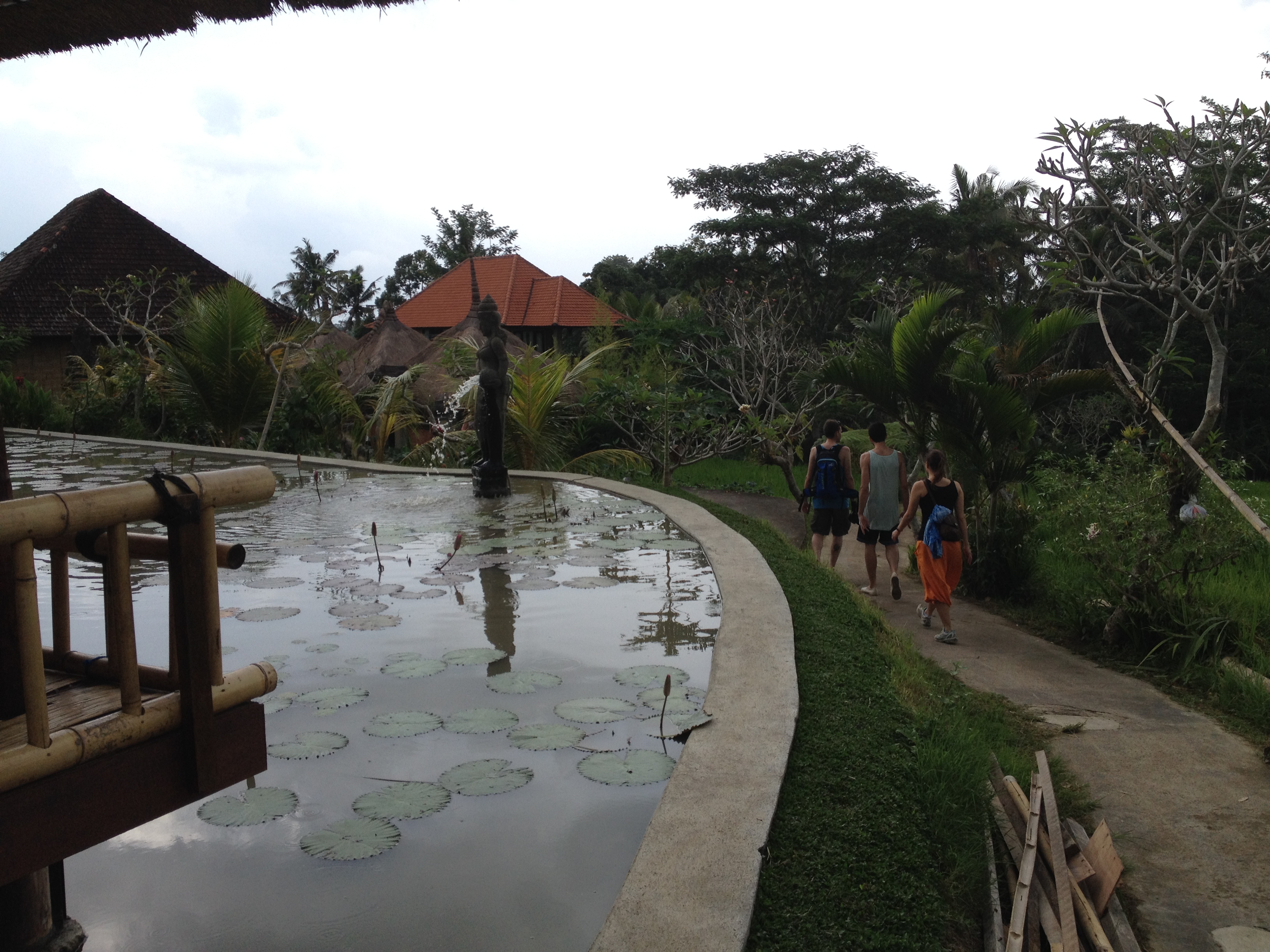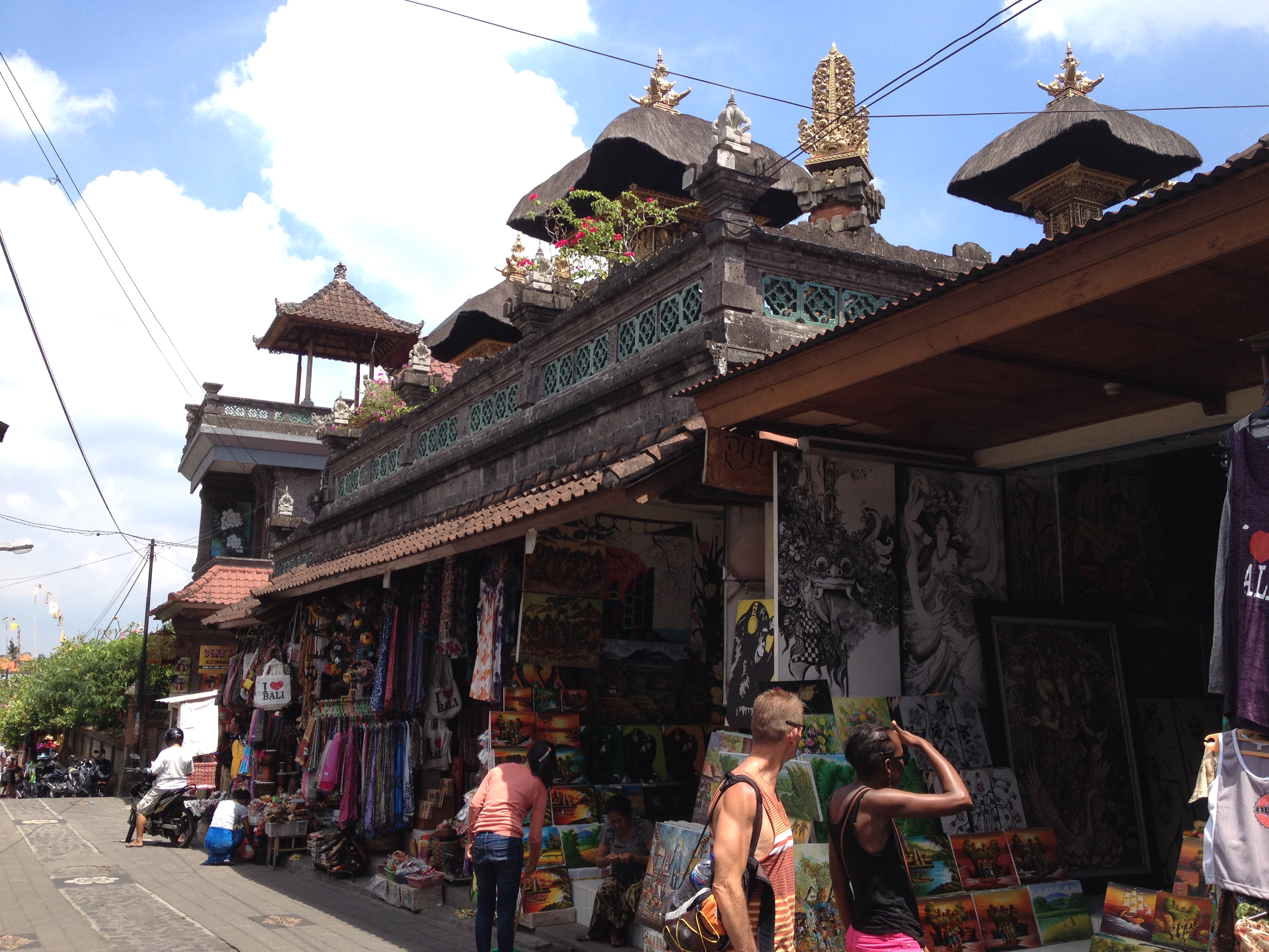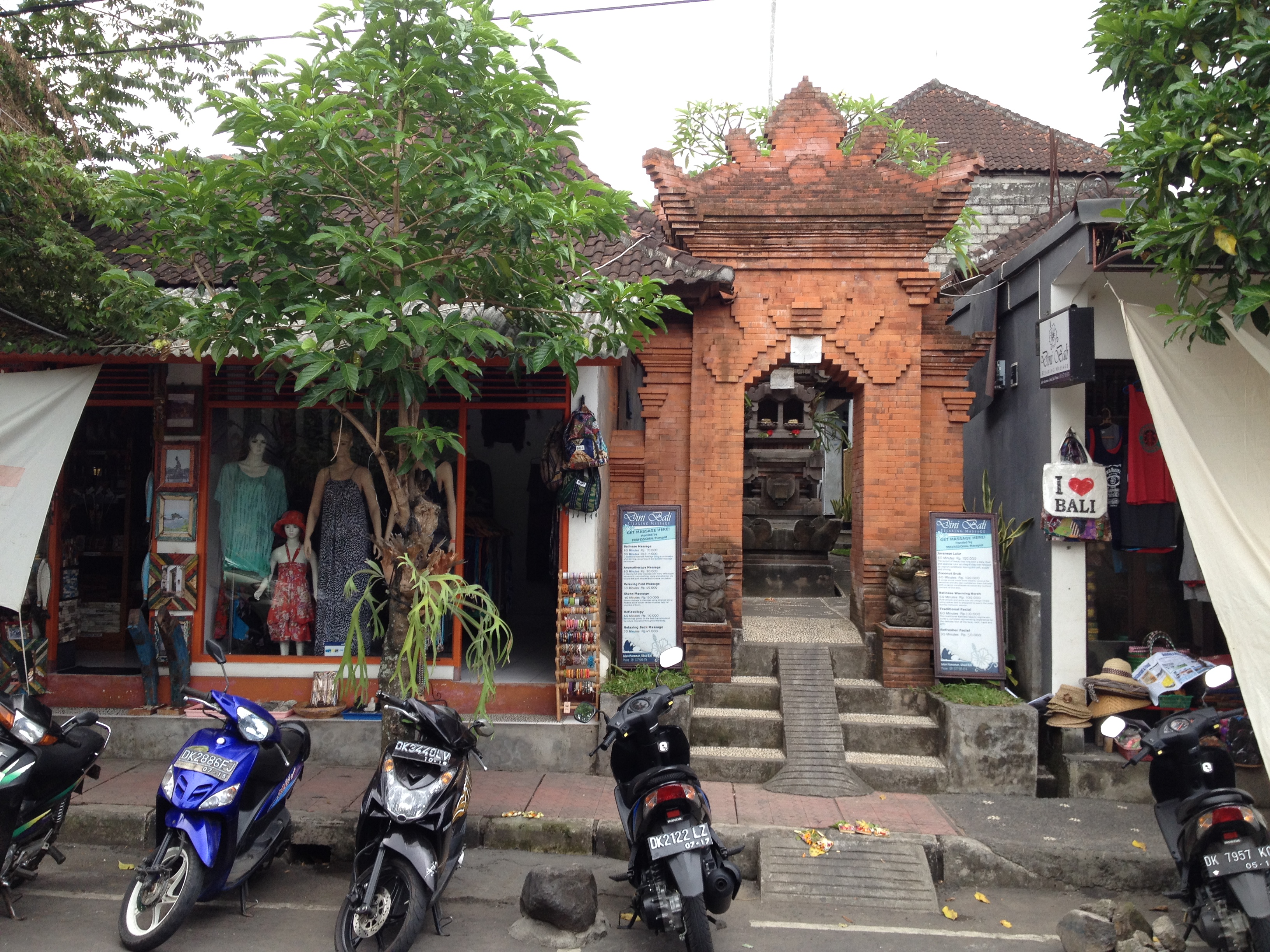 La promenade des crêtes nous redescend vers Ibah puis Ubud, en admirant de petites galeries d’artisans (tableaux, œufs en bois peints, etc), des cafés et des spas pour massages, des mini-marts, des resorts ou guest houses encore plus isolés que notre villa et surtout plus immergés dans la forêt vierge. Il s’agit bien d’une crête qui surplombe de part et d’autre une profonde vallée à la végétation luxuriante avec parfois un petit hameau, un hôtel luxueux, de superbes villas. Le chemin sillonne entre des champs de hautes herbes, les alang alang qui servent de couverture sur les toits et ensuite le sentier pique sur un temple en restauration ; un vieux pont de pierre enjambe la rivière et un énorme Banyan Tree avec ses lianes par centaines nous signale l’arrivée sur la rue principale, le retour à la civilisation. Et ici, doit-on partir à droite ou à gauche? Il y a autant de boutiques d’un côté que de l’autre, où se situe Ubud? Mais comme par surprise, Made surgit dans notre champ de vision. Ils sont ainsi les guides en Asie que nous avons connus en Thaïlande, au Cambodge, toujours là au bon moment au bon endroit!