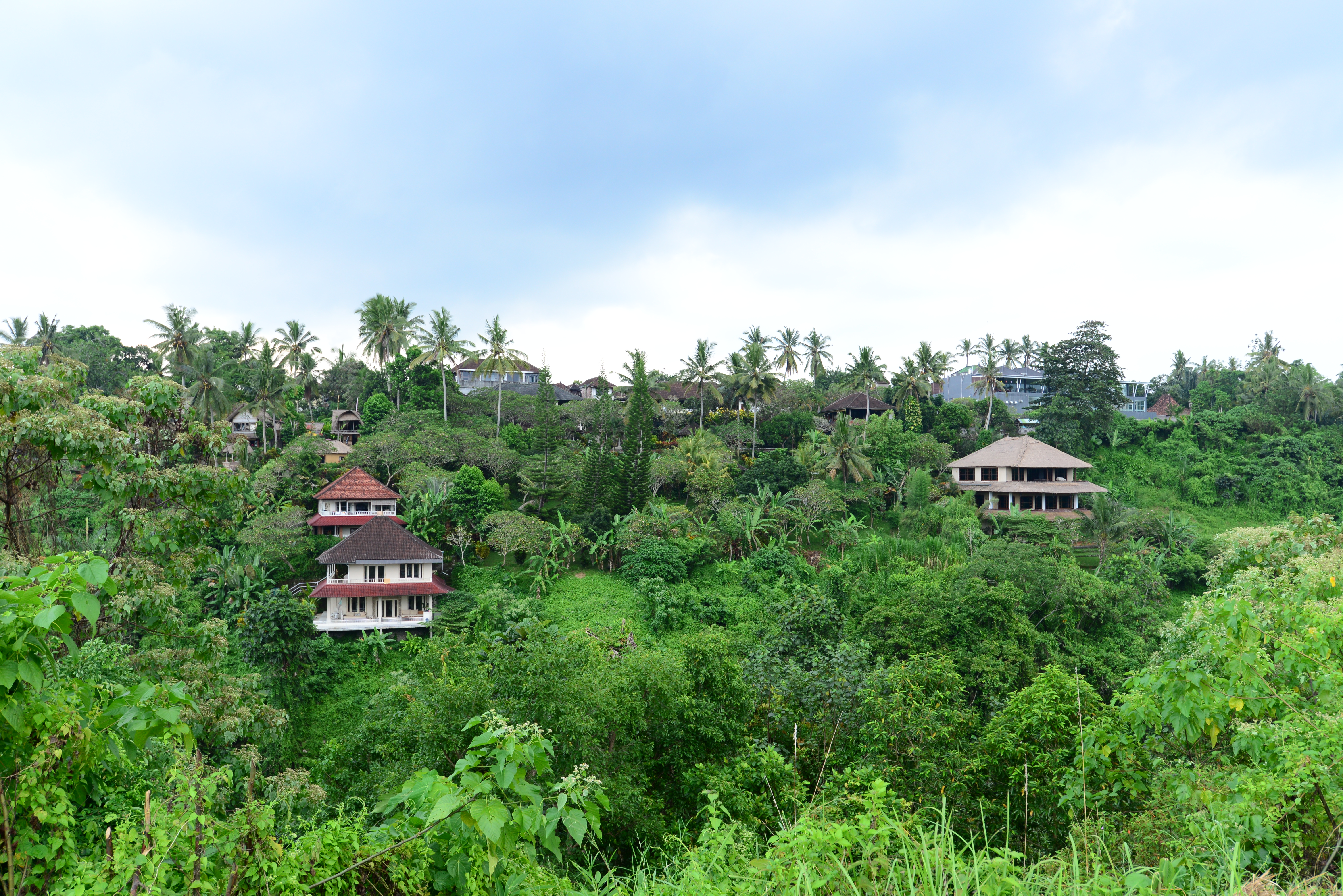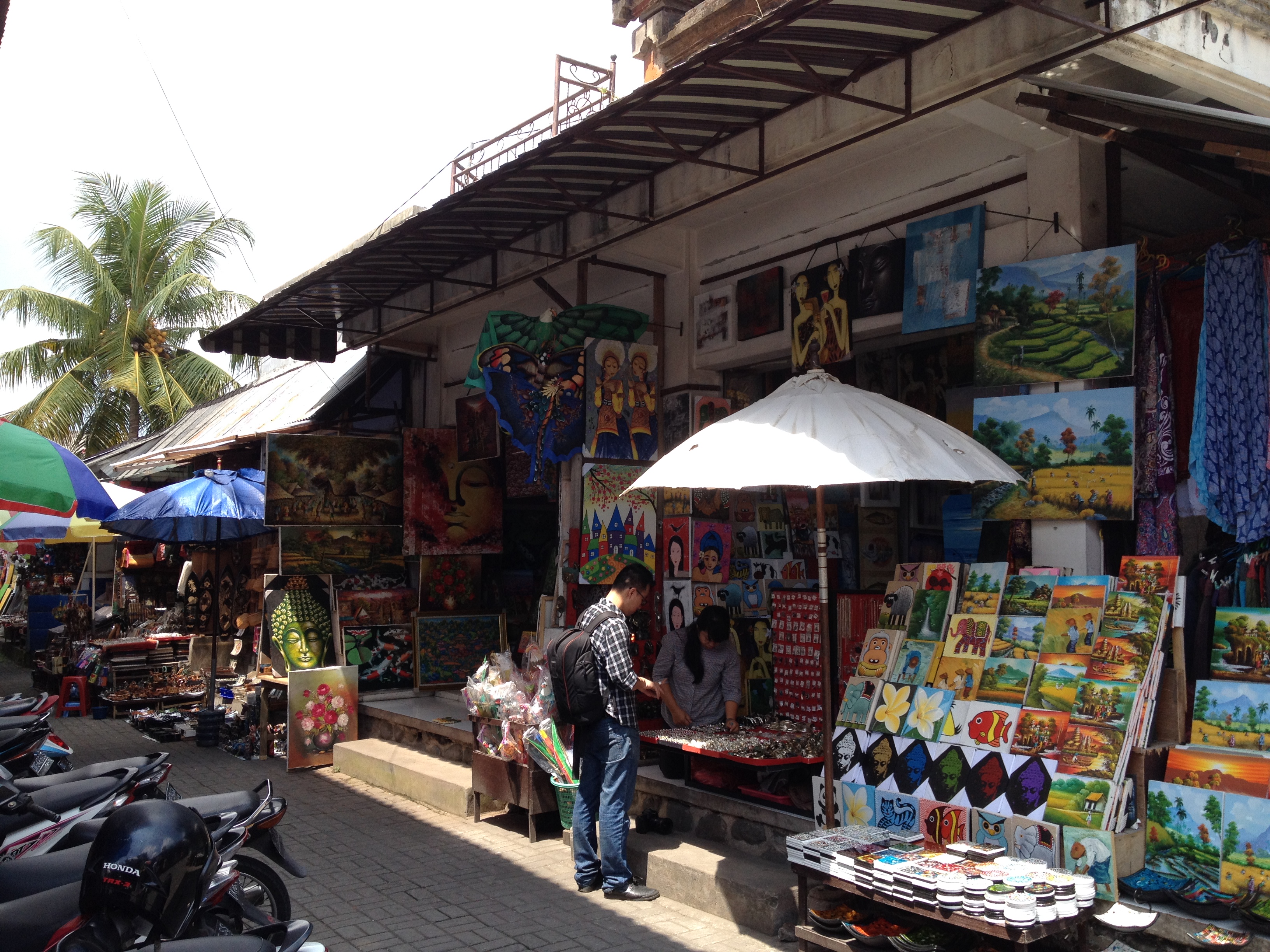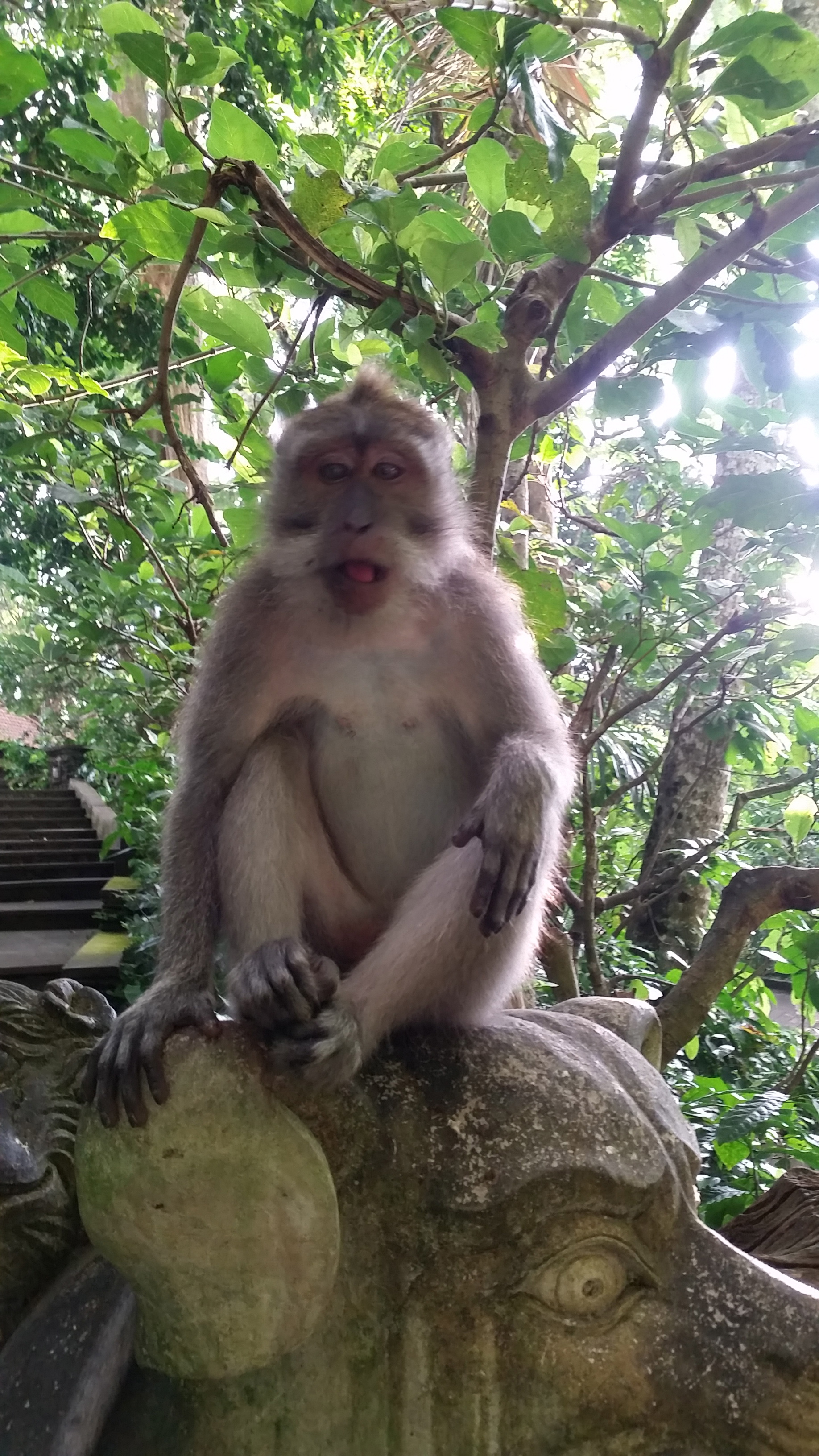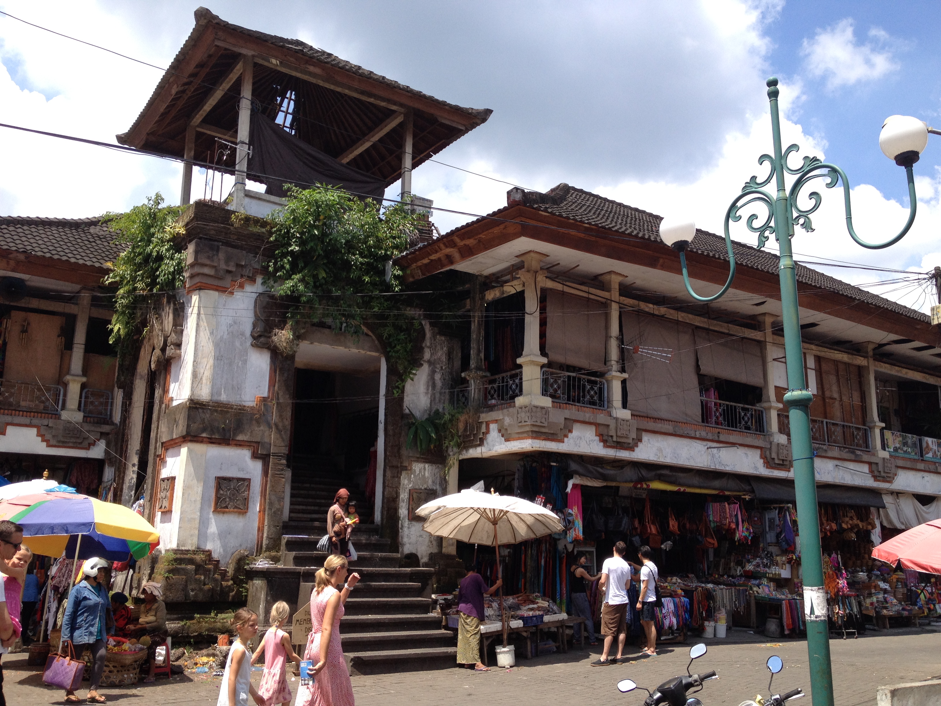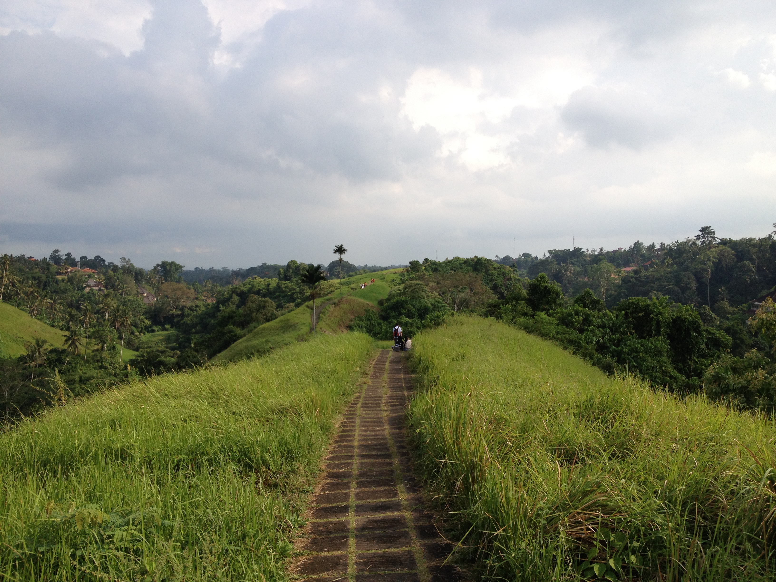 La promenade des crêtes nous redescend vers Ibah puis Ubud, en admirant de petites galeries d’artisans (tableaux, œufs en bois peints, etc), des cafés et des spas pour massages, des mini-marts, des resorts ou guest houses encore plus isolés que notre villa et surtout plus immergés dans la forêt vierge. Il s’agit bien d’une crête qui surplombe de part et d’autre une profonde vallée à la végétation luxuriante avec parfois un petit hameau, un hôtel luxueux, de superbes villas. Le chemin sillonne entre des champs de hautes herbes, les alang alang qui servent de couverture sur les toits et ensuite le sentier pique sur un temple en restauration ; un vieux pont de pierre enjambe la rivière et un énorme Banyan Tree avec ses lianes par centaines nous signale l’arrivée sur la rue principale, le retour à la civilisation. Et ici, doit-on partir à droite ou à gauche? Il y a autant de boutiques d’un côté que de l’autre, où se situe Ubud? Mais comme par surprise, Made surgit dans notre champ de vision. Ils sont ainsi les guides en Asie que nous avons connus en Thaïlande, au Cambodge, toujours là au bon moment au bon endroit!