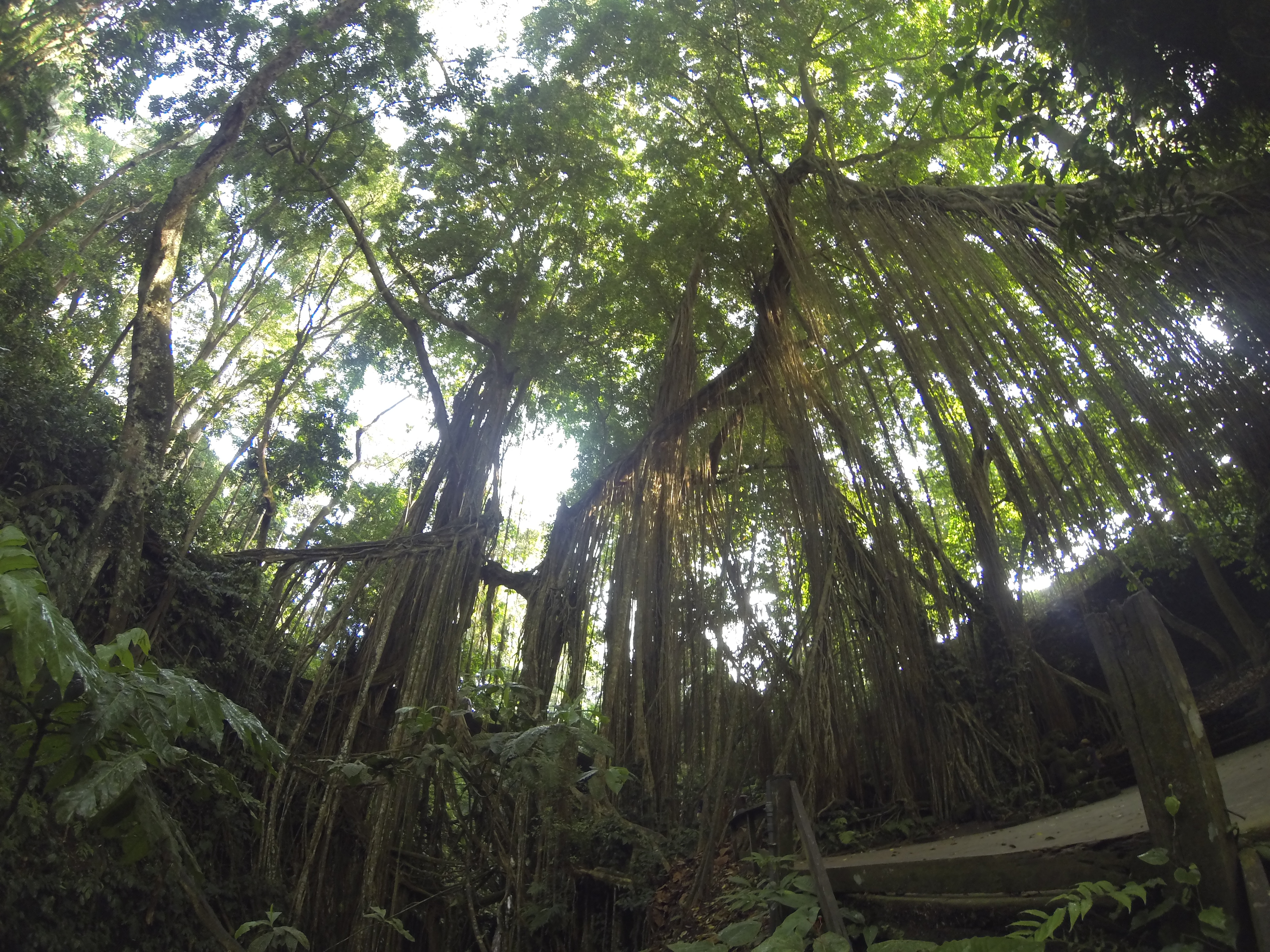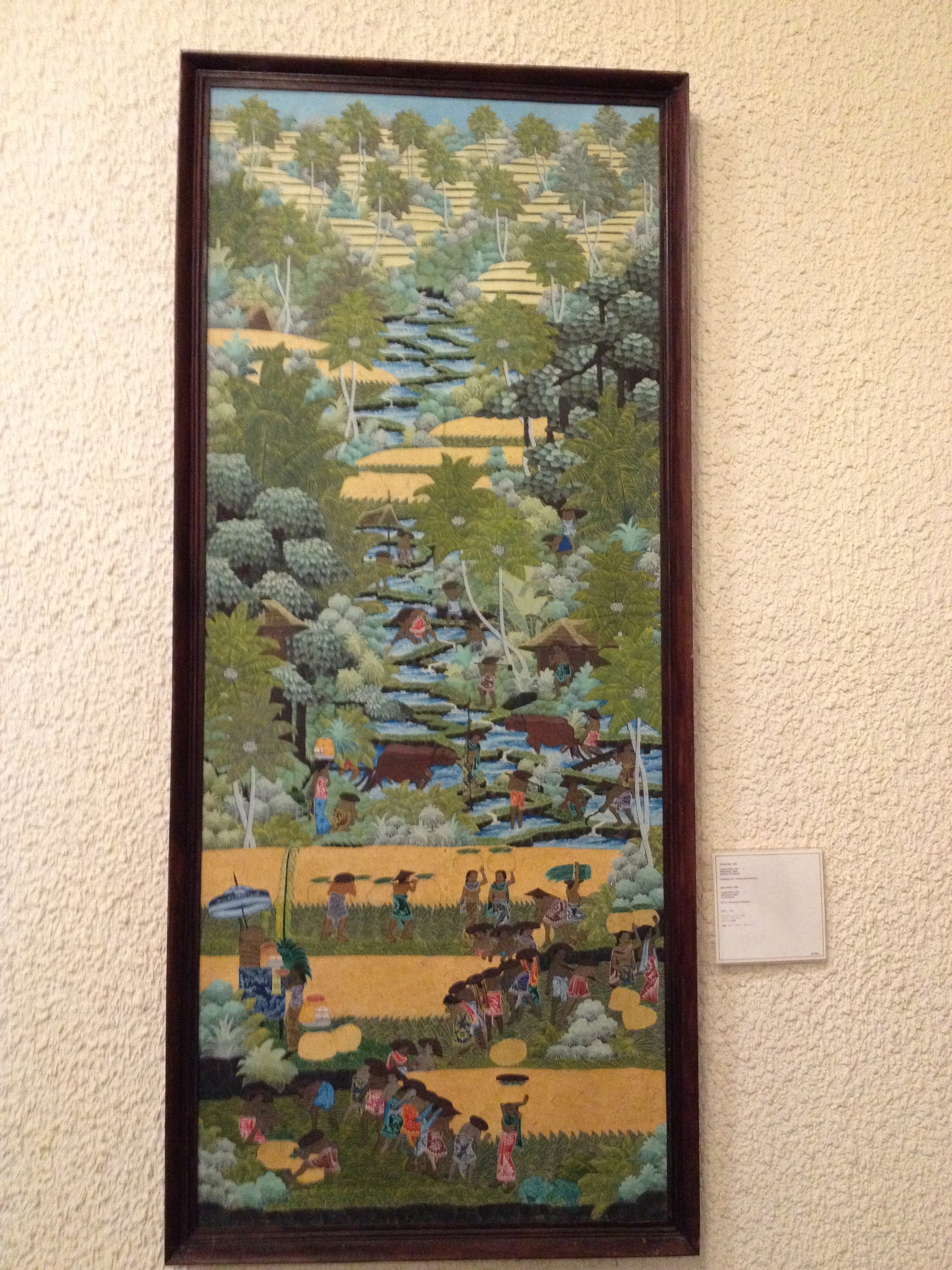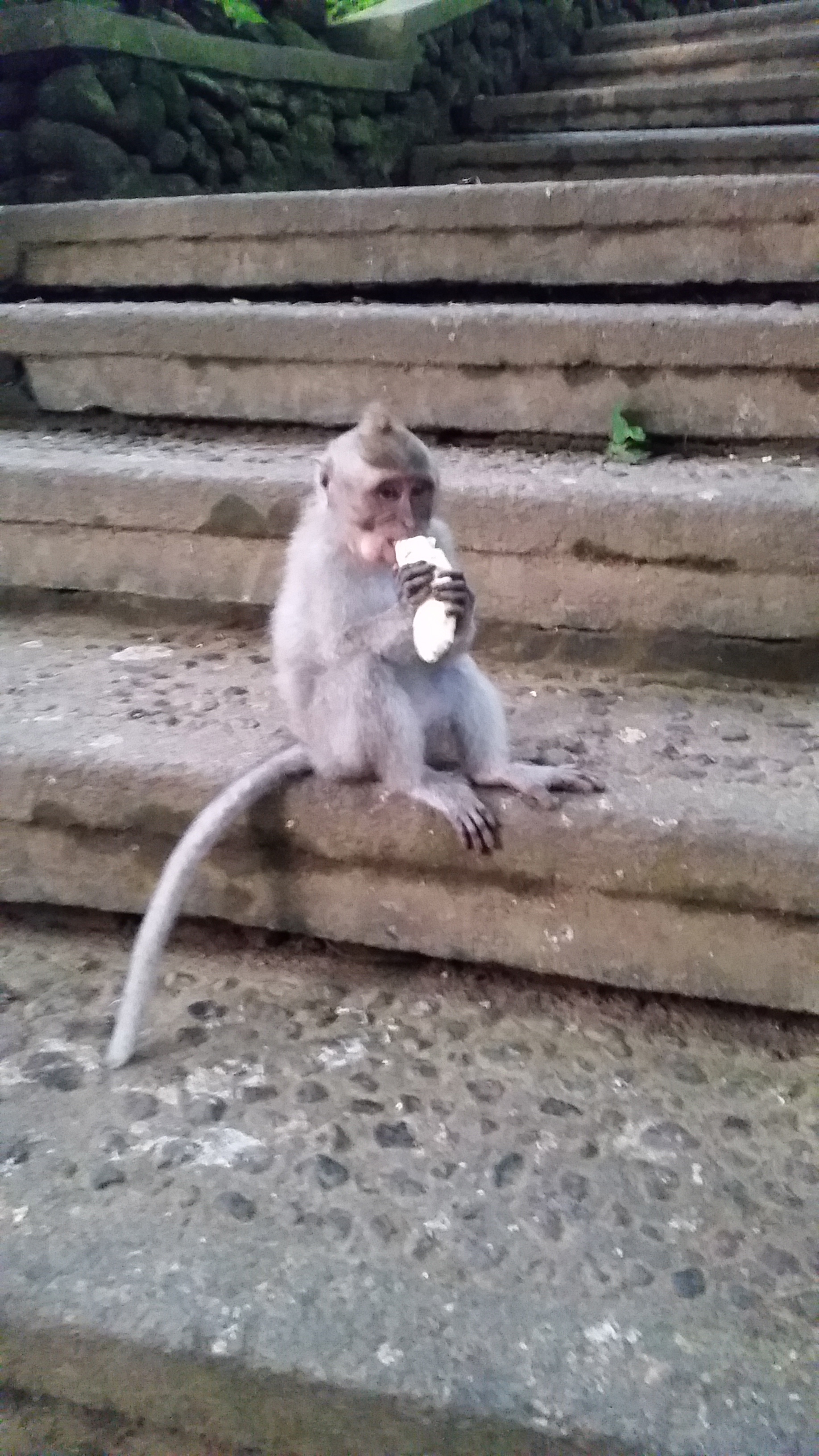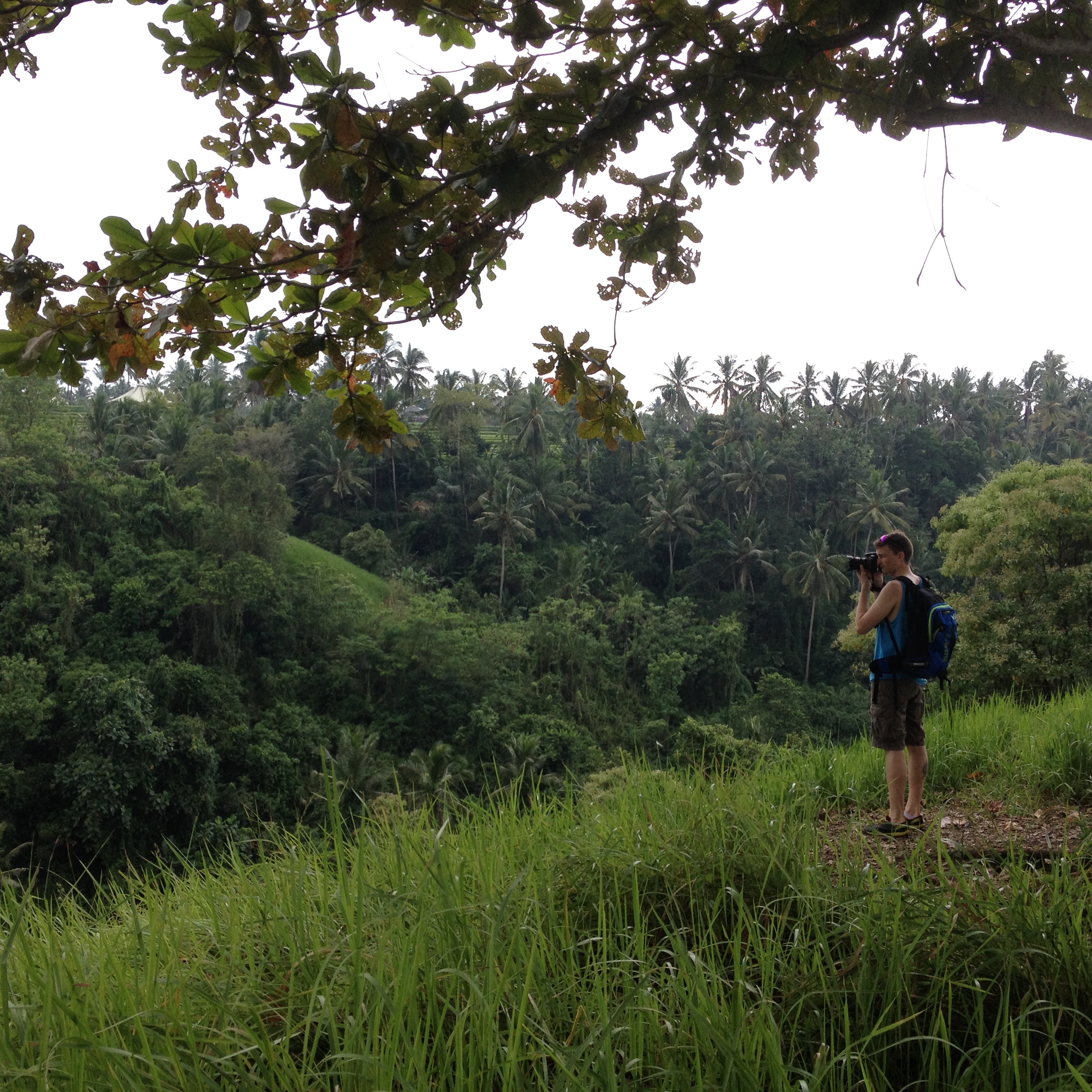 La promenade des crêtes nous redescend vers Ibah puis Ubud, en admirant de petites galeries d’artisans (tableaux, œufs en bois peints, etc), des cafés et des spas pour massages, des mini-marts, des resorts ou guest houses encore plus isolés que notre villa et surtout plus immergés dans la forêt vierge. Il s’agit bien d’une crête qui surplombe de part et d’autre une profonde vallée à la végétation luxuriante avec parfois un petit hameau, un hôtel luxueux, de superbes villas. Le chemin sillonne entre des champs de hautes herbes, les alang alang qui servent de couverture sur les toits et ensuite le sentier pique sur un temple en restauration ; un vieux pont de pierre enjambe la rivière et un énorme Banyan Tree avec ses lianes par centaines nous signale l’arrivée sur la rue principale, le retour à la civilisation. Et ici, doit-on partir à droite ou à gauche? Il y a autant de boutiques d’un côté que de l’autre, où se situe Ubud? Mais comme par surprise, Made surgit dans notre champ de vision. Ils sont ainsi les guides en Asie que nous avons connus en Thaïlande, au Cambodge, toujours là au bon moment au bon endroit!