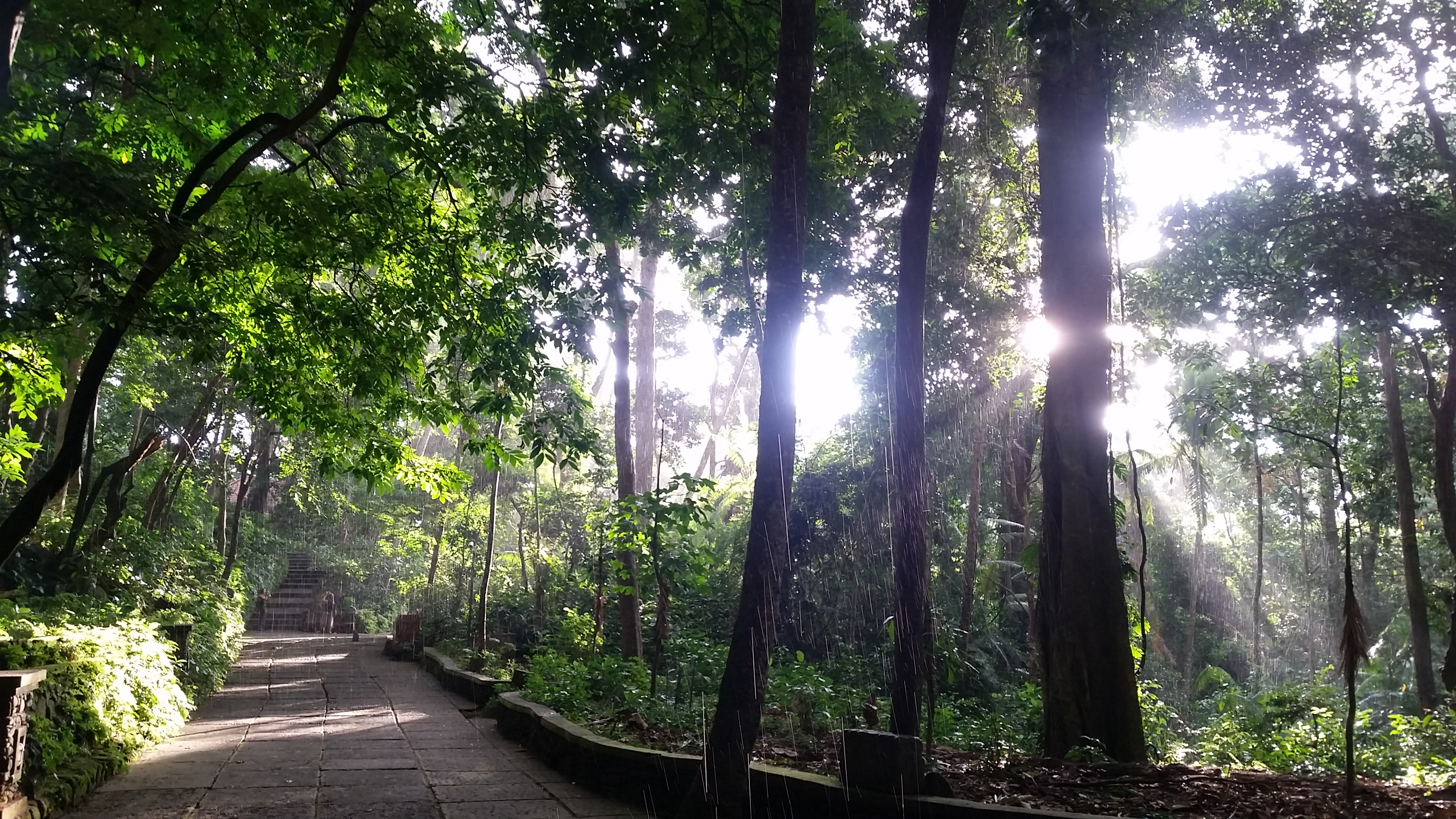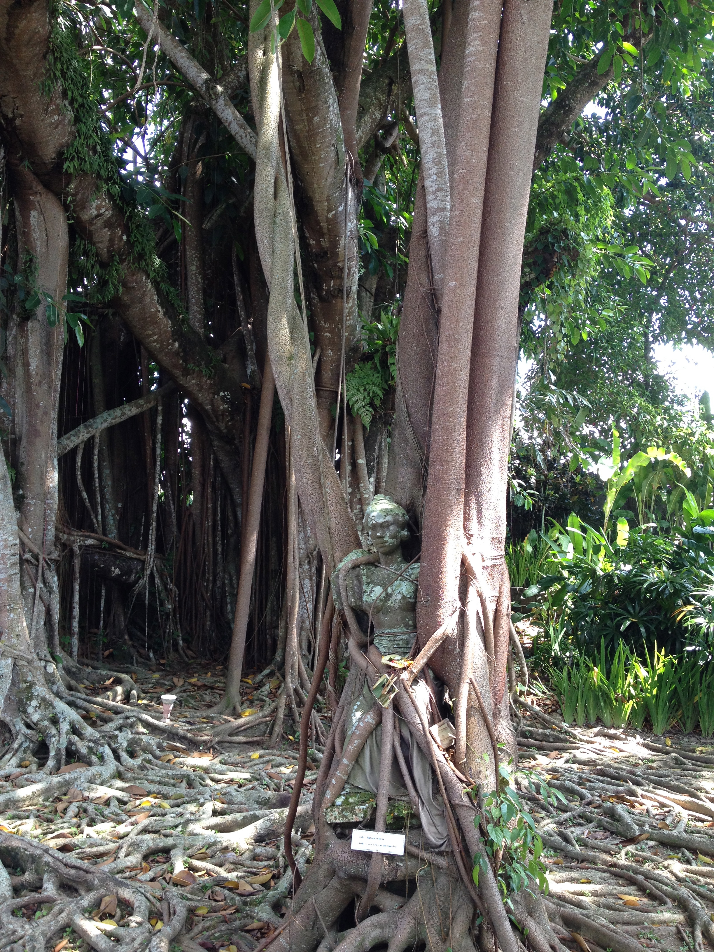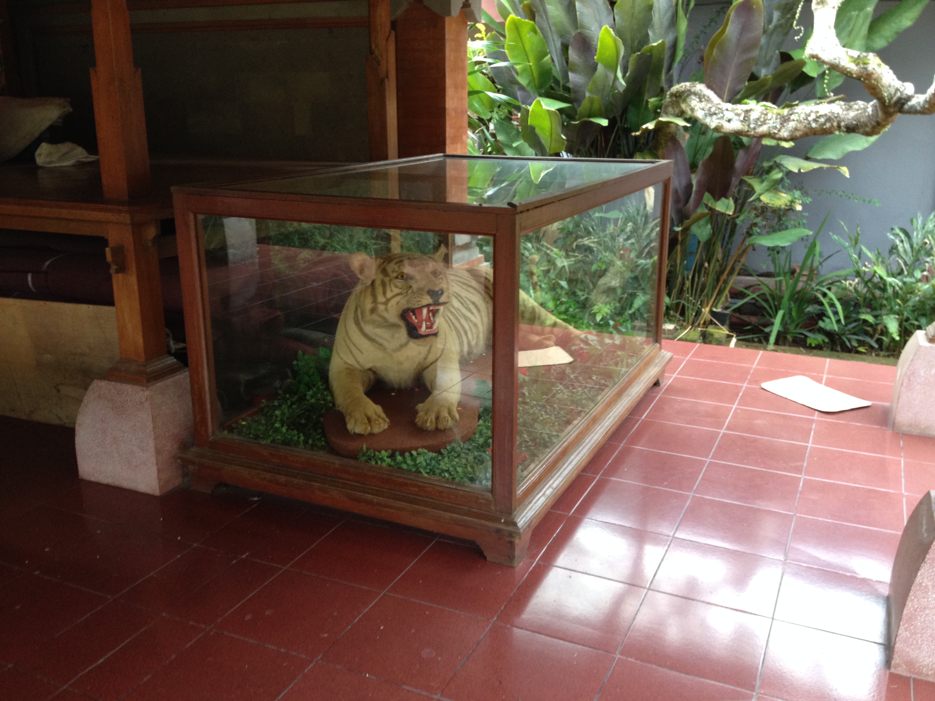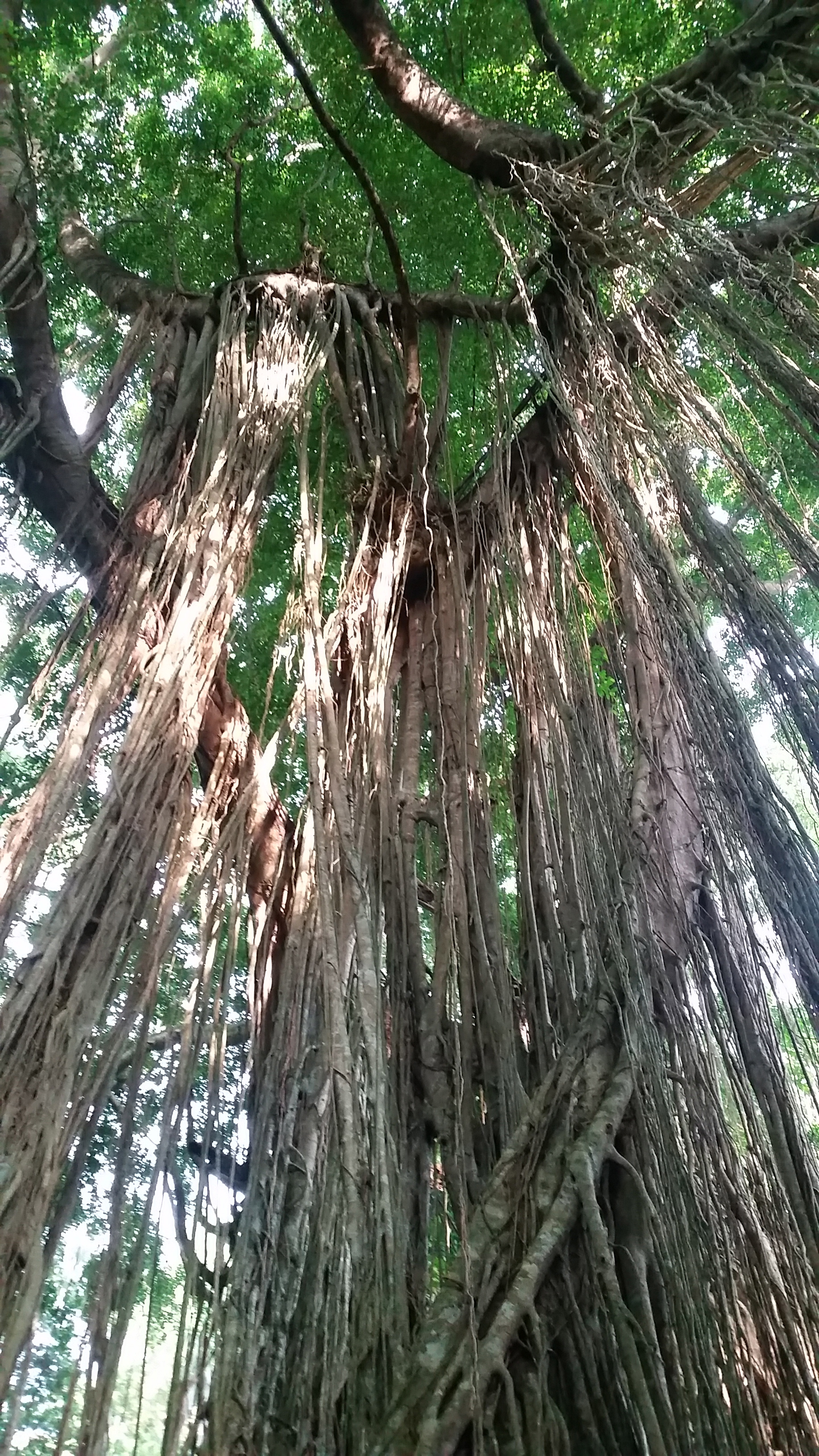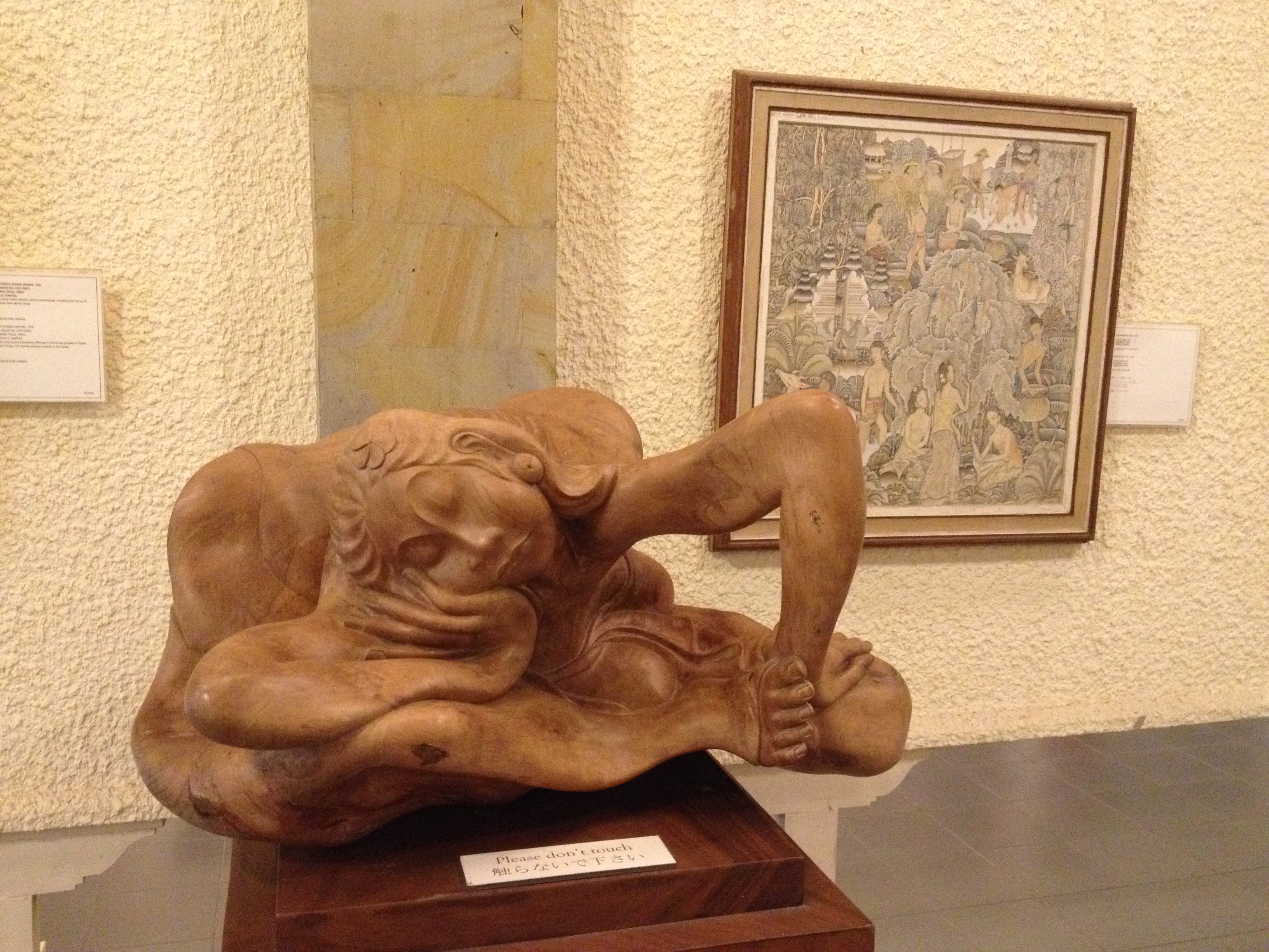 La promenade des crêtes nous redescend vers Ibah puis Ubud, en admirant de petites galeries d’artisans (tableaux, œufs en bois peints, etc), des cafés et des spas pour massages, des mini-marts, des resorts ou guest houses encore plus isolés que notre villa et surtout plus immergés dans la forêt vierge. Il s’agit bien d’une crête qui surplombe de part et d’autre une profonde vallée à la végétation luxuriante avec parfois un petit hameau, un hôtel luxueux, de superbes villas. Le chemin sillonne entre des champs de hautes herbes, les alang alang qui servent de couverture sur les toits et ensuite le sentier pique sur un temple en restauration ; un vieux pont de pierre enjambe la rivière et un énorme Banyan Tree avec ses lianes par centaines nous signale l’arrivée sur la rue principale, le retour à la civilisation. Et ici, doit-on partir à droite ou à gauche? Il y a autant de boutiques d’un côté que de l’autre, où se situe Ubud? Mais comme par surprise, Made surgit dans notre champ de vision. Ils sont ainsi les guides en Asie que nous avons connus en Thaïlande, au Cambodge, toujours là au bon moment au bon endroit!