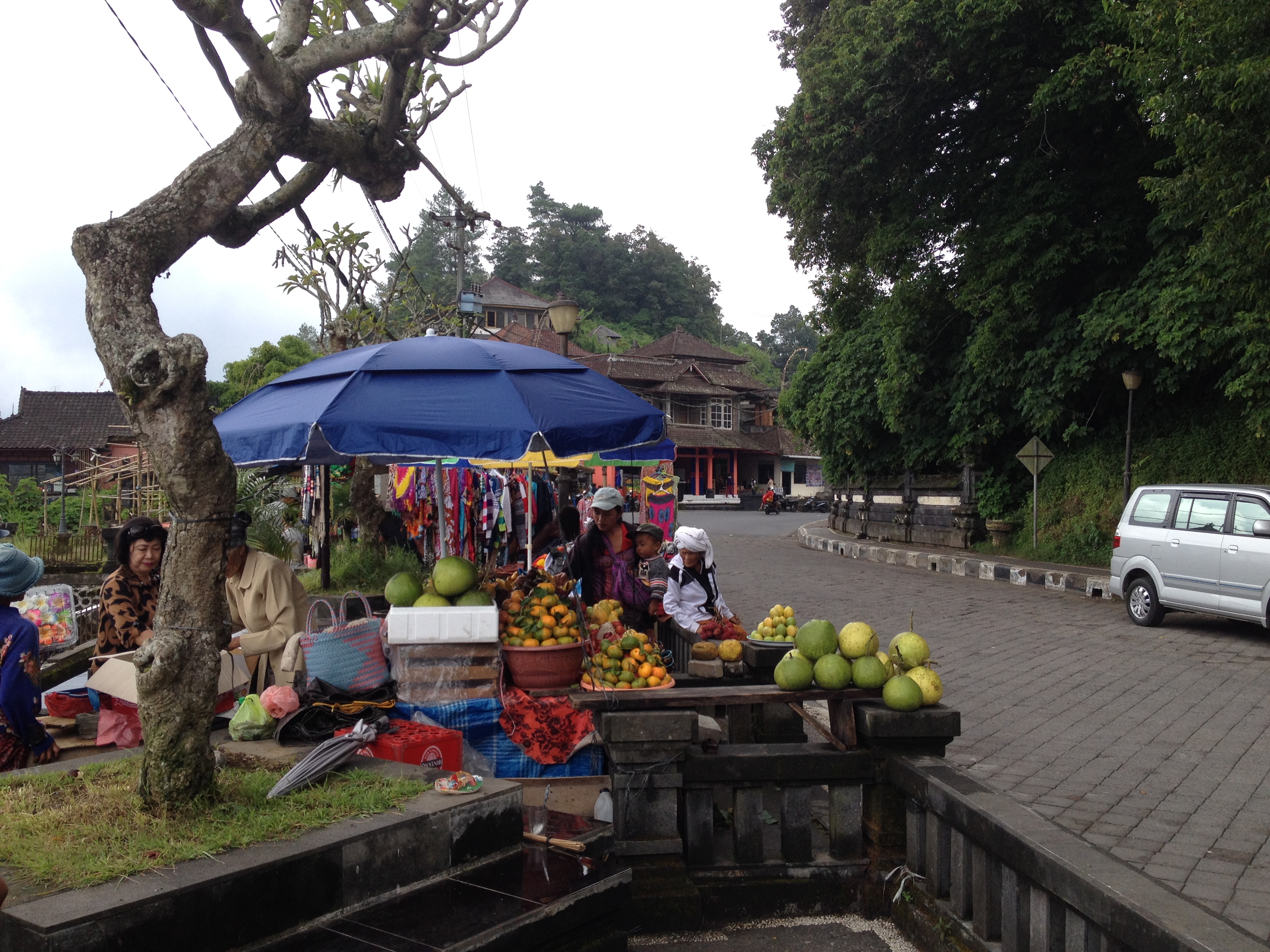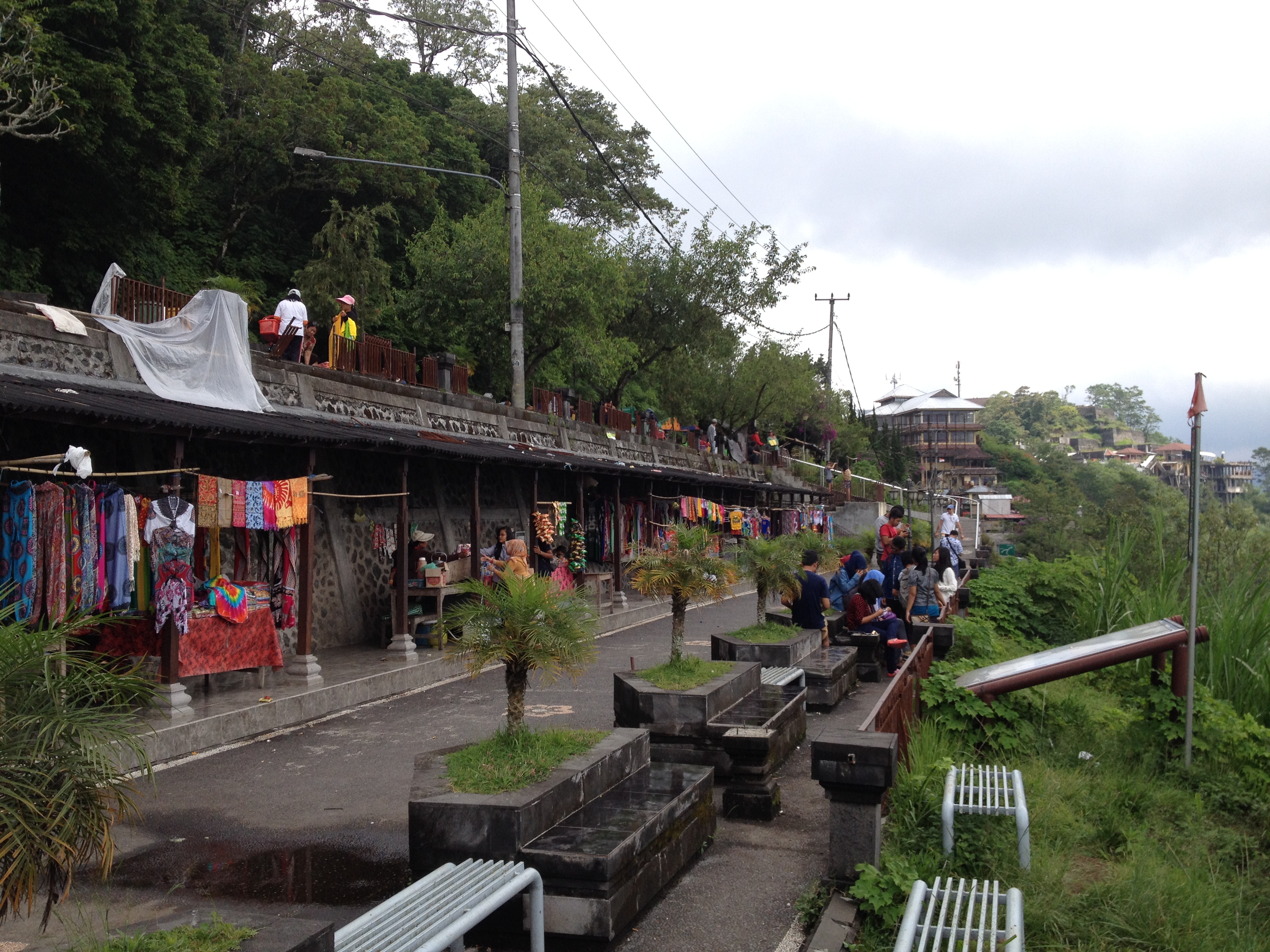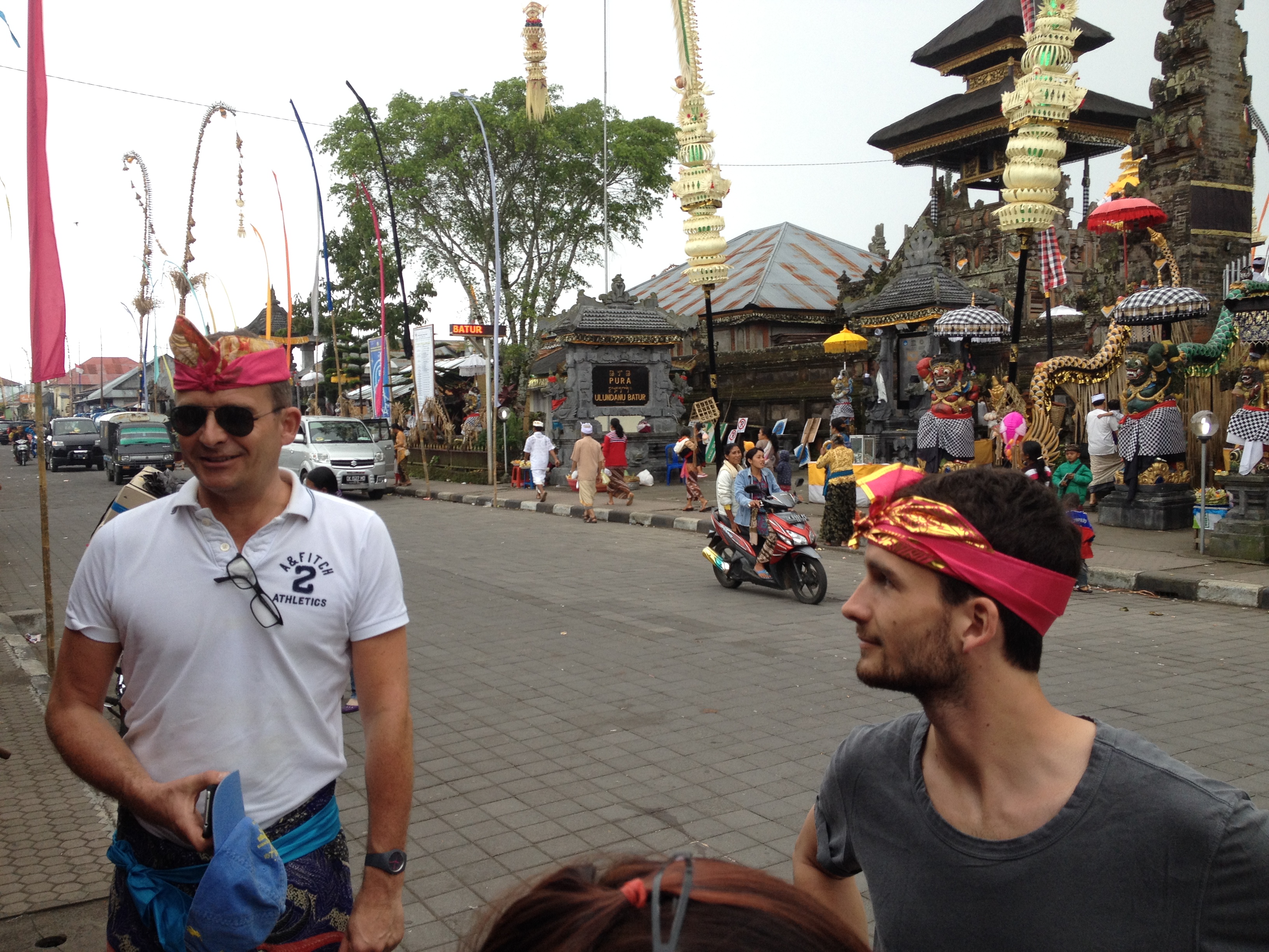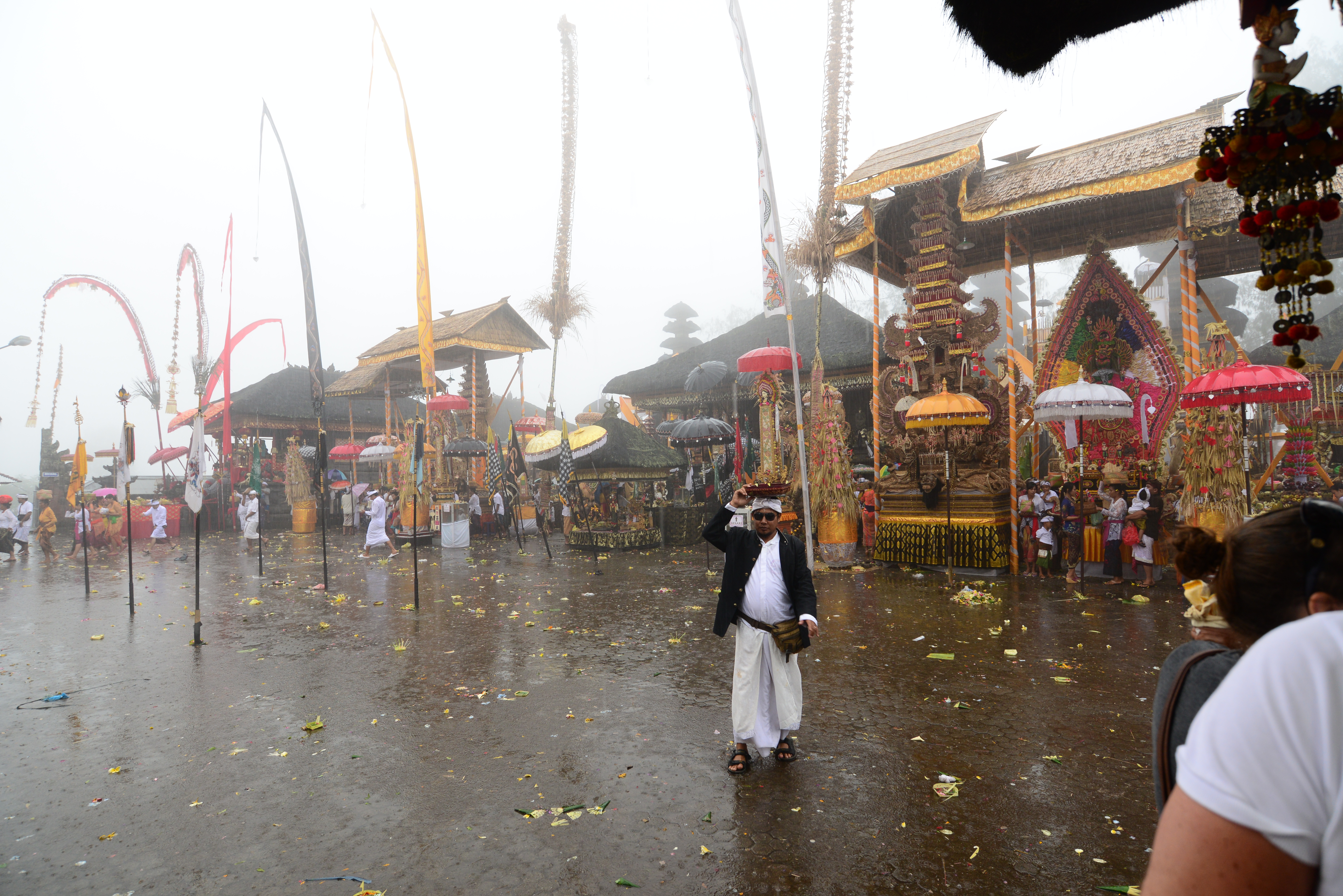 Piscine relax et photos avant l’arrivée de Made occupé ce matin avec une cérémonie – il y en a tout le temps sur l’île. Il nous emmène tous dans sa voiture ; la conduite est sportive, demande habilité et concentration pour avancer tout en évitant les scooters bien plus nombreux que les voitures ici dans la campagne d’Ubud, les vélomoteurs aux chargements plus énormes qu’eux dans tous les sens, les poules ou les chiens qui traversent ou se couchent sur la route, les tas de terre noire déposés sur le tarmac pour les travaux de rénovation ou finition sans fin. Les axes qui sur mes plans semblaient rectilignes sont en réalité bien plus courbes et les panneaux indicateurs ne pullulent pas. La topologie de l’île est particulière avec des directions nord-sud selon les vallées coulant des volcans mais peu de trajectoires pour passer d’est en ouest. Nous faisons totale confiance à Made qui s’avèrera être un conducteur posé et prudent – cette conduite épique, à gauche, ne me fait nullement regretter le choix de ne pas avoir loué de véhicule; c’est déjà un peu stressant parfois ainsi.
