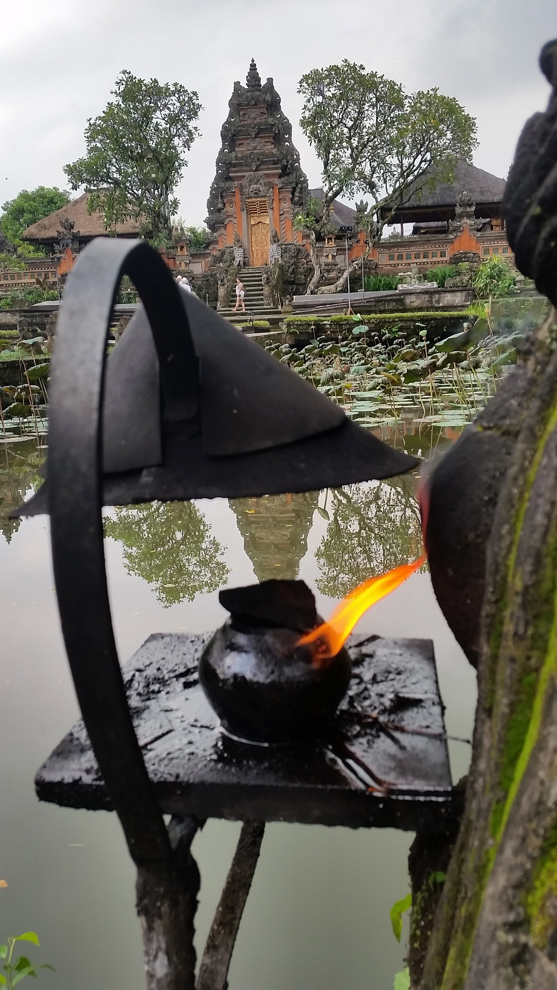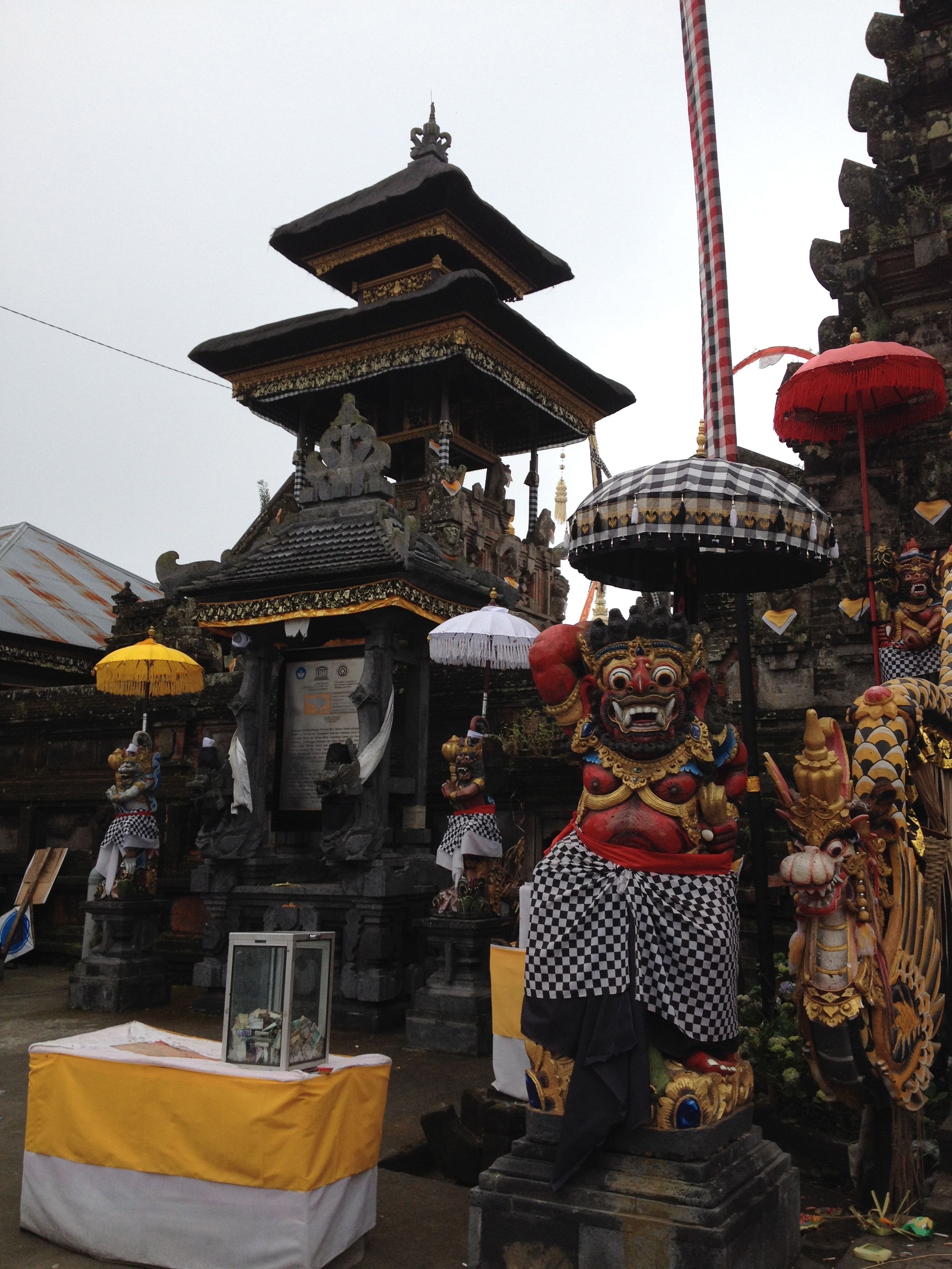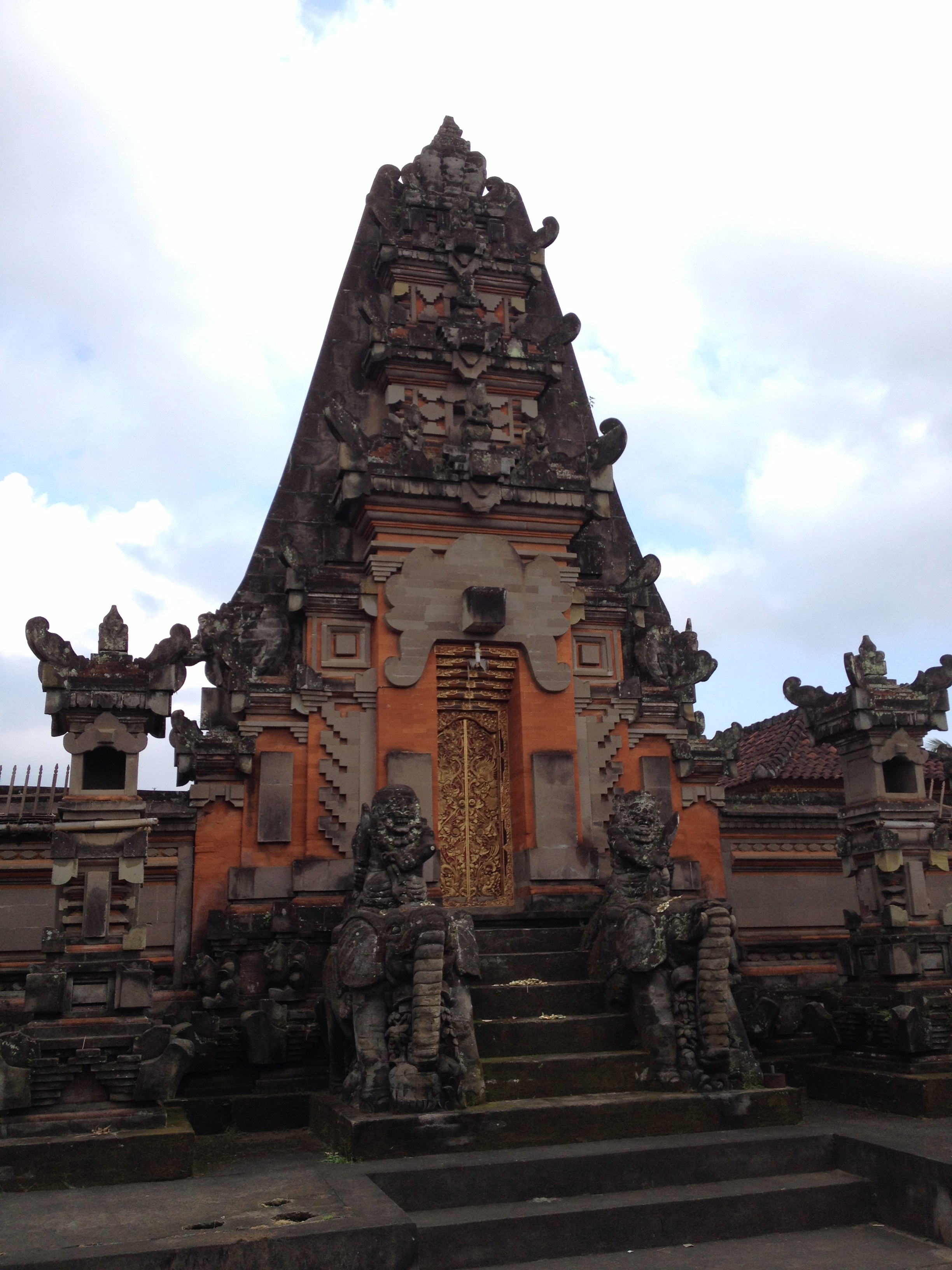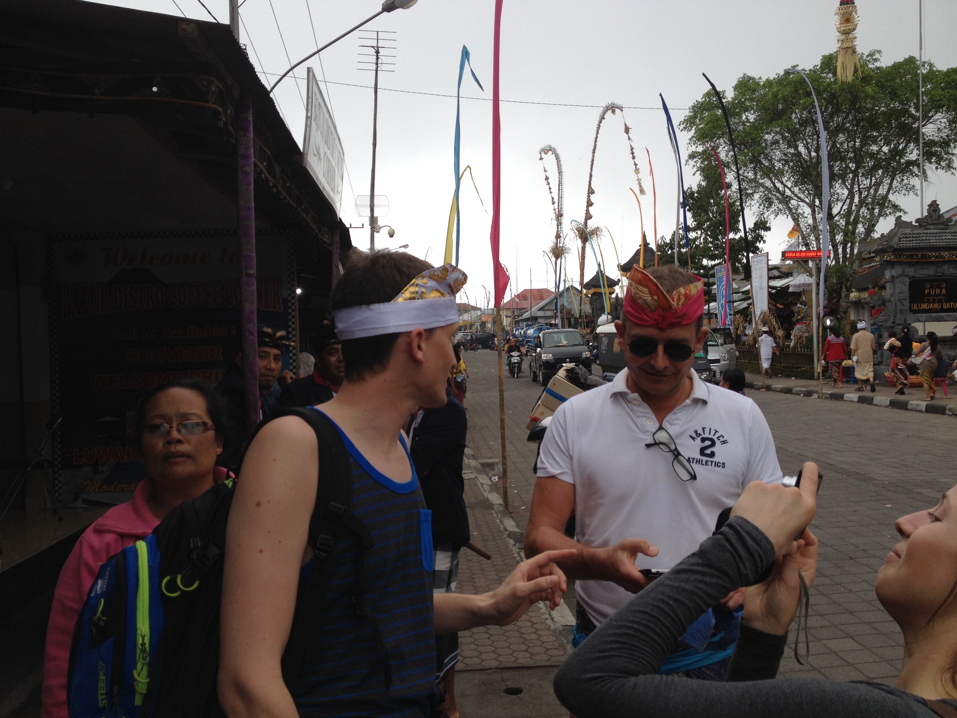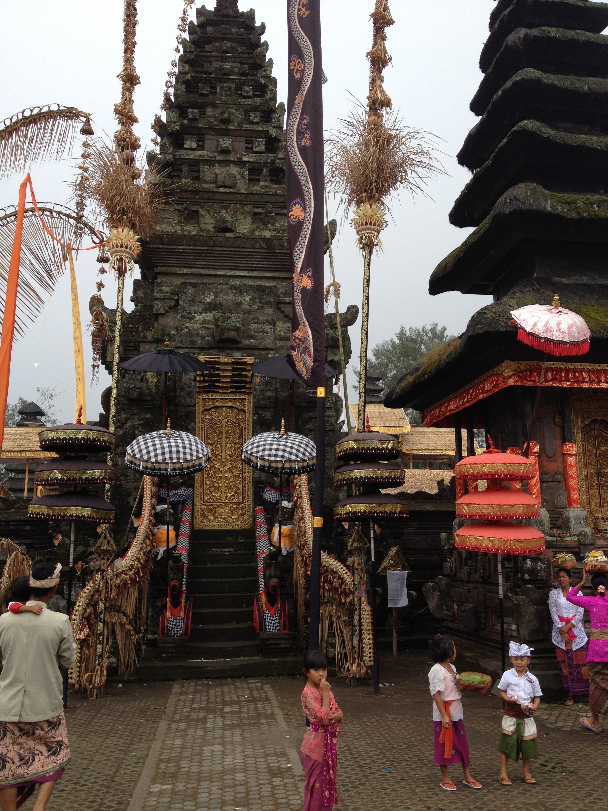 Piscine relax et photos avant l’arrivée de Made occupé ce matin avec une cérémonie – il y en a tout le temps sur l’île. Il nous emmène tous dans sa voiture ; la conduite est sportive, demande habilité et concentration pour avancer tout en évitant les scooters bien plus nombreux que les voitures ici dans la campagne d’Ubud, les vélomoteurs aux chargements plus énormes qu’eux dans tous les sens, les poules ou les chiens qui traversent ou se couchent sur la route, les tas de terre noire déposés sur le tarmac pour les travaux de rénovation ou finition sans fin. Les axes qui sur mes plans semblaient rectilignes sont en réalité bien plus courbes et les panneaux indicateurs ne pullulent pas. La topologie de l’île est particulière avec des directions nord-sud selon les vallées coulant des volcans mais peu de trajectoires pour passer d’est en ouest. Nous faisons totale confiance à Made qui s’avèrera être un conducteur posé et prudent – cette conduite épique, à gauche, ne me fait nullement regretter le choix de ne pas avoir loué de véhicule; c’est déjà un peu stressant parfois ainsi.