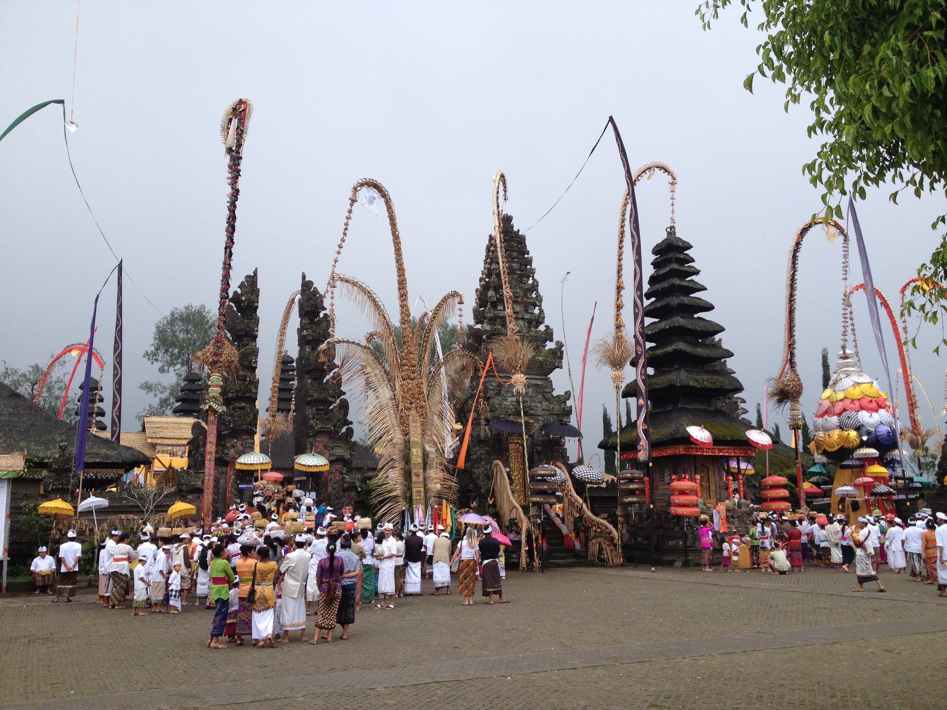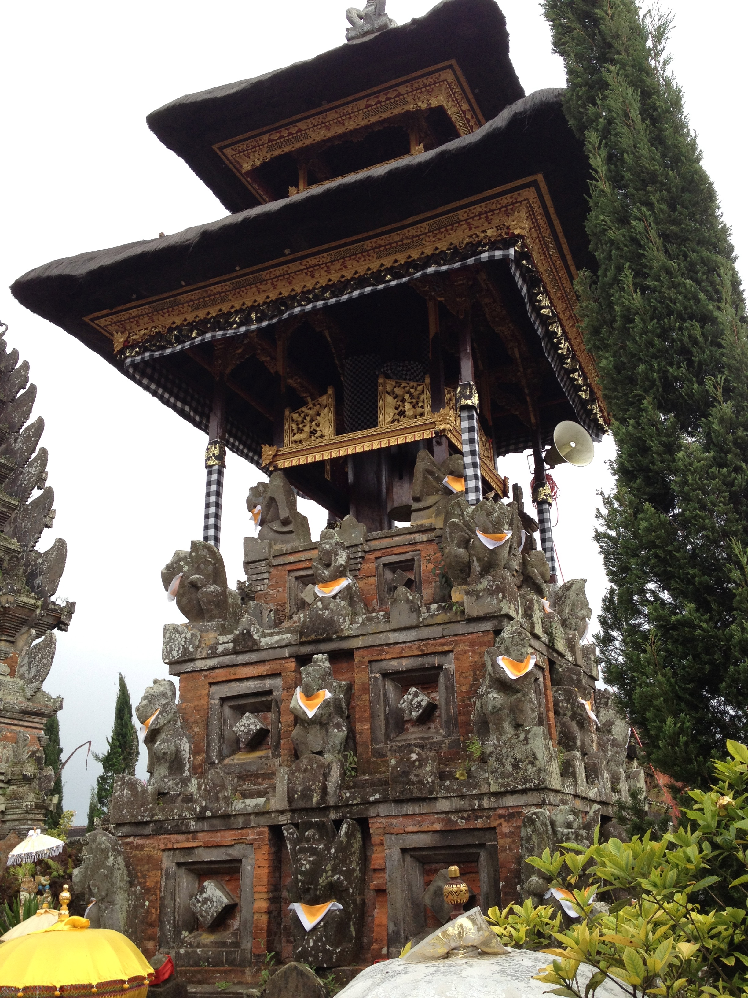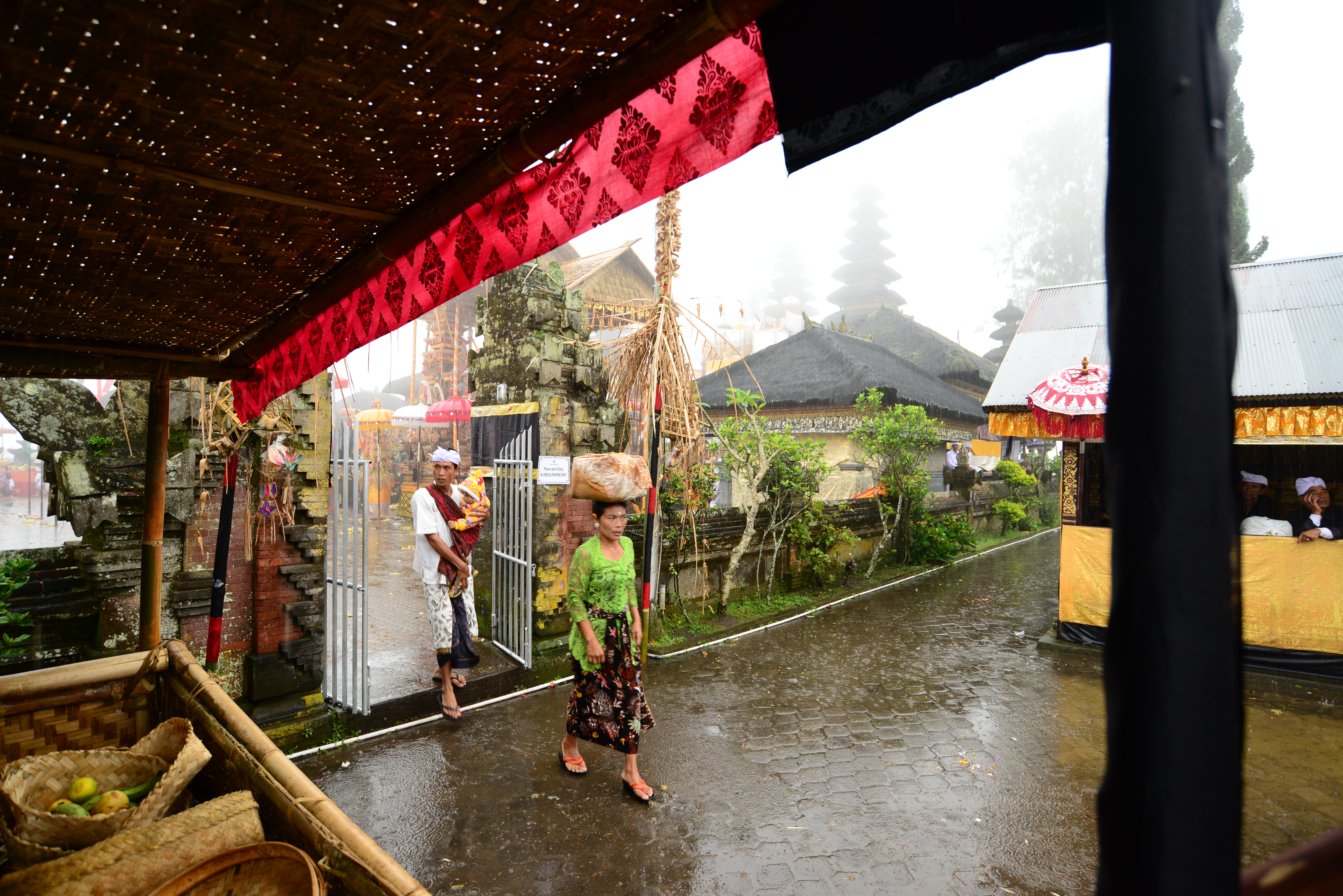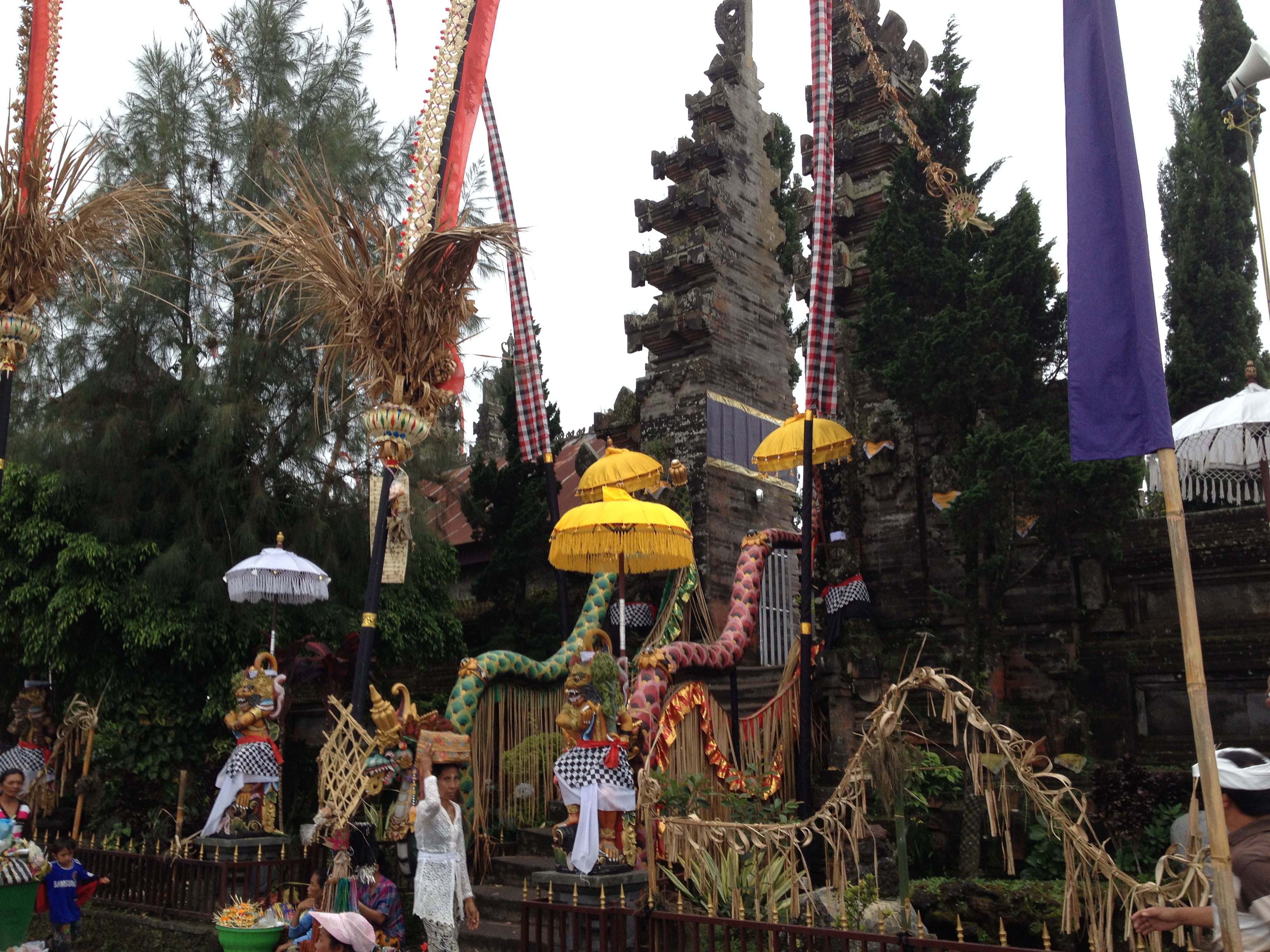 Piscine relax et photos avant l’arrivée de Made occupé ce matin avec une cérémonie – il y en a tout le temps sur l’île. Il nous emmène tous dans sa voiture ; la conduite est sportive, demande habilité et concentration pour avancer tout en évitant les scooters bien plus nombreux que les voitures ici dans la campagne d’Ubud, les vélomoteurs aux chargements plus énormes qu’eux dans tous les sens, les poules ou les chiens qui traversent ou se couchent sur la route, les tas de terre noire déposés sur le tarmac pour les travaux de rénovation ou finition sans fin. Les axes qui sur mes plans semblaient rectilignes sont en réalité bien plus courbes et les panneaux indicateurs ne pullulent pas. La topologie de l’île est particulière avec des directions nord-sud selon les vallées coulant des volcans mais peu de trajectoires pour passer d’est en ouest. Nous faisons totale confiance à Made qui s’avèrera être un conducteur posé et prudent – cette conduite épique, à gauche, ne me fait nullement regretter le choix de ne pas avoir loué de véhicule; c’est déjà un peu stressant parfois ainsi.