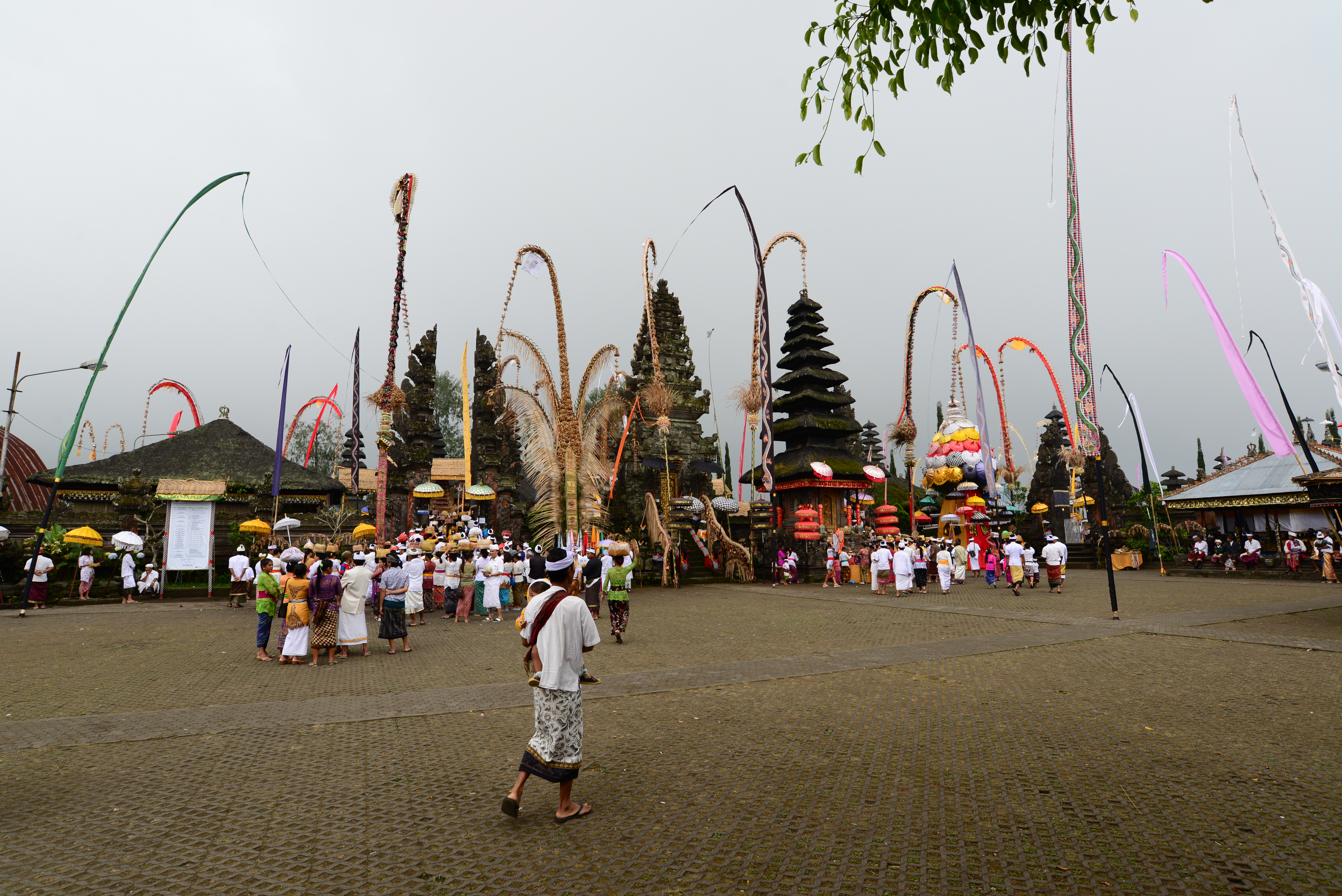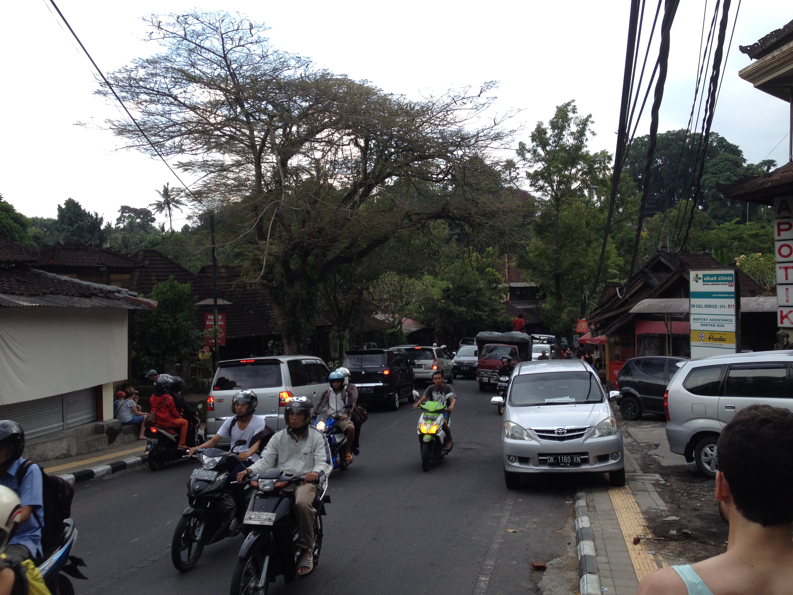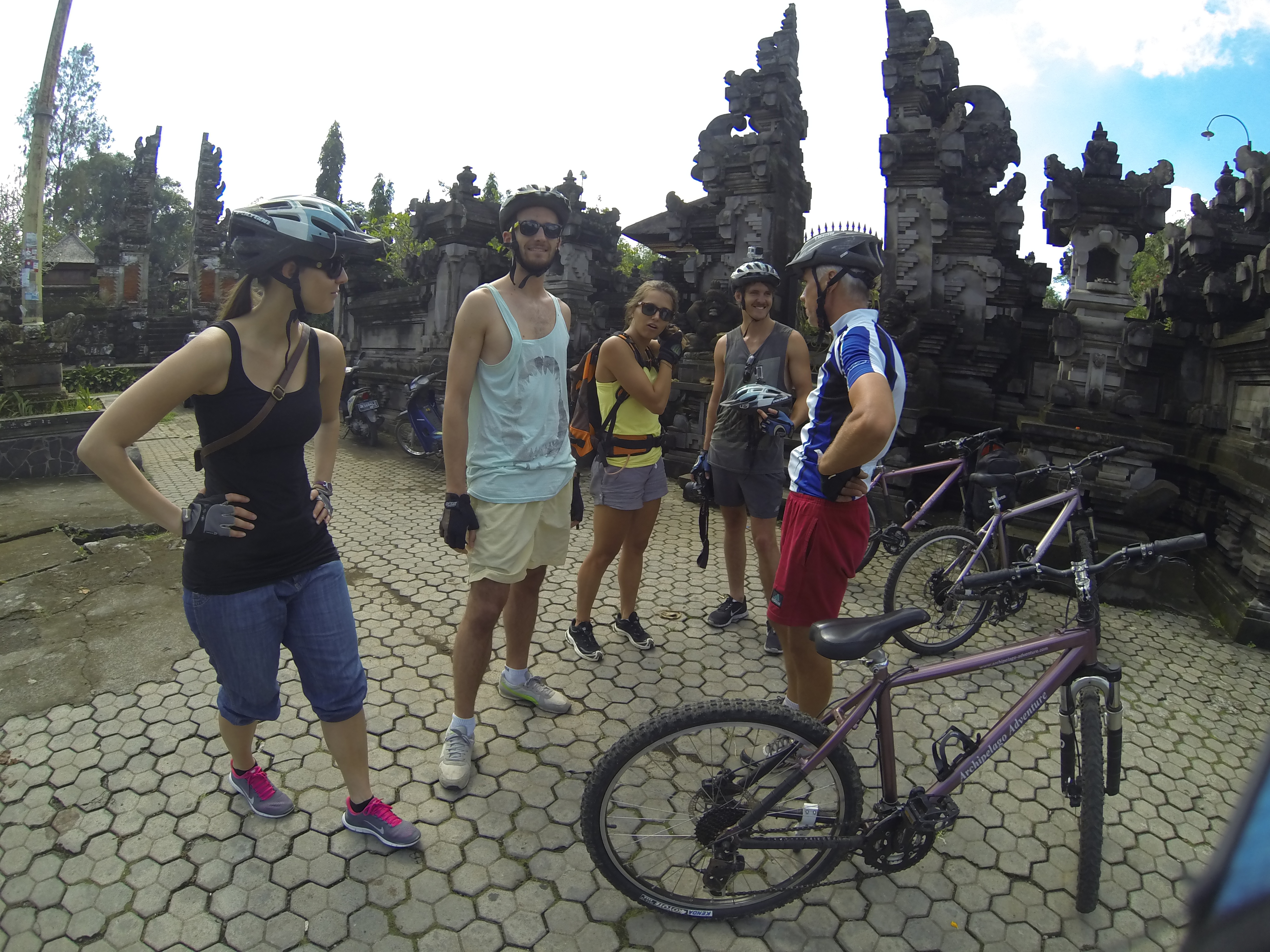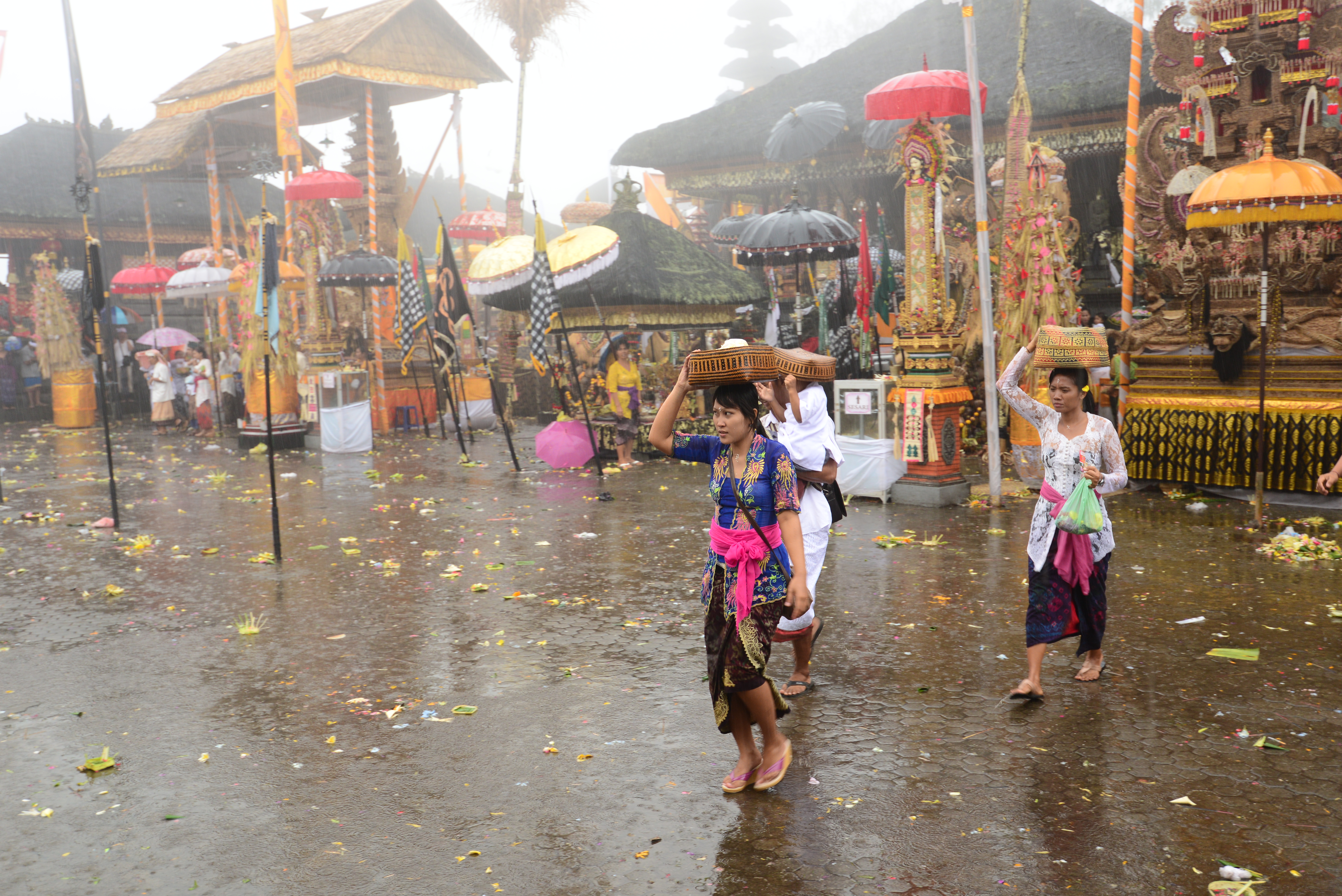 Piscine relax et photos avant l’arrivée de Made occupé ce matin avec une cérémonie – il y en a tout le temps sur l’île. Il nous emmène tous dans sa voiture ; la conduite est sportive, demande habilité et concentration pour avancer tout en évitant les scooters bien plus nombreux que les voitures ici dans la campagne d’Ubud, les vélomoteurs aux chargements plus énormes qu’eux dans tous les sens, les poules ou les chiens qui traversent ou se couchent sur la route, les tas de terre noire déposés sur le tarmac pour les travaux de rénovation ou finition sans fin. Les axes qui sur mes plans semblaient rectilignes sont en réalité bien plus courbes et les panneaux indicateurs ne pullulent pas. La topologie de l’île est particulière avec des directions nord-sud selon les vallées coulant des volcans mais peu de trajectoires pour passer d’est en ouest. Nous faisons totale confiance à Made qui s’avèrera être un conducteur posé et prudent – cette conduite épique, à gauche, ne me fait nullement regretter le choix de ne pas avoir loué de véhicule; c’est déjà un peu stressant parfois ainsi.