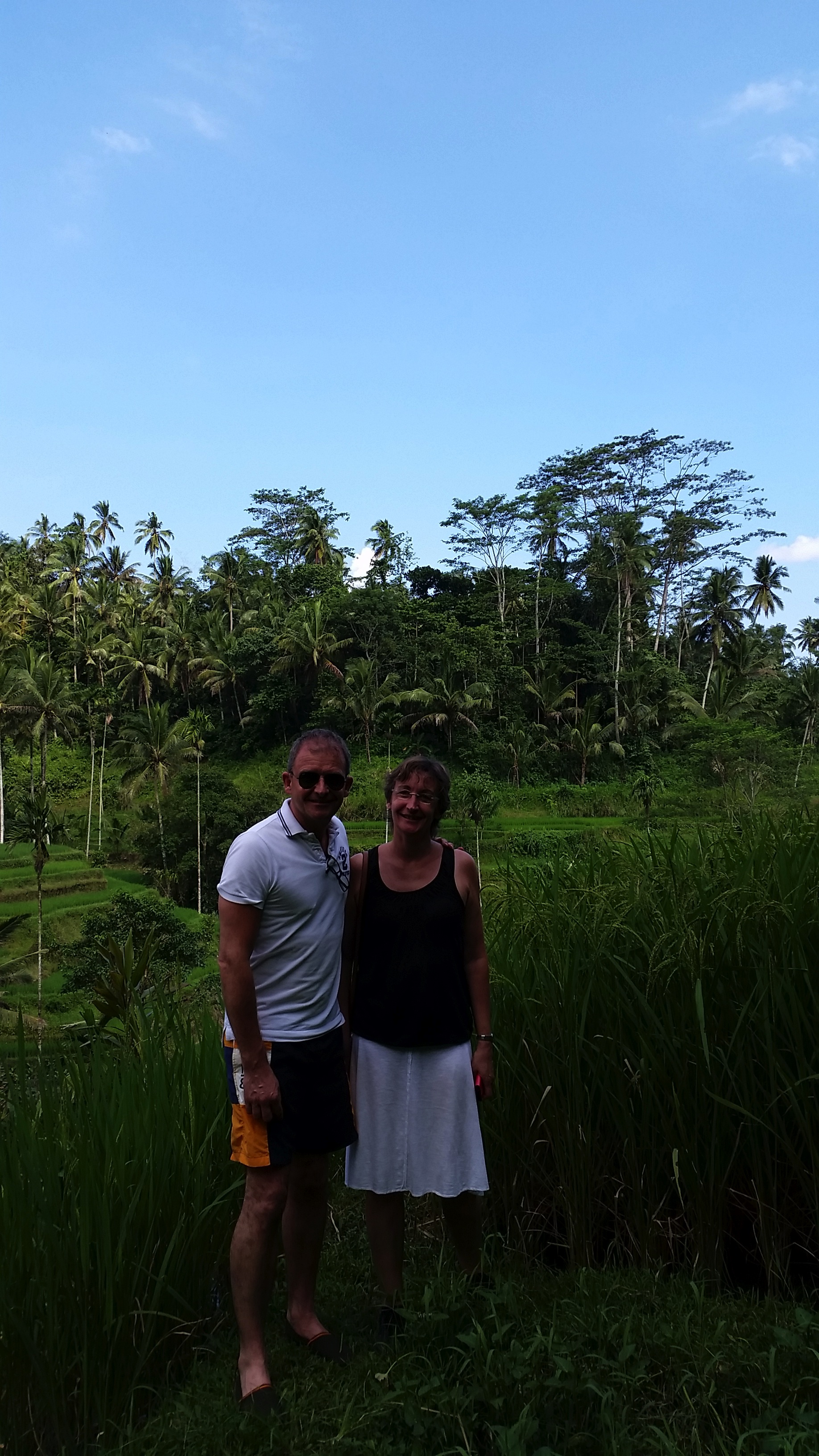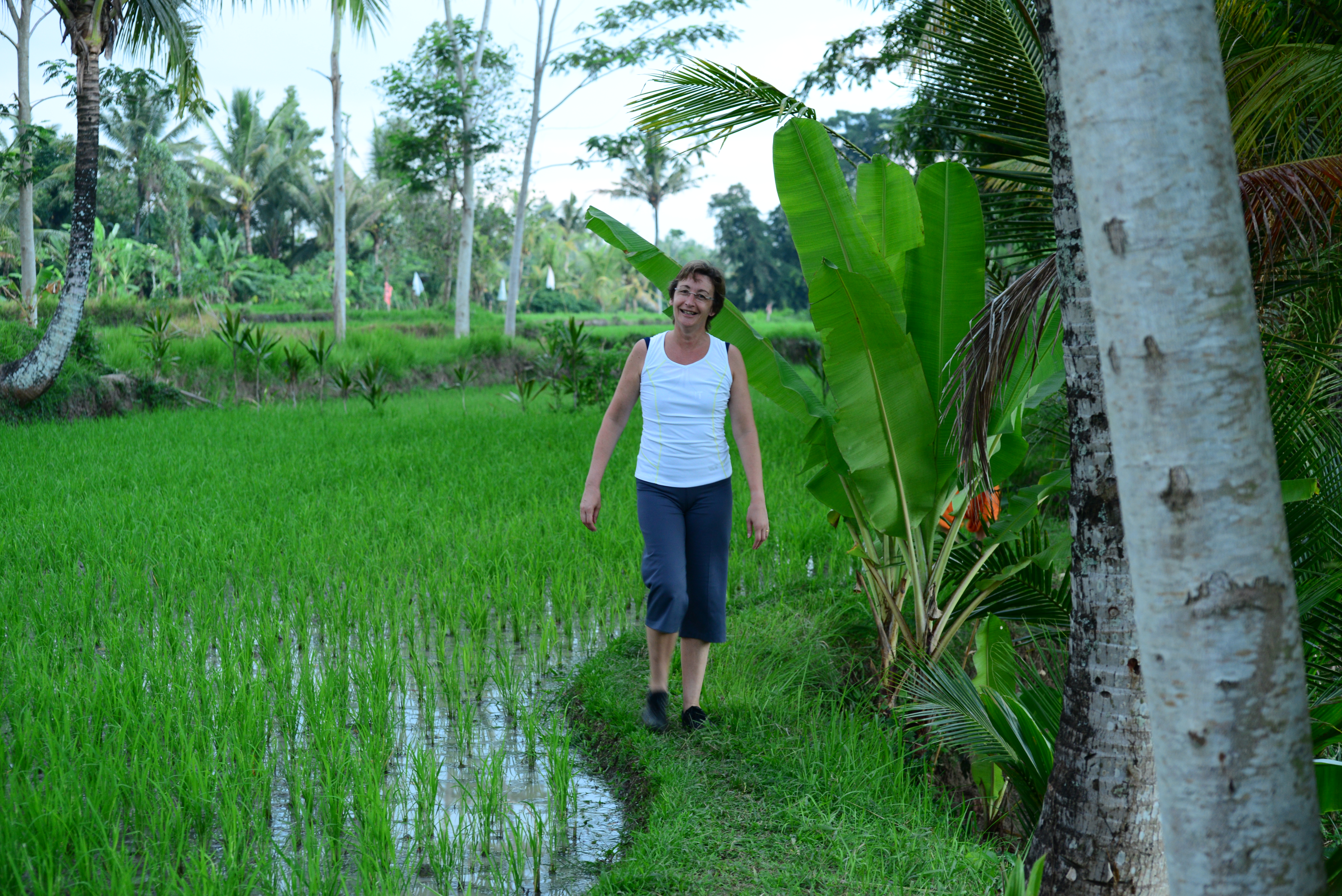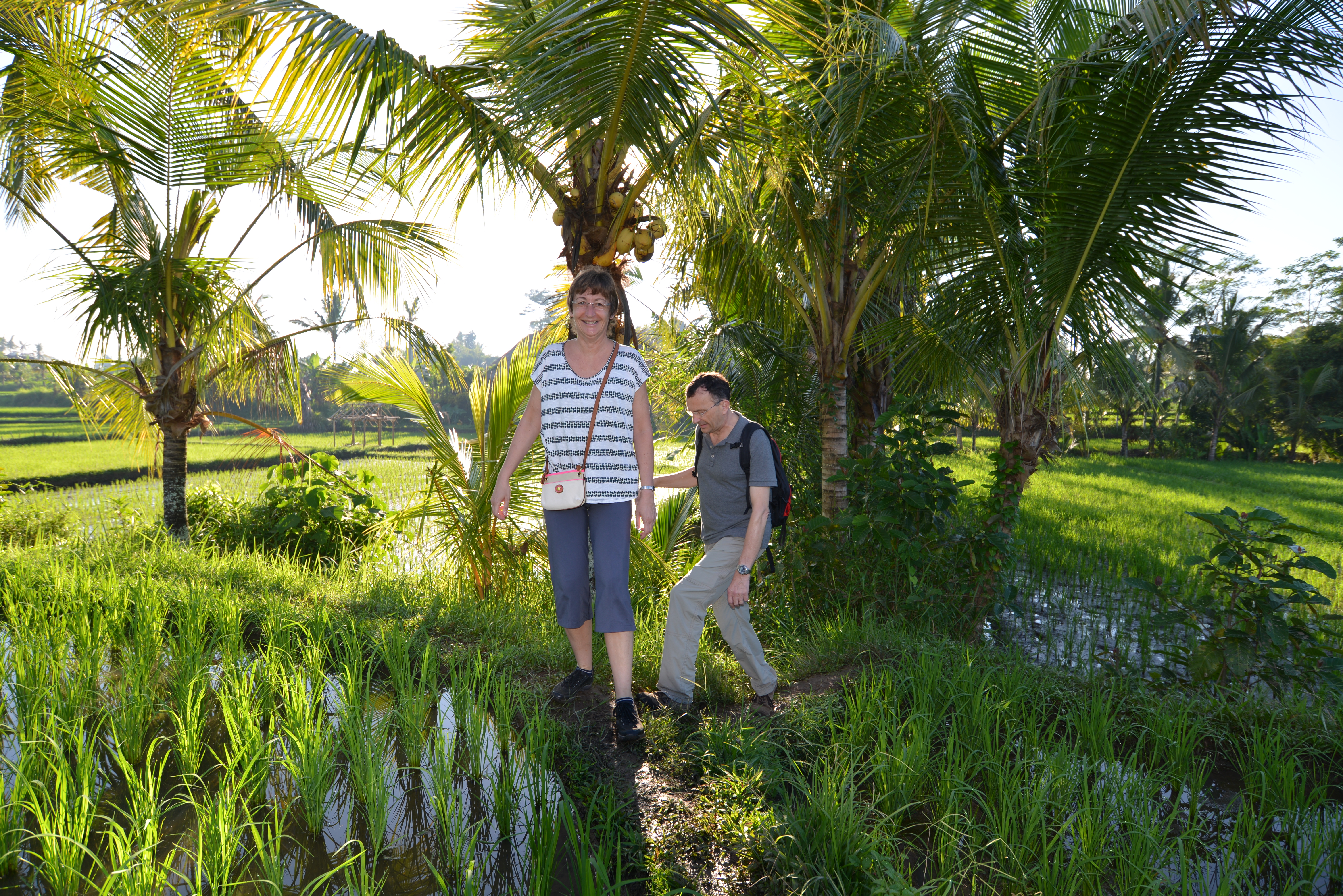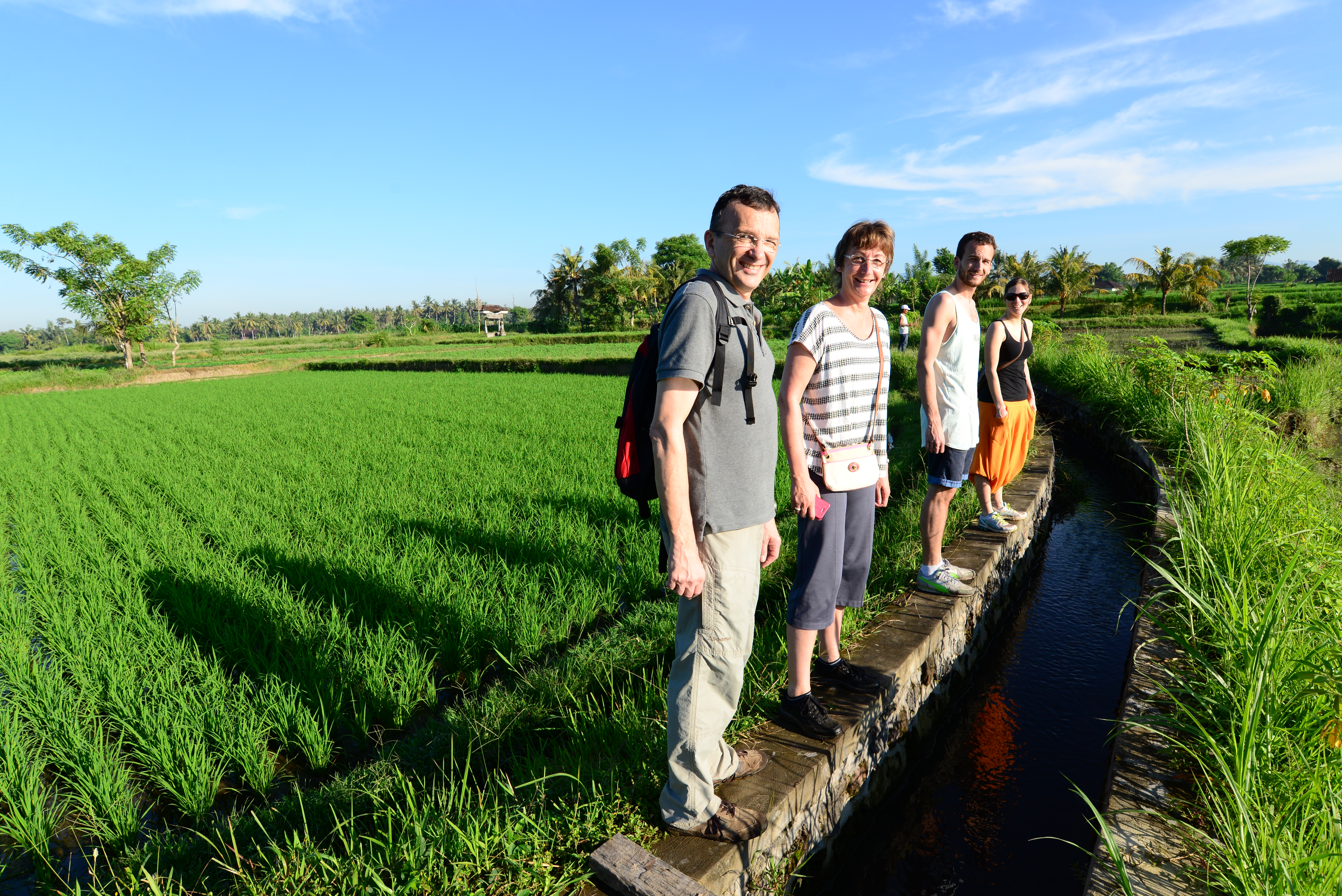 Concert des coqs à 5 heures, j’étais prévenue et c’est bien vrai; ce sera pareil chaque matin avec parfois en harmonie, le chant des prières aux temples du voisinage. De toute manière, pas de grasse matinée aujourd’hui, nous avons rendez-vous avec Gusti à 7h30 pour la promenade initiatique dans les rizières aux alentours de la villa. Le soleil est déjà bien levé, habits légers suffisent même si nous craignons un peu les moustiques (donc crème solaire et spray Anti Brumm) et pourquoi hésitons-nous entre baskets, espadrilles ou tongs? Gusti lui, tout simplement s’en va d’un bon pas … pieds nus dans les herbes et la boue! Il est vraiment l’homme de la situation, il nous guide sur les chemins étroits entre les carrés gorgés d’eau où s’alignent au cordeau les gerbes de riz. Il est utile d’avoir une certaine agilité, le sens de l’équilibre et cette fois, pas question de prendre les photos tout en marchant, faute de quoi je risque de me retrouver assise dans un bain de boue!