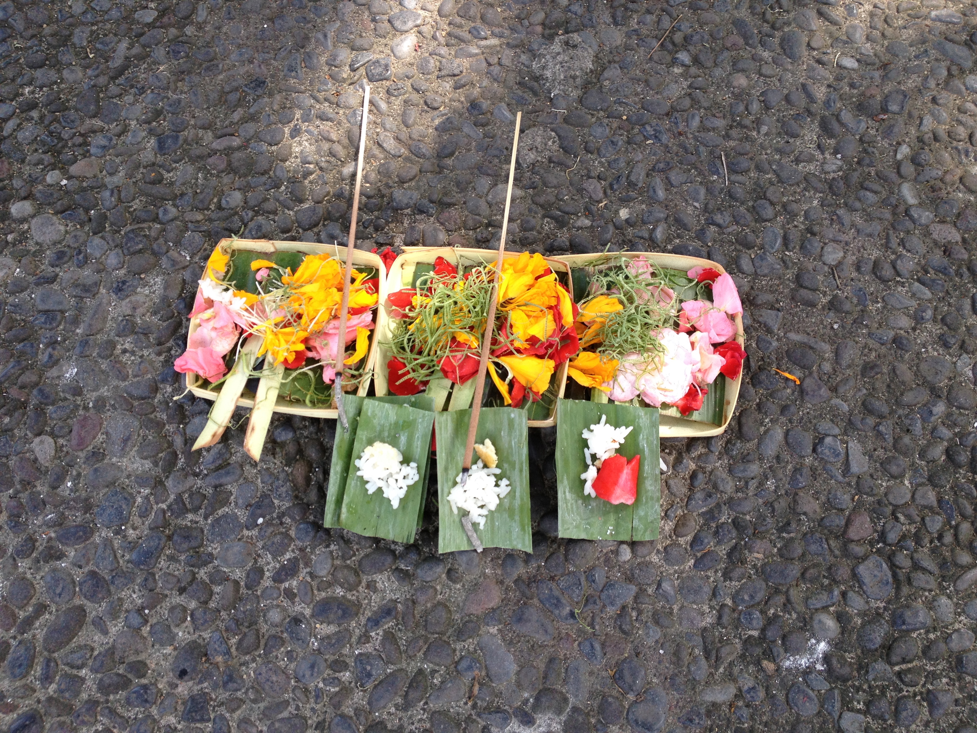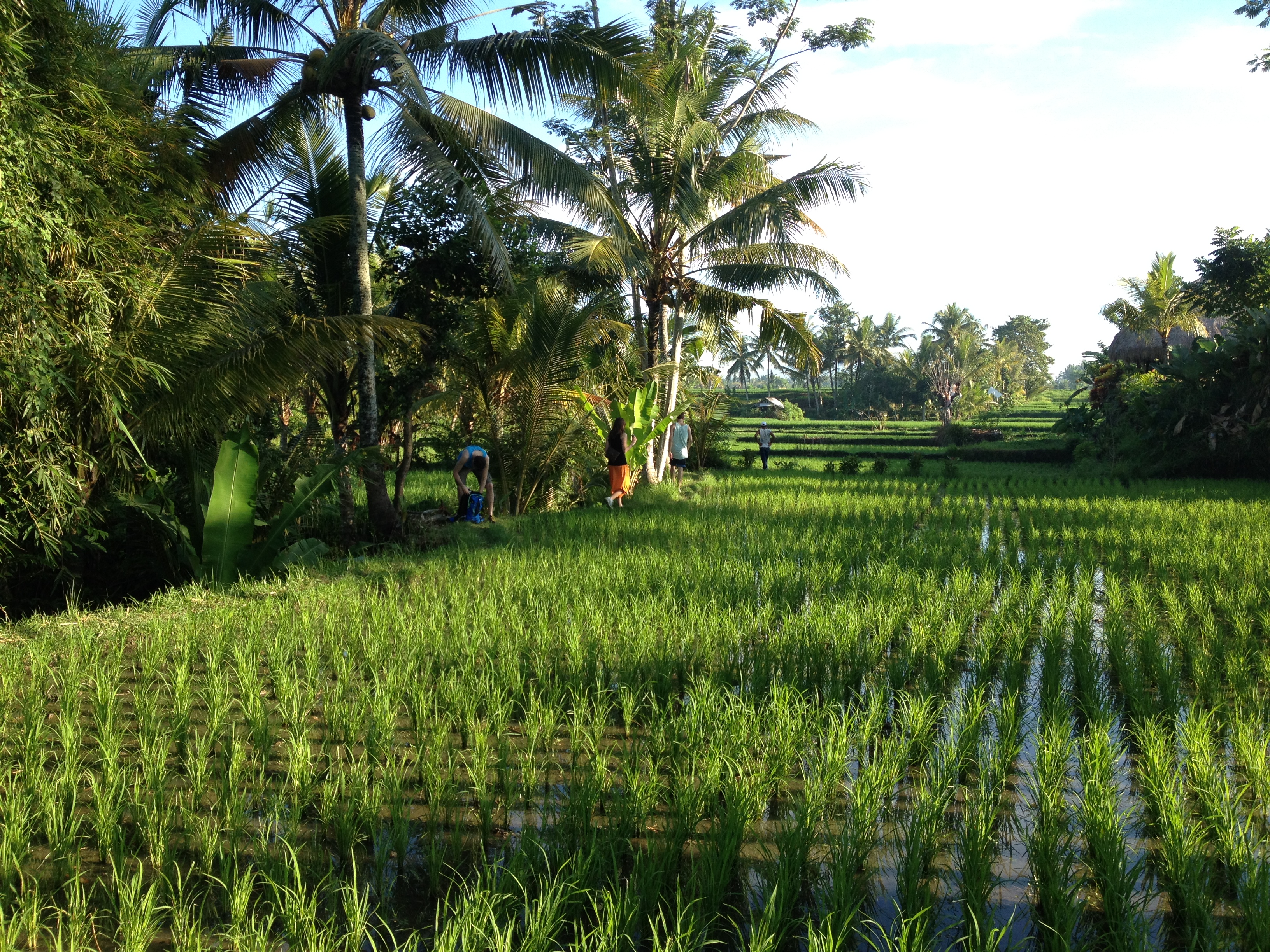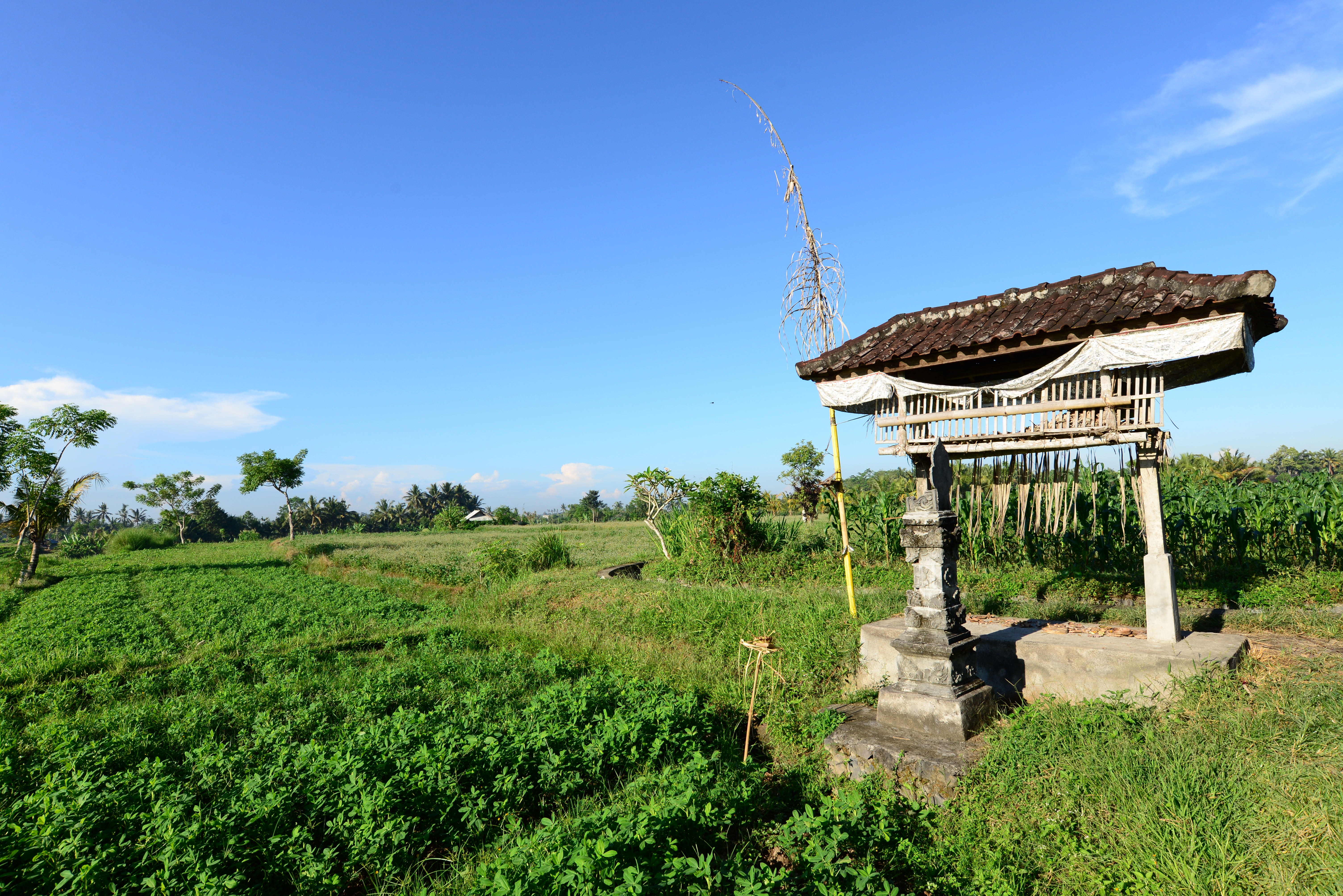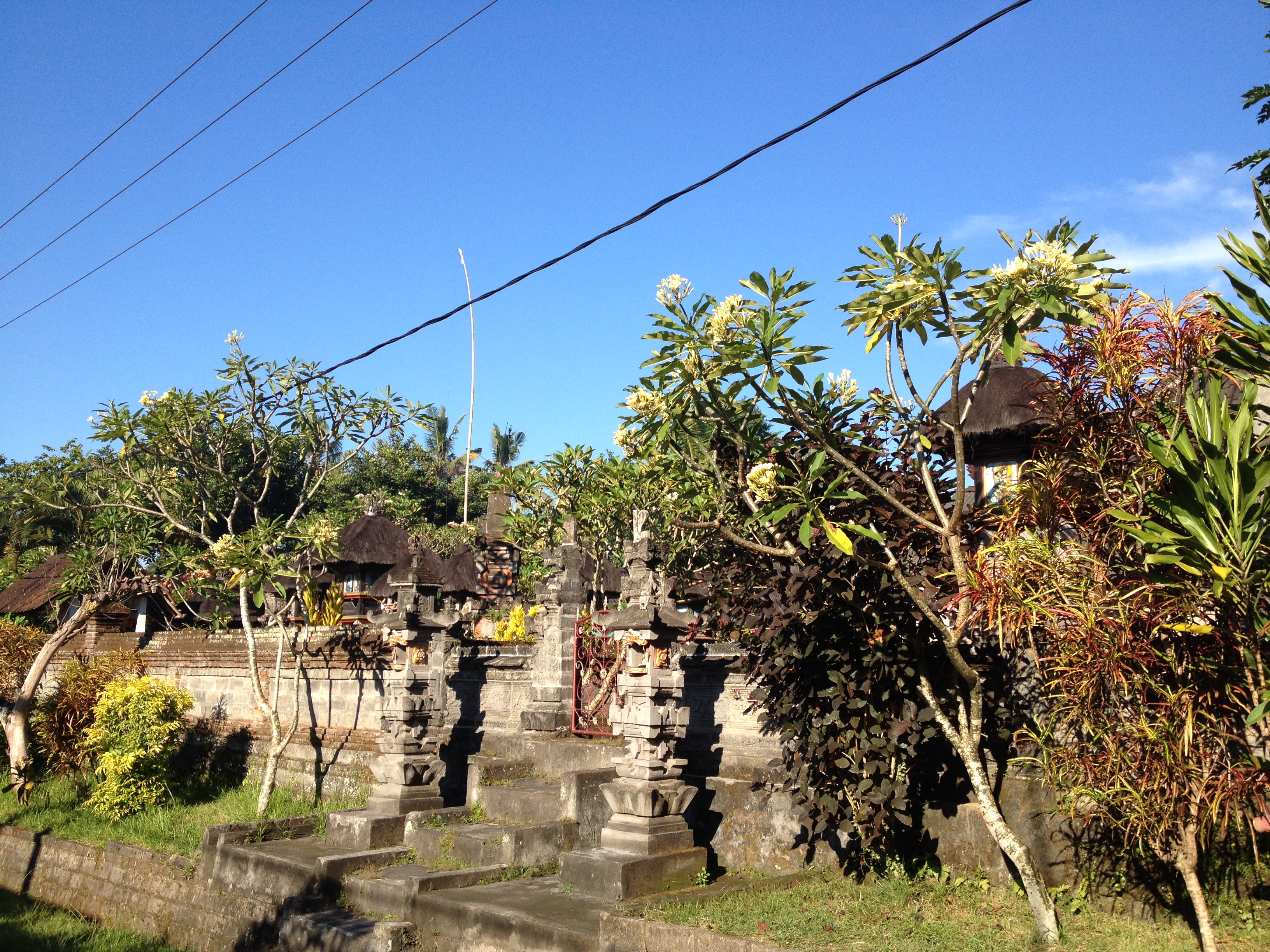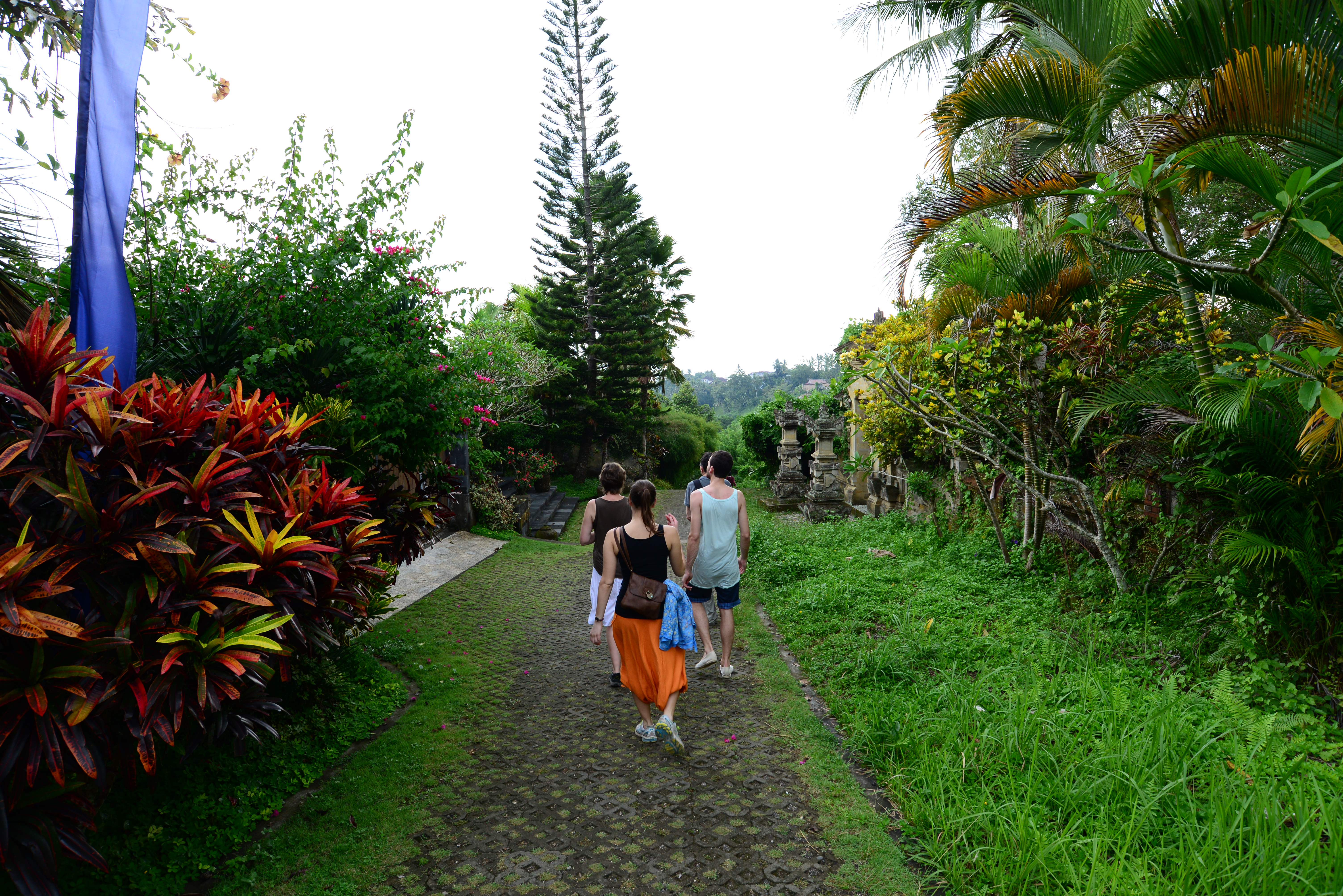 Ces travailleurs des rizières nous interpellent pendant notre balade, ils nous crient des hello, nous font de grands signes et des sourires – on se demande qui est la distraction de qui? Dewi Sri, la déesse du riz, est vénérée très souvent, aux étapes cruciales de croissance, dans ces régions restées proches des traditions animistes – des autels et des offrandes un peu partout en sont effectivement la preuve. Nous tâchons de suivre le rythme de notre Gusti qui termine la boucle par la route qui longe un cimetière resté sauvage; il échange quelques mots avec les habitants, tout en riant pas mal … nous devons être l’attraction de la semaine du 20 avril! Cela nous amuse autant qu’eux!