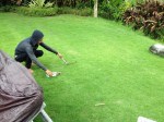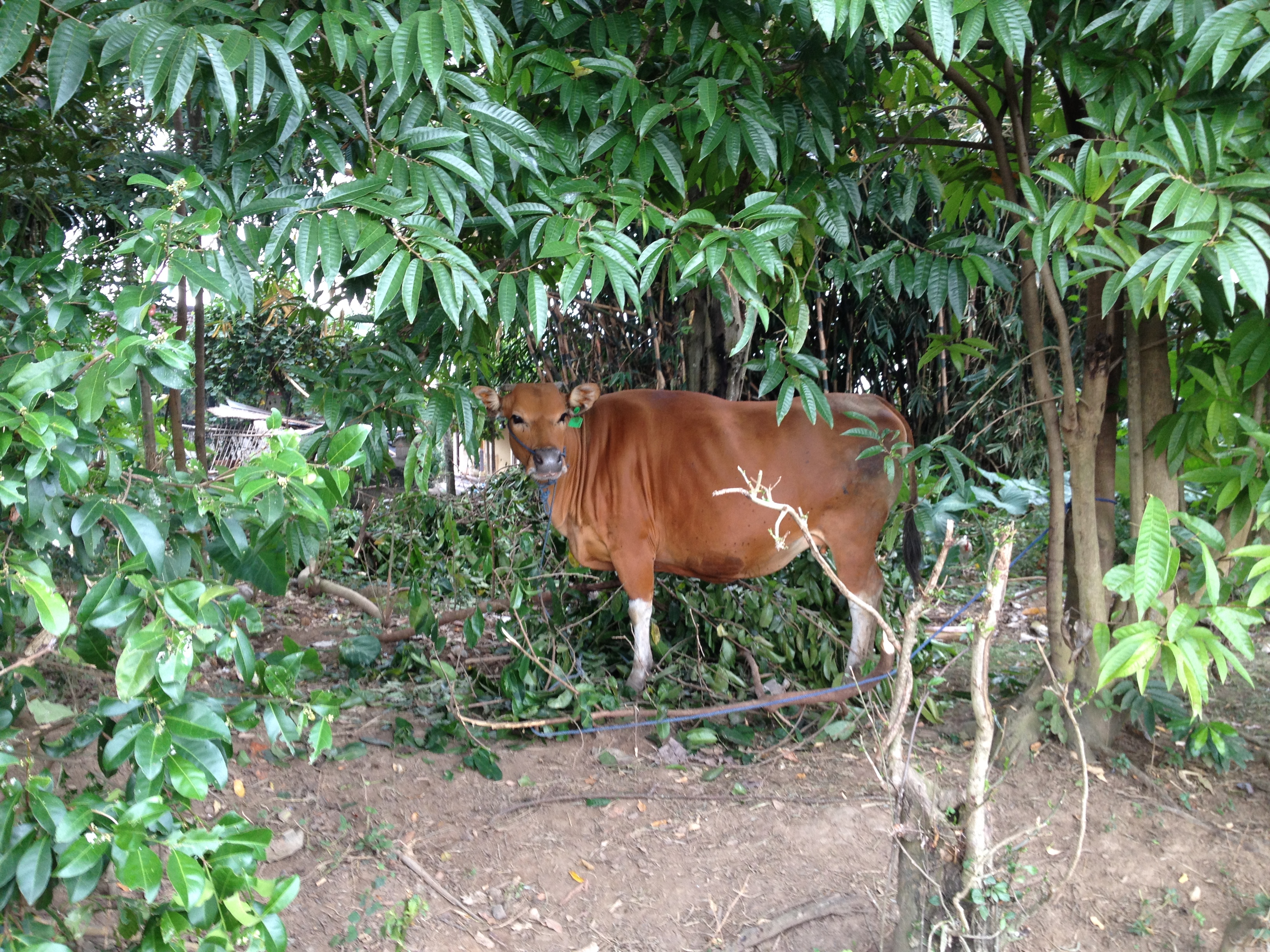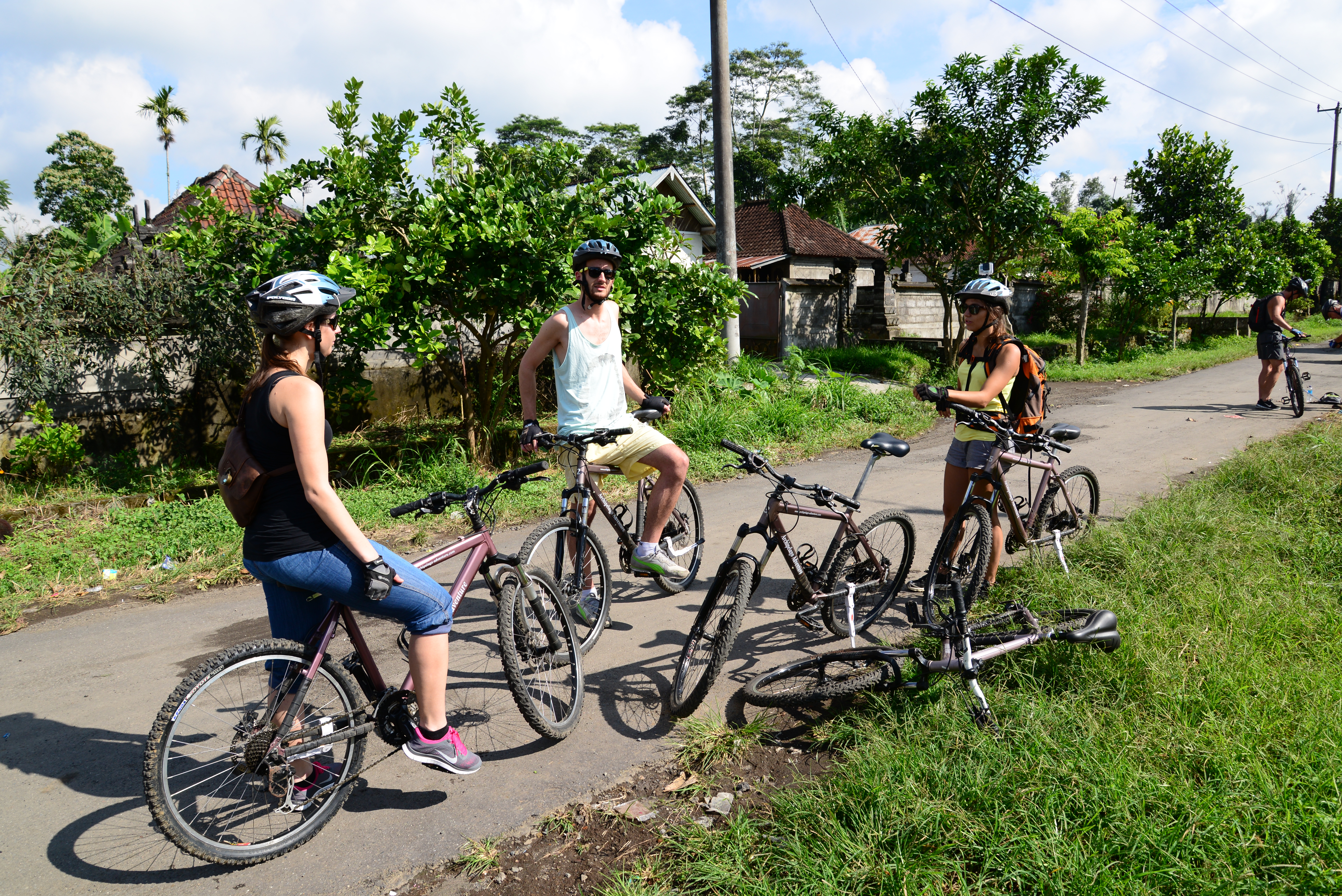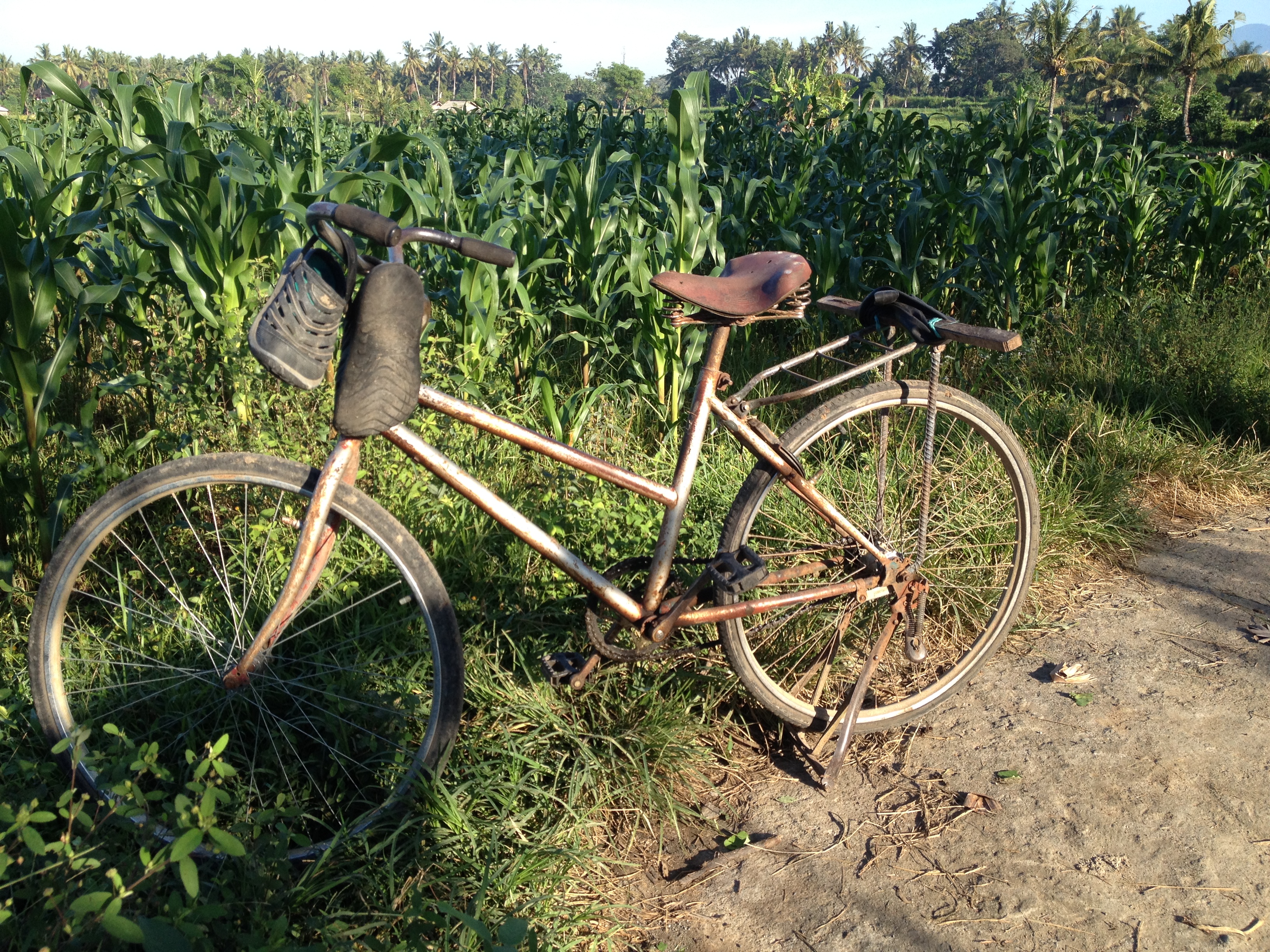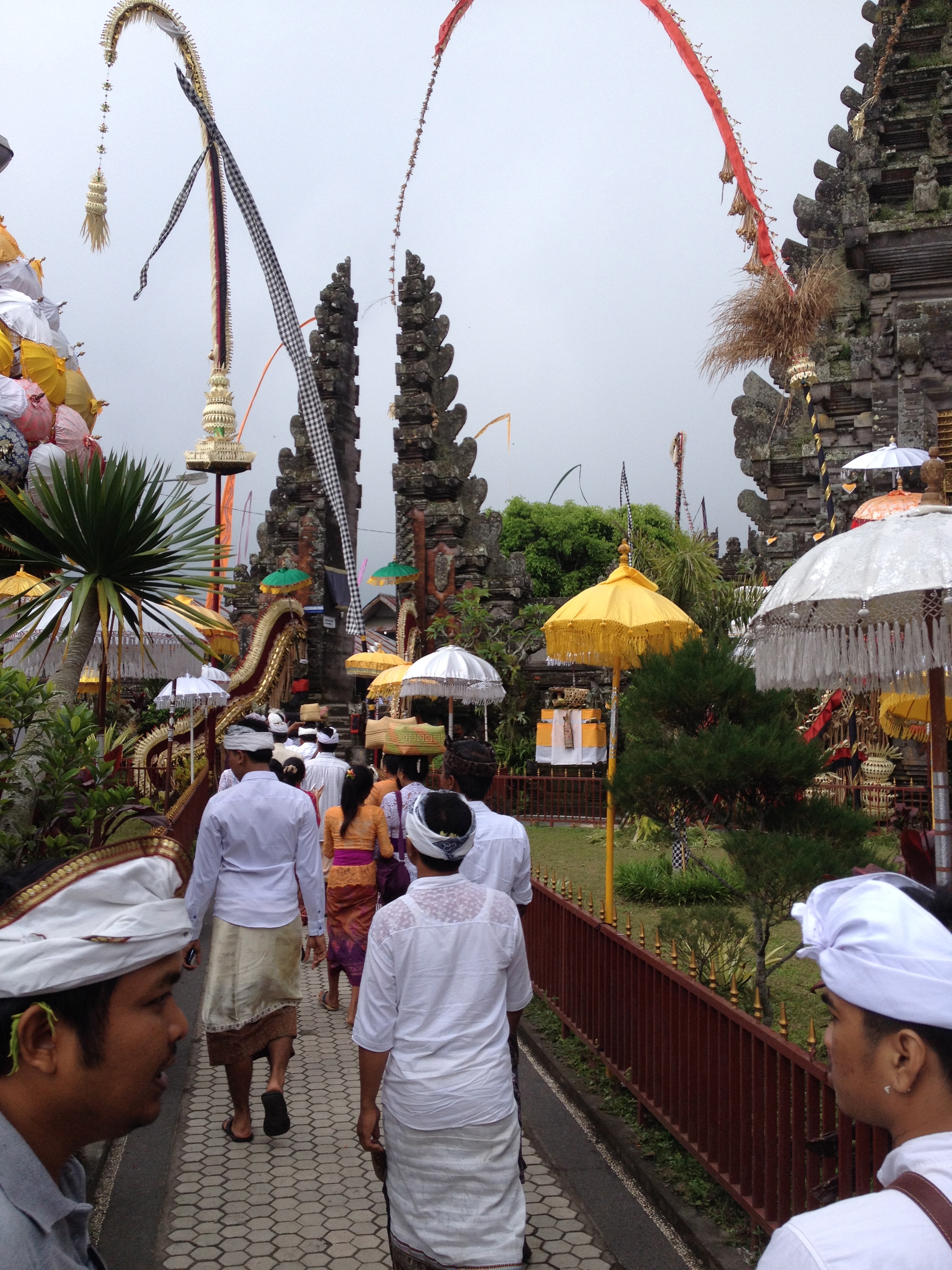 Ces travailleurs des rizières nous interpellent pendant notre balade, ils nous crient des hello, nous font de grands signes et des sourires – on se demande qui est la distraction de qui? Dewi Sri, la déesse du riz, est vénérée très souvent, aux étapes cruciales de croissance, dans ces régions restées proches des traditions animistes – des autels et des offrandes un peu partout en sont effectivement la preuve. Nous tâchons de suivre le rythme de notre Gusti qui termine la boucle par la route qui longe un cimetière resté sauvage; il échange quelques mots avec les habitants, tout en riant pas mal … nous devons être l’attraction de la semaine du 20 avril! Cela nous amuse autant qu’eux!