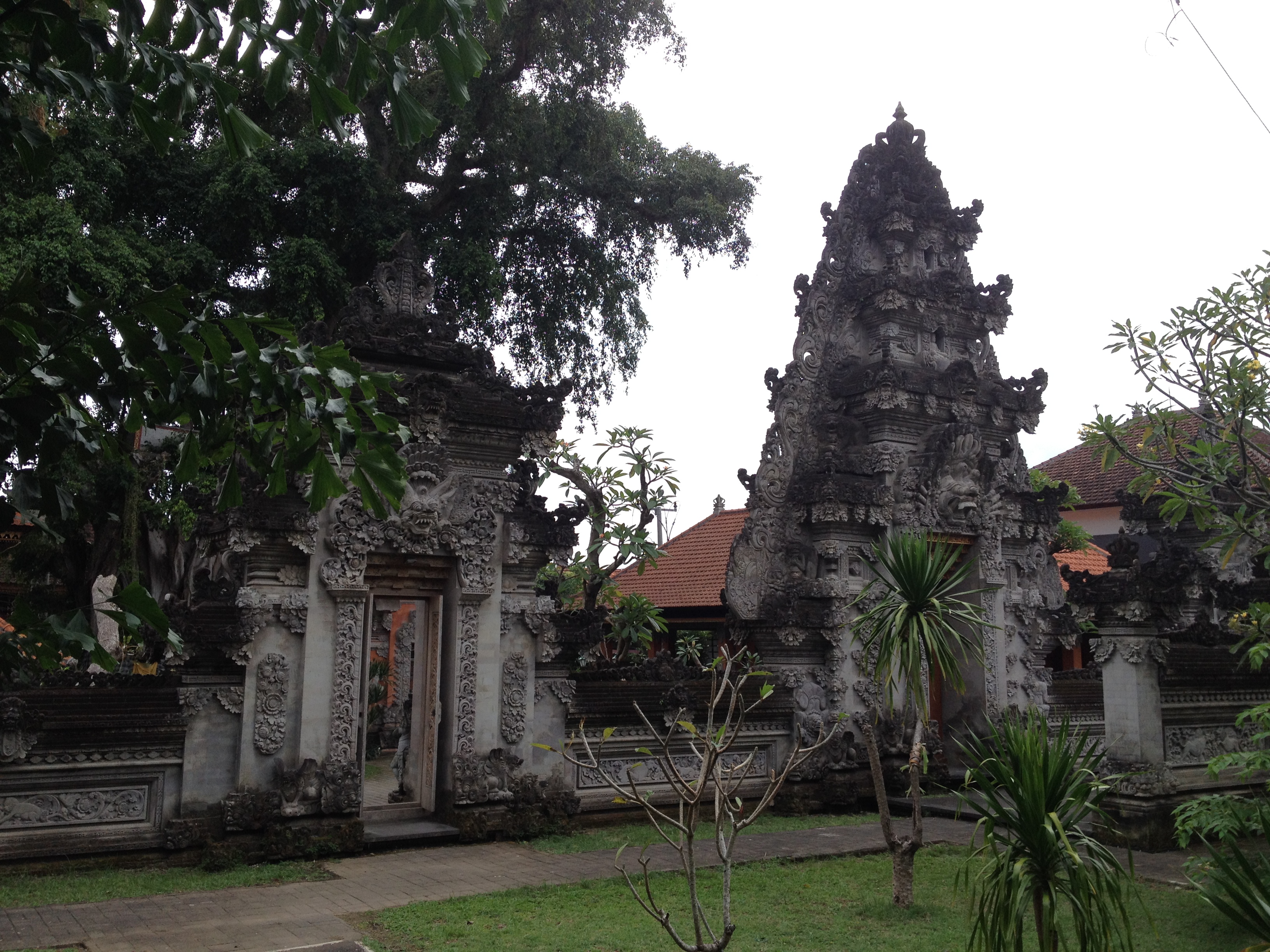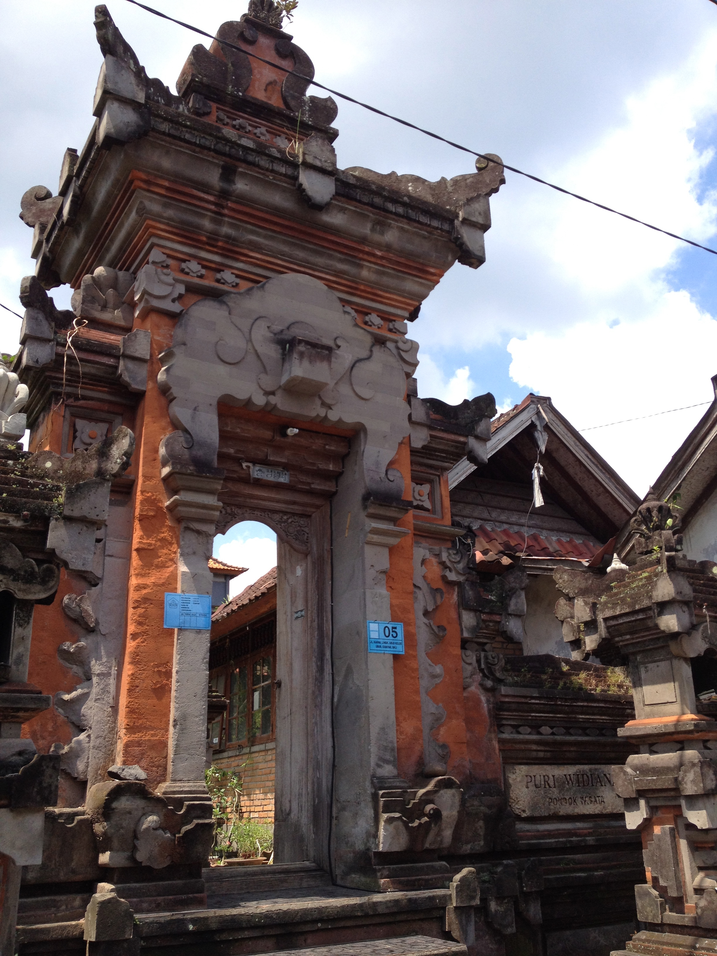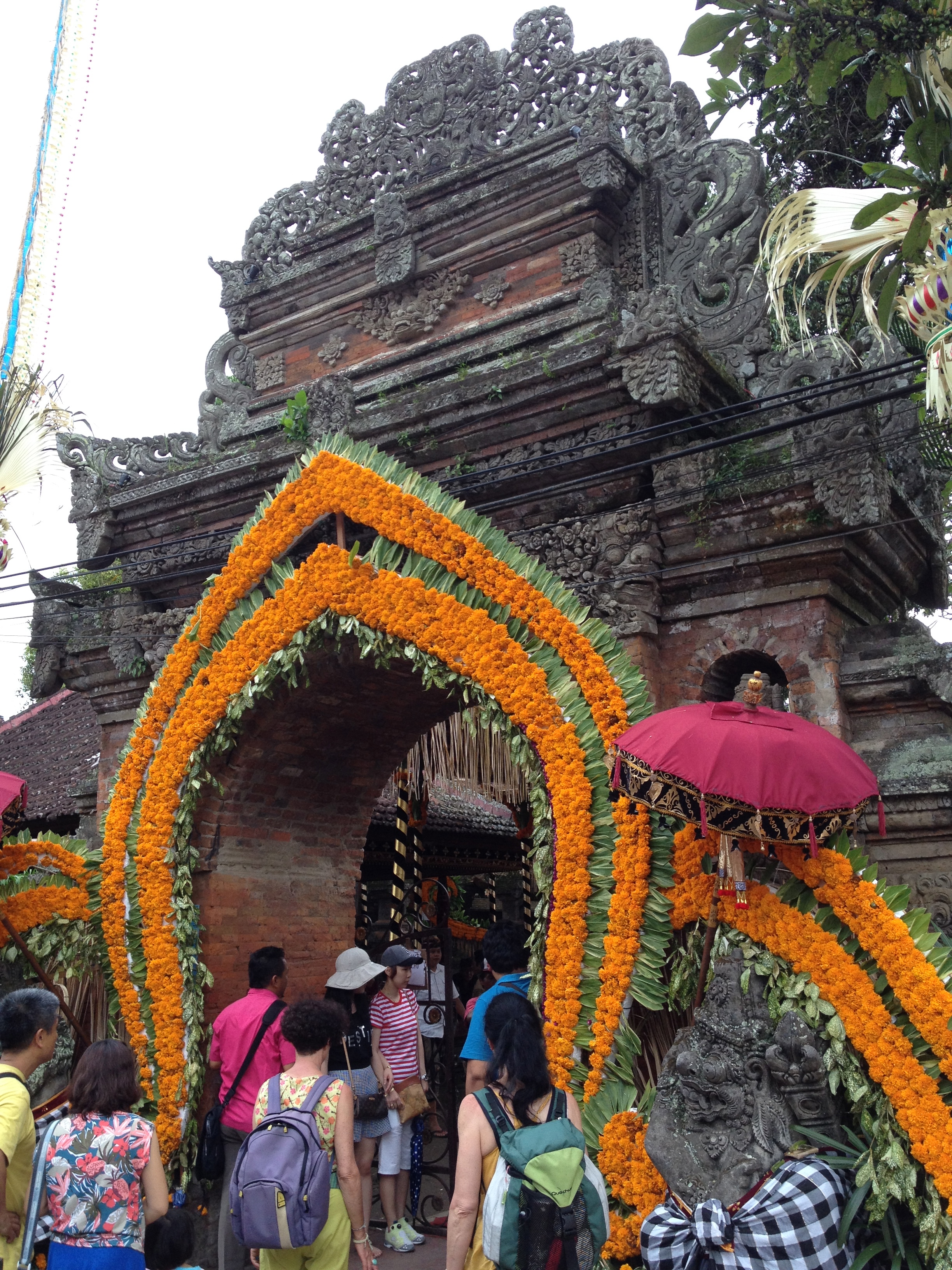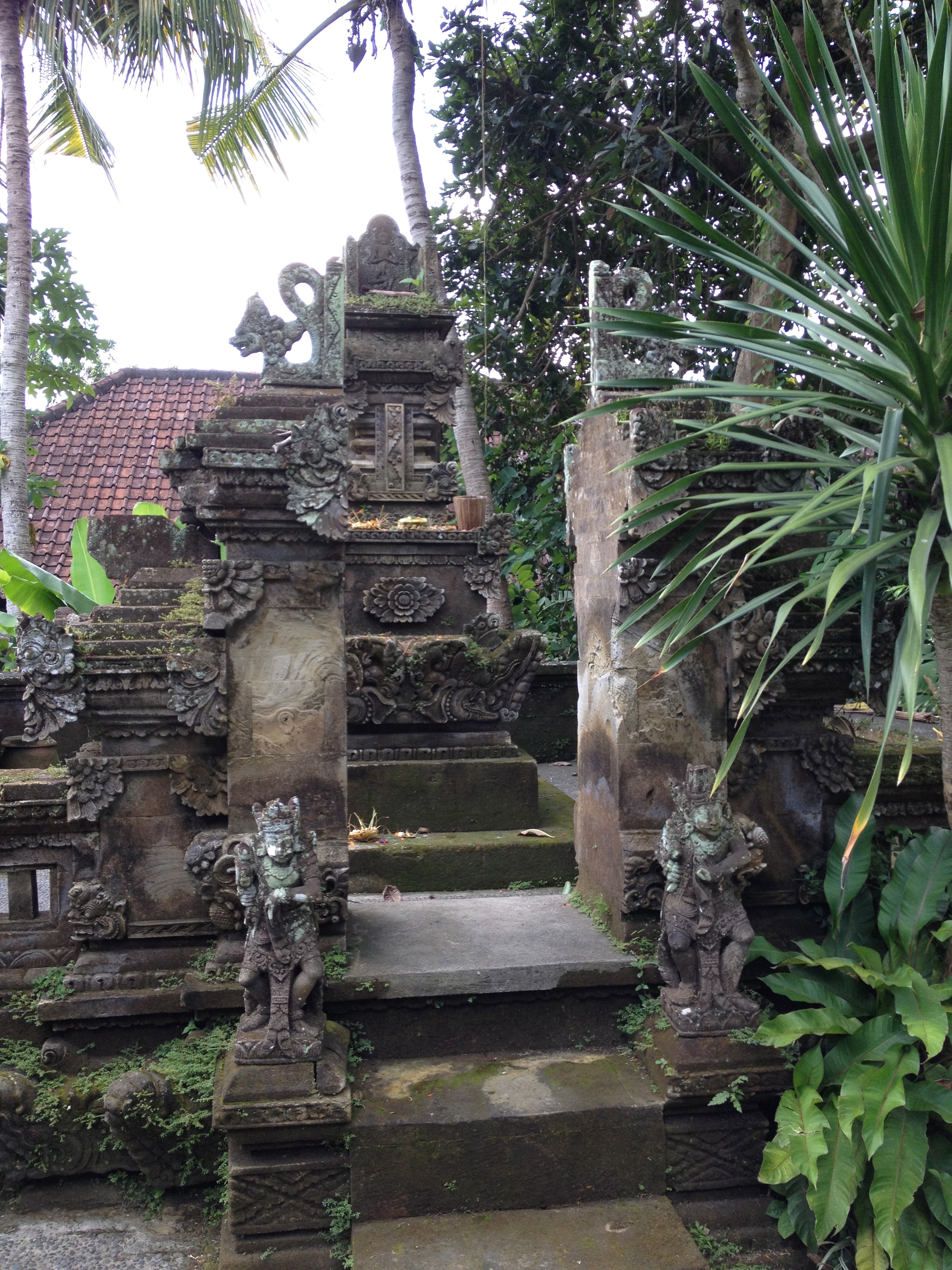 Il va comprendre que nous sommes de bons marcheurs et nous laisse remonter vers le centre d’Ubud où il nous attendra devant le Palace Royal. L’Indonésie est une république mais les îles sont divisées en royaumes; il y a trois ou quatre rois à Bali dont celui de Ubud. Cette semaine est festive, il y a un mariage dans la famille royale. Le Palais en est très décoré de fleurs et d’arrangements tressés en lanières de feuilles de palmiers mais c’est en face, dans la résidence d’une autre branche de la famille royale que Made nous fait pénétrer. Les portails d’entrée sophistiqués, les sculptures et moulures, les statues de pierre, les cours intérieures, les parvis devant les pavillons de briques orangées, les jardins aux fleurs et aux arbres géants intégrés au labyrinthe des allées nous font découvrir le style typiquement balinais des constructions cossues.