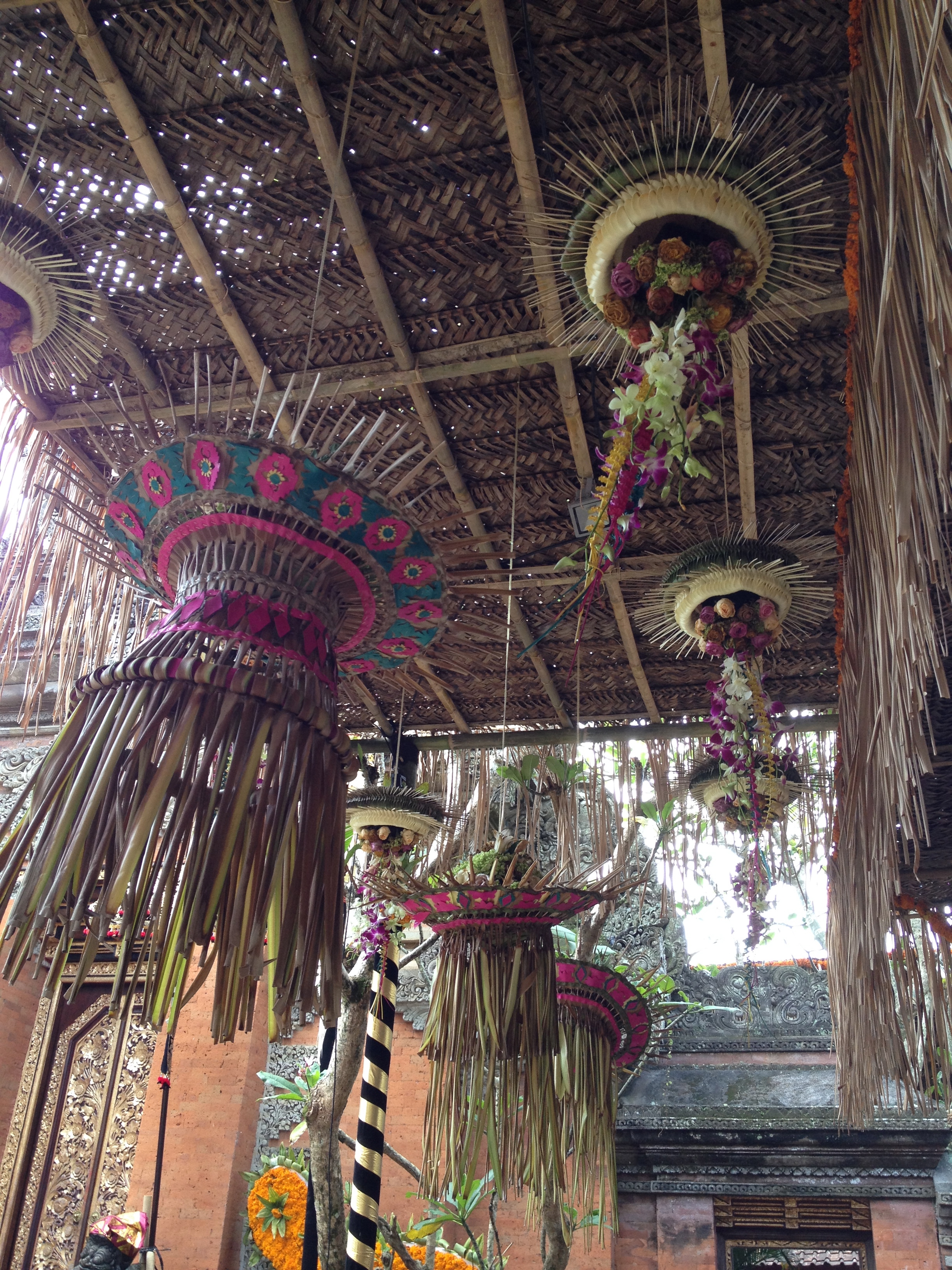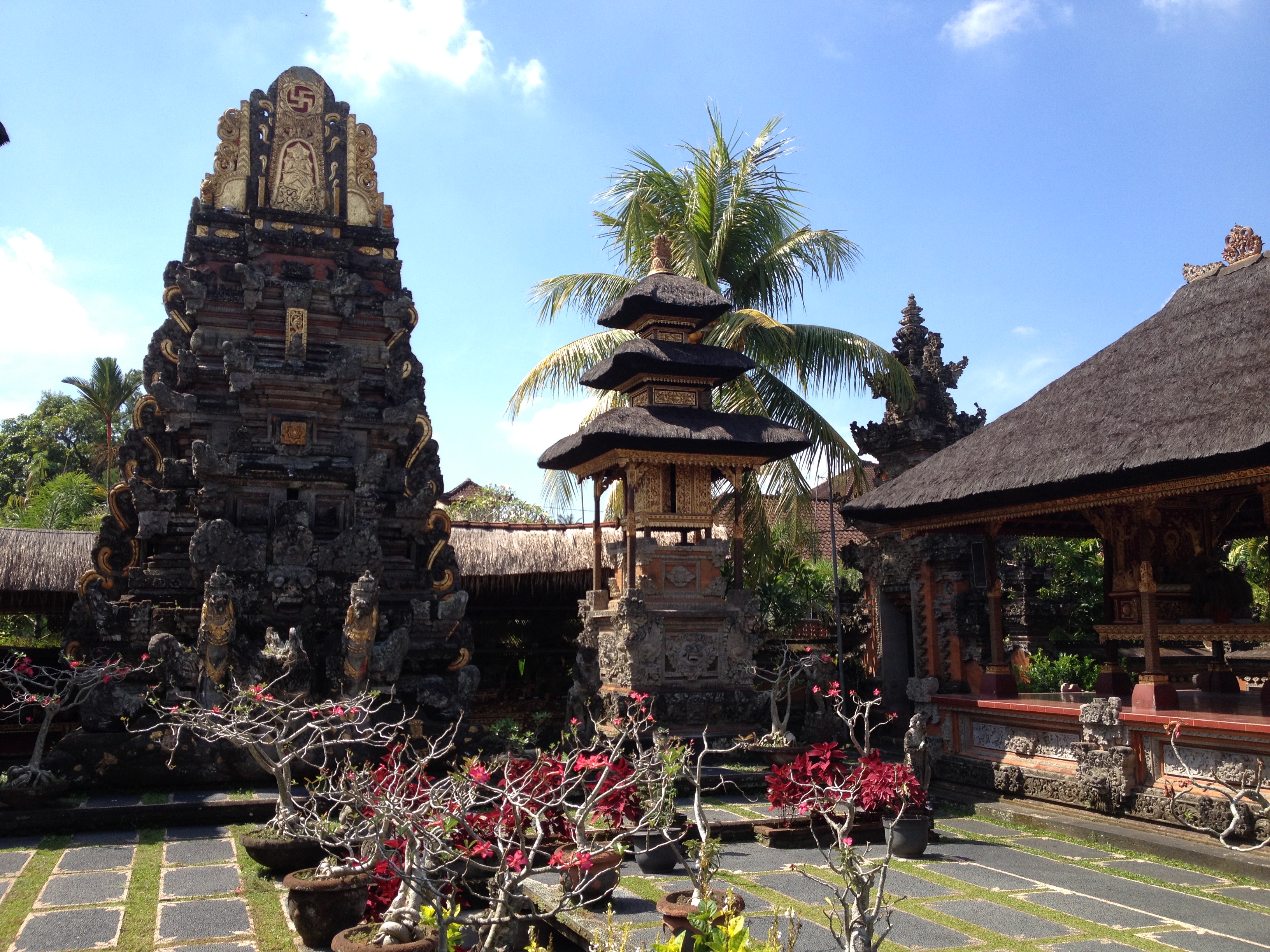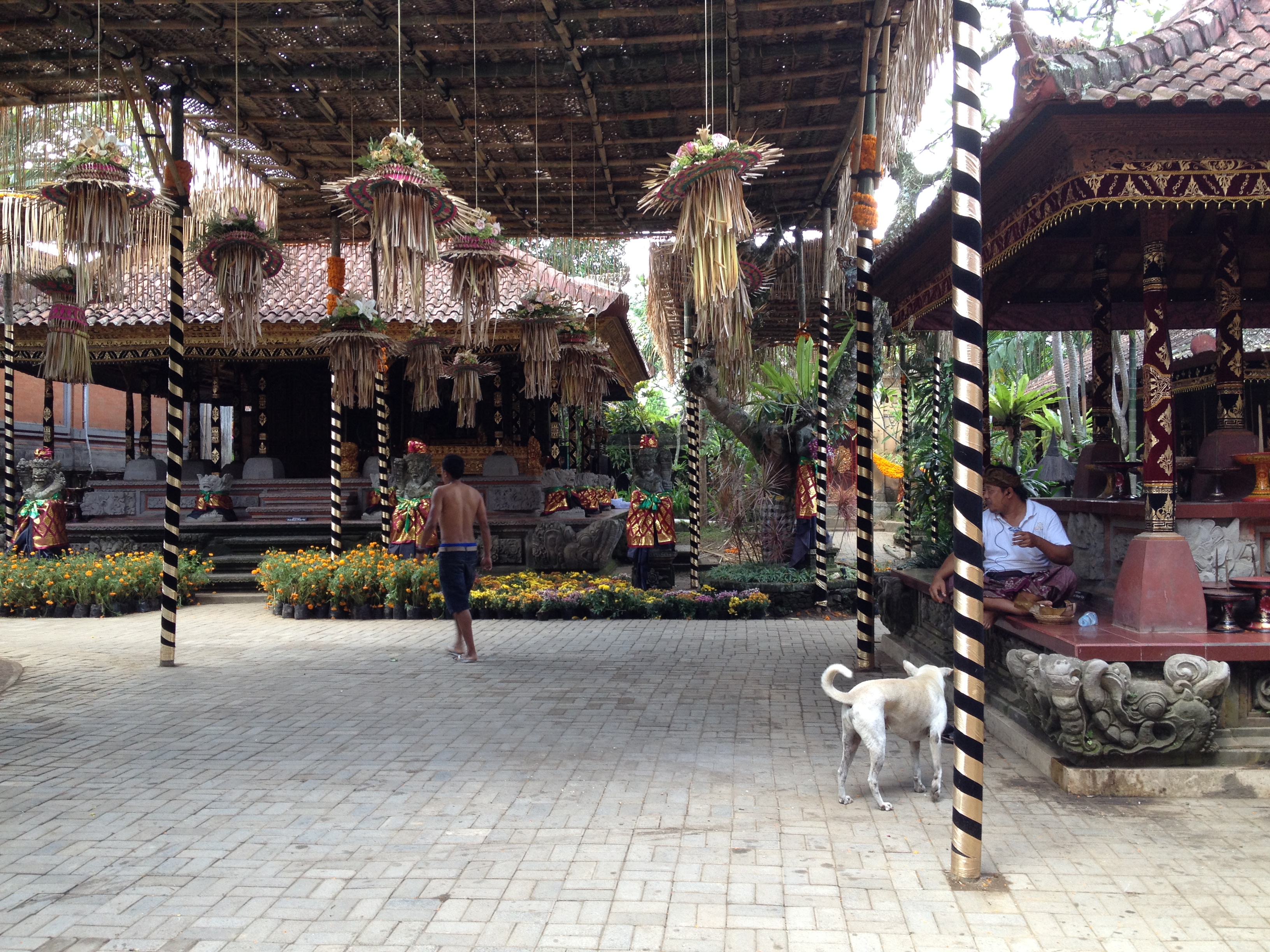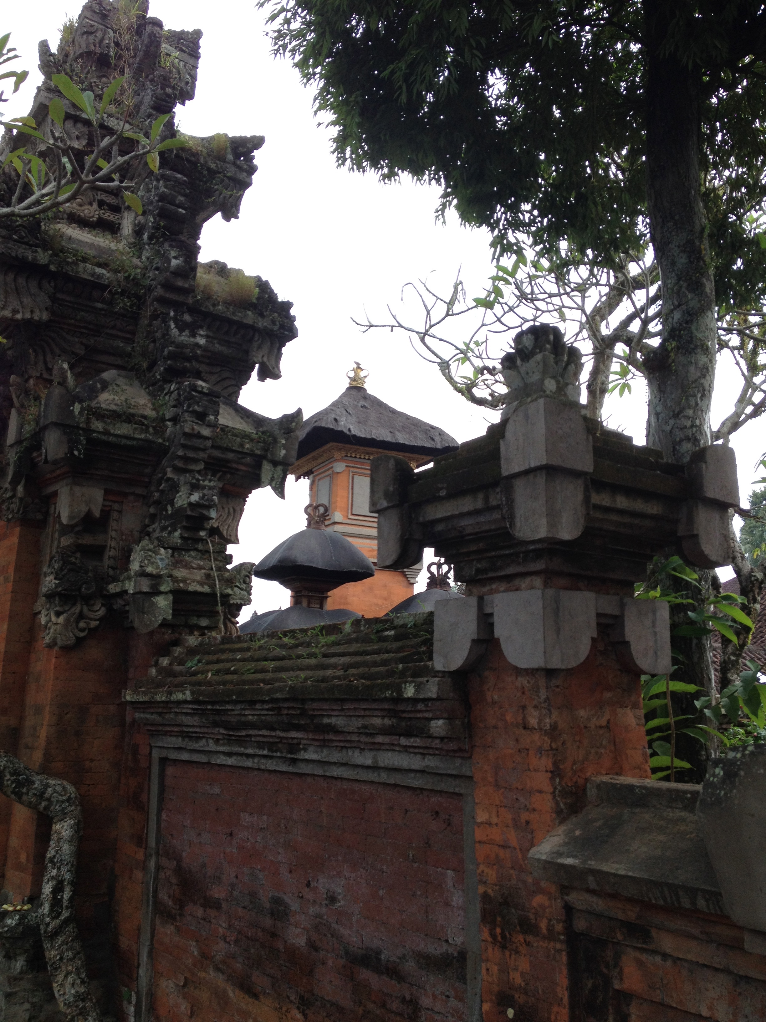 Il va comprendre que nous sommes de bons marcheurs et nous laisse remonter vers le centre d’Ubud où il nous attendra devant le Palace Royal. L’Indonésie est une république mais les îles sont divisées en royaumes; il y a trois ou quatre rois à Bali dont celui de Ubud. Cette semaine est festive, il y a un mariage dans la famille royale. Le Palais en est très décoré de fleurs et d’arrangements tressés en lanières de feuilles de palmiers mais c’est en face, dans la résidence d’une autre branche de la famille royale que Made nous fait pénétrer. Les portails d’entrée sophistiqués, les sculptures et moulures, les statues de pierre, les cours intérieures, les parvis devant les pavillons de briques orangées, les jardins aux fleurs et aux arbres géants intégrés au labyrinthe des allées nous font découvrir le style typiquement balinais des constructions cossues.