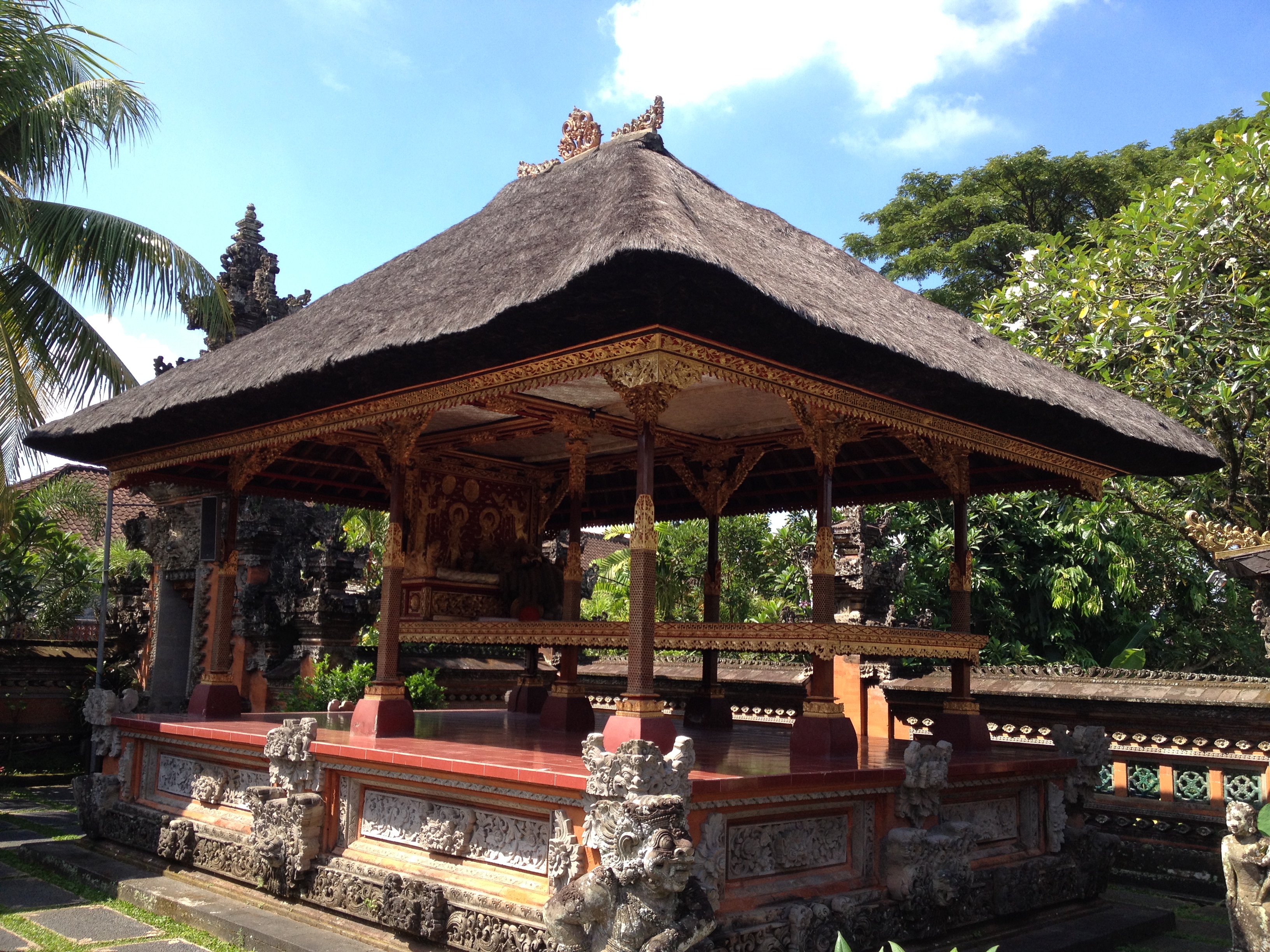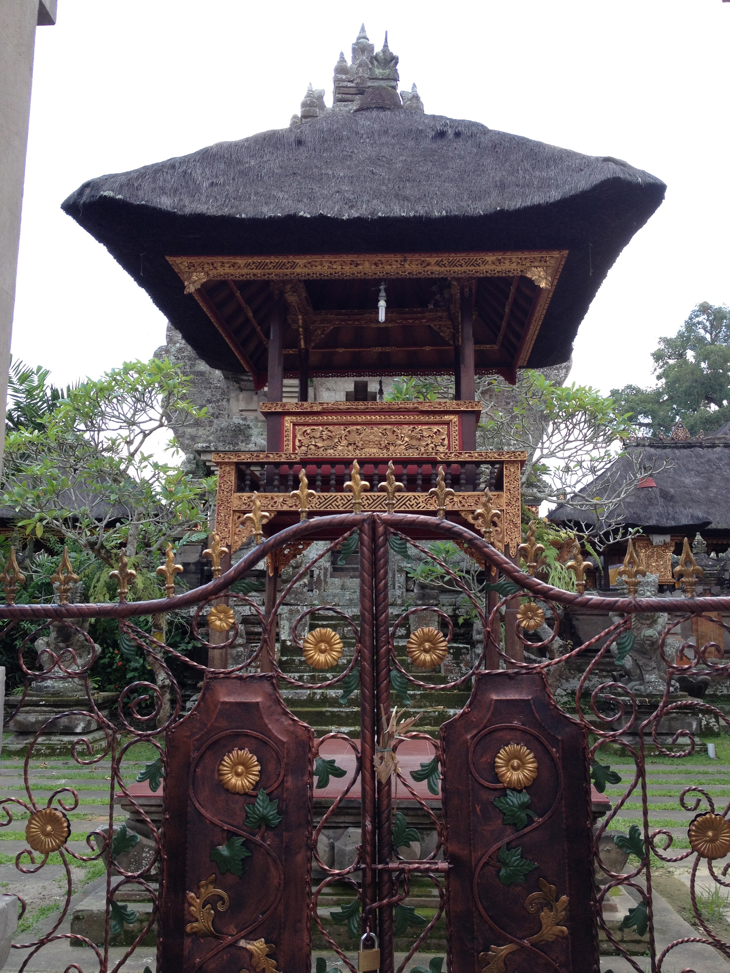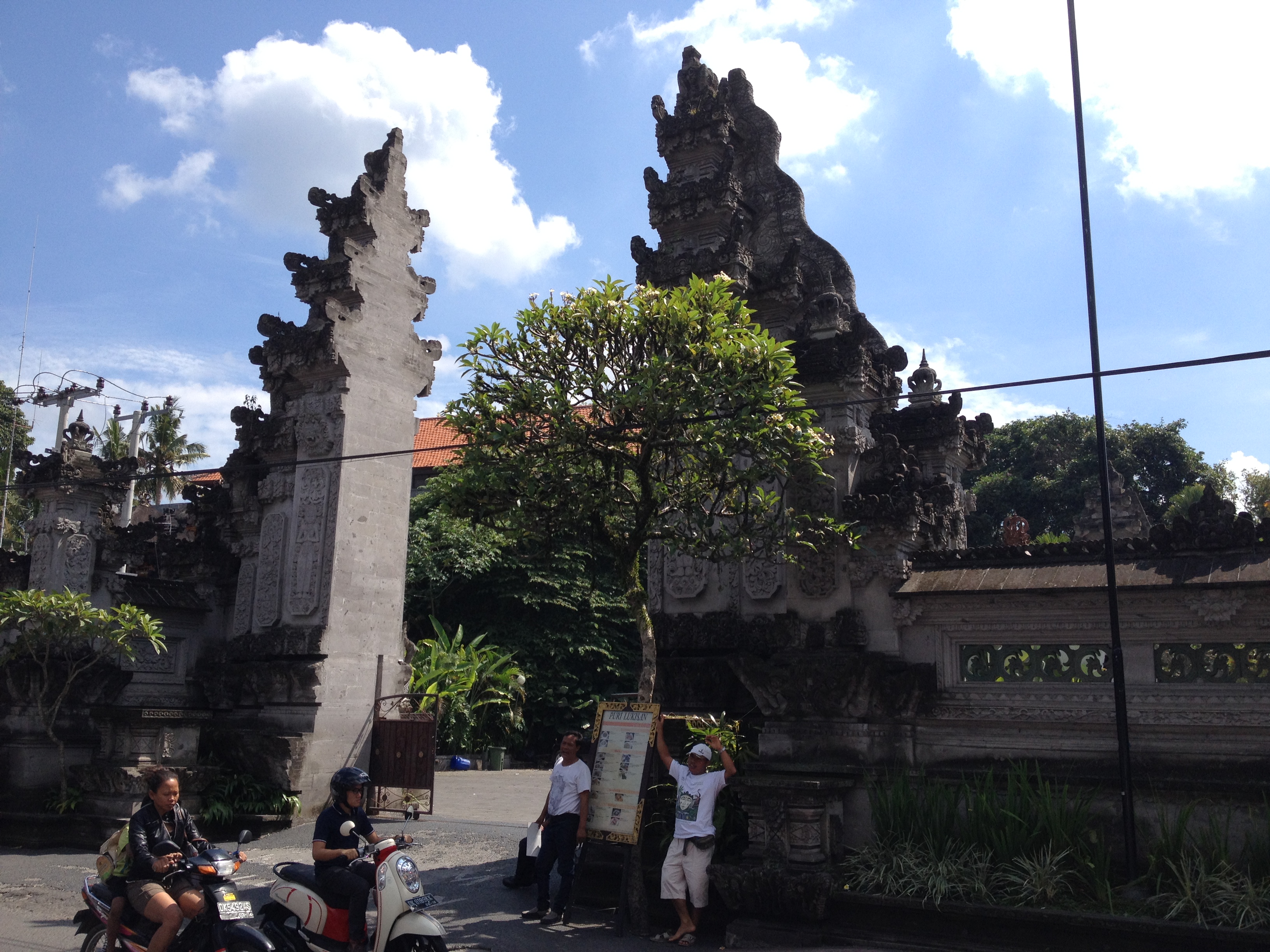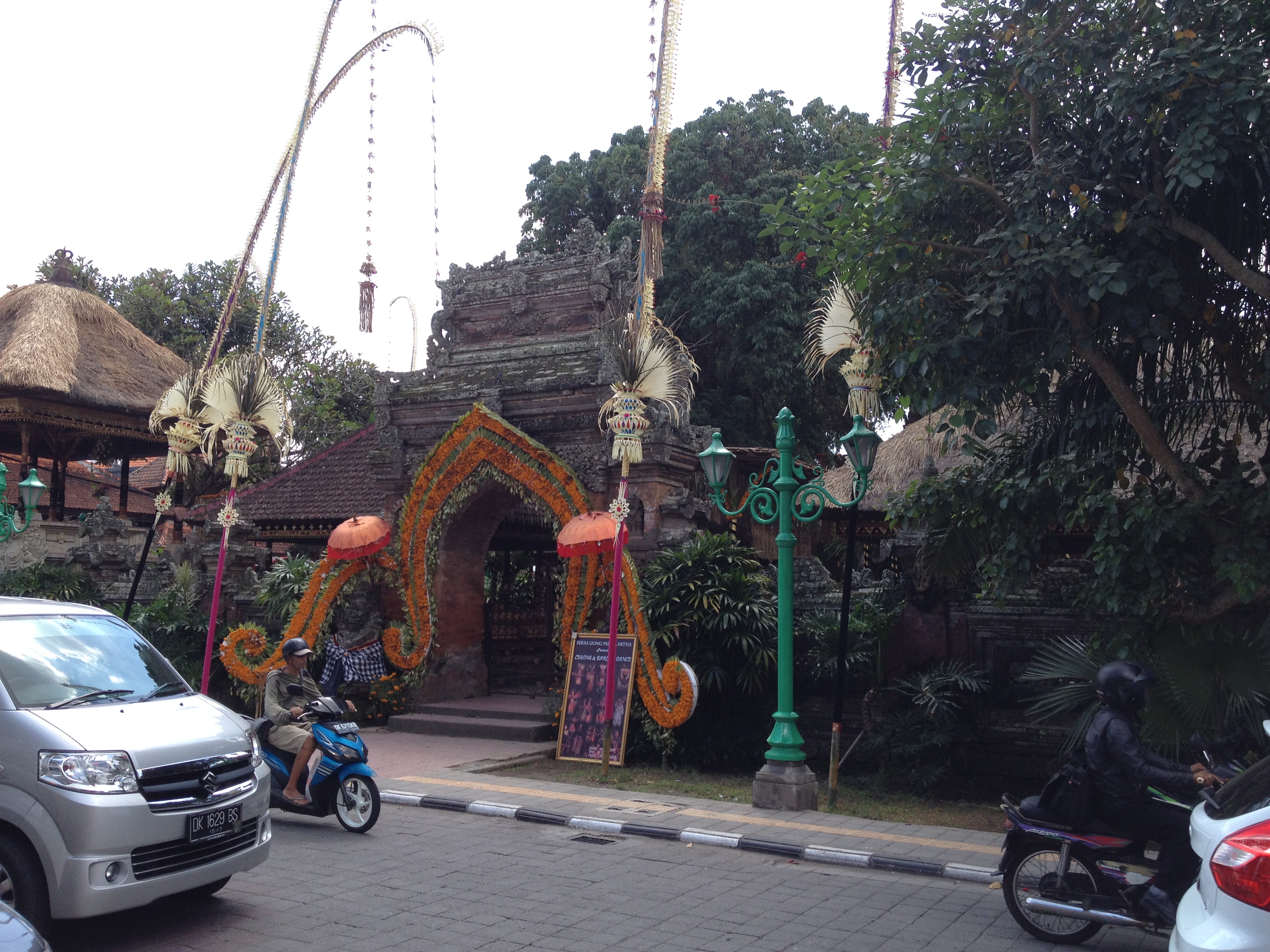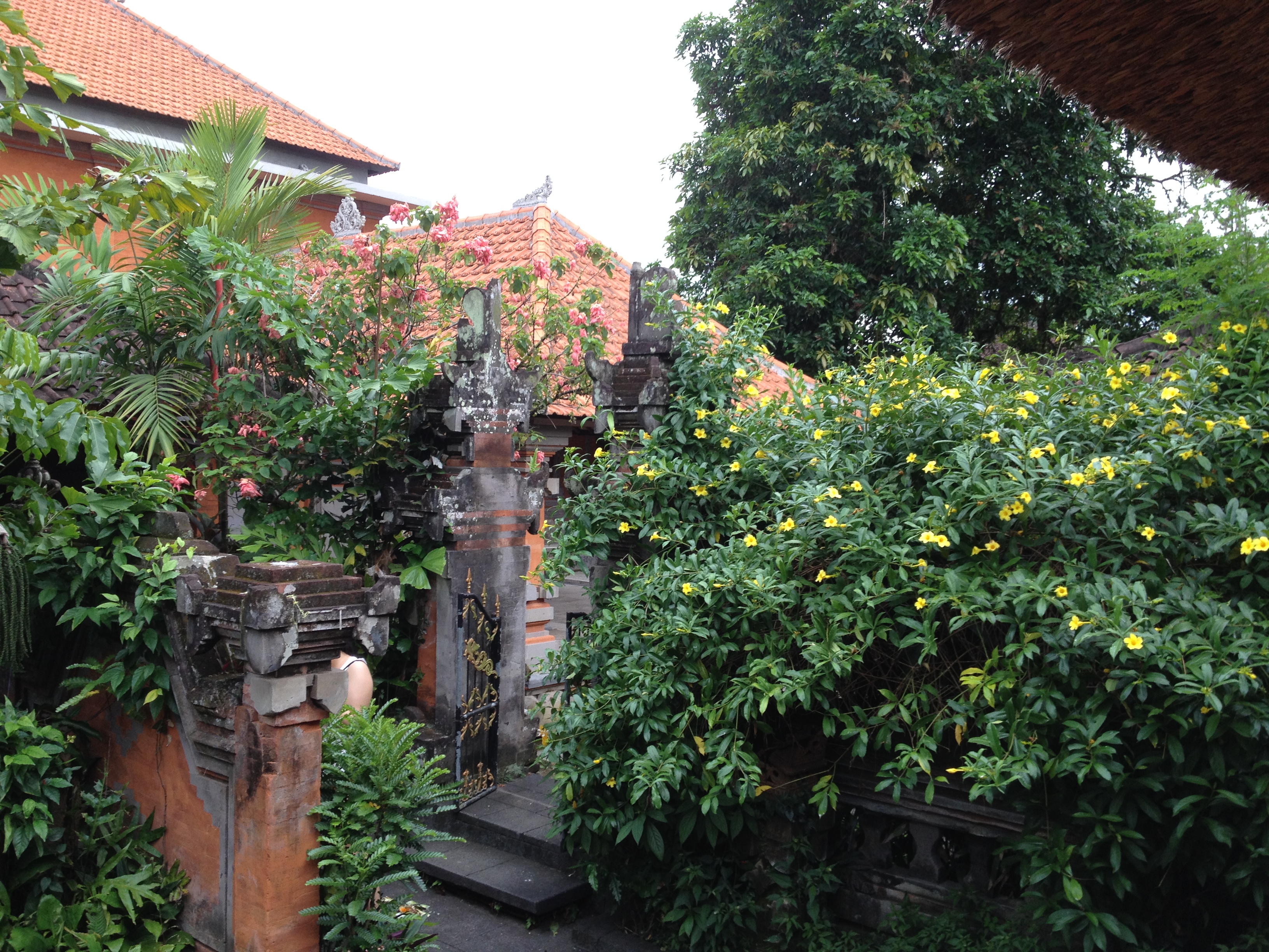 Il va comprendre que nous sommes de bons marcheurs et nous laisse remonter vers le centre d’Ubud où il nous attendra devant le Palace Royal. L’Indonésie est une république mais les îles sont divisées en royaumes; il y a trois ou quatre rois à Bali dont celui de Ubud. Cette semaine est festive, il y a un mariage dans la famille royale. Le Palais en est très décoré de fleurs et d’arrangements tressés en lanières de feuilles de palmiers mais c’est en face, dans la résidence d’une autre branche de la famille royale que Made nous fait pénétrer. Les portails d’entrée sophistiqués, les sculptures et moulures, les statues de pierre, les cours intérieures, les parvis devant les pavillons de briques orangées, les jardins aux fleurs et aux arbres géants intégrés au labyrinthe des allées nous font découvrir le style typiquement balinais des constructions cossues.