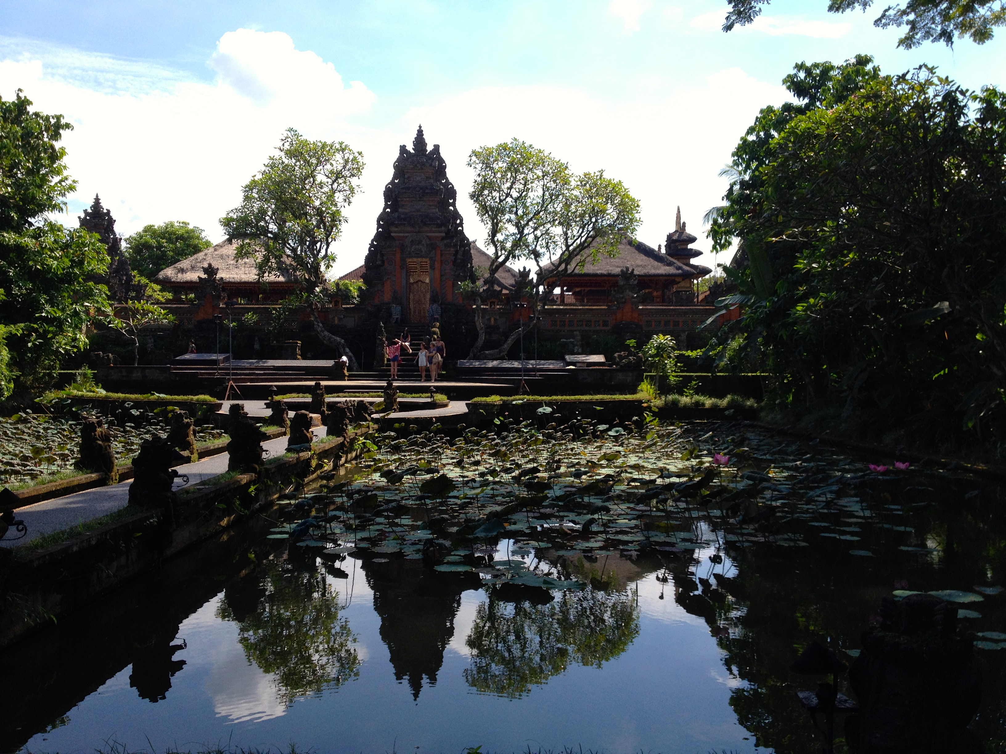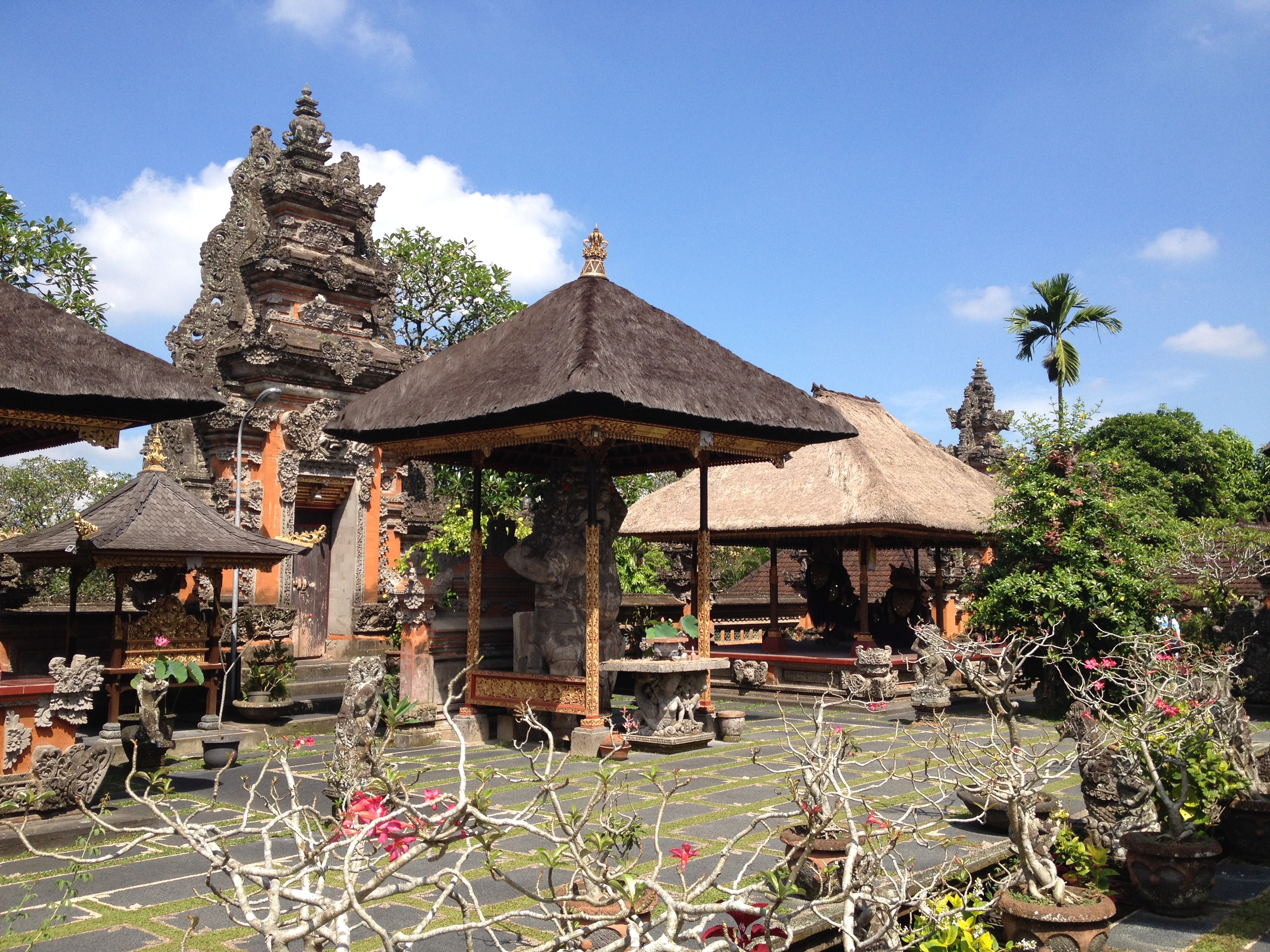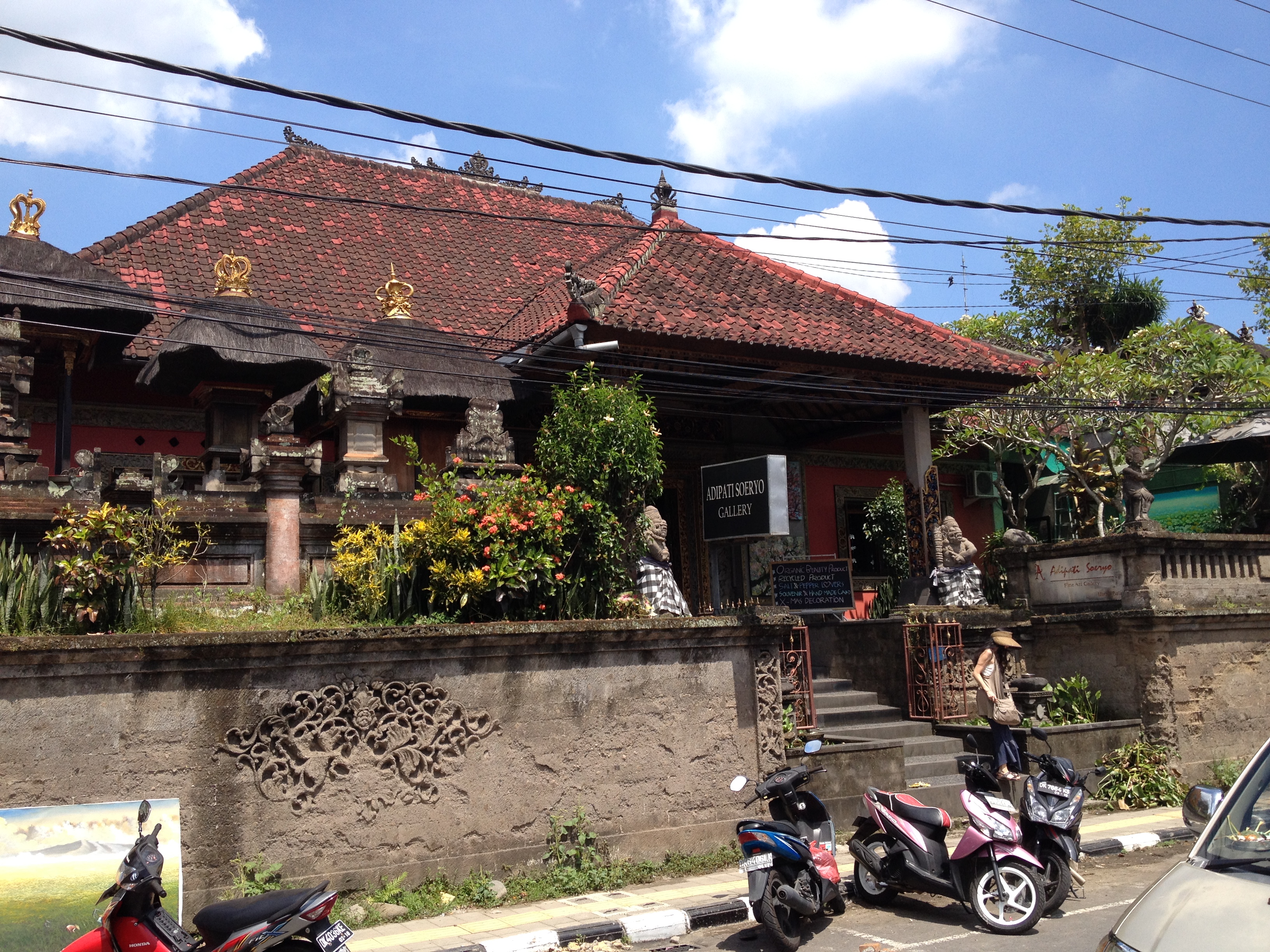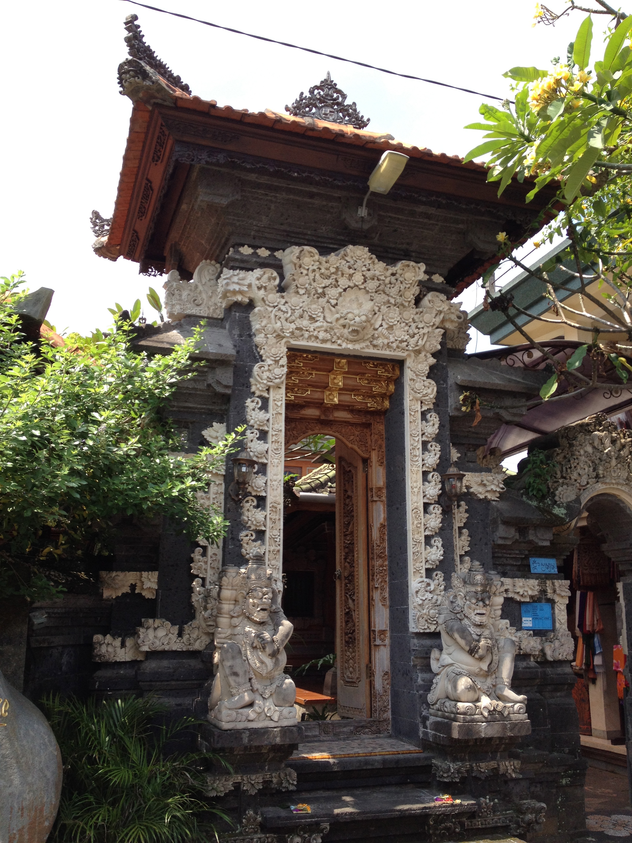 Il va comprendre que nous sommes de bons marcheurs et nous laisse remonter vers le centre d’Ubud où il nous attendra devant le Palace Royal. L’Indonésie est une république mais les îles sont divisées en royaumes; il y a trois ou quatre rois à Bali dont celui de Ubud. Cette semaine est festive, il y a un mariage dans la famille royale. Le Palais en est très décoré de fleurs et d’arrangements tressés en lanières de feuilles de palmiers mais c’est en face, dans la résidence d’une autre branche de la famille royale que Made nous fait pénétrer. Les portails d’entrée sophistiqués, les sculptures et moulures, les statues de pierre, les cours intérieures, les parvis devant les pavillons de briques orangées, les jardins aux fleurs et aux arbres géants intégrés au labyrinthe des allées nous font découvrir le style typiquement balinais des constructions cossues.